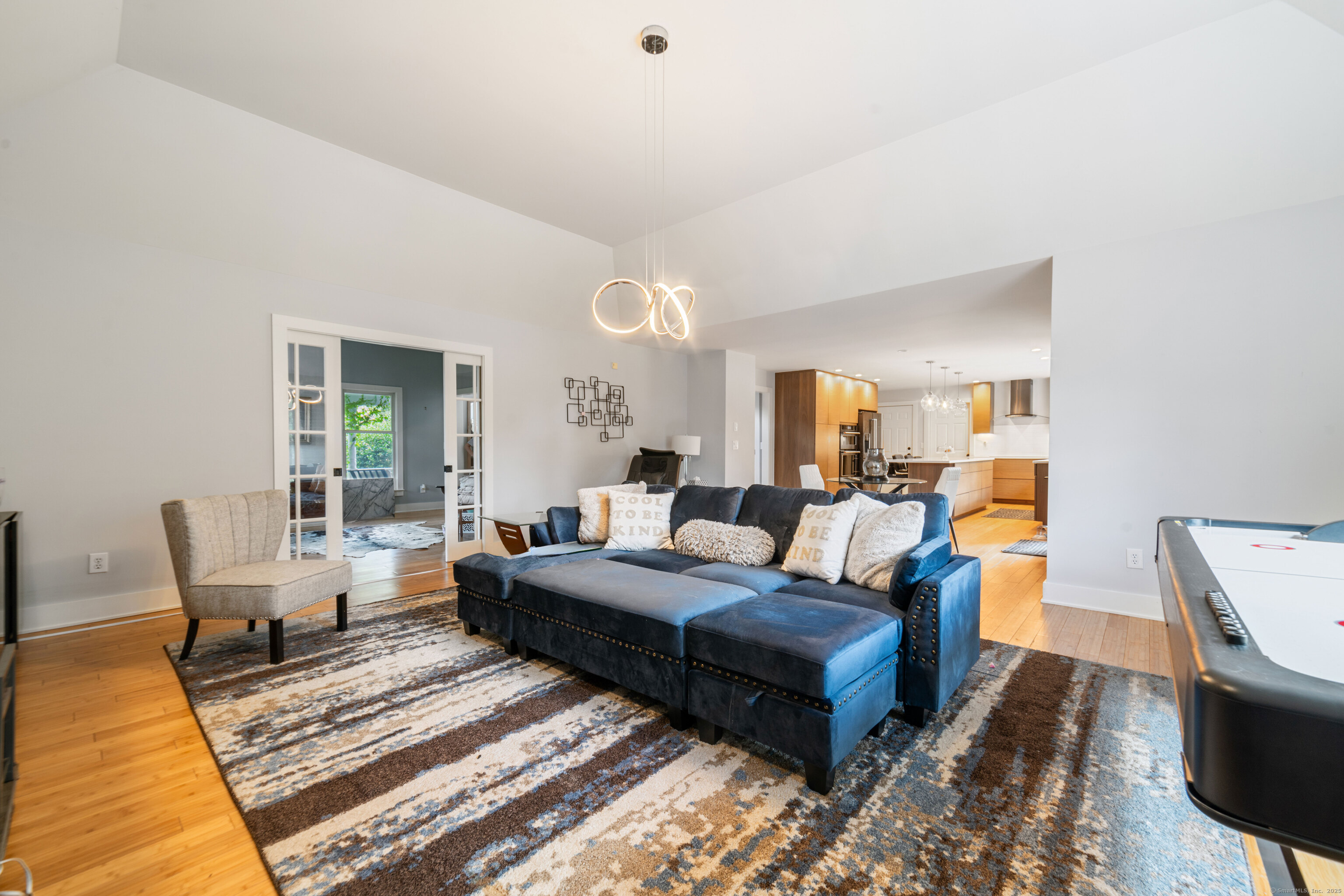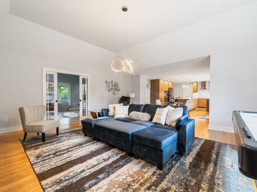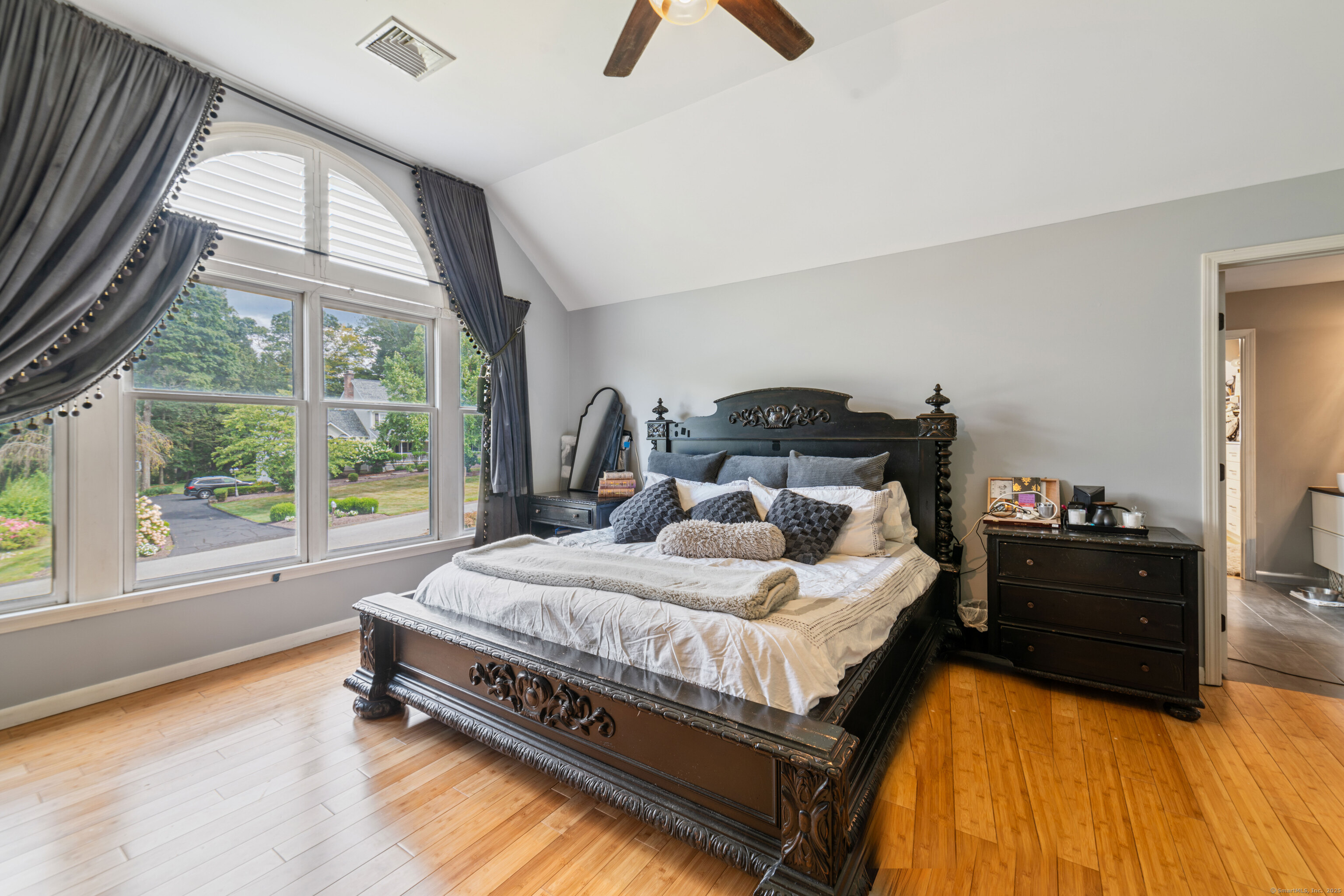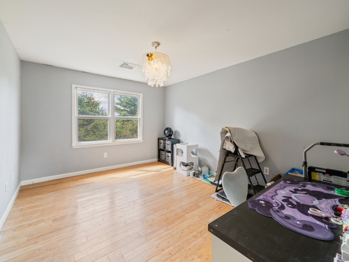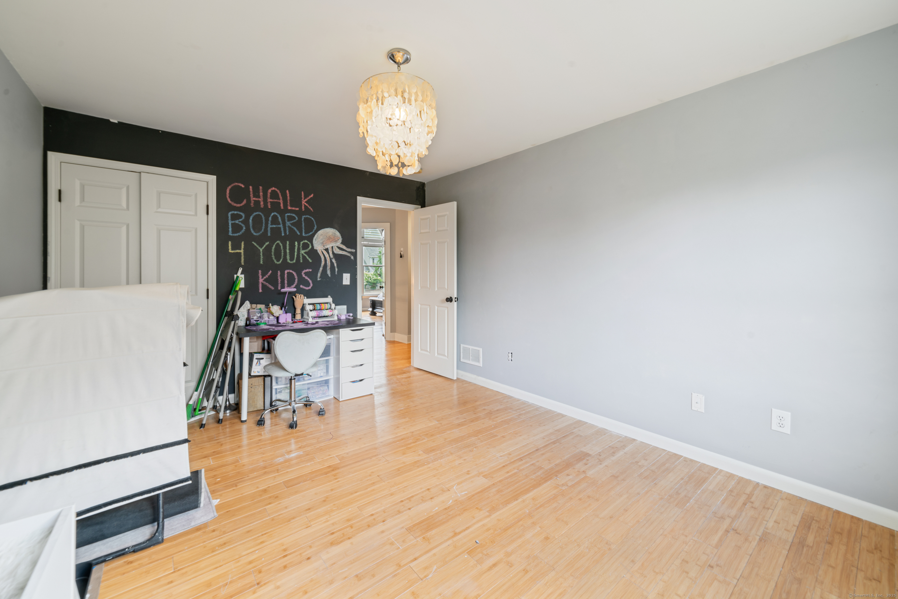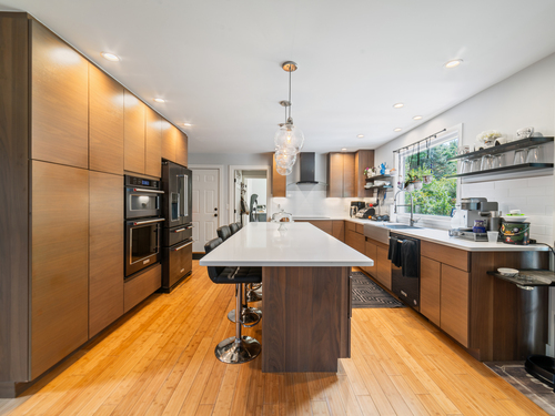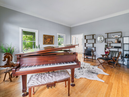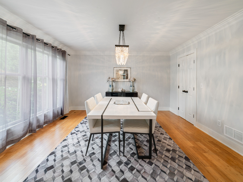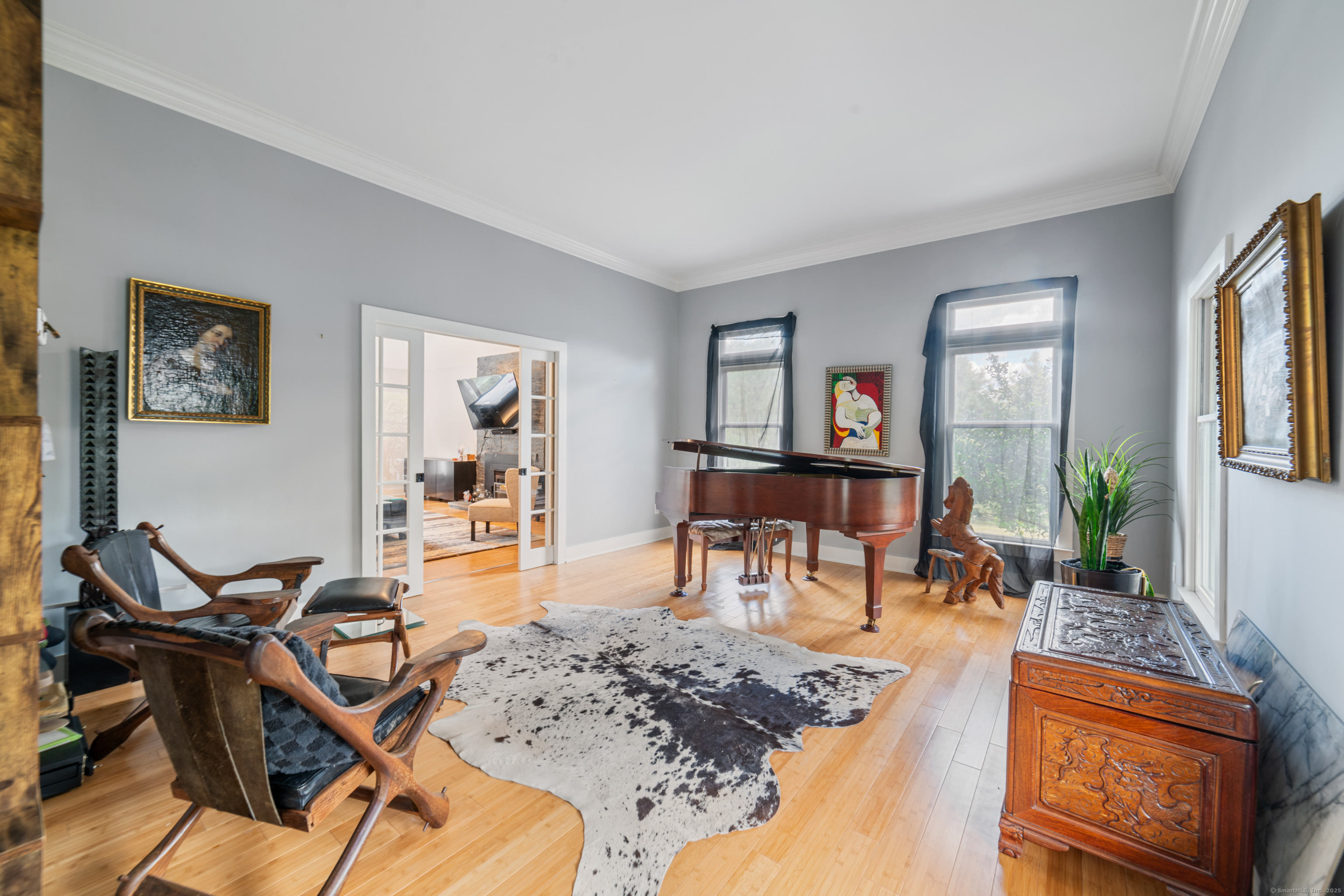 Located in a rural area within Newtown, Connecticut, this colonial home sits on a level, cleared corner lot. Constructed in 1996, the four-bedroom, 2.5-bath residence has been updated with modern aesthetics. The first floor features an open floor plan, with a kitchen equipped with an island, a dining area, a large picture window above the sink, and stainless Kitchen Aide appliances, including a wall oven and microwave. Quartz countertops and contemporary cabinetry are featured in the kitchen. The kitchen flows into the family room. A dining room, and study, are also located on the first floor.The kitchen opens onto a deck with an awning. Bamboo engineered flooring is installed throughout the home first and second floor. A cable-railed stairway with a chandelier lift leads to the second floor. The primary bedroom has ample natural light and includes a walk-in closet, a walk-in shower, and a soaking tub. Three additional bedrooms and a full bath with a walk-in shower are also located on the second floor. Additional features of the property include a dog fence, a generator, a water filtration system, and a propane-fueled continuous water heater. The home also offers a partially finished basement, an electric dog fence and a electric charger for your car in the garage.