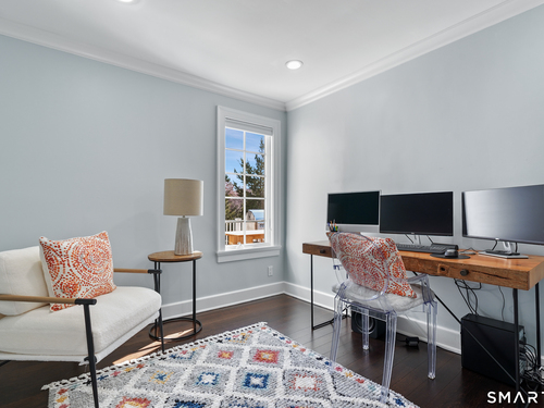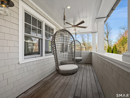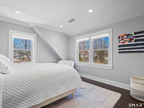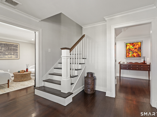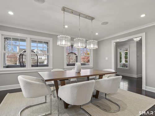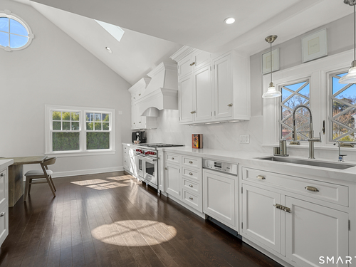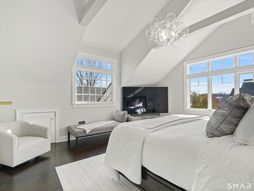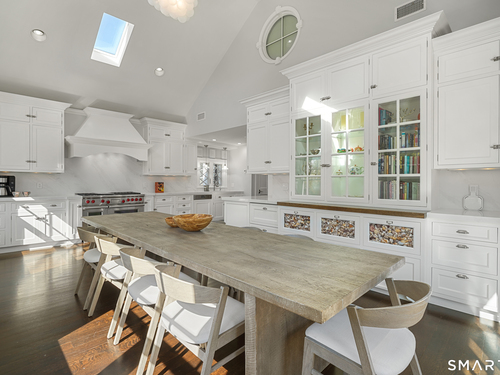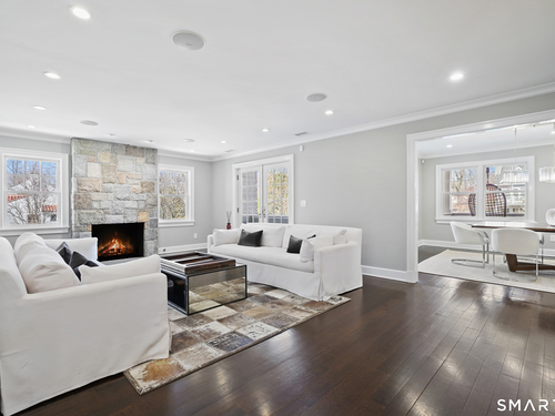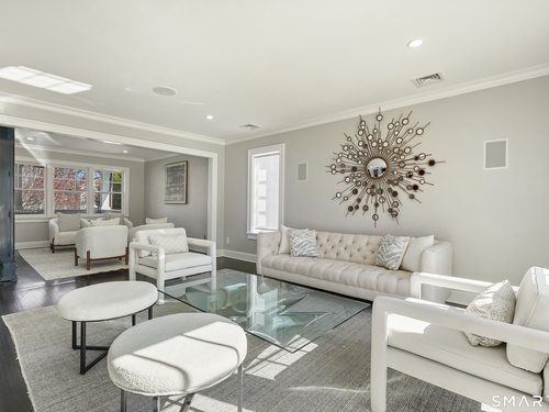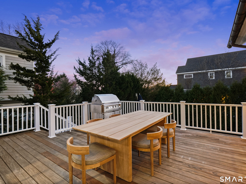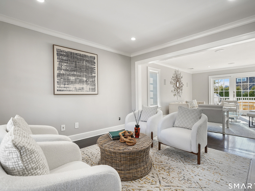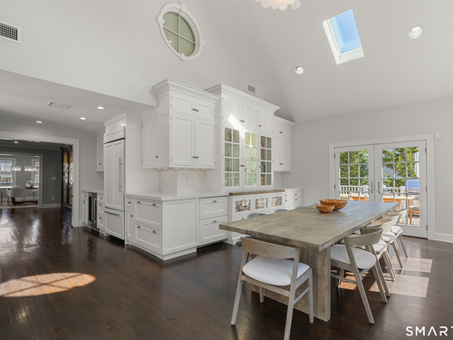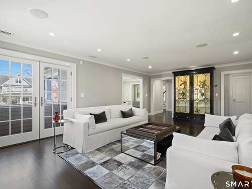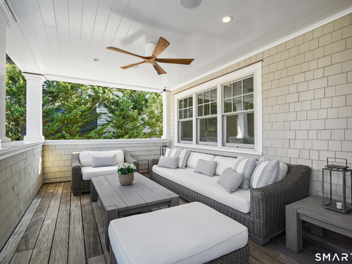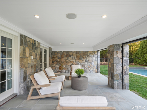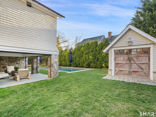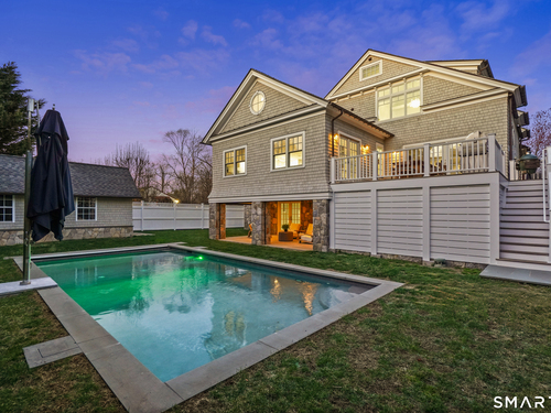 Welcome to 7 Grimes Road, a rare opportunity within one of Old Greenwich's private waterfront associations known for its relaxed, community-oriented feel. Where the sound is part of your day, not just your view. Private beach, boating and raft docks, think Sag Harbor, just an hour from NYC, no Jitney required. On a quiet cul-de-sac, with over 5000 SF this turnkey home was designed for everyday living and entertaining. A covered front porch leads to formal living and dining rooms, a relaxed family room, and a partially vaulted eat-in Putnam Design kitchen complete with Wolf and Sub-Zero appliances, all extending to a rear south facing deck overlooking the pool, terrace and detached 240 SF potential Cabana. A main level office with full bath provides flexibility for WFH, au pair, or guests. The upper level, with views of the Sound and beyond, includes a primary suite and three additional bedrooms. Vaulted ceilings bring in southern light throughout. The primary suite is defined by a well-appointed bath, two custom walk-in closets, and a dedicated dressing room. Two hall baths feature Waterworks hardware and Kohler Veils. Among the additional bedrooms, one includes a private balcony. Modern systems include a generator, tankless hot water, radiant heat across the lower and main levels, and central air. Smart home features include WiFi, Nest and Tekmar 521 thermostats, security, and multi-zoned audio throughout the first floor and outdoor spaces.