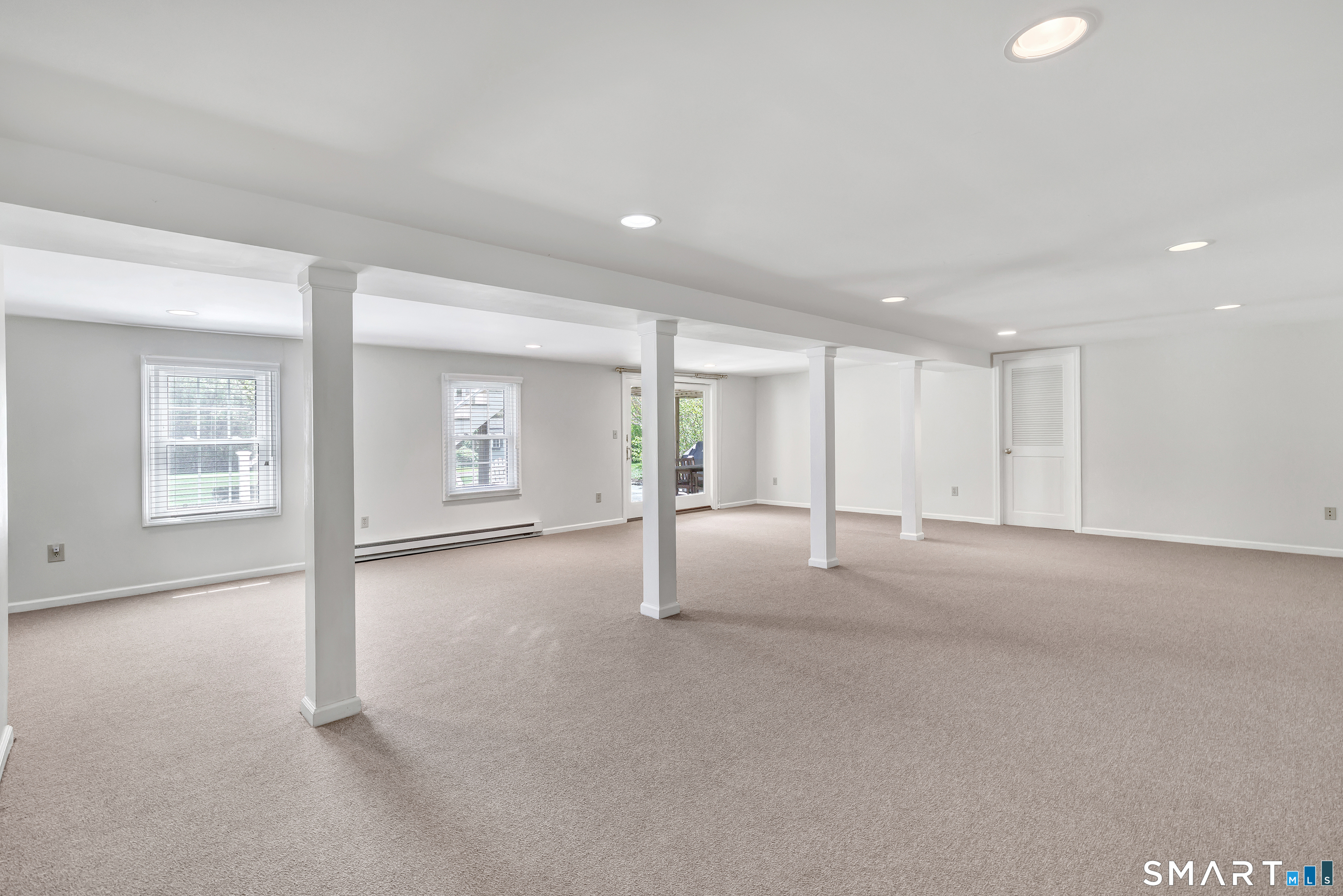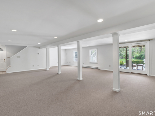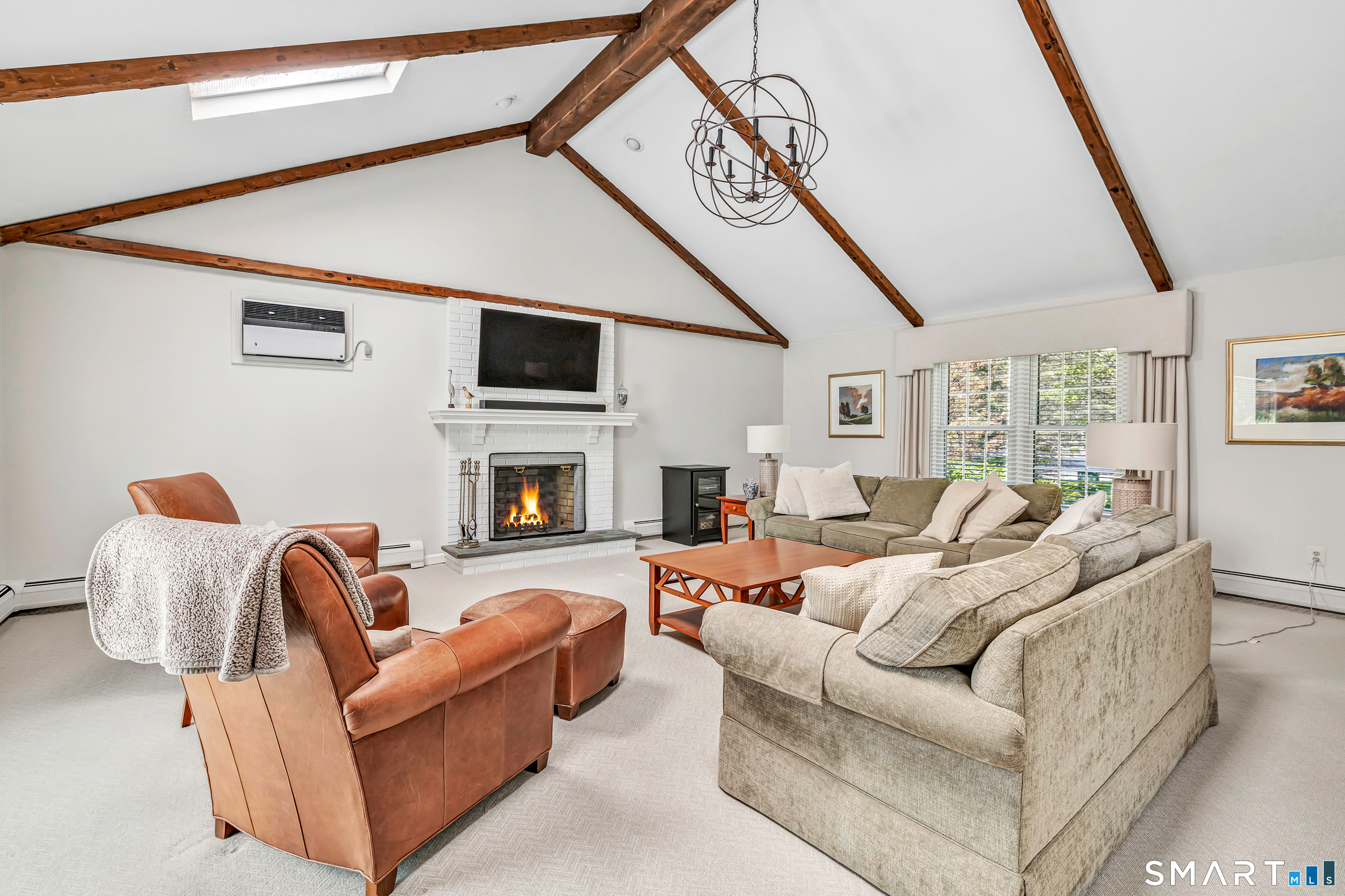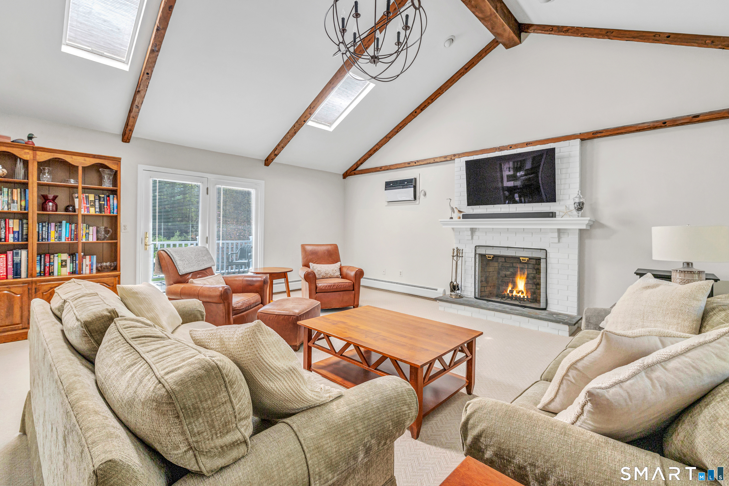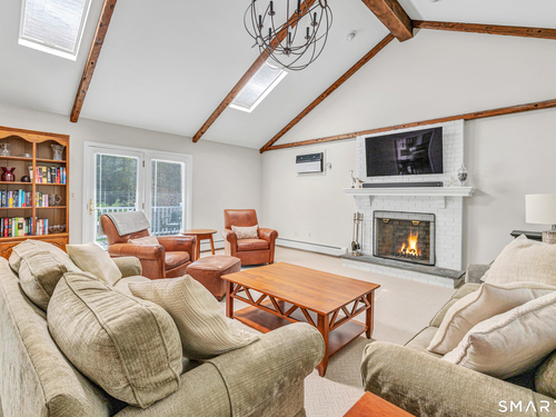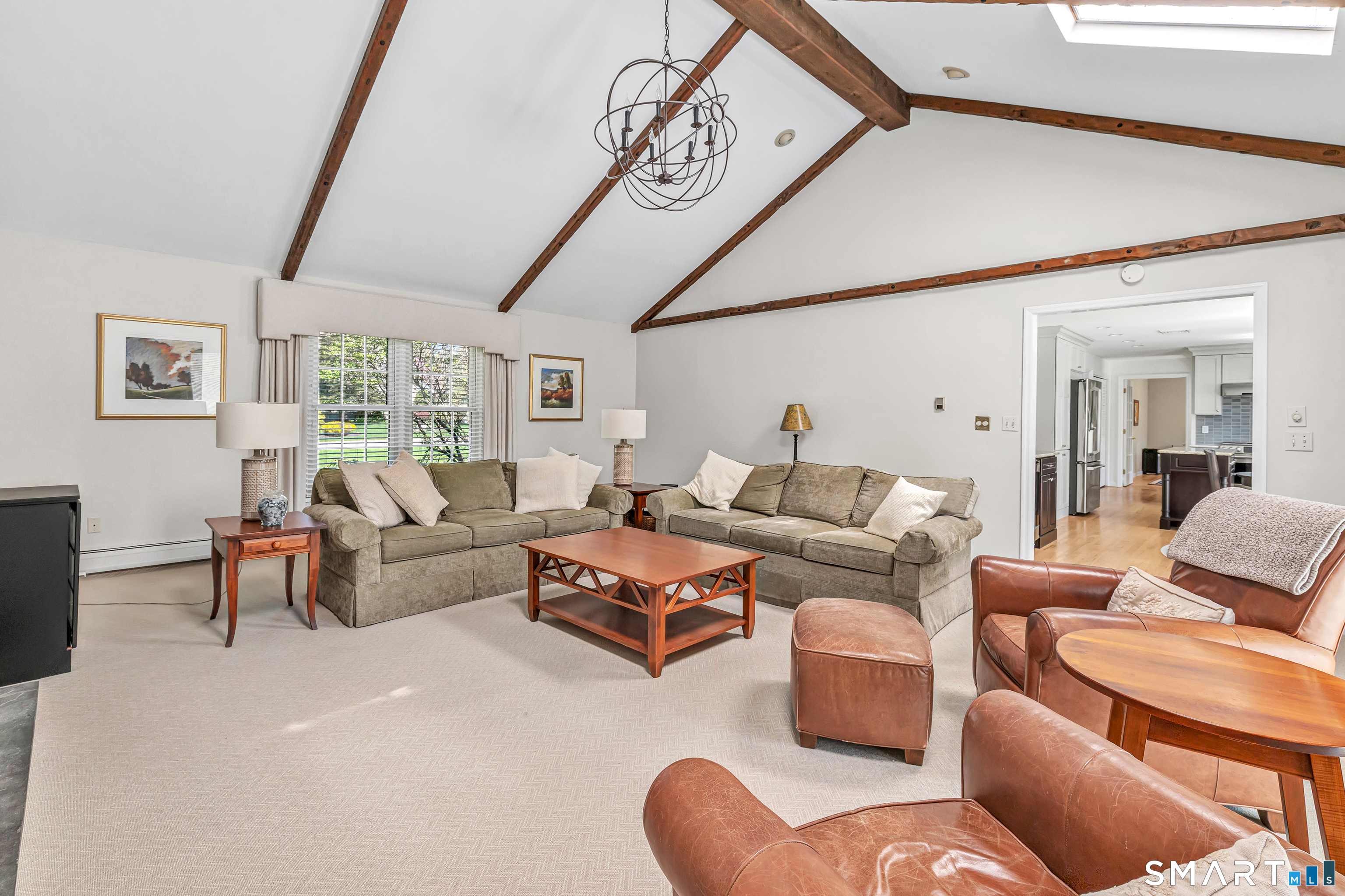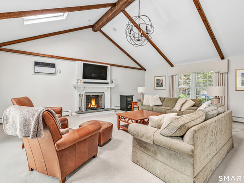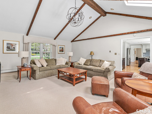 Family Room (Main Level)Cathedral Ceiling, Beams, Fireplace, French Doors, Wall/Wall Carpet