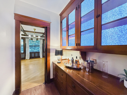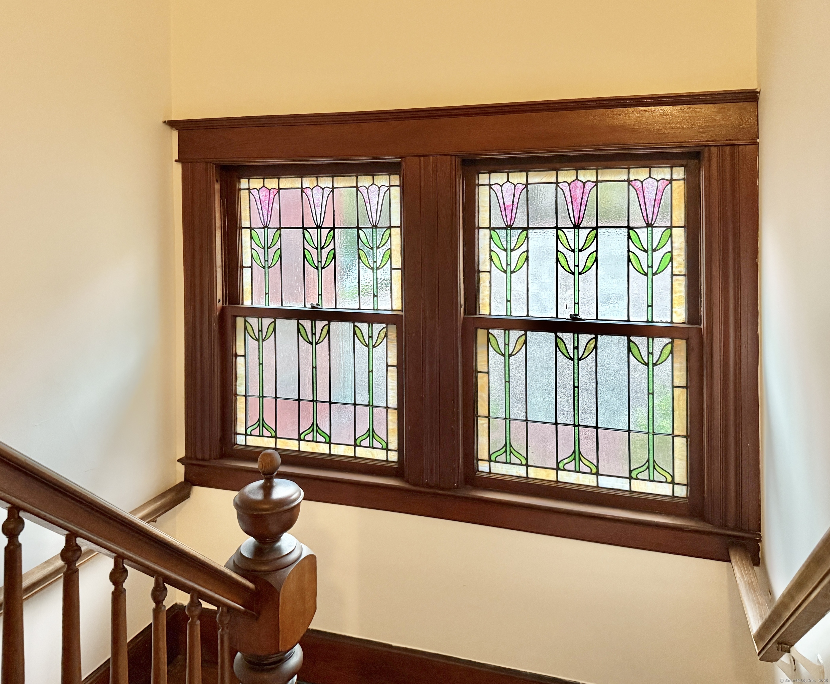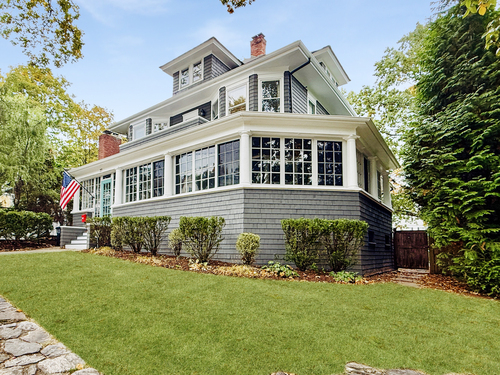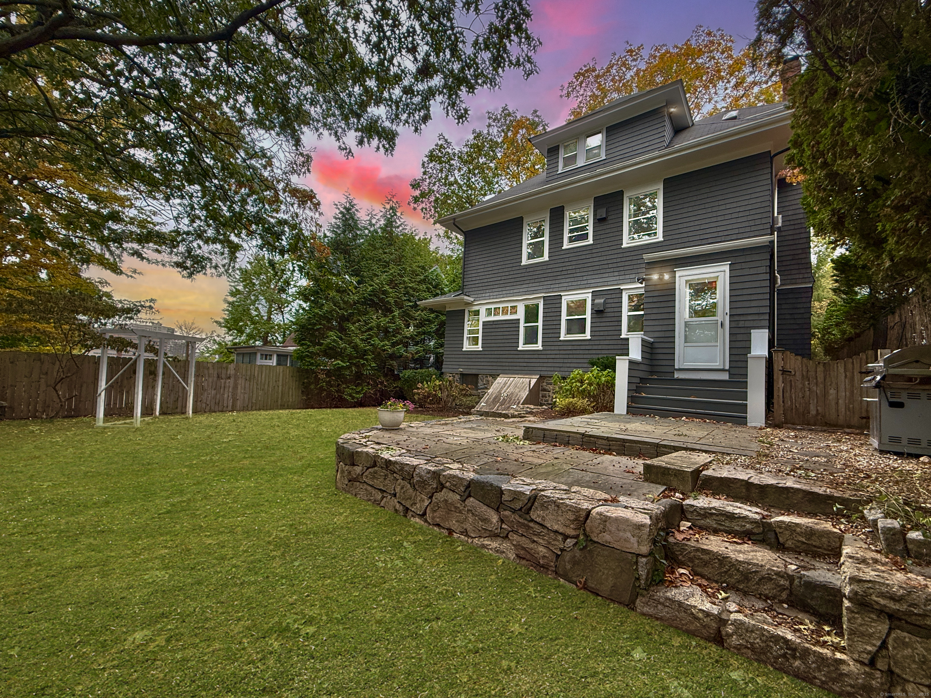 Built circa 1916, this distinguished Four Square Shingle-Style Colonial has been reimagined for modern living while preserving the timeless craftsmanship and character of its era. Set on a quiet, tree-lined stretch of a coveted downtown street, the home offers the rare combination of serenity and city convenience-just one mile to the Stamford train station & minutes to downtown's vibrant shops, dining, & nightlife. Step inside to discover exquisite period details at every turn: rich oak, mahogany, & pine millwork; a detailed brick fireplace; custom built-ins; wainscoting; coffered 9ft ceilings; & original stained-glass windows that cast warm, colorful light throughout the home. With 5 bedrooms & 3 full baths, the flexible layout includes a private third-floor suite-ideal for guests, nanny, or extended family. Built by the family who owned The Stamford Lumber Company, the home has been lovingly cared for & thoughtfully updated with a timeless kitchen featuring new appliances, thoughtfully renovated baths, and updated systems. A gracious wraparound porch invites relaxation & connection-perfect for morning coffee, evening cocktails, or gatherings with friends. Mature specimen plantings surround the home, creating a sense of privacy & calm. Perched above the city with tree top privacy, a stone patio, level lawn+ oversized 2 car garage on Valley Road, this residence embodies the perfect blend of architectural heritage, comfort & sophistication.
