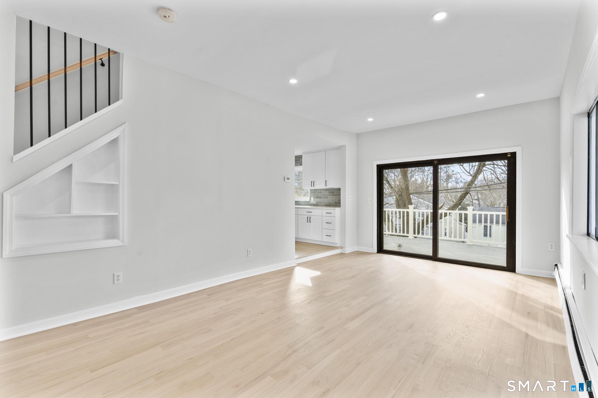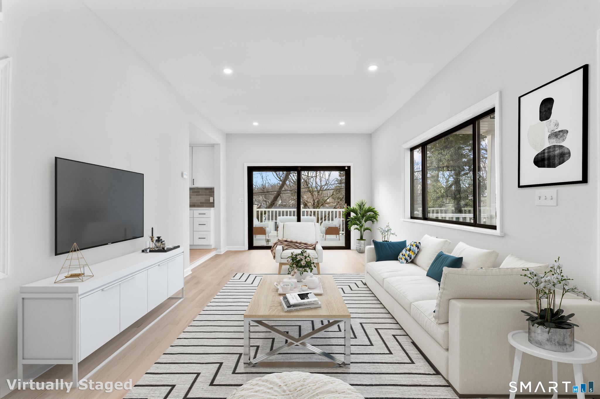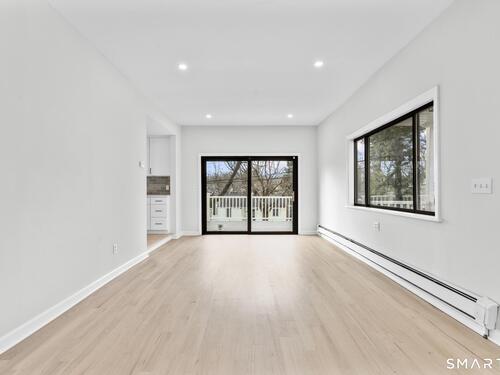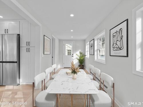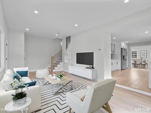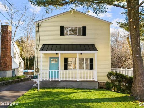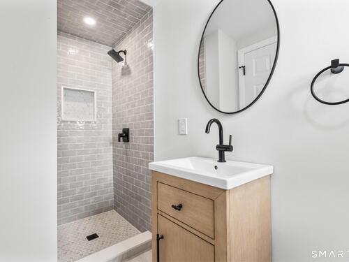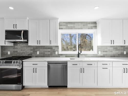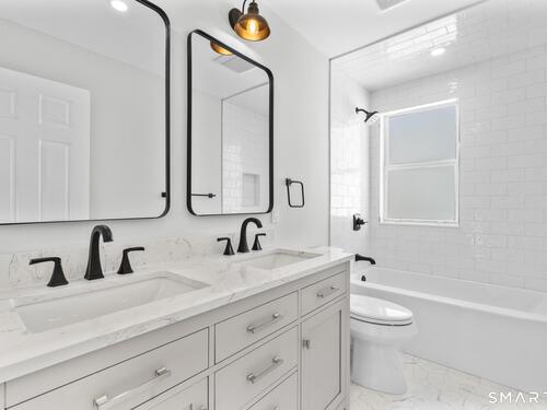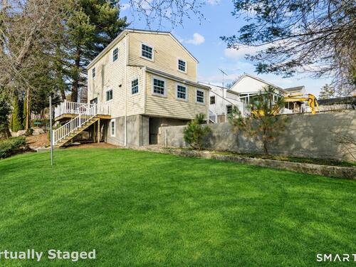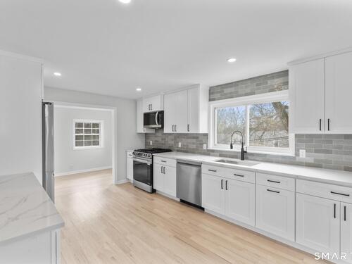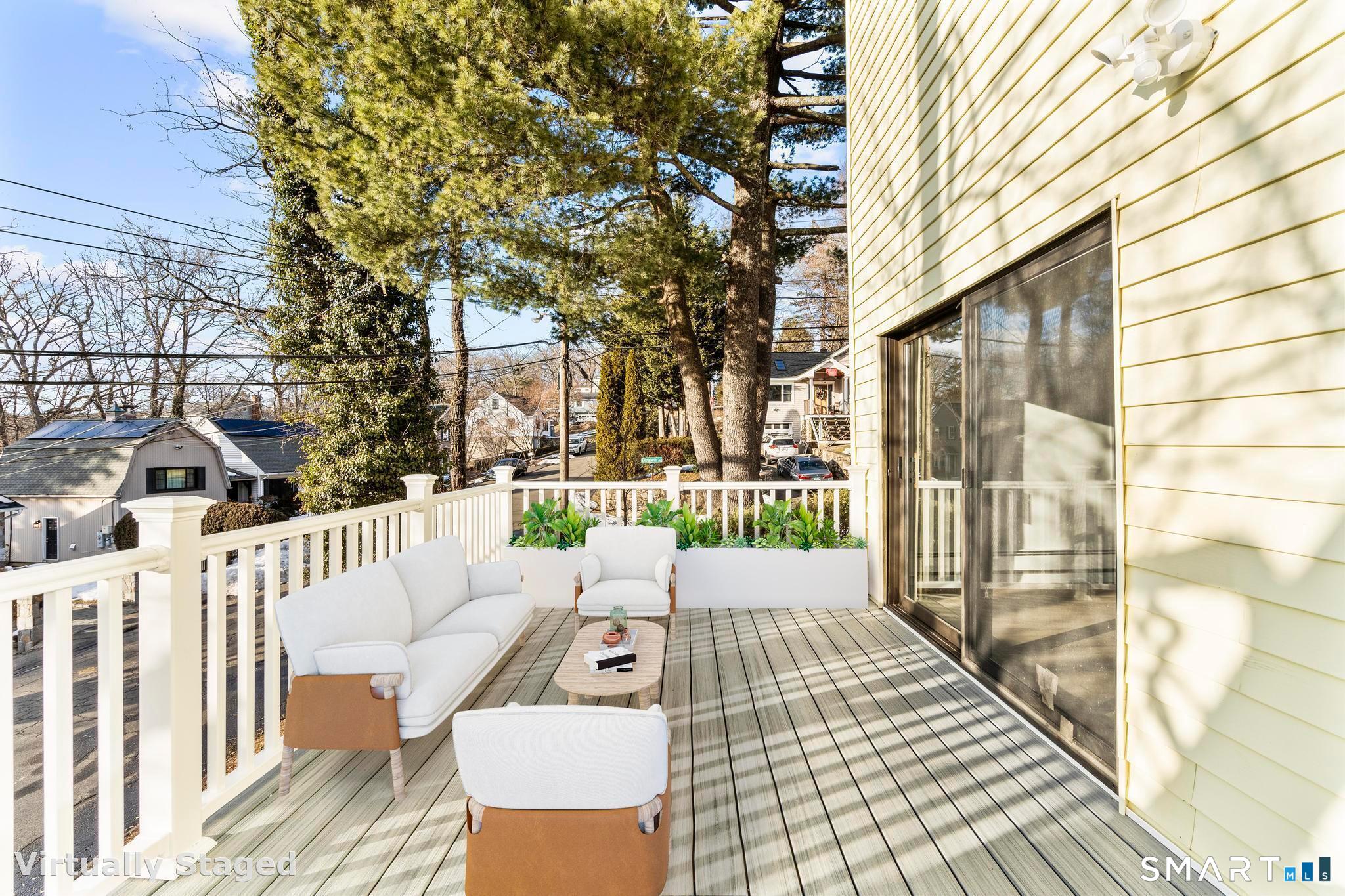 Welcome to this fully renovated 4 bedroom, 2 bath Colonial ideally located in the heart of Springdale. A charming front porch with a sleek standing seam metal roof creates a striking first impression and leads into a bright, oversized living room filled with natural light. An oversized sliding glass door opens to a brand new Trex style deck overlooking the backyard, creating a seamless flow for indoor and outdoor living. The stunning modern kitchen features shaker cabinetry w/ soft close drawers, quartz countertops, stainless steel appliances - a clean, timeless design. Adjacent to the kitchen is a dedicated dining area, along w/ a versatile 1st floor bedroom and/or home office w/ a beautifully renovated full bath featuring a stylish walk in shower. Upstairs, a luxurious primary suite offers vaulted ceilings & a spacious walk in closet. Two additional bedrooms and a brand new hall bath complete w/ a dual vanity, soaking tub, & sophisticated finishes. The lower level provides excellent flex space perfect for a den or playroom, with direct walk out access to the backyard. A well appointed laundry area with folding station, abundant basement storage, and additional attic storage enhance the home's functionality. Natural gas, city water, and city sewer, perfectly positioned on a quiet street just minutes from the Springdale train station, local shops, restaurants, downtown Stamford, and convenient access to both I95 and the Merritt Parkway. Modern living at its finest!