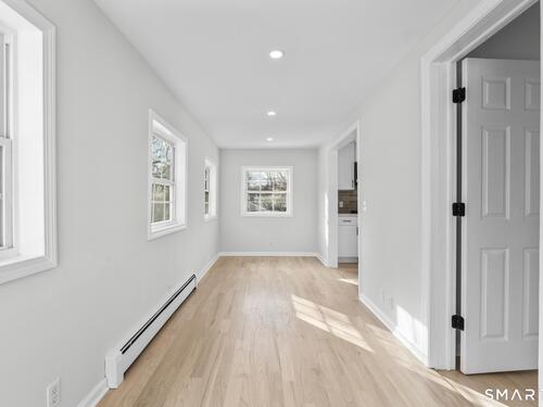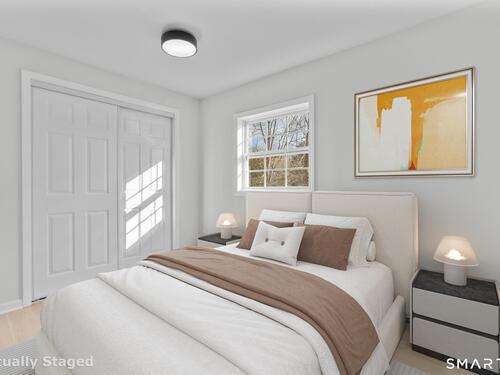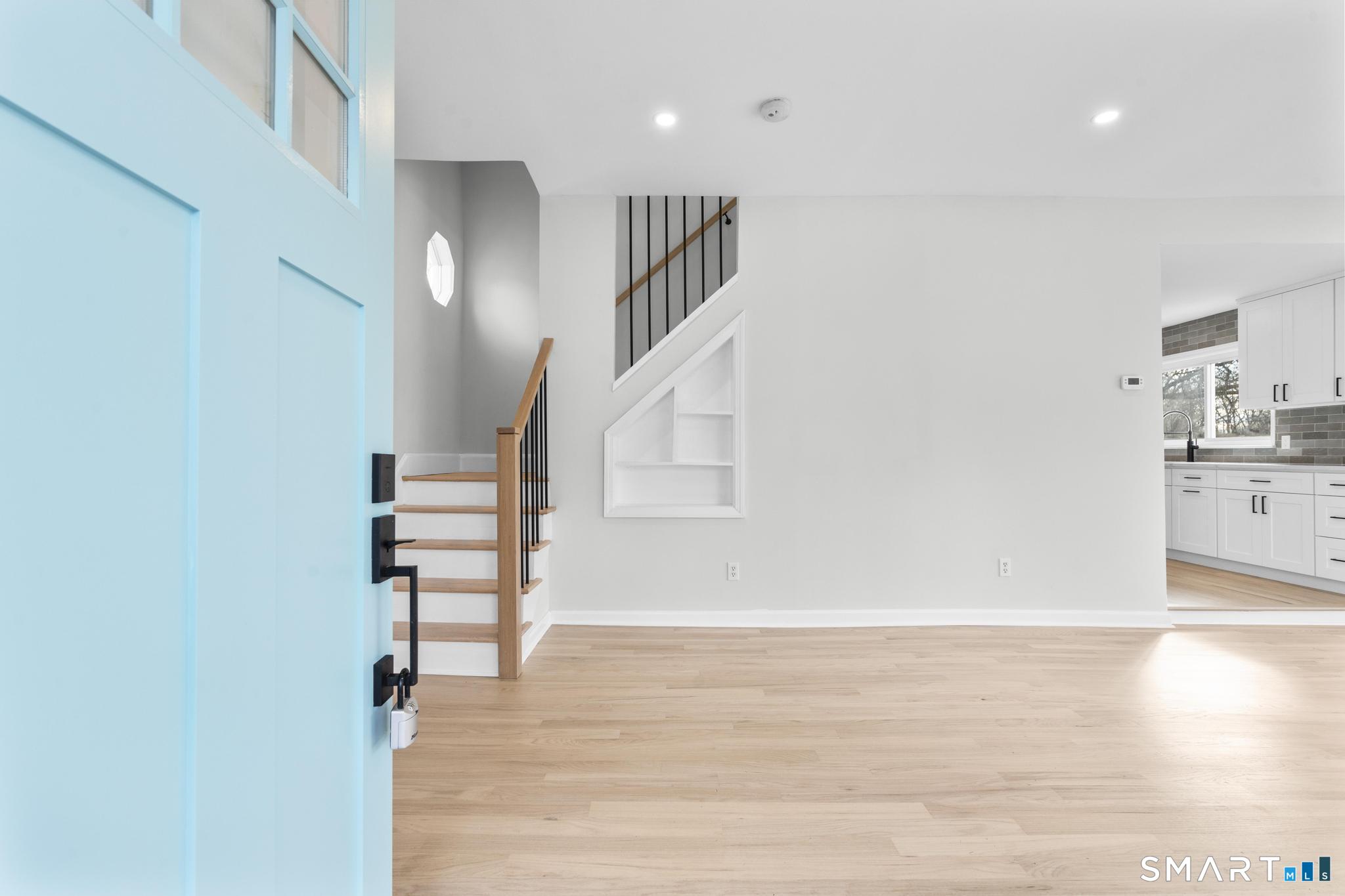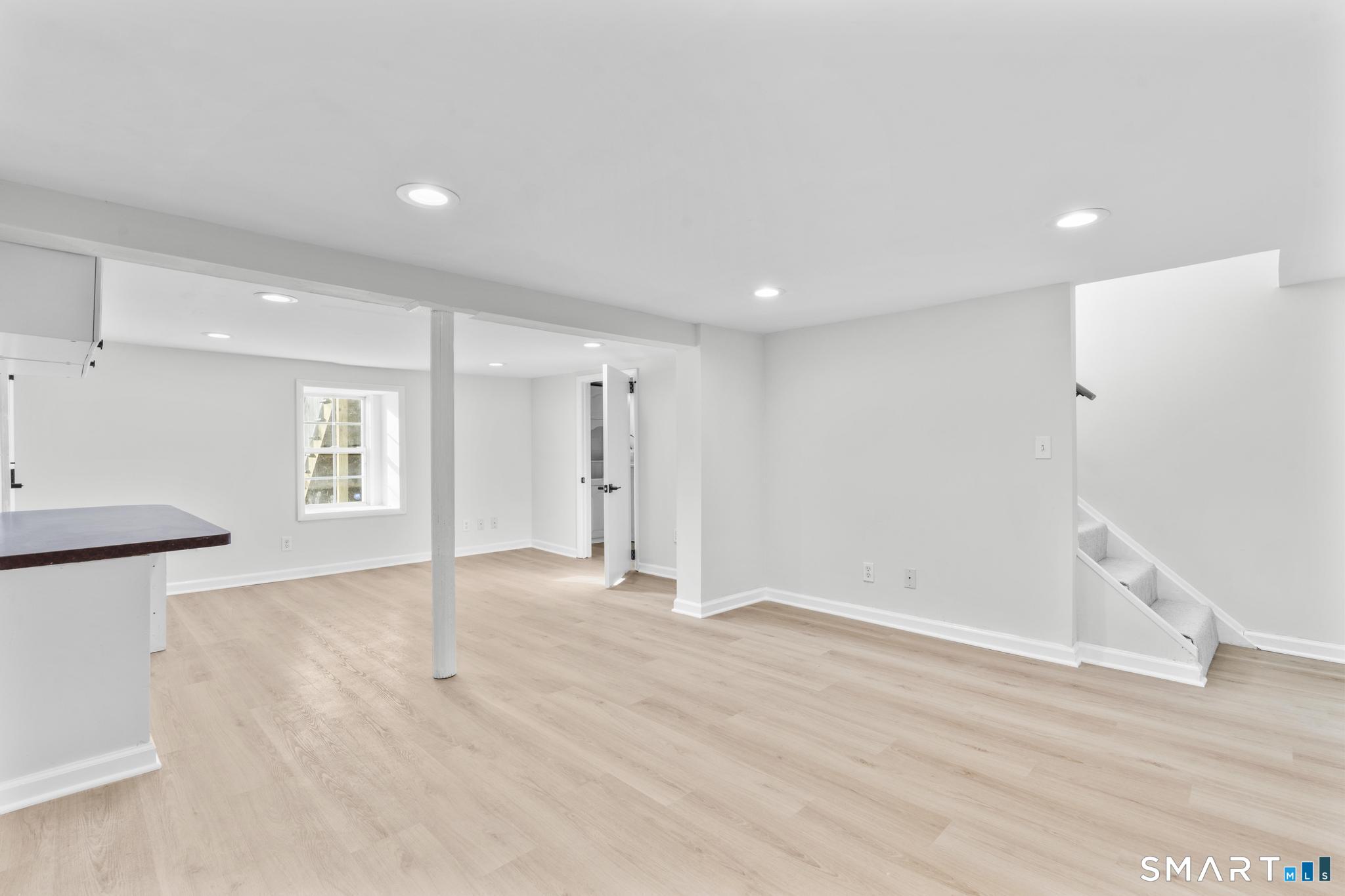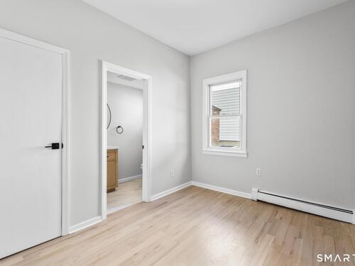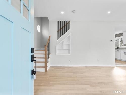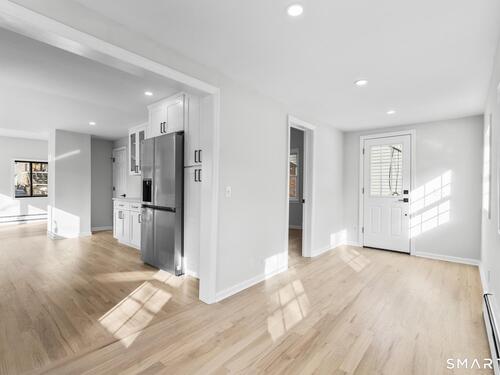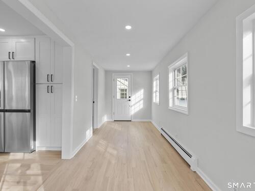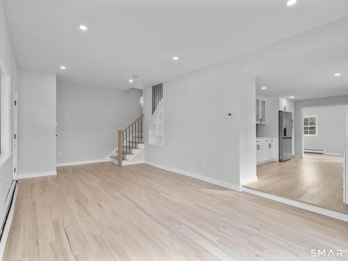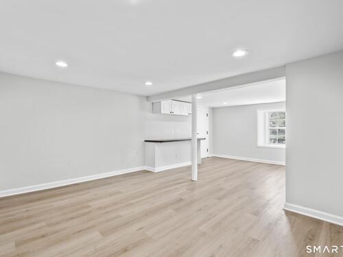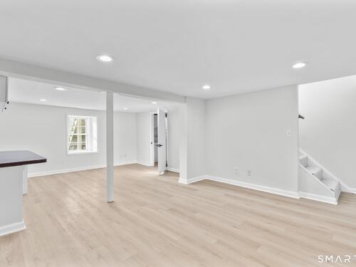 Welcome to this fully renovated 4 bedroom, 2 bath Colonial ideally located in the heart of Springdale. A charming front porch with a sleek standing seam metal roof creates a striking first impression and leads into a bright, oversized living room filled with natural light. An oversized sliding glass door opens to a brand new Trex style deck overlooking the backyard, creating a seamless flow for indoor and outdoor living. The stunning modern kitchen features shaker cabinetry w/ soft close drawers, quartz countertops, stainless steel appliances - a clean, timeless design. Adjacent to the kitchen is a dedicated dining area, along w/ a versatile 1st floor bedroom and/or home office w/ a beautifully renovated full bath featuring a stylish walk in shower. Upstairs, a luxurious primary suite offers vaulted ceilings & a spacious walk in closet. Two additional bedrooms and a brand new hall bath complete w/ a dual vanity, soaking tub, & sophisticated finishes. The lower level provides excellent flex space perfect for a den or playroom, with direct walk out access to the backyard. A well appointed laundry area with folding station, abundant basement storage, and additional attic storage enhance the home's functionality. Natural gas, city water, and city sewer, perfectly positioned on a quiet street just minutes from the Springdale train station, local shops, restaurants, downtown Stamford, and convenient access to both I95 and the Merritt Parkway. Modern living at its finest!