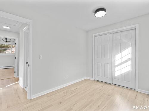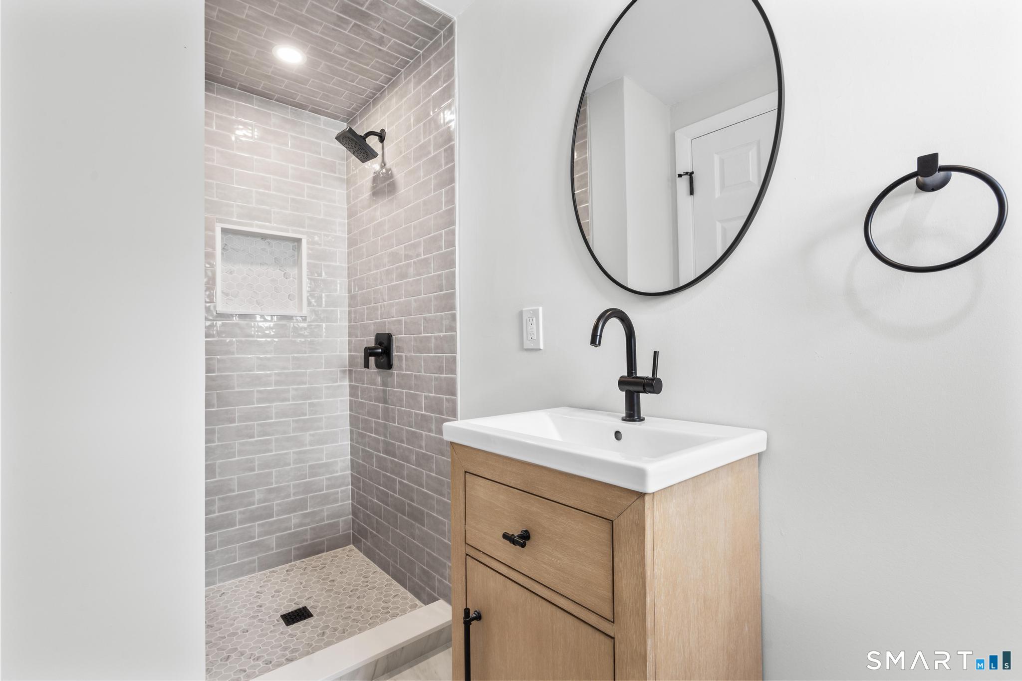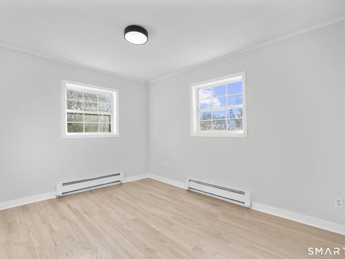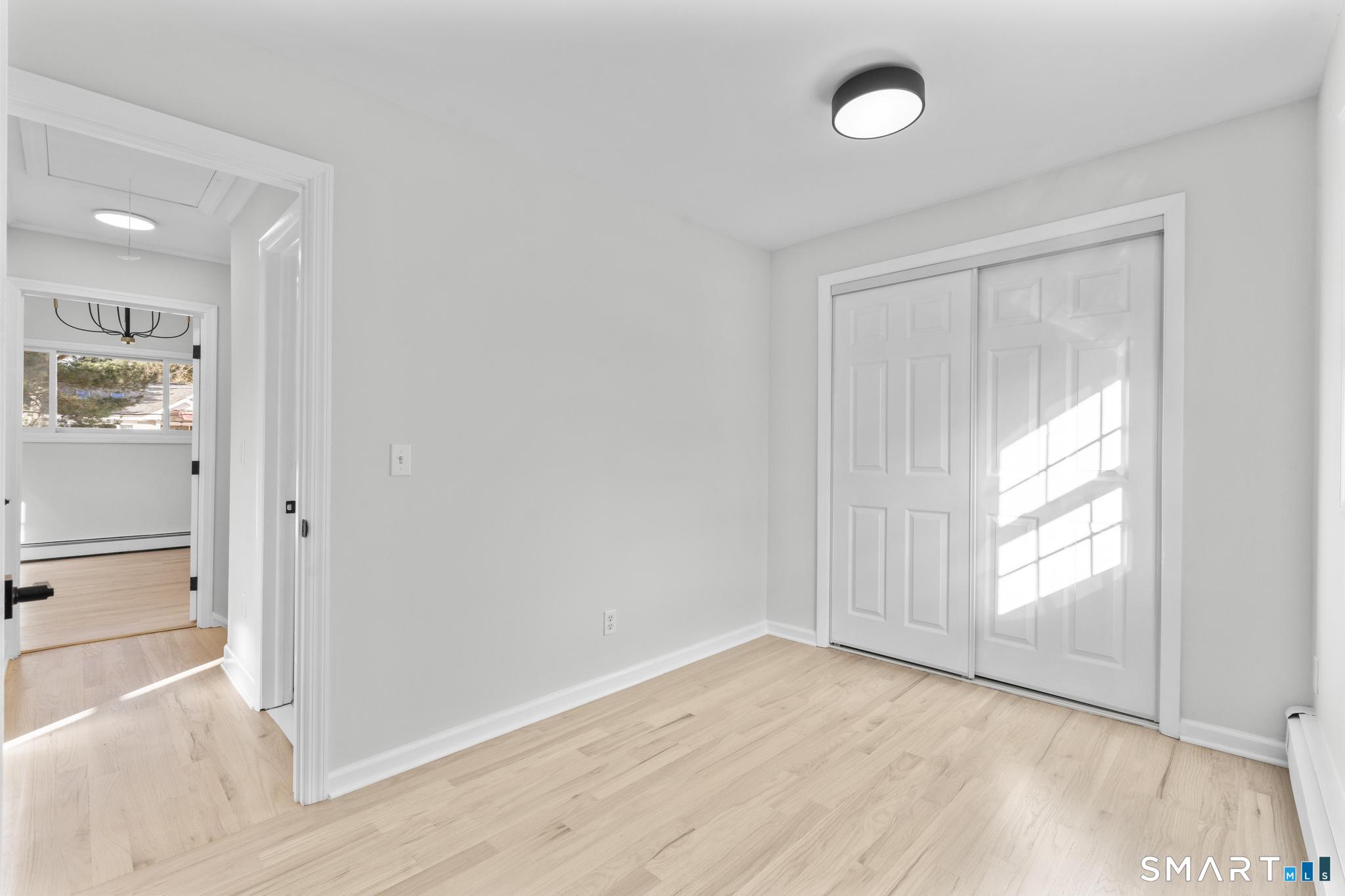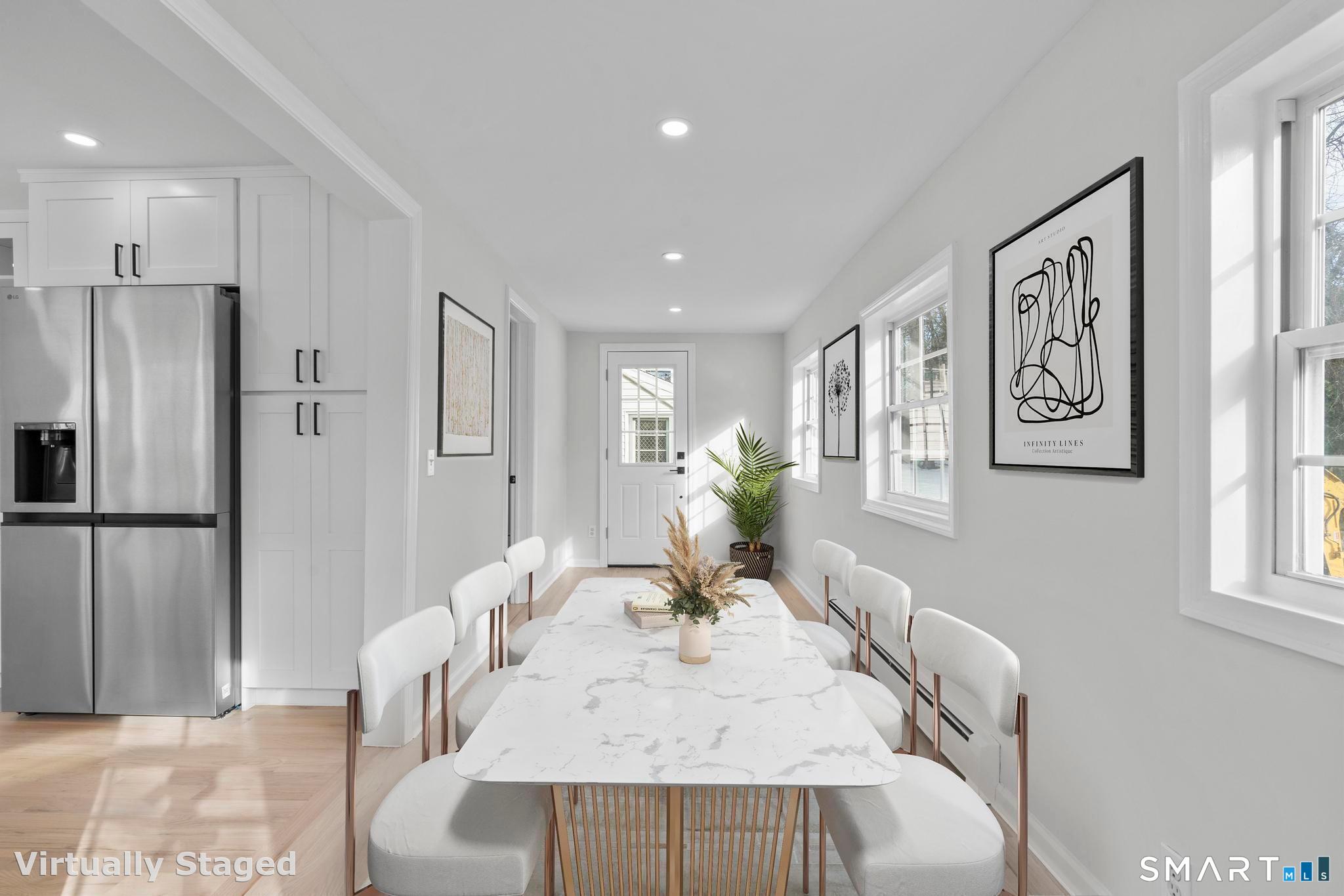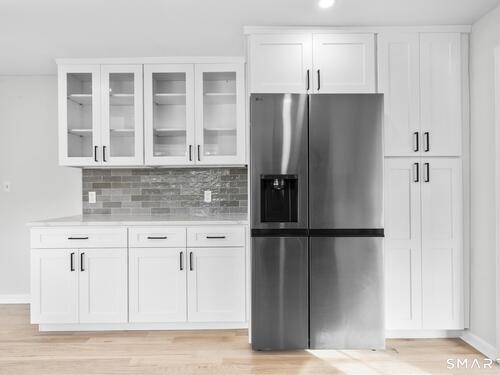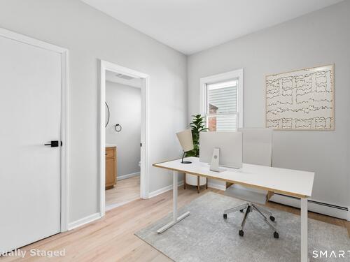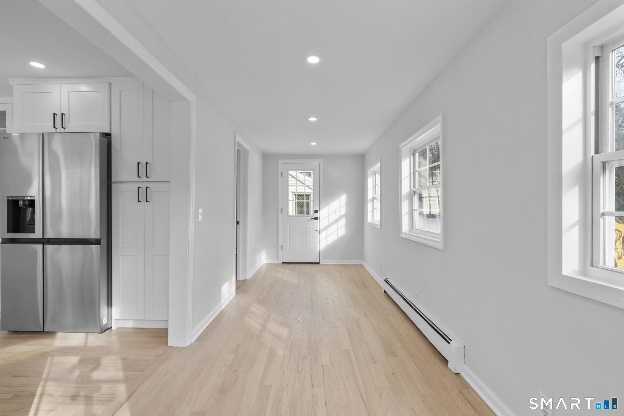 Welcome to this fully renovated 4 bedroom, 2 bath Colonial ideally located in the heart of Springdale. A charming front porch with a sleek standing seam metal roof creates a striking first impression and leads into a bright, oversized living room filled with natural light. An oversized sliding glass door opens to a brand new Trex style deck overlooking the backyard, creating a seamless flow for indoor and outdoor living. The stunning modern kitchen features shaker cabinetry w/ soft close drawers, quartz countertops, stainless steel appliances - a clean, timeless design. Adjacent to the kitchen is a dedicated dining area, along w/ a versatile 1st floor bedroom and/or home office w/ a beautifully renovated full bath featuring a stylish walk in shower. Upstairs, a luxurious primary suite offers vaulted ceilings & a spacious walk in closet. Two additional bedrooms and a brand new hall bath complete w/ a dual vanity, soaking tub, & sophisticated finishes. The lower level provides excellent flex space perfect for a den or playroom, with direct walk out access to the backyard. A well appointed laundry area with folding station, abundant basement storage, and additional attic storage enhance the home's functionality. Natural gas, city water, and city sewer, perfectly positioned on a quiet street just minutes from the Springdale train station, local shops, restaurants, downtown Stamford, and convenient access to both I95 and the Merritt Parkway. Modern living at its finest!