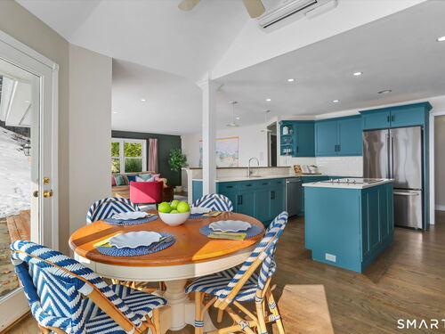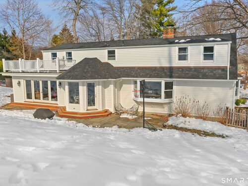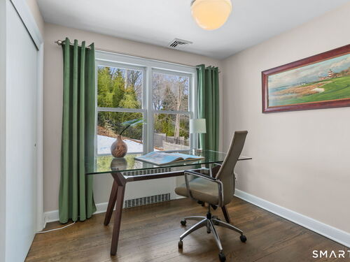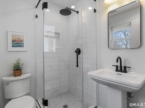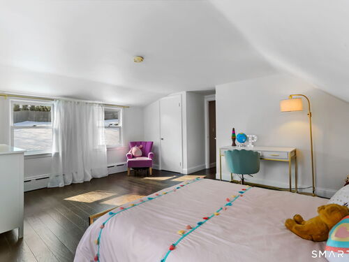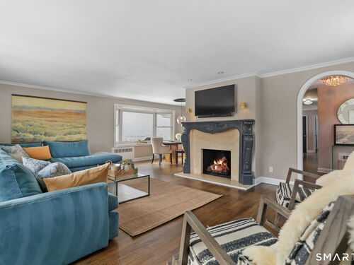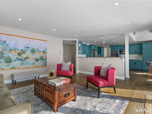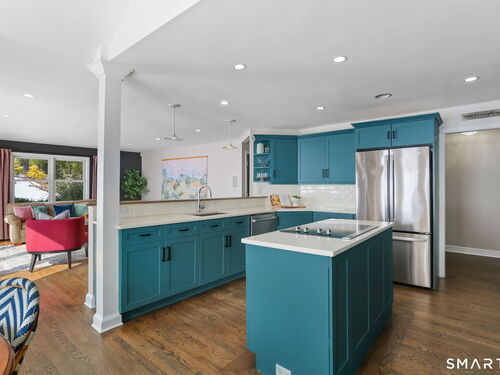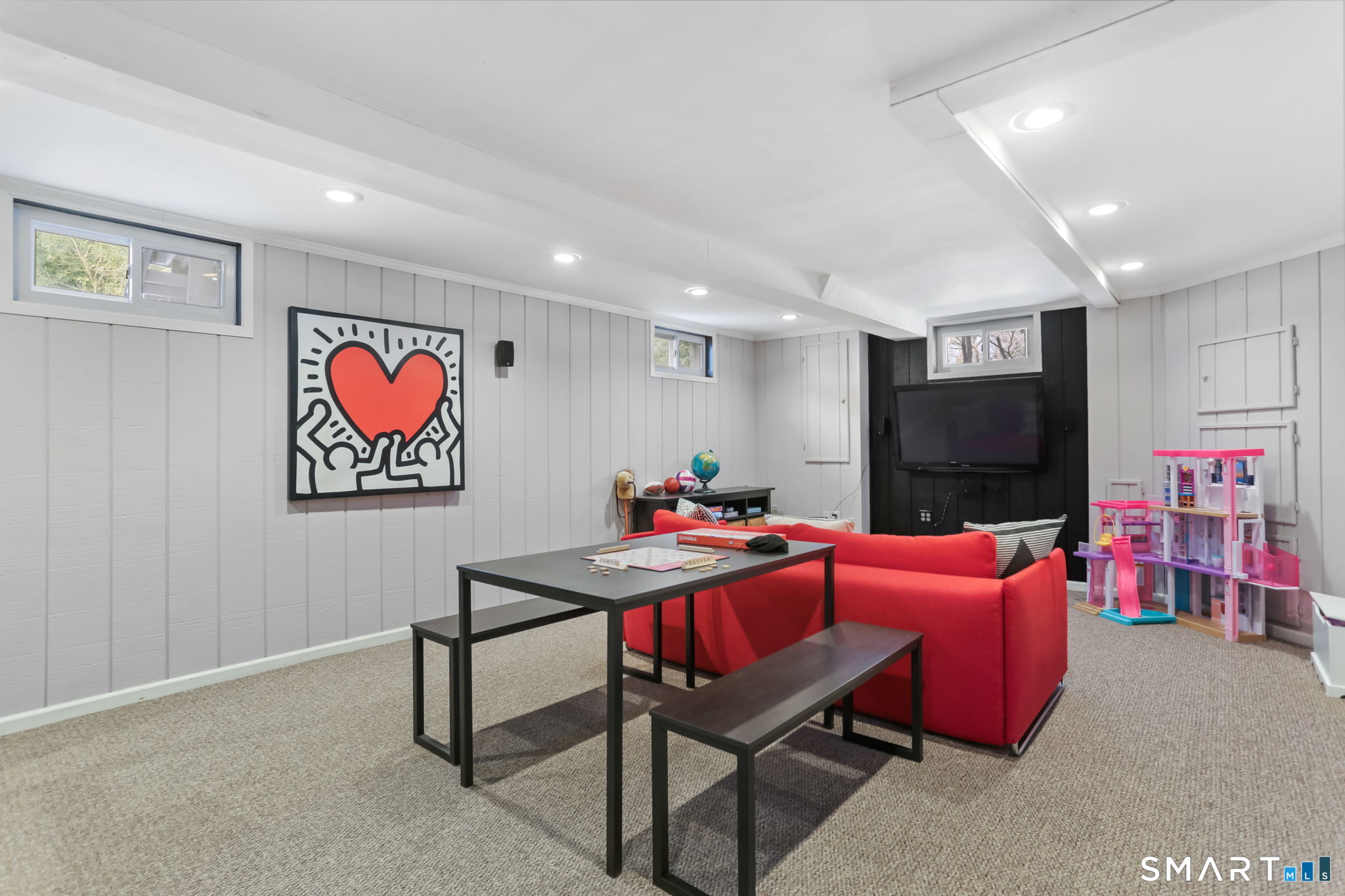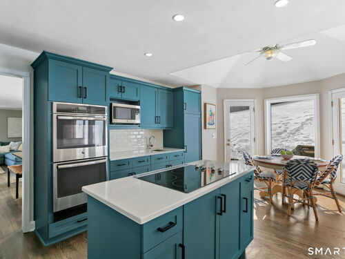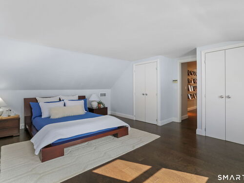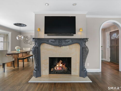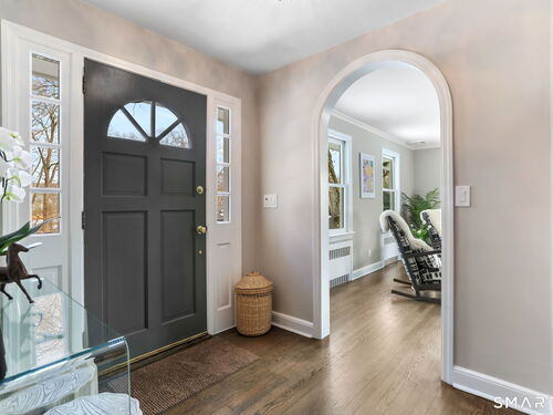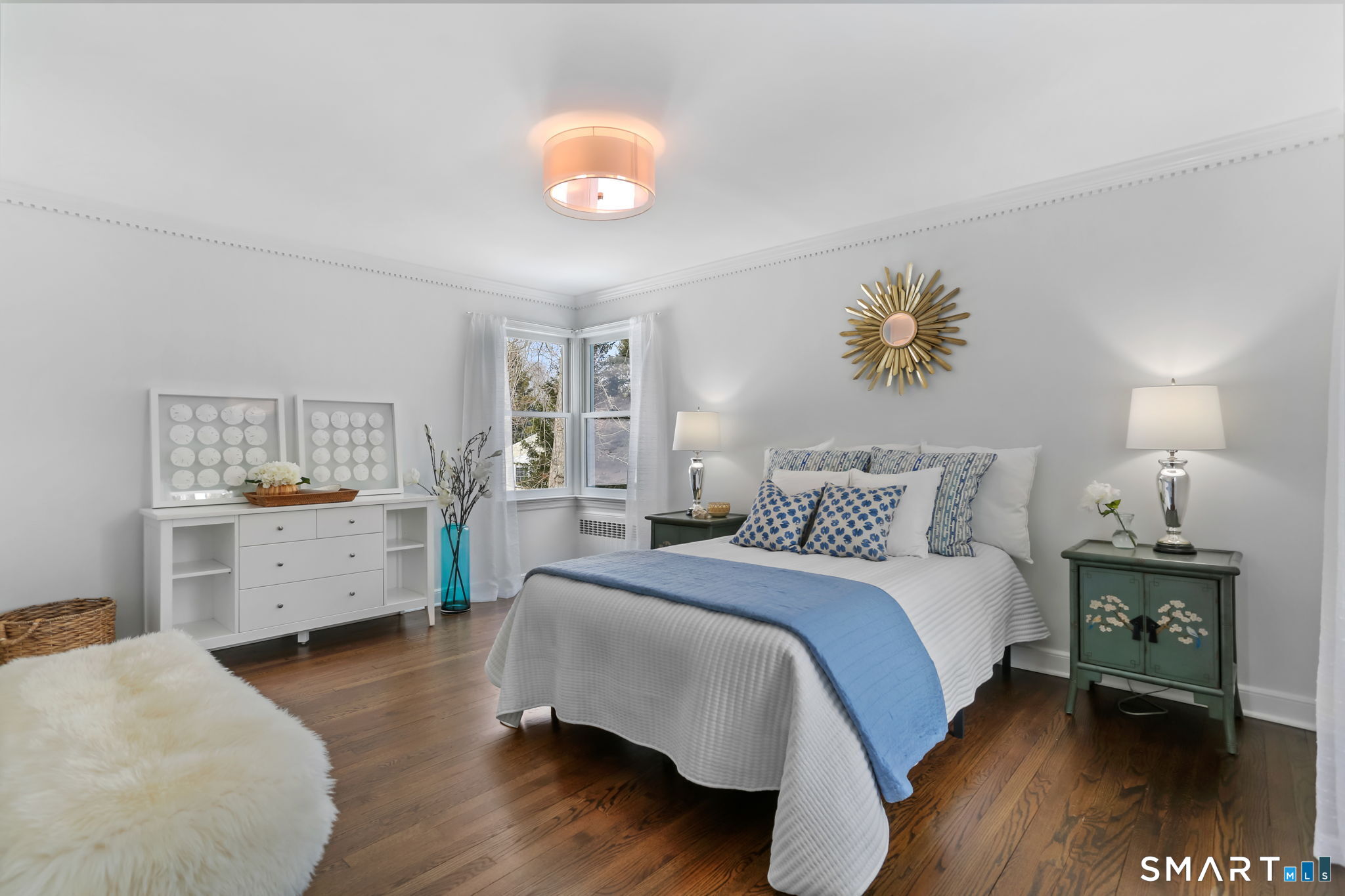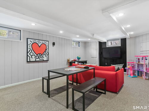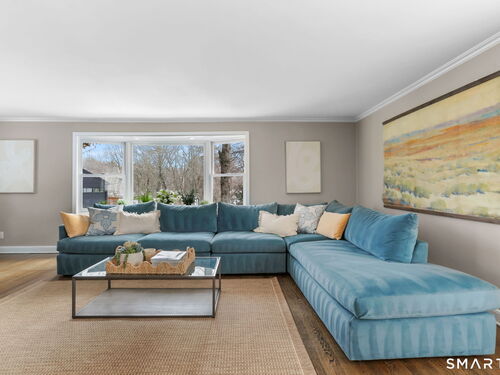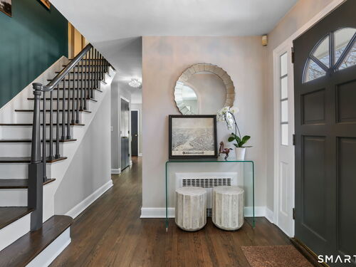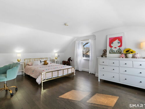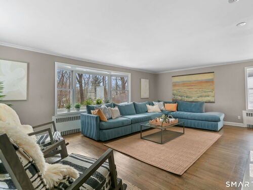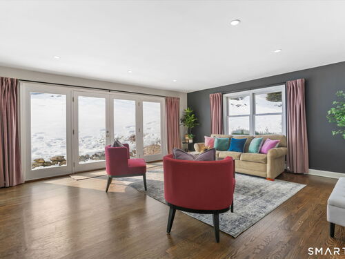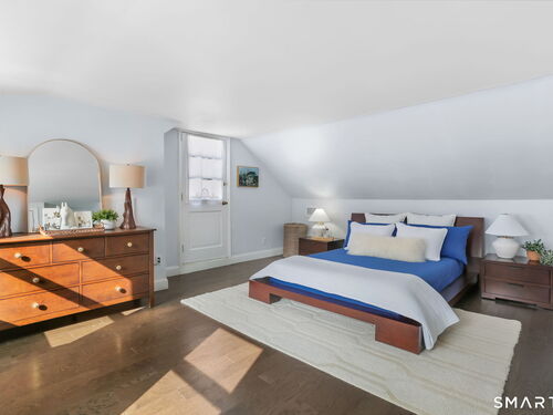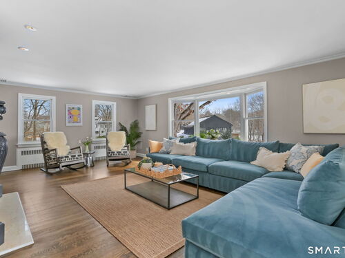 Westport Phenom: Anthropology-inspired, sun-drenched, stylish and inviting 4 Bed, 3 Full Bath home on .7 acres on a quiet cul-de-sac located in the coveted Greens Farms neighborhood, easily walkable to grocery, restaurants, shops, schools. Gleaming hardwood floors throughout add warmth and character. Spacious front living room with a show-stopping fireplace connects to cheery dining room. Great entertaining flow with an open concept kitchen and adjoining family room - both with French doors onto a large stone patio overlooking the lush, pretty backyard. New kitchen cabinets plus Island, double ovens, two sinks, bar stool counter. Recent upgrades: New Roof, Hardie Board siding, Central AC, Whole House Generator, Oil Tank, Cedar Fencing, Tree Landscaping and more. Flexible floorplan w/two Primary options: First-Floor Primary with new en-suite bath or Upper-level with wrap-around balcony and two closets, one walk-in. Luxurious second floor full hallway bath with radiant heat floors, double sink quartz vanity, plenty of storage. Oversized two-car garage, fully-finished walk-out basement with mudroom/laundry, gym, rec room. Fully-fenced backyard with flat areas for playsets/sports. Stellar curb appeal w/stone retaining walls, steps, Belgian Block lined driveway and commanding presence on its elevated "Builder's Prime Lot" at the end of the cul-de-sac - no thru traffic. Incredibly peaceful, private property near Metro North, beaches, shops, top-rated schools - in fabulous Westport!