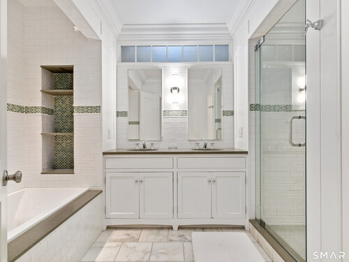 Set on a private, in-town 1.5-acre parcel, this custom shingle-style home offers refined design and exceptional craftsmanship throughout. Thoughtfully sited to capture southern, western, and eastern exposures, the home captures natural light from sunrise to sunset. Architectural highlights include intricate millwork, wide oak-plank flooring, dramatic ceilings, arched doorways, and extensive built-ins. The chef's kitchen features custom cabinetry, a striking handcrafted zinc island, and Wolf and Sub-Zero appliances. Oversized Kolbe windows frame views of the parklike property and bluestone patio, complete with an outdoor fireplace, built-in grill, sitting wall, and covered lounge area. The walkout lower level offers a Stewart Filmscreen theater, fireside library, gym, and wet bar. Lutron HomeWorks provides seamless whole-home lighting control, complemented by integrated audio with 27 speakers for an elevated smart-home experience. An oversized 3-car garage with cathedral ceilings can accommodate two car lifts and offers exceptional flexibility for storage, hobbies, or entertainment. The third floor offers outstanding potential for additional living space, with major infrastructure elements already in tact. Energy-efficient geothermal HVAC and extensive LED lighting enhance comfort and efficiency throughout. Impeccable and move-in ready, this home was designed for effortless indoor outdoor living in a walk to town estate setting. Ample space for pool and ADU.