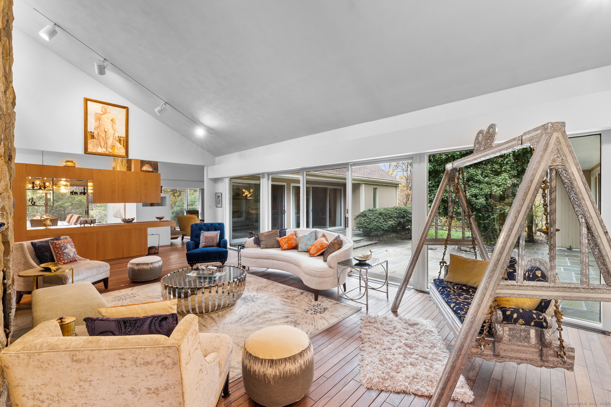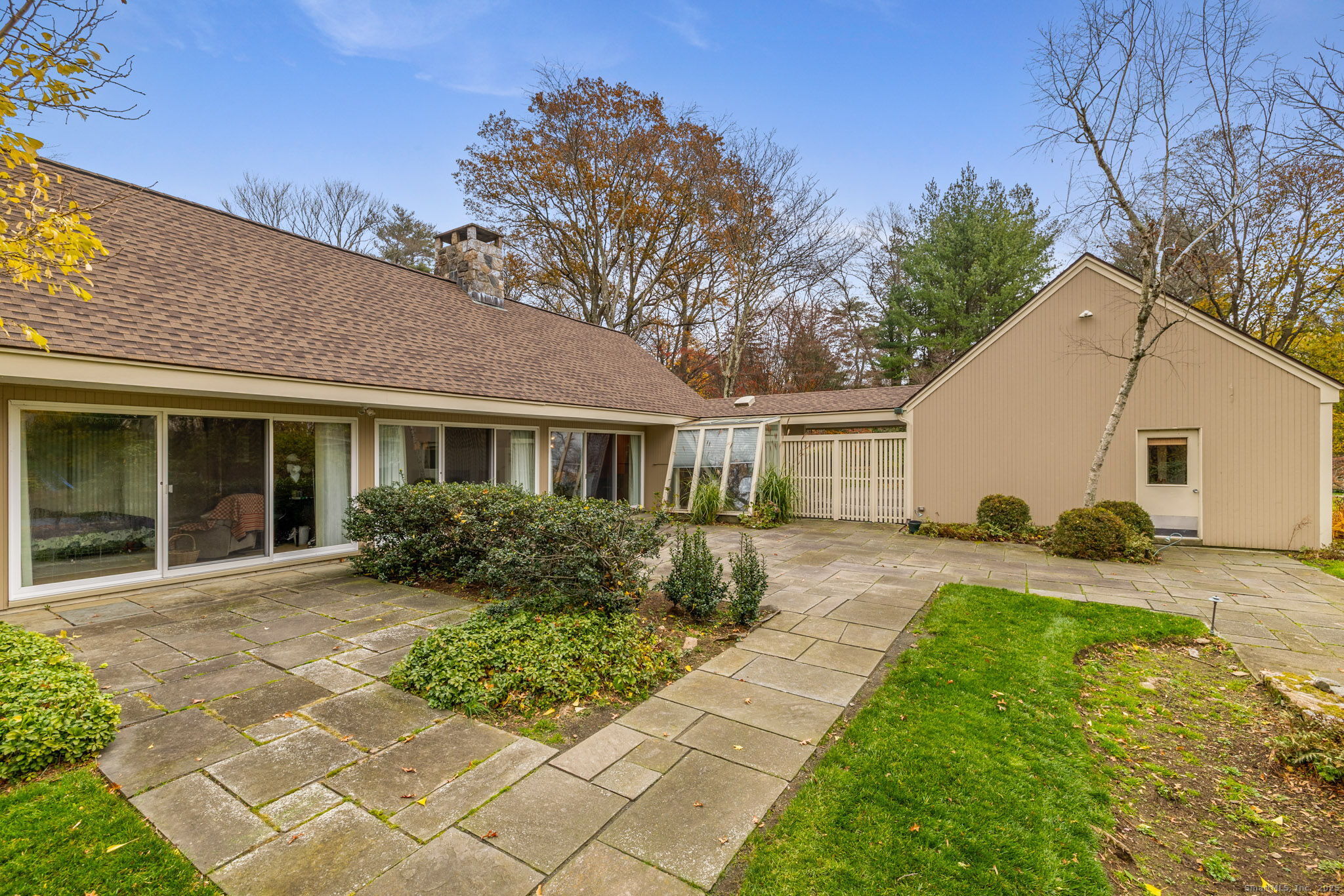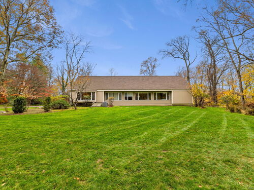 Experience resort-style living at 88 Starin Drive, a striking architectural estate set on over 4 acres of privacy in Stamford. Designed with dramatic volume and incredible natural light, this sprawling single-level ranch offers more than 5,000 square feet of sophisticated living space framed by walls of glass, soaring ceilings, and seamless indoor-outdoor flow. A spectacular floor-to-ceiling stone fireplace anchors multiple living areas, creating a warm and elegant atmosphere perfect for both grand entertaining and quiet evenings at home. The dining room feels like a gallery with its bold lines and oversized windows, while the expansive kitchen features custom wood cabinetry, granite counters, double sinks, and a sunlit breakfast nook set against a wall of angled glass. The bedroom wing includes spacious rooms filled with natural light, with the serene primary suite offering sliders to the grounds and a spa-style bath with beautiful tilework. The lower level adds even more livable space with a recreation room, fireplace, and walk-out access. Step outside and your private retreat unfolds with an in-ground pool, tennis court, stone patio, and lush landscaped grounds that make every day feel like a getaway. Additional features include ample heating system, central air, underground sprinklers, ample storage, and an ideal location close to parks, golf, and major commuter routes. This rare offering blends luxury, privacy, and timeless design in one extraordinary estate.