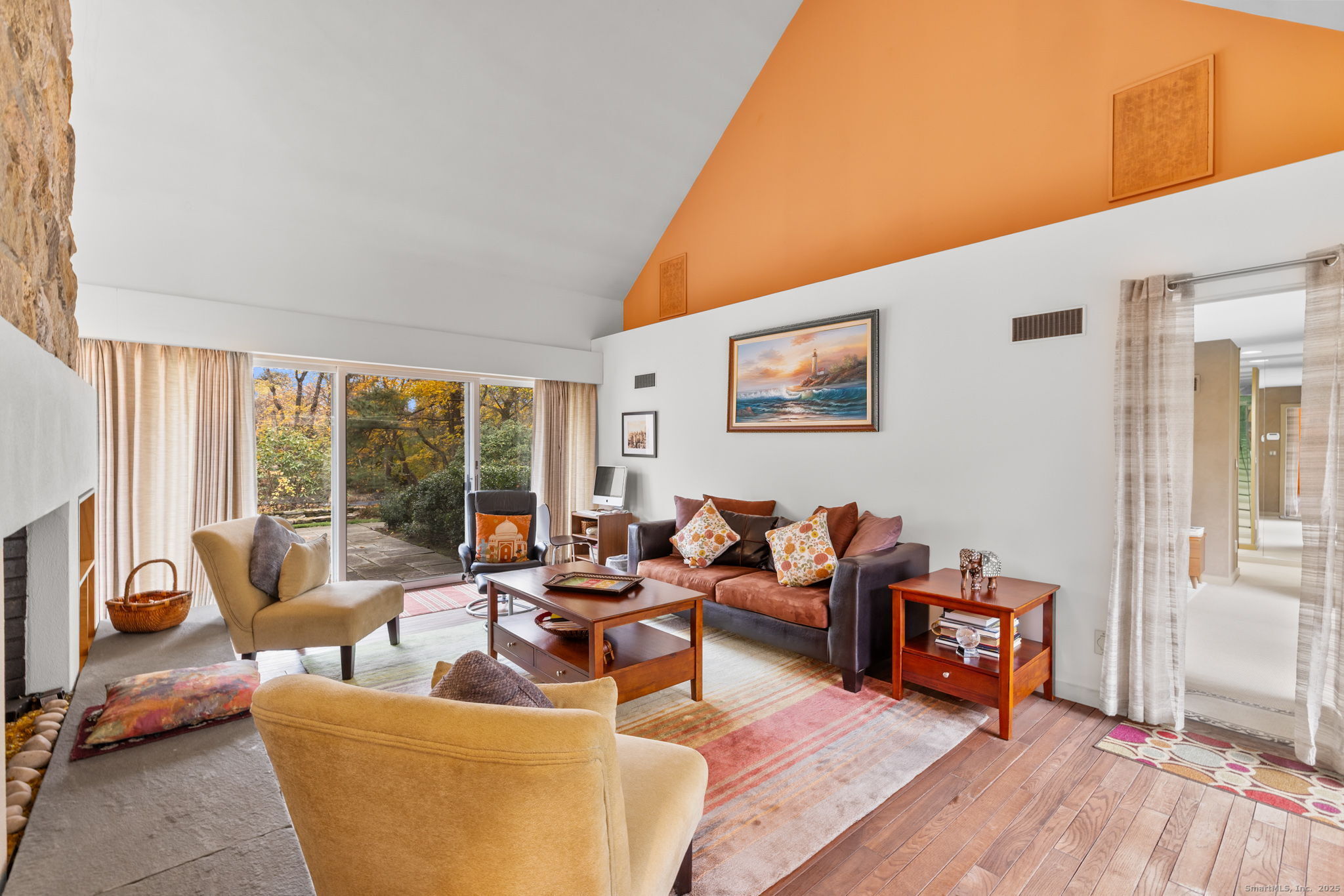 9 ft+ Ceilings, Fireplace, Patio/Terrace, Sliders, Hardwood Floor