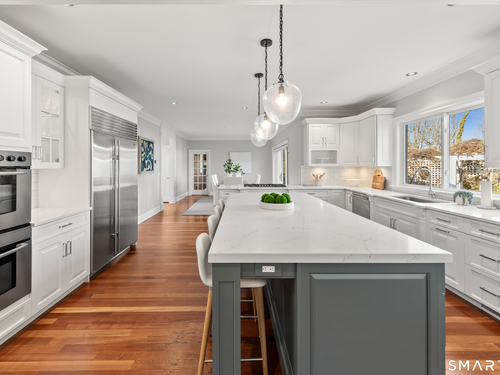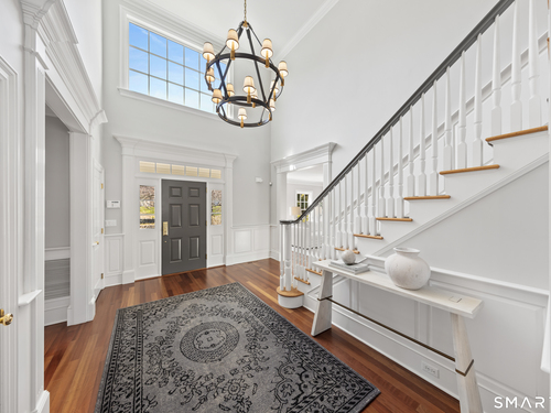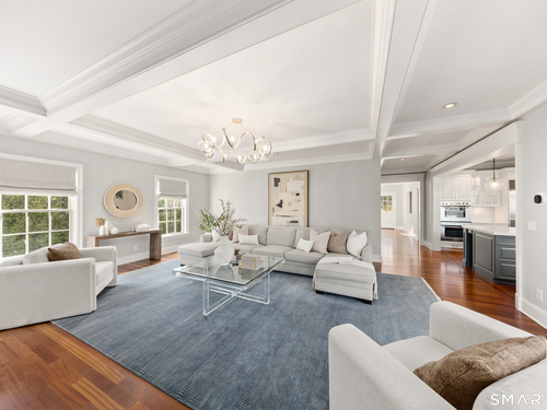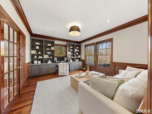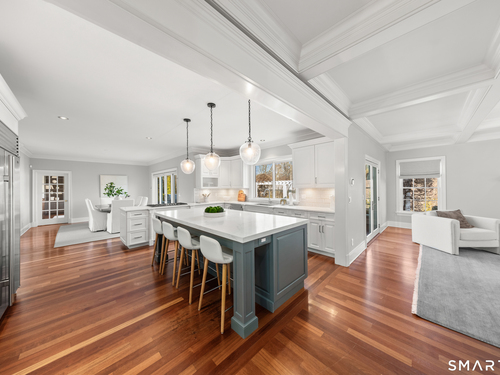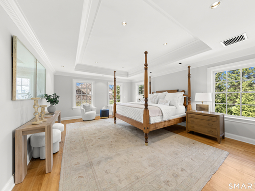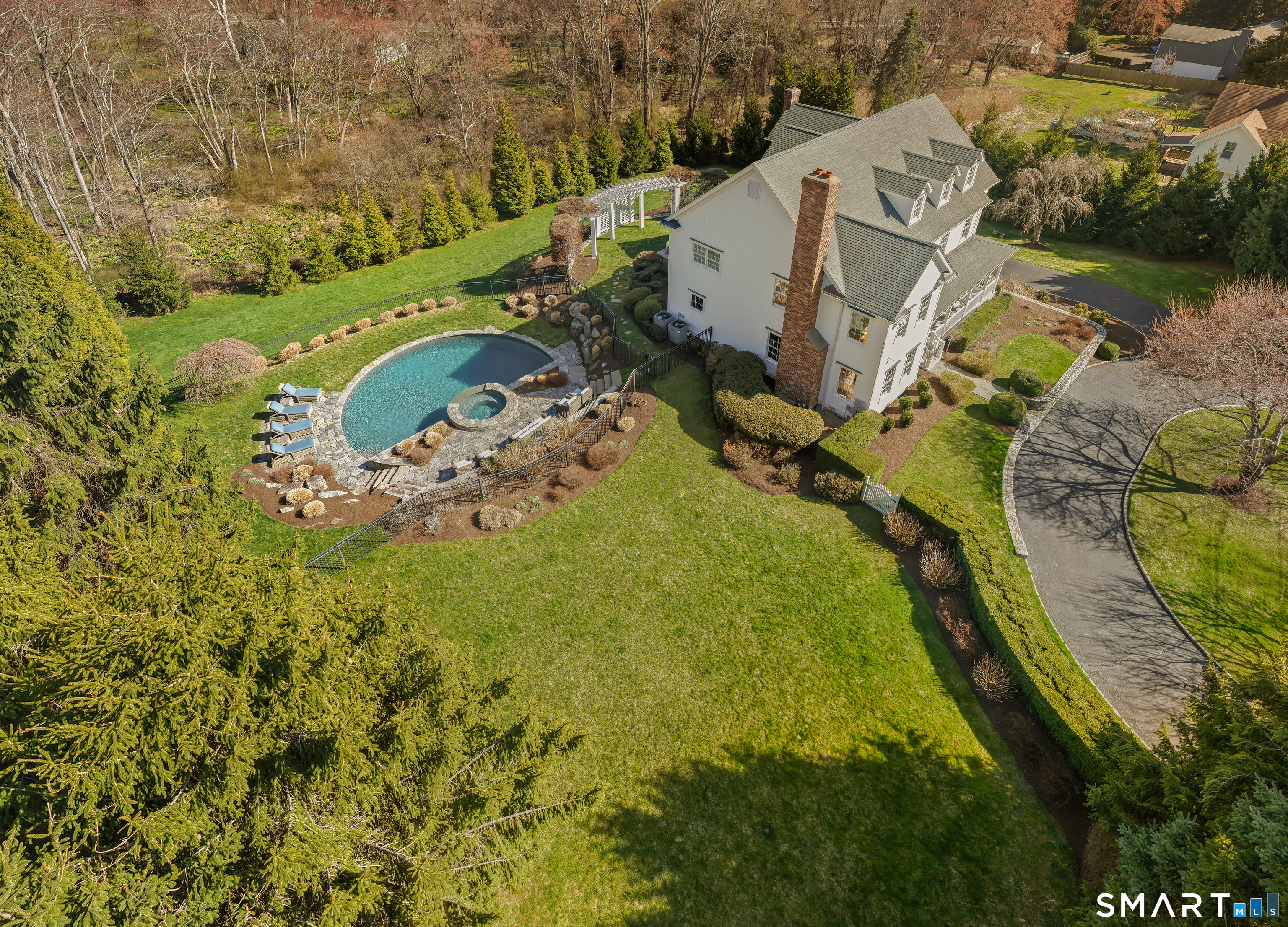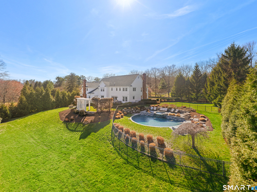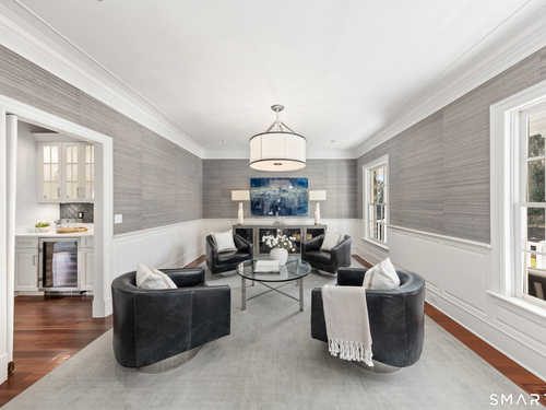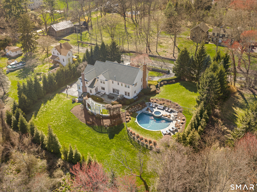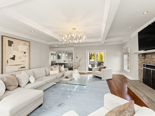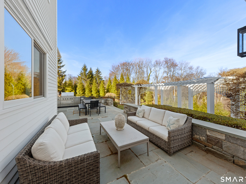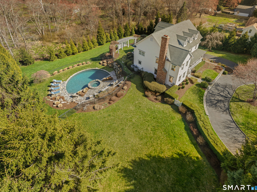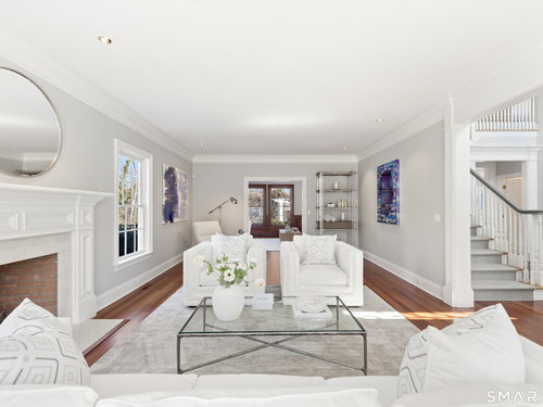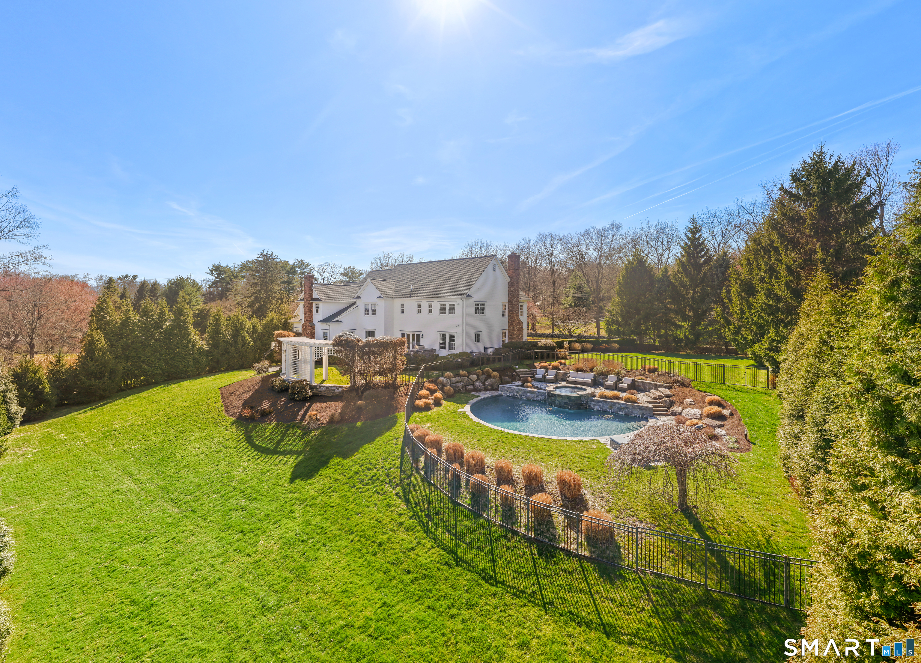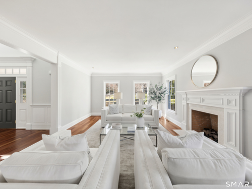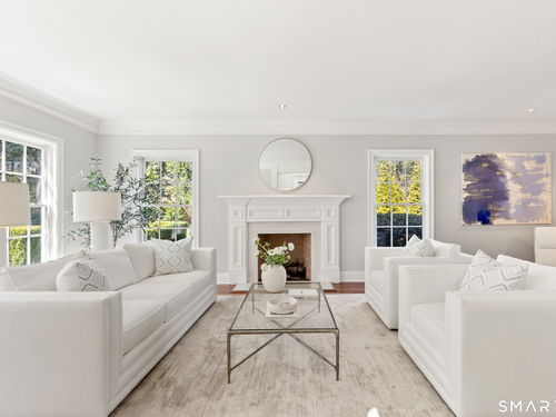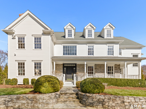 Beautifully sited in prestigious Greens Farms this timeless 5 BR, 6BA clapboard-and-stone Colonial offers stunning architecture & resort like privacy just moments from train, town & beaches. A gracious front porch & exquisite landscaping create an immediate sense of presence; classic, composed & quietly impressive. Inside, a soaring entry filled w/natural light introduces interiors defined by beautiful scale, 9-ft ceilings & gracious flow. Formal living room w/gas fireplace & dining room w/wet bar lend elegance to entertaining while a handsome office/den w/custom built-ins offers warmth & intimacy. The kitchen is refined & inviting w/quartz countertops, Sub-Zero appliances, walk-in pantry & breakfast/dining area opening to bluestone terrace. The expansive family room anchored by a substantial stone fireplace creates a natural gathering place & French doors open seamlessly to the outdoor living space. The main level also includes a secondary entry w/back staircase, laundry room, additional office & 2nd powder room. Upstairs the primary suite is a true retreat w/oversized walk-in closets, dressing area & spa-like marble bath. 4 additional generously proportioned bedrooms including two en-suite offer flexibility for family & guests. Finished 3rd fl ideal for playroom, gym, media room, 6th BR. Outside sprawling grounds, expansive bluestone terraces, exceptional masonry & stunning saltwater gunite pool & spa create a private oasis w/serene resort-like feel. Impeccably presented.
