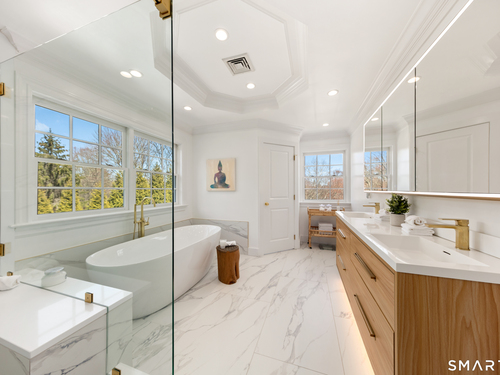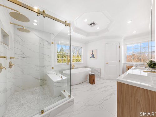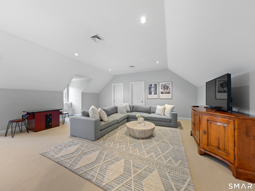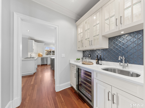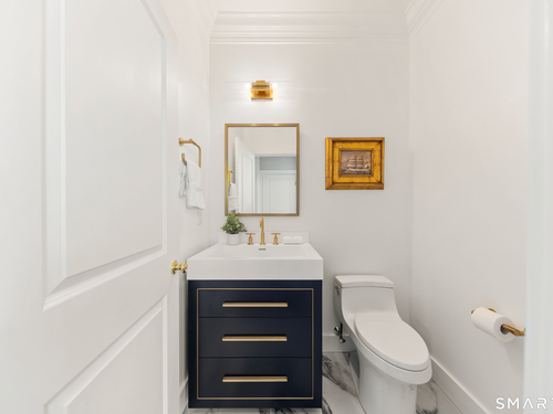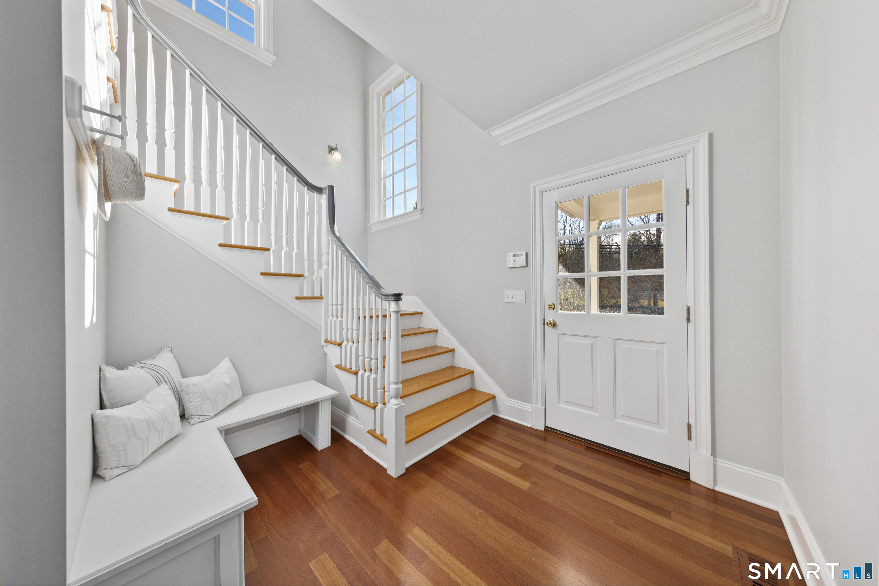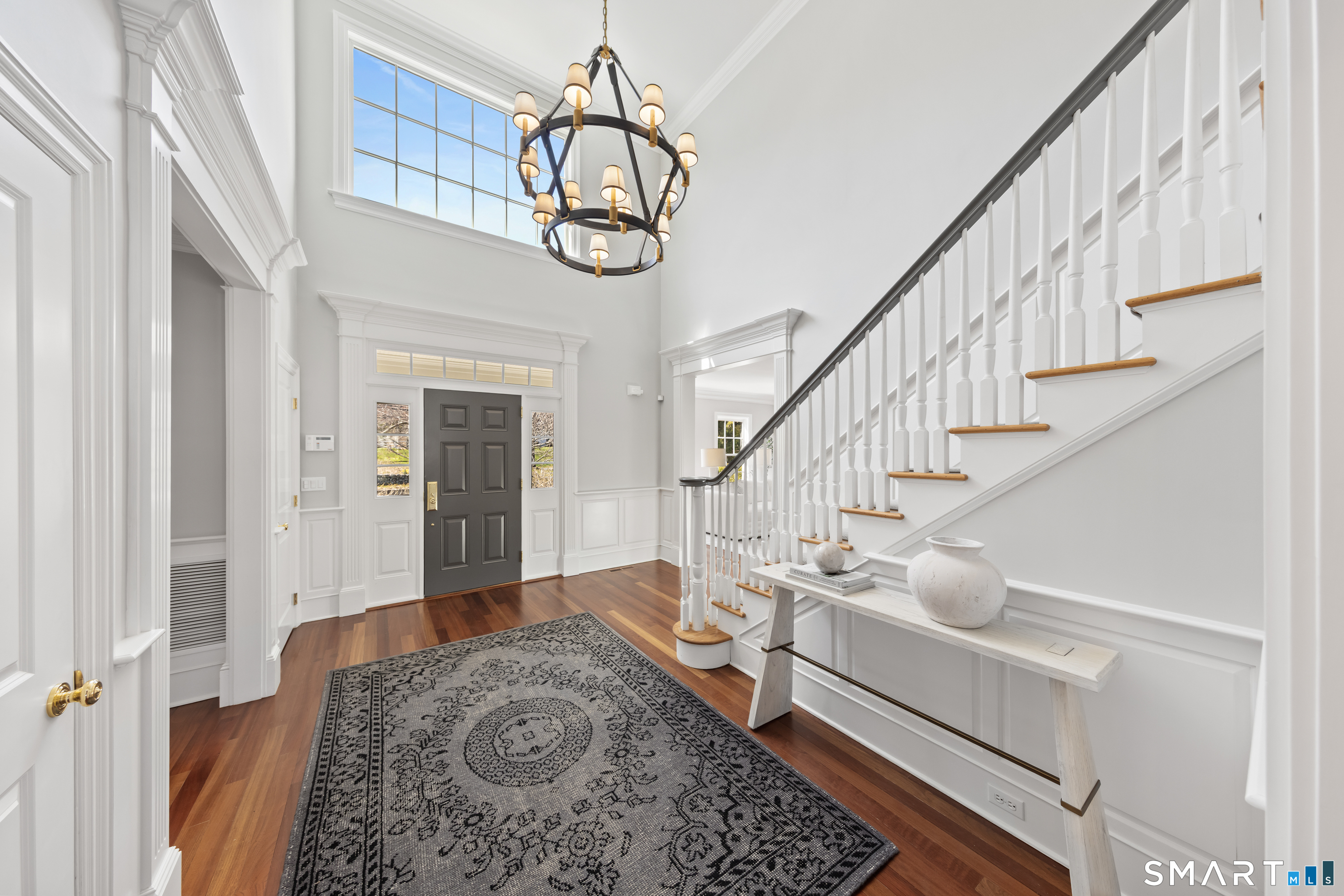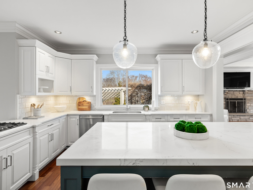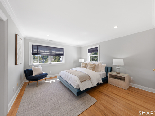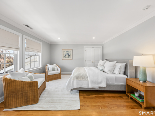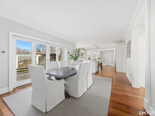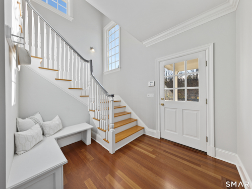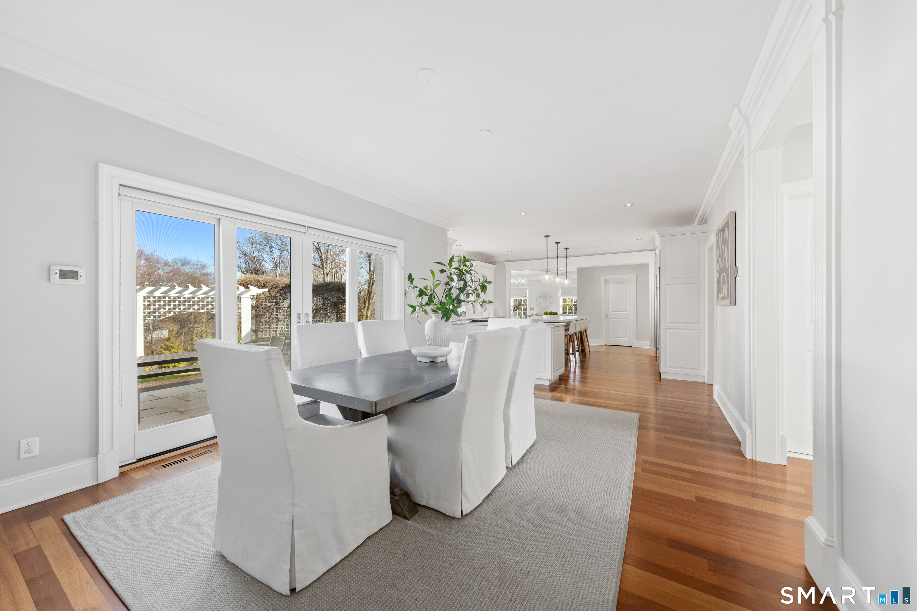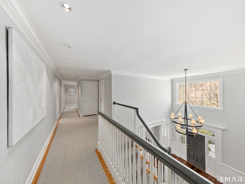 Beautifully sited in prestigious Greens Farms this timeless 5 BR, 6BA clapboard-and-stone Colonial offers stunning architecture & resort like privacy just moments from train, town & beaches. A gracious front porch & exquisite landscaping create an immediate sense of presence; classic, composed & quietly impressive. Inside, a soaring entry filled w/natural light introduces interiors defined by beautiful scale, 9-ft ceilings & gracious flow. Formal living room w/gas fireplace & dining room w/wet bar lend elegance to entertaining while a handsome office/den w/custom built-ins offers warmth & intimacy. The kitchen is refined & inviting w/quartz countertops, Sub-Zero appliances, walk-in pantry & breakfast/dining area opening to bluestone terrace. The expansive family room anchored by a substantial stone fireplace creates a natural gathering place & French doors open seamlessly to the outdoor living space. The main level also includes a secondary entry w/back staircase, laundry room, additional office & 2nd powder room. Upstairs the primary suite is a true retreat w/oversized walk-in closets, dressing area & spa-like marble bath. 4 additional generously proportioned bedrooms including two en-suite offer flexibility for family & guests. Finished 3rd fl ideal for playroom, gym, media room, 6th BR. Outside sprawling grounds, expansive bluestone terraces, exceptional masonry & stunning saltwater gunite pool & spa create a private oasis w/serene resort-like feel. Impeccably presented.