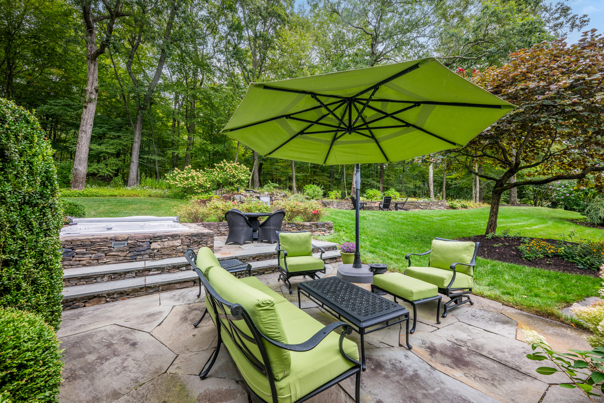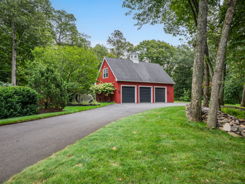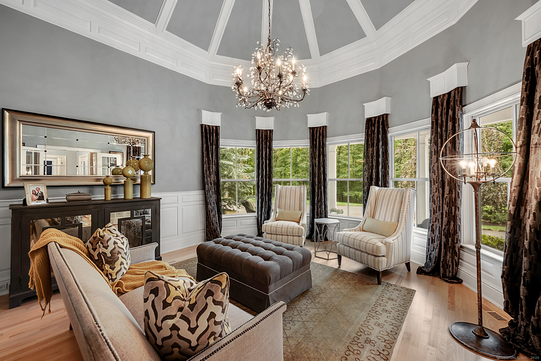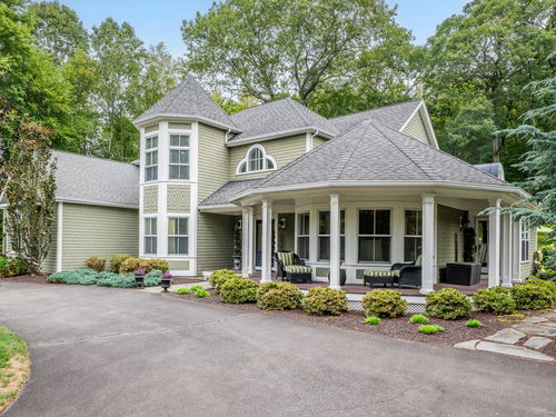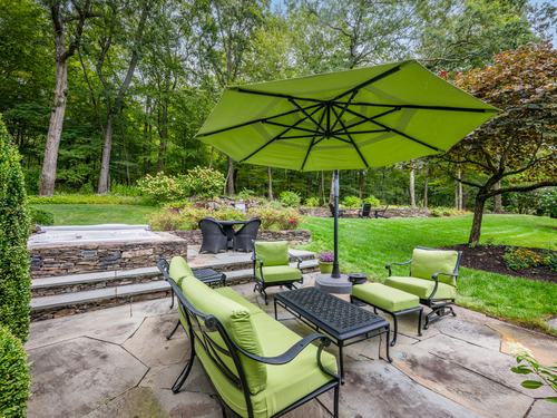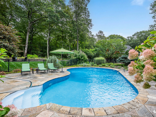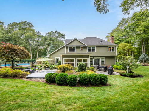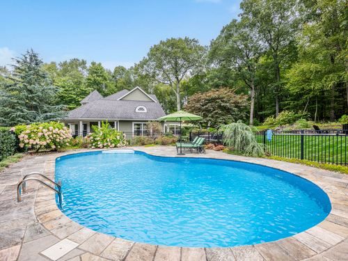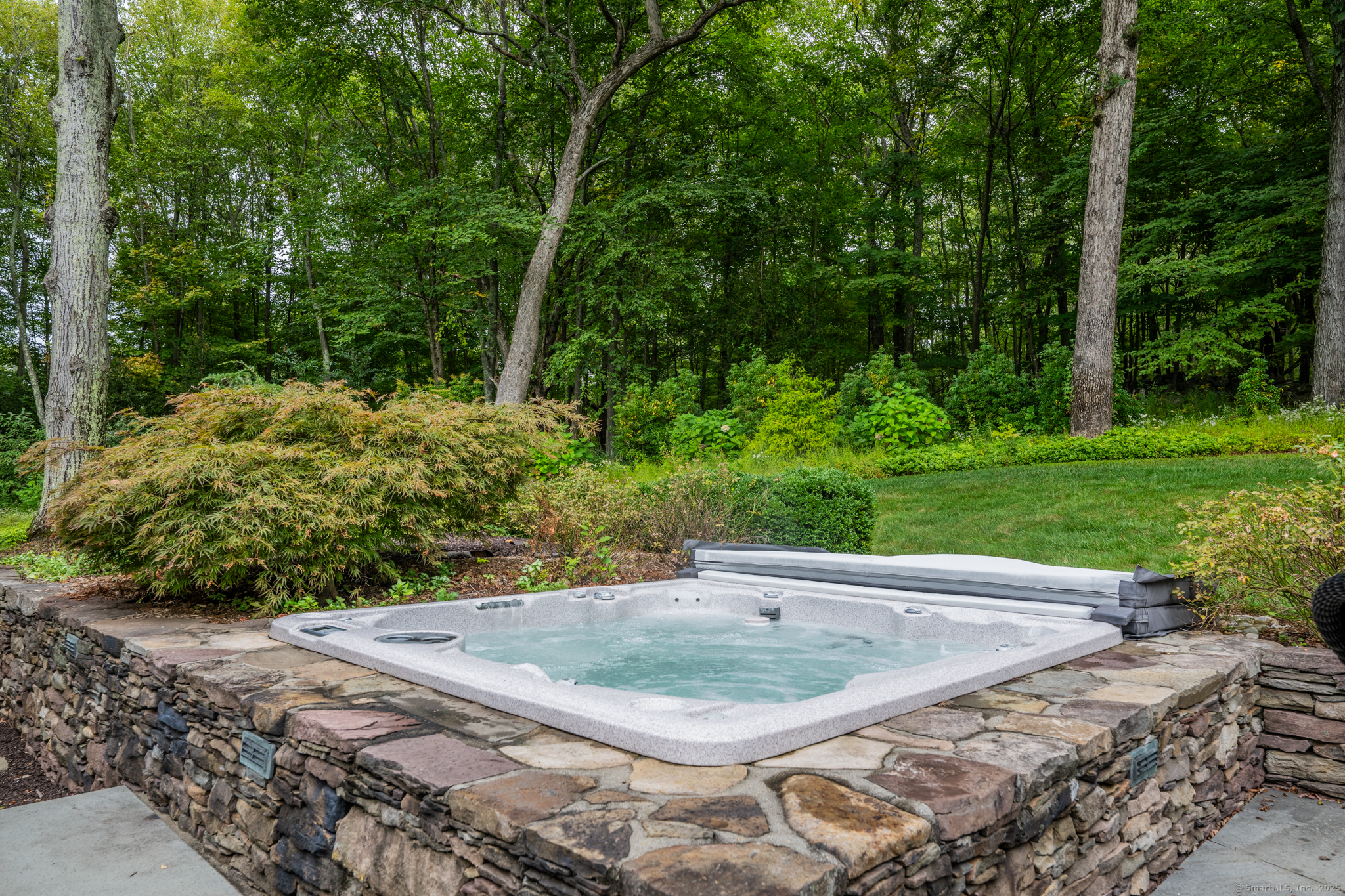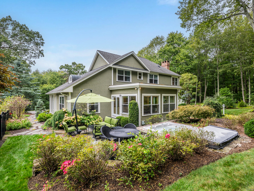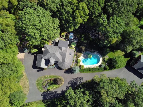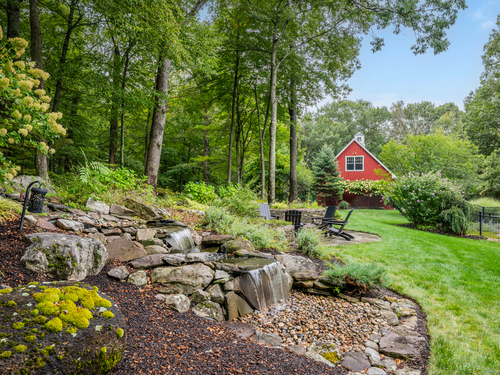 A one-of-a kind home home curated with the utmost of design and details, set on 4.78 acres of lush beauty and serenity. From the minute you enter the home, the luxurious finishes and wonderful layout is noticed. Whether day-to-day living, or gatherings of any size, this home and property is well suited. The Formal rooms have incredible finishes from a vaulted turret ceiling, to gorgeous light fixtures and designer window treatments. Even the custom wet bar is exceptional. The beautiful Kitchen is complete with stainless steel appliances, granite counters & marble backsplash, and a unique painted metal ceiling detail. Adjacent is the casual dining area with coffered ceiling and 3 walls of windows overlooking the impeccable grounds. The Family Room has a wood burning fireplace with sliders to the rear stone patio. A first floor bedroom is ideal for guests or a private home office. On the upper level are 3 more well appointed Bedrooms. The Primary suite has a spa-like bathroom, huge walk-in-closet and turret ceiling sitting area. A wonderful place to begin and end your day. The exterior is just as amazing as the inside....a heated in-ground salt-water pool, an 8 person hot tub, multiple stone patios, a custom waterfall feature and a firepit area with stone walls and detailed lighting. The landscaping has been thoughtfully designed with specimen trees and shrubs, a separate garden area, and a variety of perennials throughout.