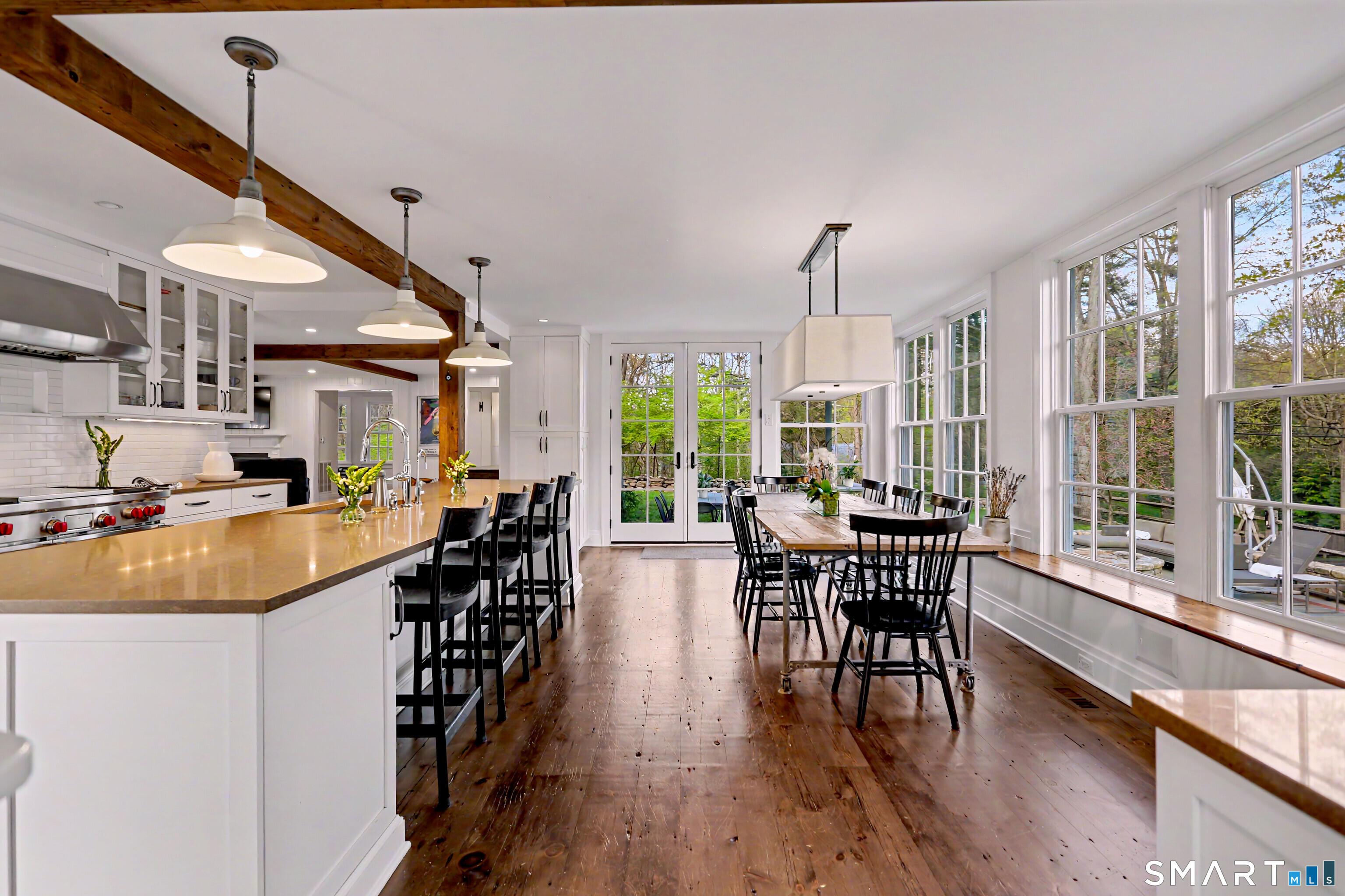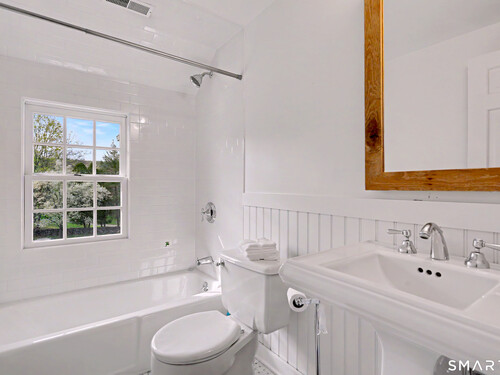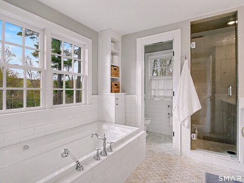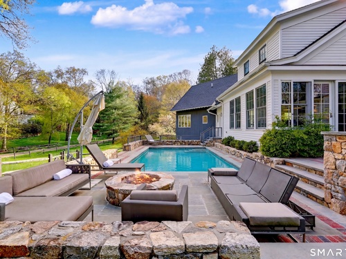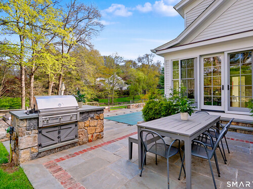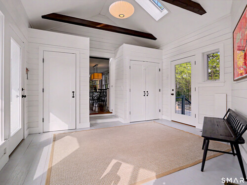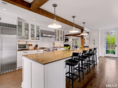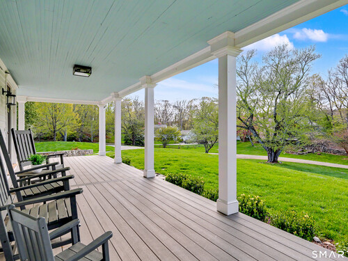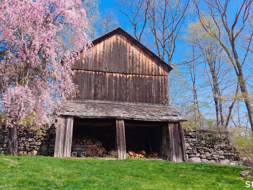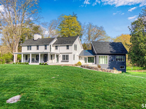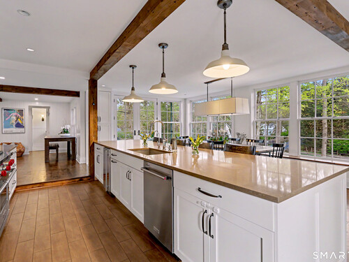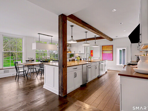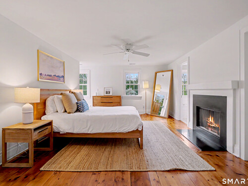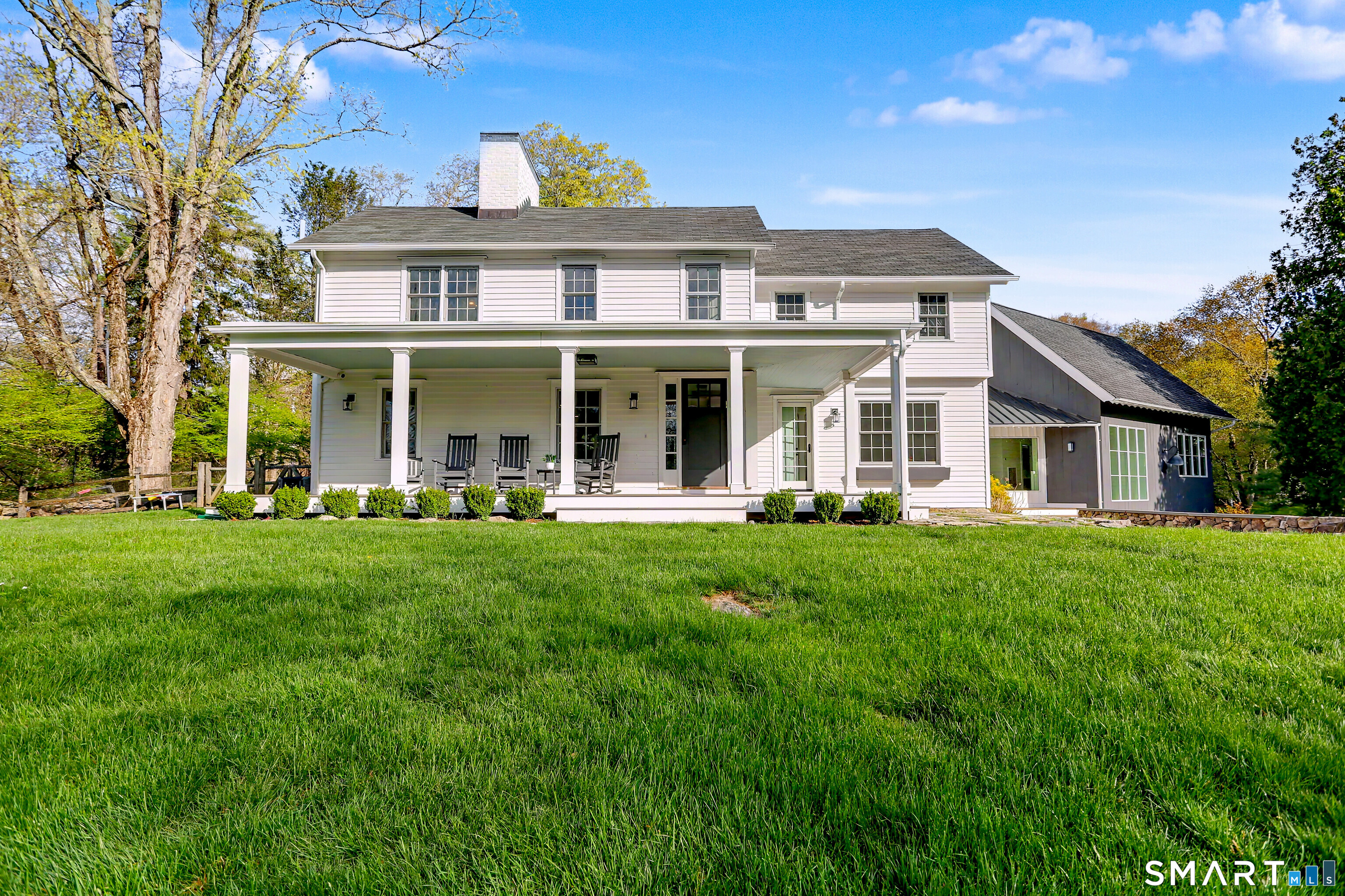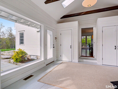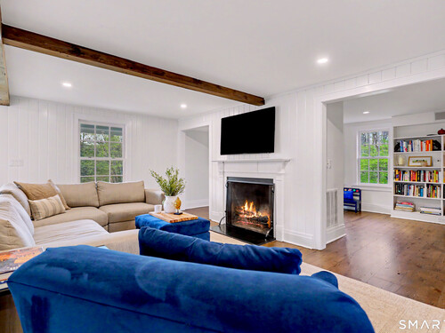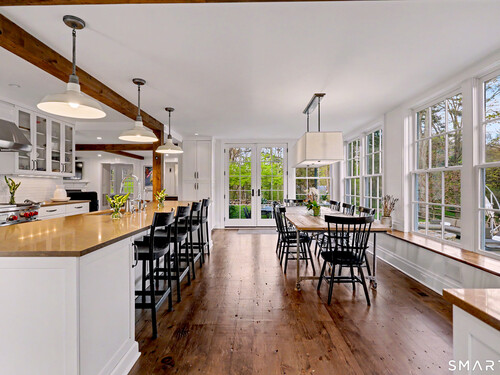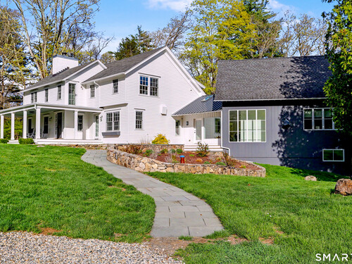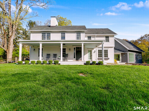 A thoughtfully restored (2012-2017) post-and-beam colonial is perched on a scenic rise with panoramic views of meticulously maintained grounds, combining timeless elegance with high-performance modern comfort and amenities. Details include original barn doors, reclaimed wide-plank floors, abundant natural light through skylights, and a gracious wrap-around veranda. First Floor: Features an inviting living room with exposed beams and a wood-burning fireplace. The heart of the home is a generous eat-in kitchen, boasting an expansive island, premium appliances, an integrated desk nook, and French doors connecting to outdoor spaces. A den includes a wet bar, wine storage, and handcrafted built-in cabinetry. Also on this level are two well-appointed bedrooms, a full bath, a powder room, and convenient first-floor laundry. Second Floor:The primary bedroom suite is a true retreat with a wood-burning fireplace, separate sitting area, a custom closet system, and a spa-like bathroom offering pastoral vistas. Two additional bedrooms, a second full bath, and upper-level laundry complete this floor. Lower Level: A newly converted, climate-controlled, recreational / play room. A separate detached barn offers multiple possibilities-workshop, studio, storage, or a future renovation project. Barn-featuring a restored roof and structural reinforcements-is as-is and stands ready for conversion, with architectural plans included in a sale
