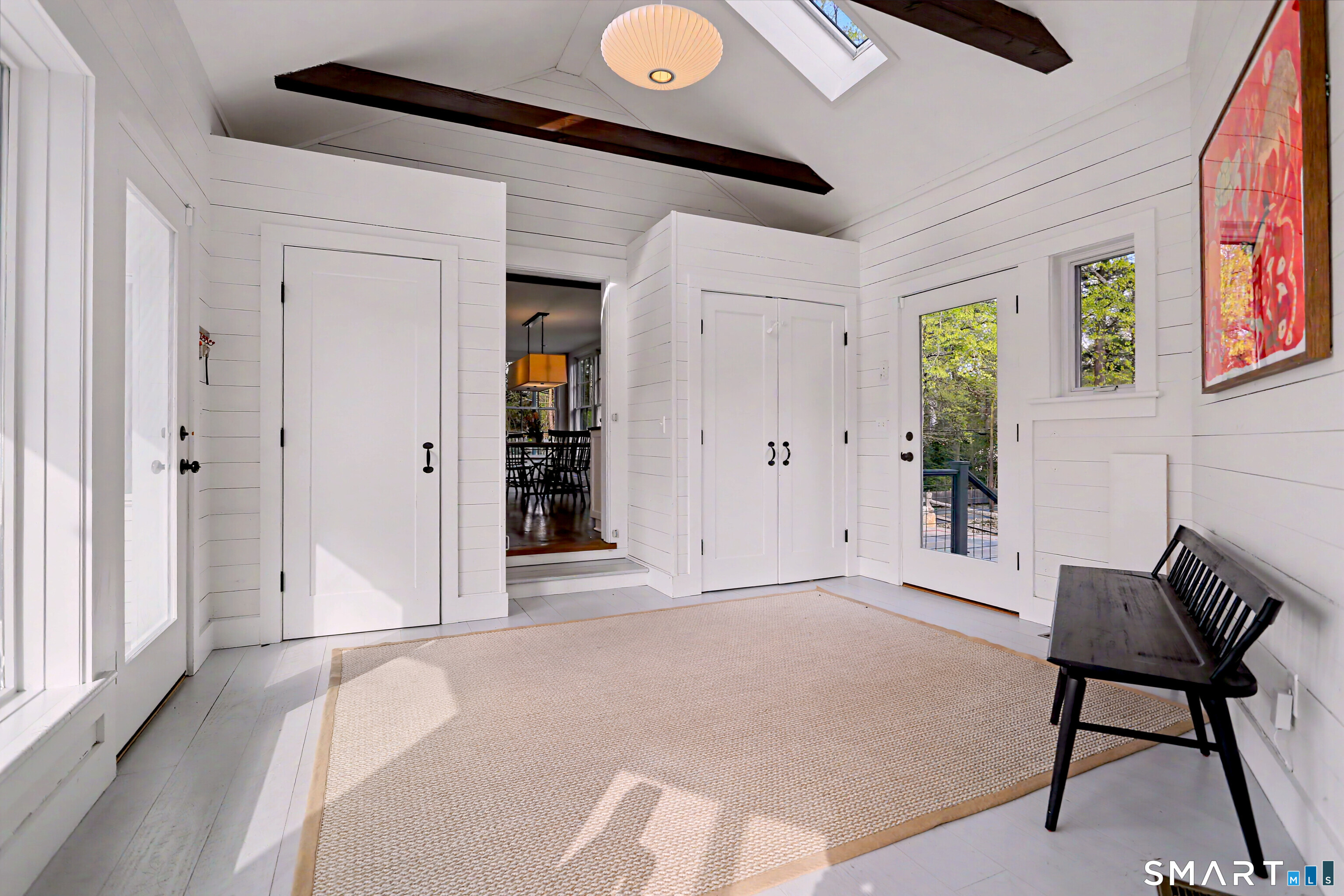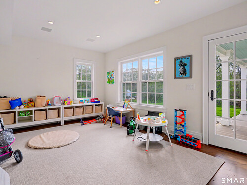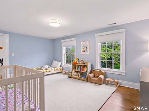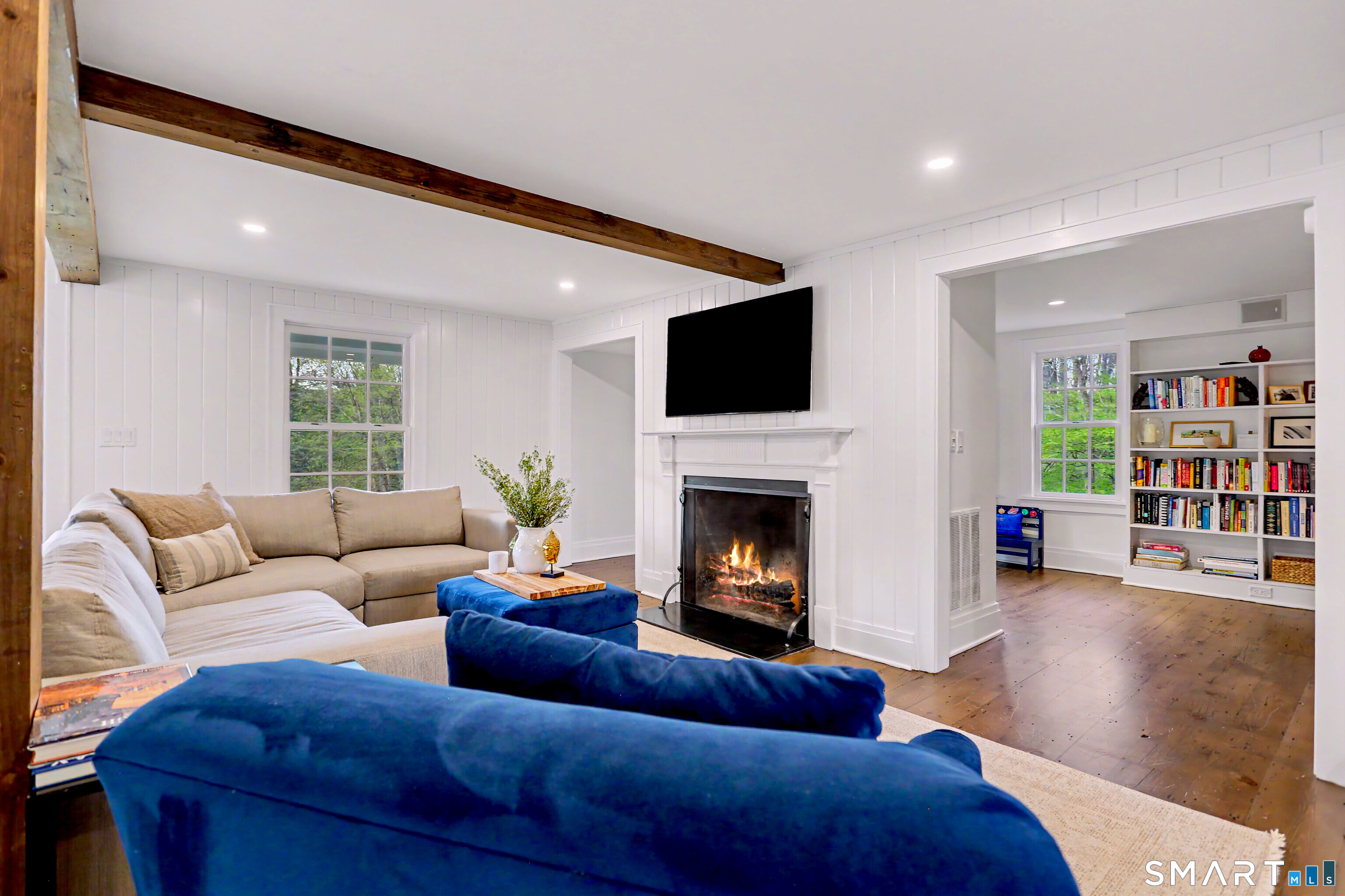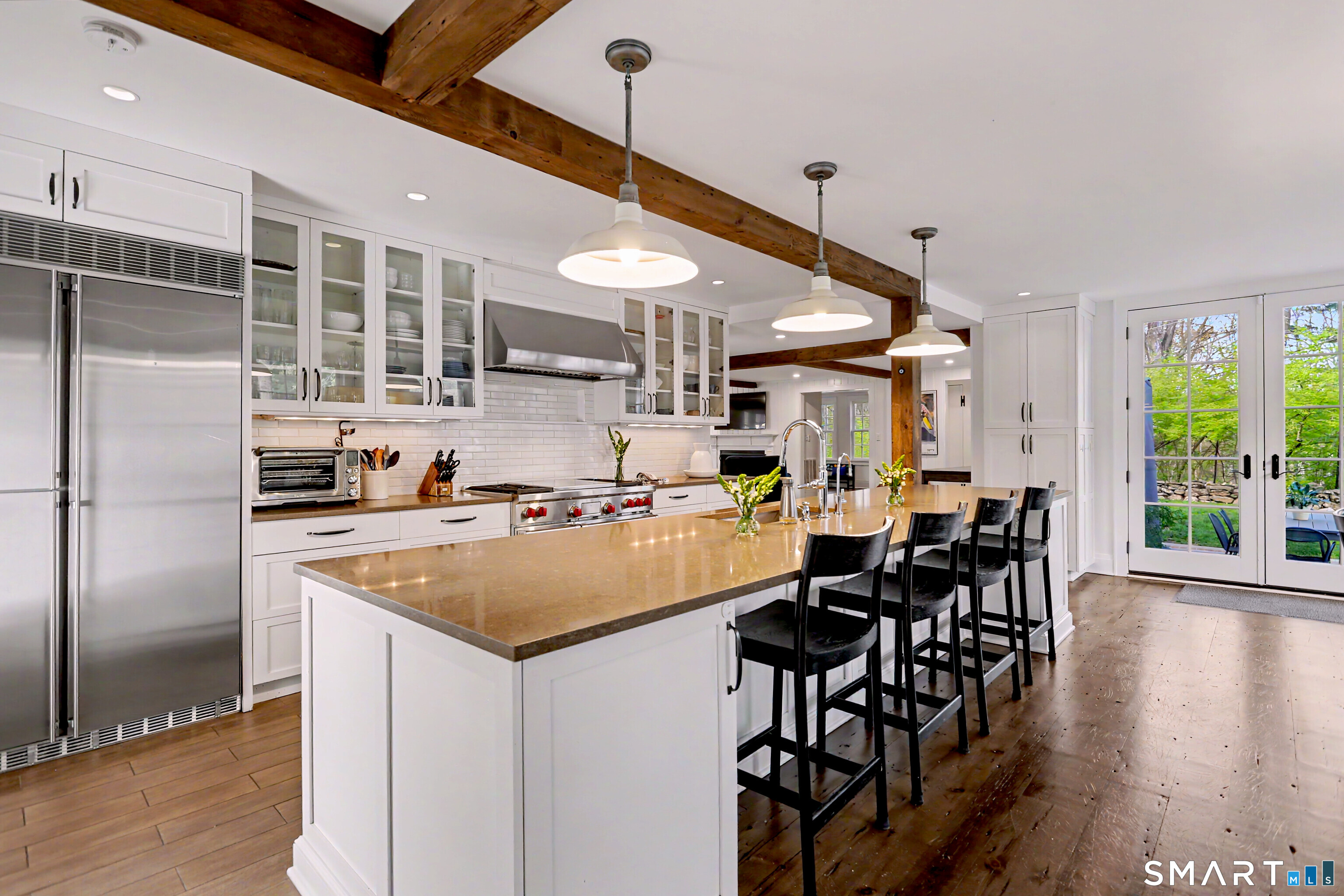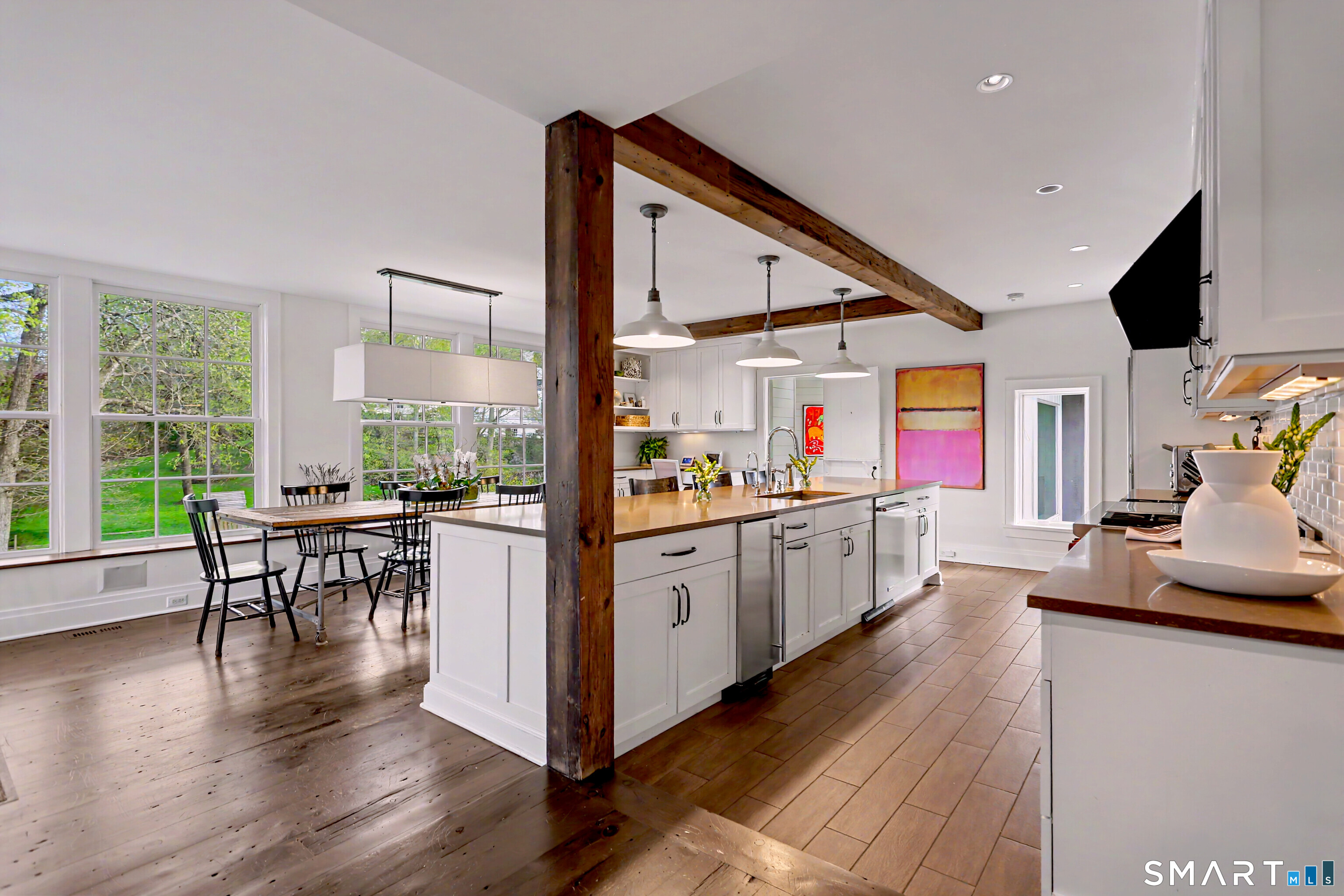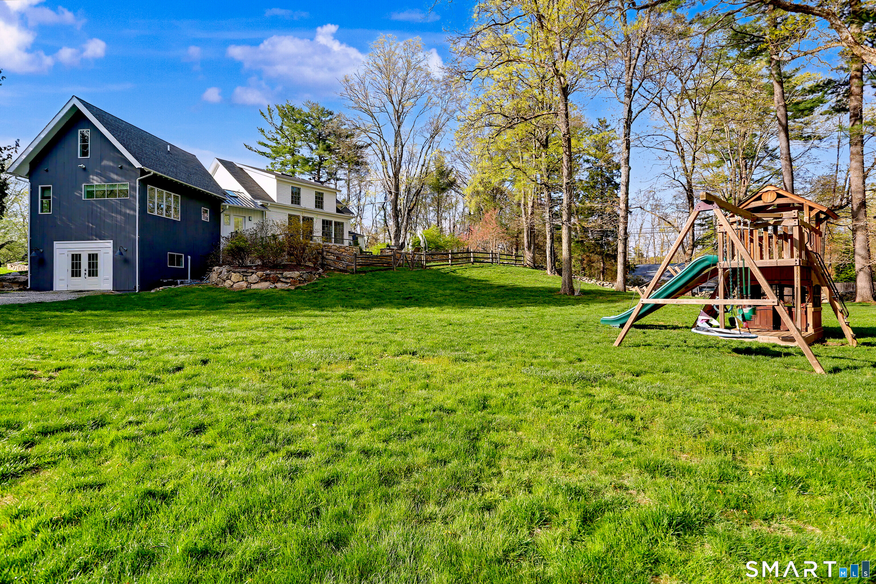 A thoughtfully restored (2012-2017) post-and-beam colonial is perched on a scenic rise with panoramic views of meticulously maintained grounds, combining timeless elegance with high-performance modern comfort and amenities. Details include original barn doors, reclaimed wide-plank floors, abundant natural light through skylights, and a gracious wrap-around veranda. First Floor: Features an inviting living room with exposed beams and a wood-burning fireplace. The heart of the home is a generous eat-in kitchen, boasting an expansive island, premium appliances, an integrated desk nook, and French doors connecting to outdoor spaces. A den includes a wet bar, wine storage, and handcrafted built-in cabinetry. Also on this level are two well-appointed bedrooms, a full bath, a powder room, and convenient first-floor laundry. Second Floor:The primary bedroom suite is a true retreat with a wood-burning fireplace, separate sitting area, a custom closet system, and a spa-like bathroom offering pastoral vistas. Two additional bedrooms, a second full bath, and upper-level laundry complete this floor. Lower Level: A newly converted, climate-controlled, recreational / play room. A separate detached barn offers multiple possibilities-workshop, studio, storage, or a future renovation project. Barn-featuring a restored roof and structural reinforcements-is as-is and stands ready for conversion, with architectural plans included in a sale