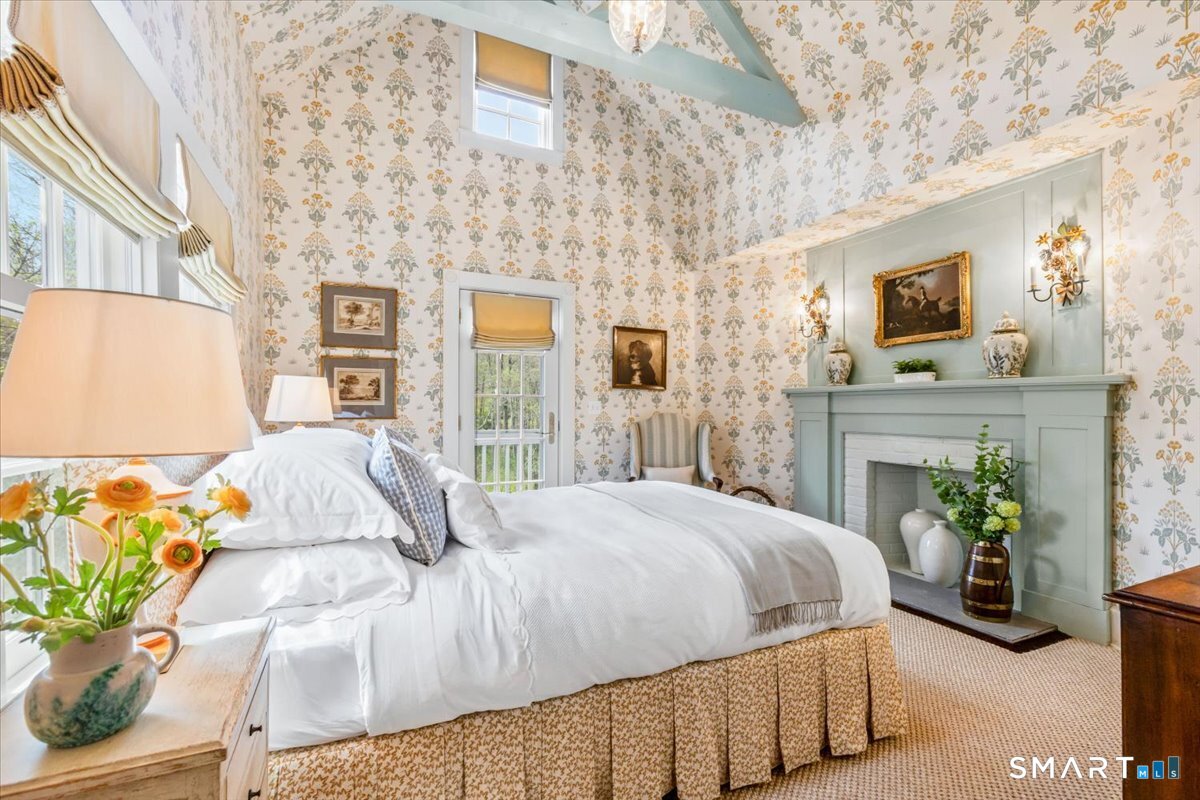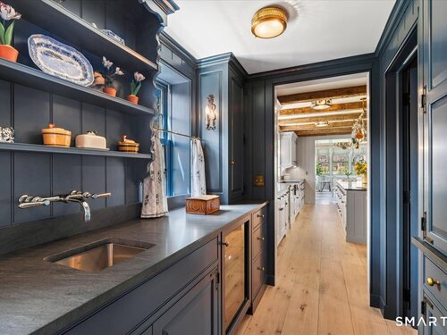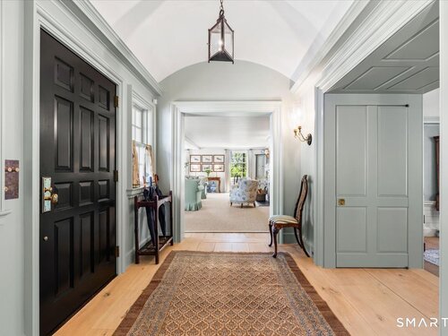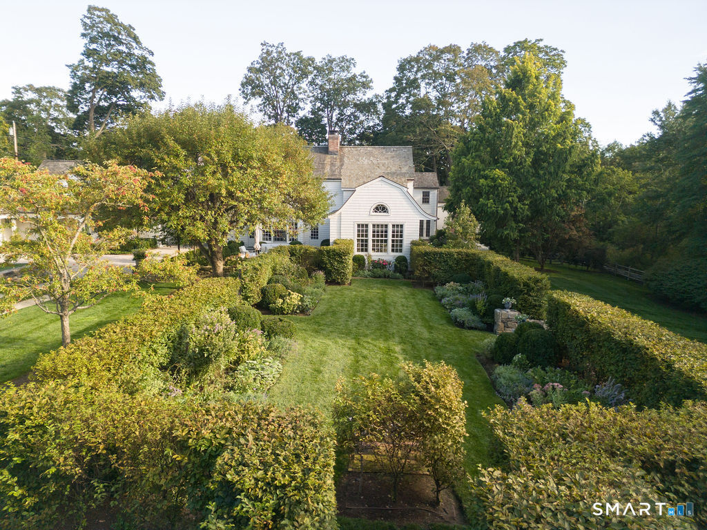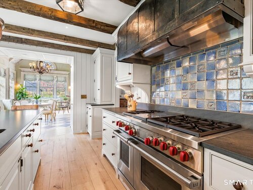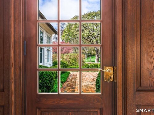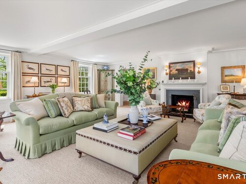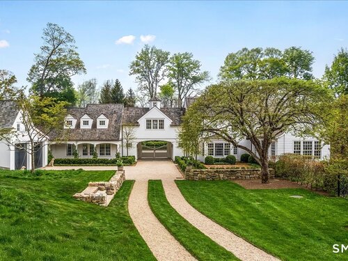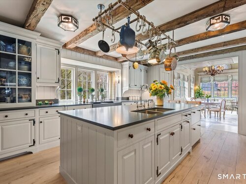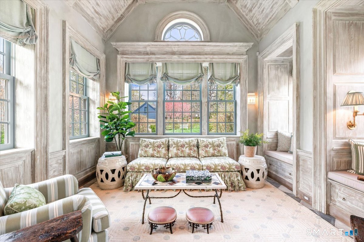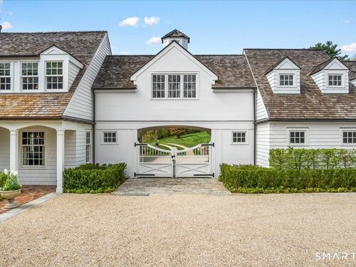 Welcome to 372 Brushy Ridge Road in the picturesque town of New Canaan, CT. A stone-pillared entrance leads you to this magnificent estate, meticulously transformed between 2022 and 2024. This 8,000+ sq ft home strikes a balance that is genuinely difficult to achieve: light-flooded and effortlessly modern, yet layered with warmth and character that only time can give. The four rooms at the heart of this home - the primary bedroom, kitchen, sunroom, and family room - each received transformations of the highest order. In both the primary suite and sunroom, rooflines were lifted to create spaces of extraordinary volume and light. The primary bedroom is a true sanctuary: soaring ceilings, new Marvin windows framing the treetops, an antique Delft-tiled fireplace, and a spa bath of the finest standard. The rebuilt sunroom, with vaulted beamed ceiling and Paris Ceramics heated reclaimed marble tile floor, is simply breathtaking, and the showpiece kitchen looks directly into it, featuring custom cabinetry, honed black granite, a butler's pantry, and Miele coffee station. Antique chandeliers, Ball & Ball hardware, Gracie wallpaper, and hand-scraped oak floors whisper of the home's soul - every finish custom, nothing left to do. Set across 3.5 enchanting acres designed by renowned landscape architect Kathryn Herman, the grounds evoke the quiet romance of the English countryside. A guest cottage and garaging for five complete this singular estate - minutes from town, worlds away.