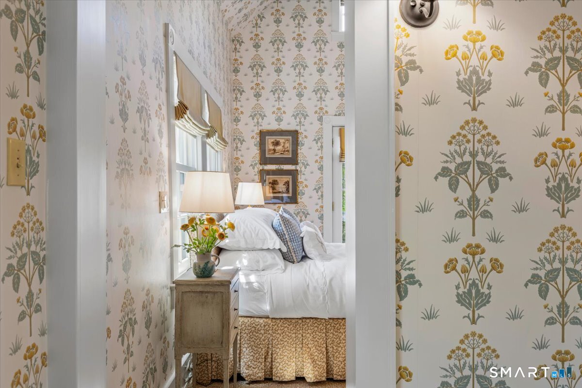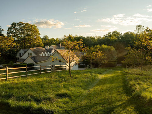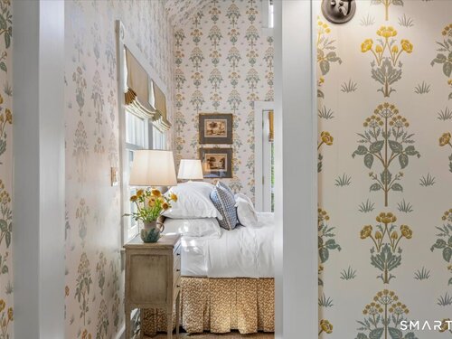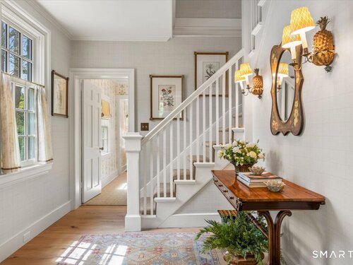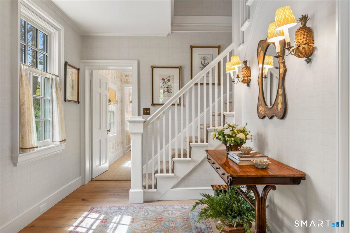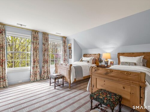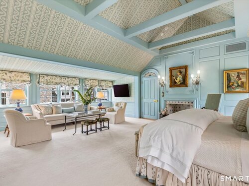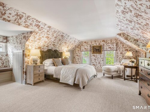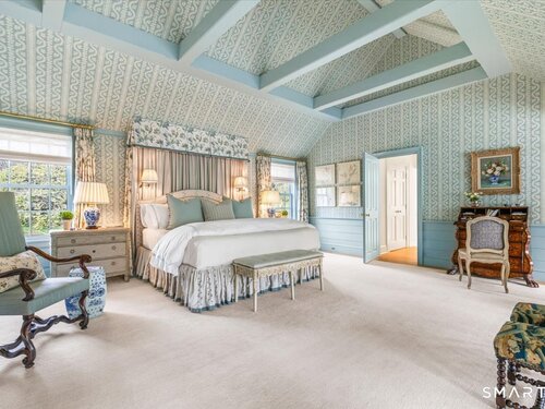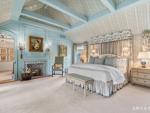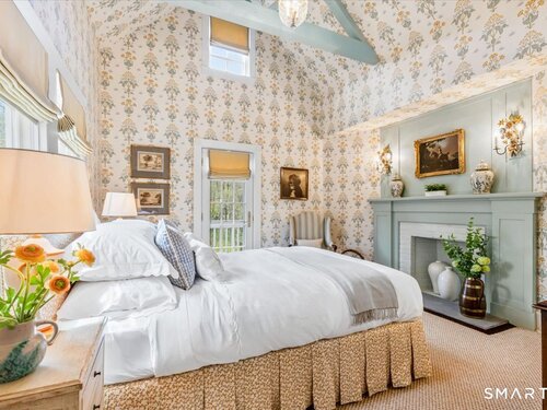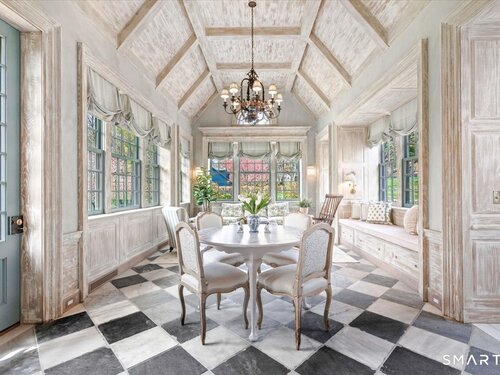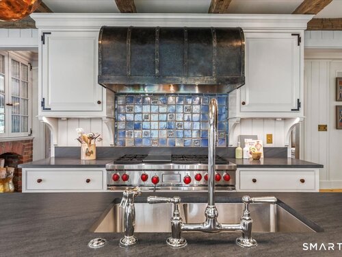Welcome to 372 Brushy Ridge Road in the picturesque town of New Canaan, CT. A stone-pillared entrance leads you to this magnificent estate, meticulously transformed between 2022 and 2024. This 8,000+ sq ft home strikes a balance that is genuinely difficult to achieve: light-flooded and effortlessly modern, yet layered with warmth and character that only time can give. The four rooms at the heart of this home - the primary bedroom, kitchen, sunroom, and family room - each received transformations of the highest order. In both the primary suite and sunroom, rooflines were lifted to create spaces of extraordinary volume and light. The primary bedroom is a true sanctuary: soaring ceilings, new Marvin windows framing the treetops, an antique Delft-tiled fireplace, and a spa bath of the finest standard. The rebuilt sunroom, with vaulted beamed ceiling and Paris Ceramics heated reclaimed marble tile floor, is simply breathtaking, and the showpiece kitchen looks directly into it, featuring custom cabinetry, honed black granite, a butler's pantry, and Miele coffee station. Antique chandeliers, Ball & Ball hardware, Gracie wallpaper, and hand-scraped oak floors whisper of the home's soul - every finish custom, nothing left to do. Set across 3.5 enchanting acres designed by renowned landscape architect Kathryn Herman, the grounds evoke the quiet romance of the English countryside. A guest cottage and garaging for five complete this singular estate - minutes from town, worlds away.