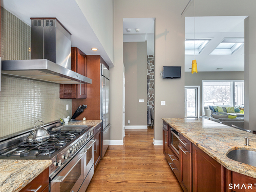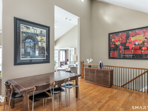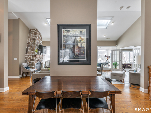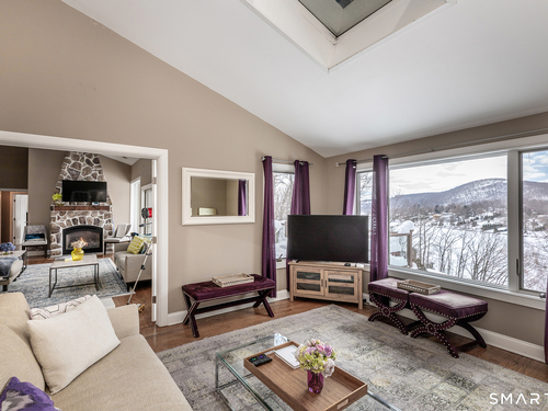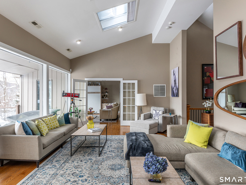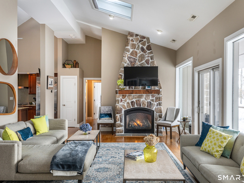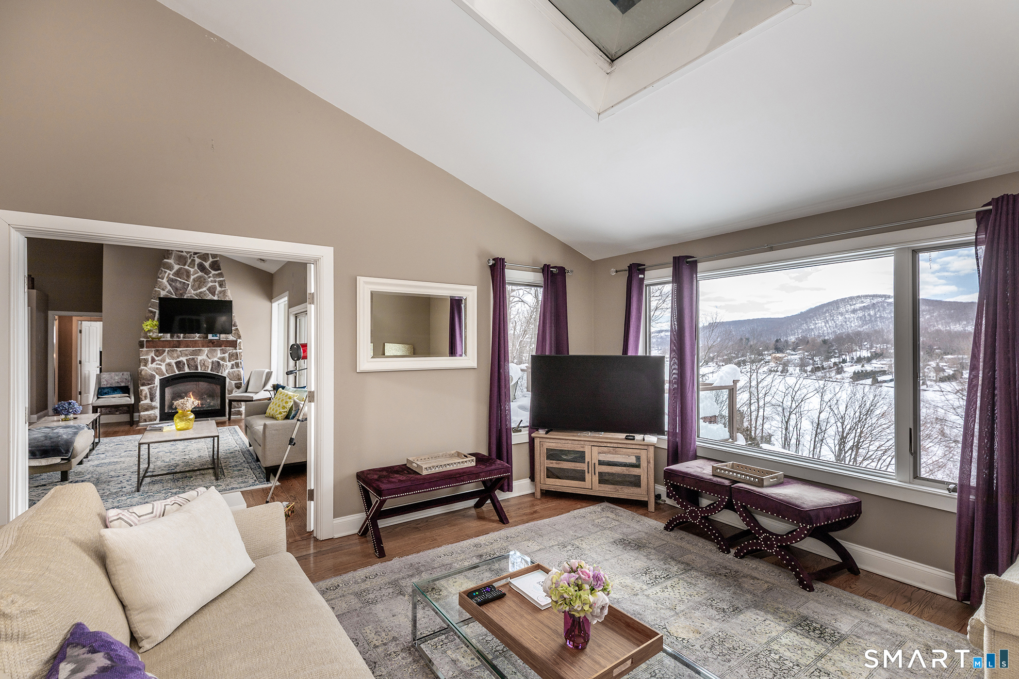 Living Room (Main Level)Skylight, Vaulted Ceiling, Balcony/Deck, Gas Log Fireplace, Sliders, Hardwood Floor