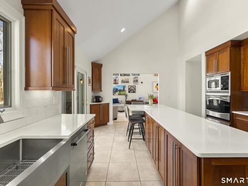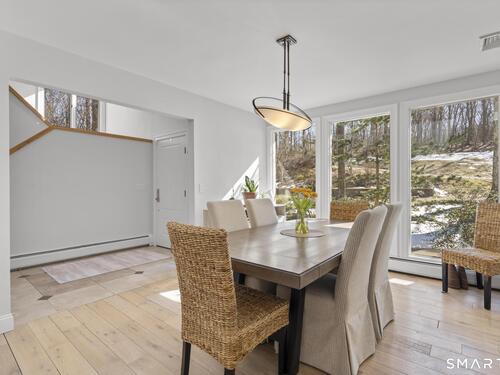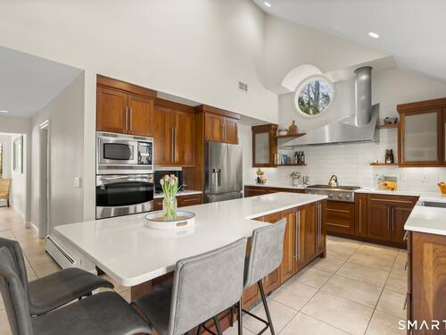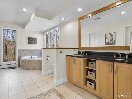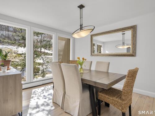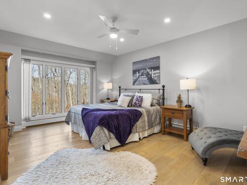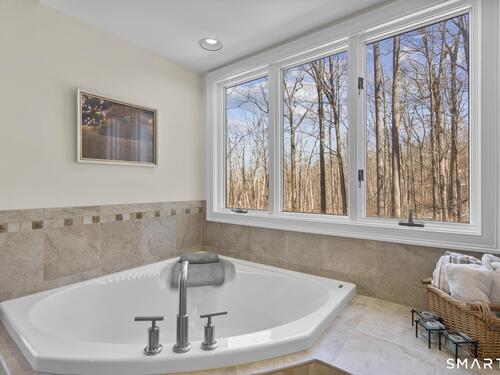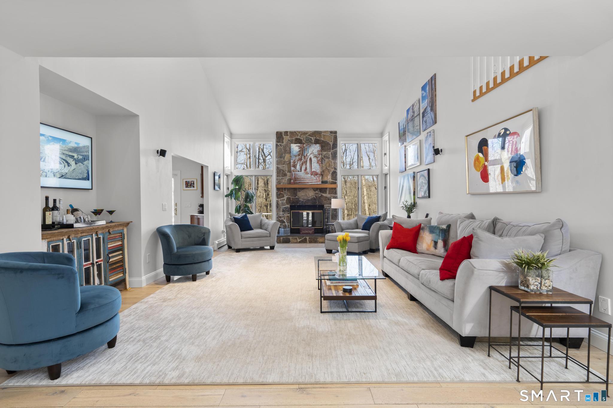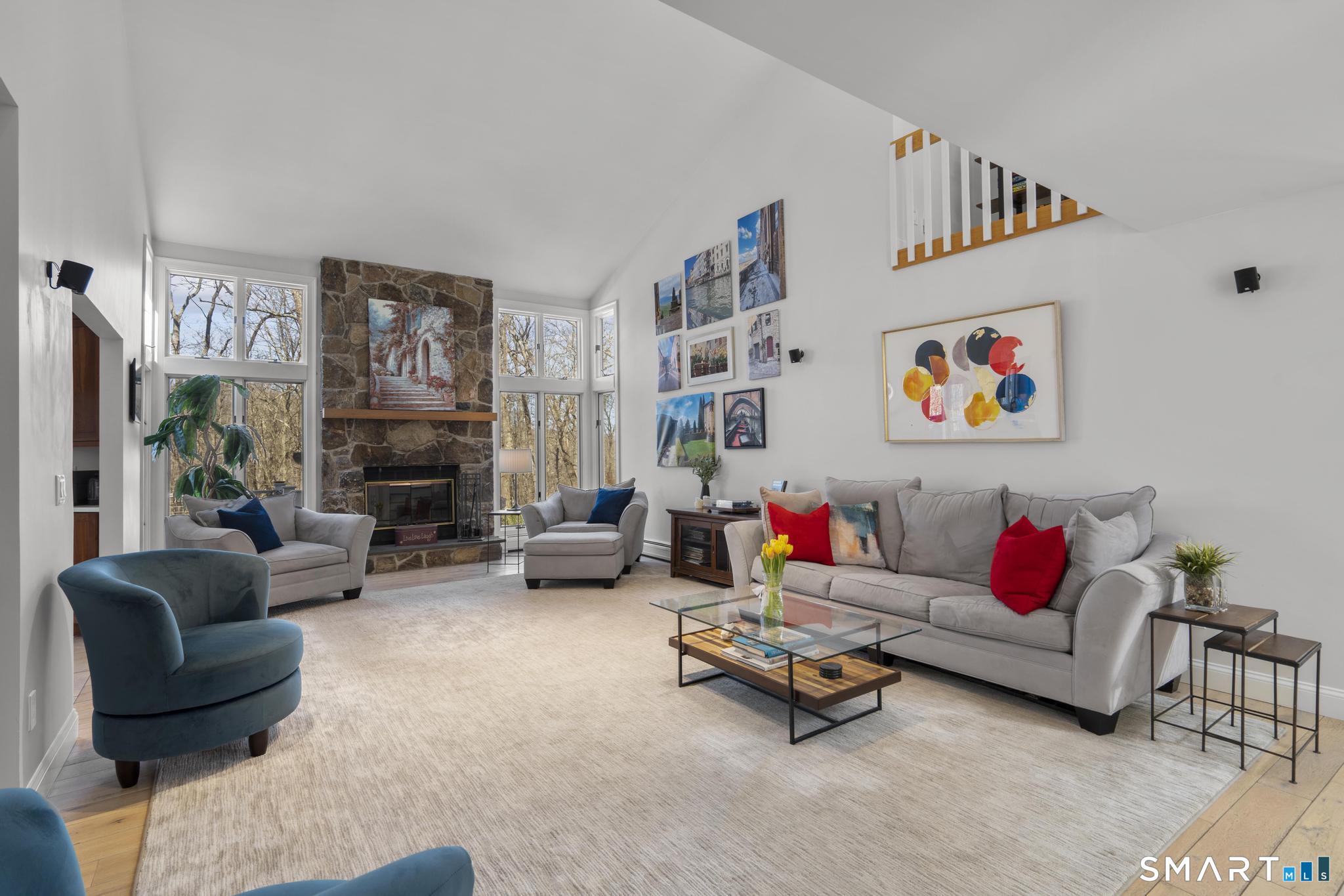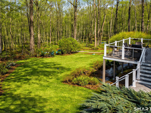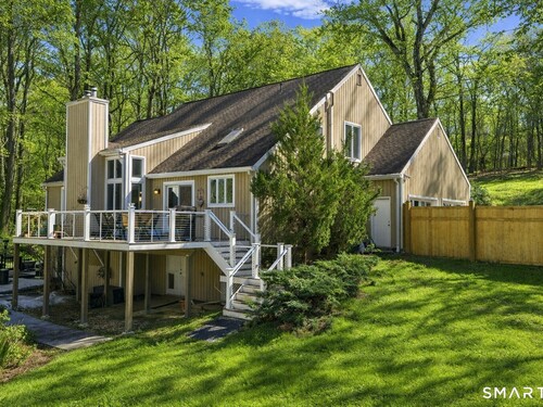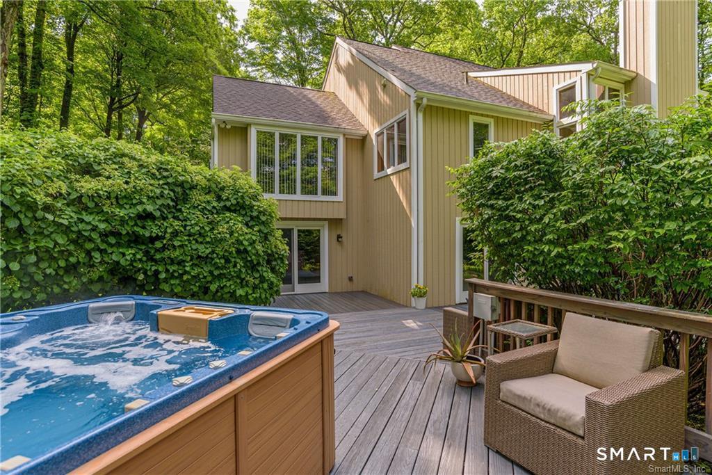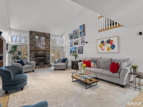 Welcome to this pristine, sun-drenched, sophisticated contemporary colonial home in sought-after Southwest Redding. Designed with an open floor plan and walls of windows throughout, the home is filled with natural light and offers seamless spaces for both everyday living and entertaining -- The dramatic living room features soaring cathedral ceilings and a stunning floor-to-ceiling wood-burning fireplace as its centerpiece, flowing effortlessly into the dining room with striking floor-to-ceiling windows. The chef's kitchen showcases high-end finishes and a sleek modern design, including cherry cabinetry, quartz countertops, a gas cooktop, and a cozy eat-in area -- The main-level primary suite overlooks the private backyard and features a beautiful spa-like bath with double sinks, a soaking tub, and an oversized tiled shower. The open and spacious second level offers three additional light-filled bedrooms and a renovated hallway bath -- The remodeled walk-out lower level provides exceptional additional living space, including a playroom, exercise room, laundry area, cedar closet, abundant storage, plus a fifth bedroom and full bath, ideal for guests or an in-law setup -- Sliding doors lead out to the deck and hot tub. Relax on the spacious deck with modern cable railings while overlooking the serene and private two-acre property, professionally landscaped with mature plantings. Conservation land directly behind the home provides access to scenic hiking trails.