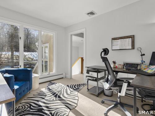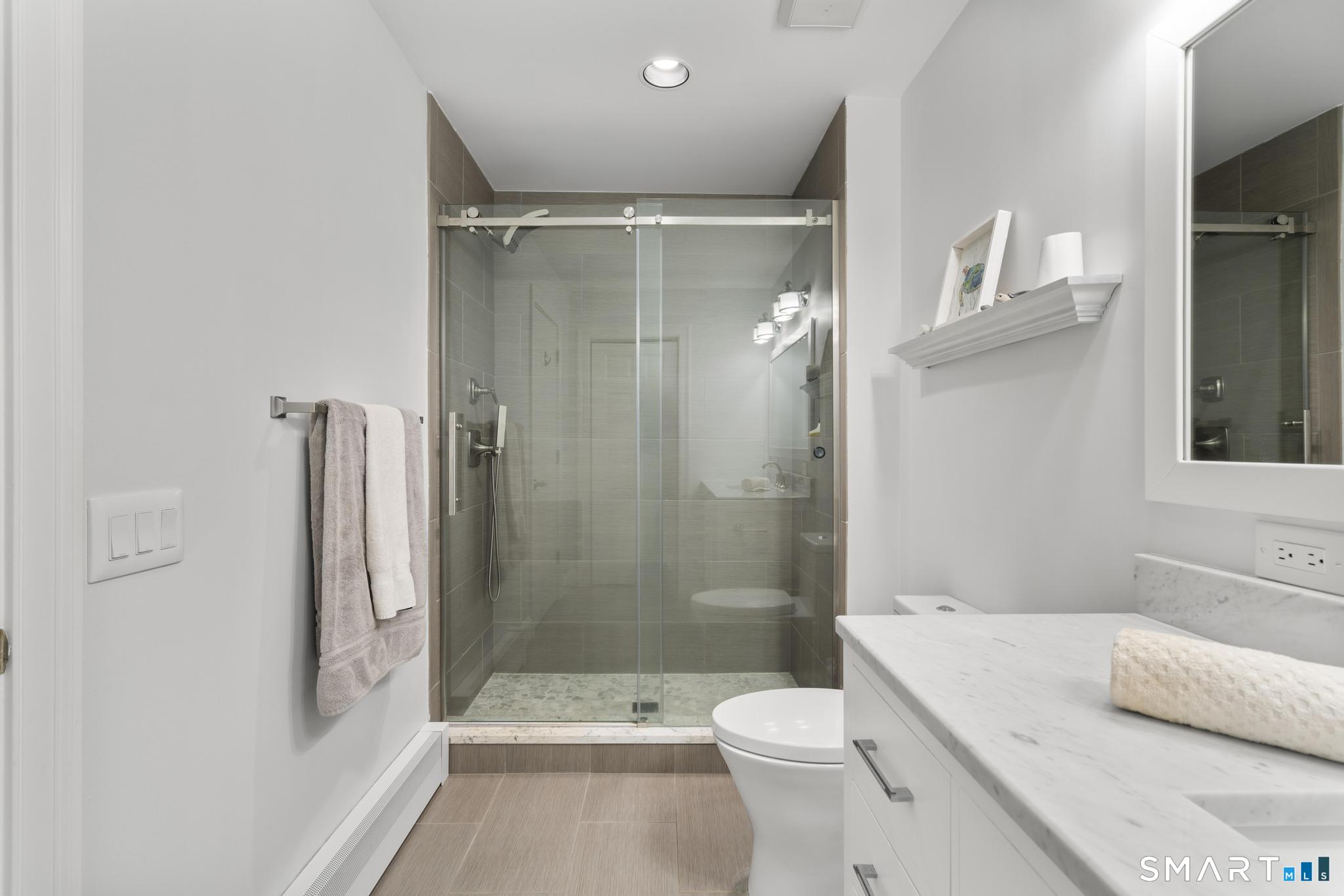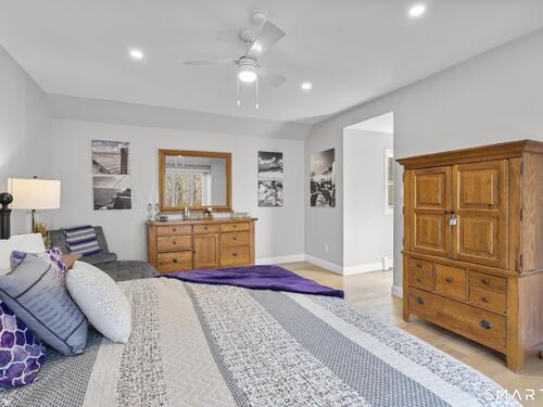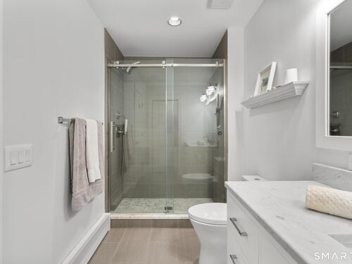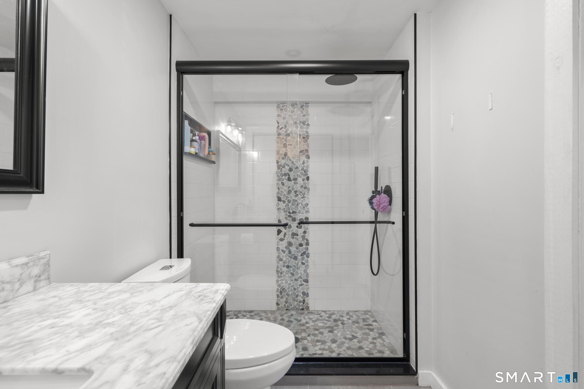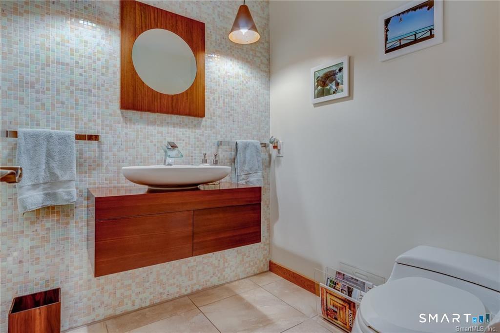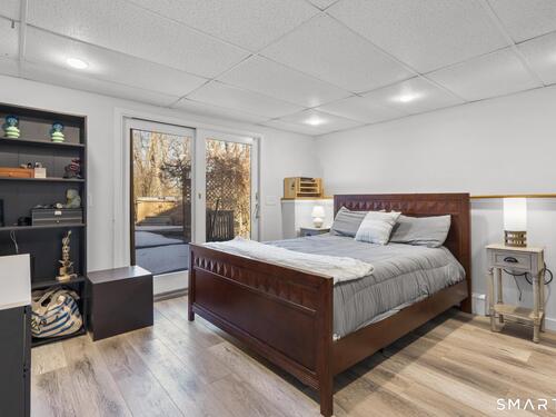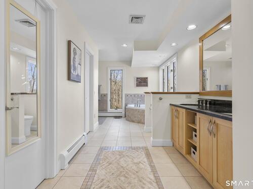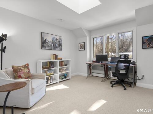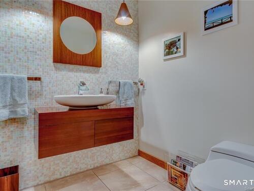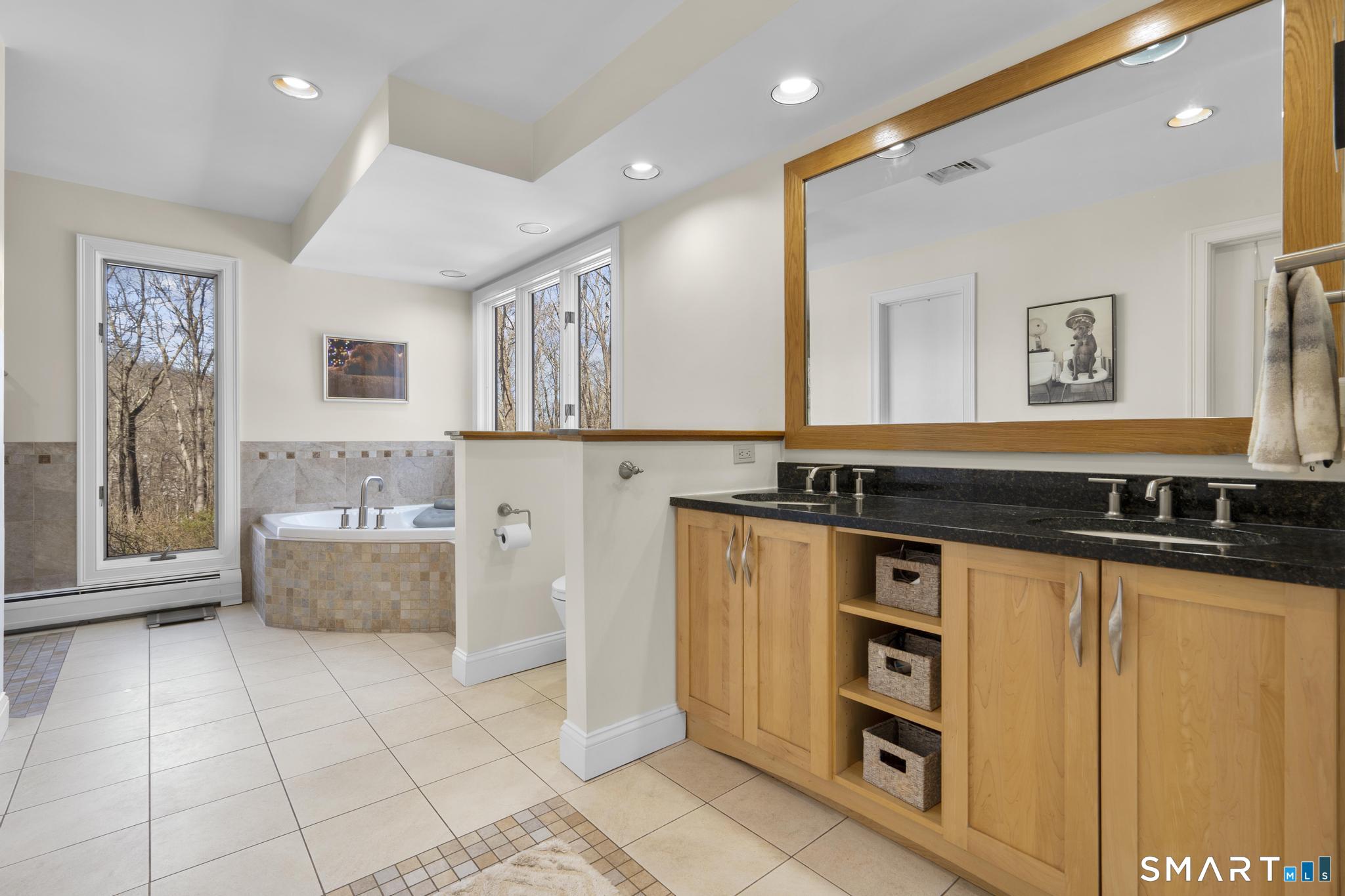 Welcome to this pristine, sun-drenched, sophisticated contemporary colonial home in sought-after Southwest Redding. Designed with an open floor plan and walls of windows throughout, the home is filled with natural light and offers seamless spaces for both everyday living and entertaining -- The dramatic living room features soaring cathedral ceilings and a stunning floor-to-ceiling wood-burning fireplace as its centerpiece, flowing effortlessly into the dining room with striking floor-to-ceiling windows. The chef's kitchen showcases high-end finishes and a sleek modern design, including cherry cabinetry, quartz countertops, a gas cooktop, and a cozy eat-in area -- The main-level primary suite overlooks the private backyard and features a beautiful spa-like bath with double sinks, a soaking tub, and an oversized tiled shower. The open and spacious second level offers three additional light-filled bedrooms and a renovated hallway bath -- The remodeled walk-out lower level provides exceptional additional living space, including a playroom, exercise room, laundry area, cedar closet, abundant storage, plus a fifth bedroom and full bath, ideal for guests or an in-law setup -- Sliding doors lead out to the deck and hot tub. Relax on the spacious deck with modern cable railings while overlooking the serene and private two-acre property, professionally landscaped with mature plantings. Conservation land directly behind the home provides access to scenic hiking trails.