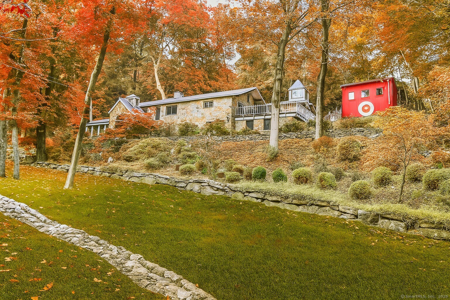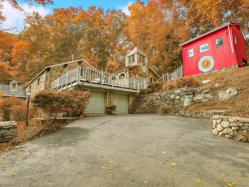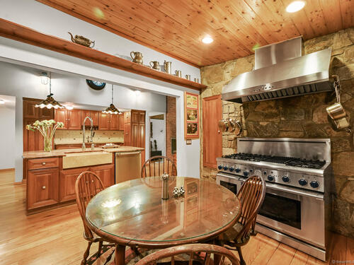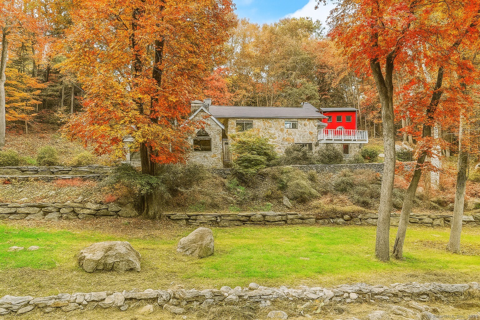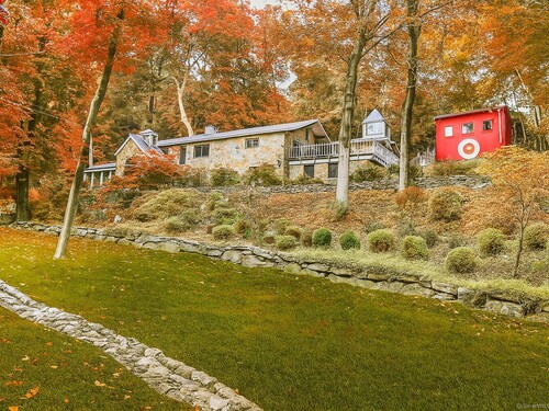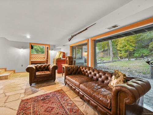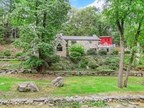 This exceptional stone home, blending contemporary design with natural tranquility, sits on 2 private acres in Weston. Expertly engineered & beautifully constructed, the home welcomes you through a dramatic two-story foyer into a sun-filled living room with floor-to-cathedral windows, a custom two-sided fireplace, and sweeping woodland views. Open chef's kitchen features granite countertops, custom cabinetry, granite center island, premium built-in appliances: Sub-Zero, Thermador stoves, Miele cappuccino station, warming oven, steamer. The large dining room offers perfect space for entertaining. Main level includes three bedrooms, highlighted by a spacious primary suite w sitting room, spa bath, double vanity & custom staircase that winds to a loft ideal for reading or stargazing. Two additional upstairs bedrooms feature getaway lofts. Lower level incl 2 more bedrooms, full bath, wine cellar, sauna, game room & family w stone fireplace that opens to outdoor living area. Heated red barn, accessible from upper deck, perfect for basketball, exercise/yoga, office, gym, studio, or meditation retreat. Honeycombed by trails & two meandering rivers, Weston has the largest nature preserve in Fairfield County, pairing abundant opportunities for hiking, cycling, fishing, & birding with easy access to NYC. The town's renowned school system has a low ratio (12/1) & has been awarded CT Blue Ribbons for excellence. Community, sophistication, nature. It doesn't get any better than this!!!