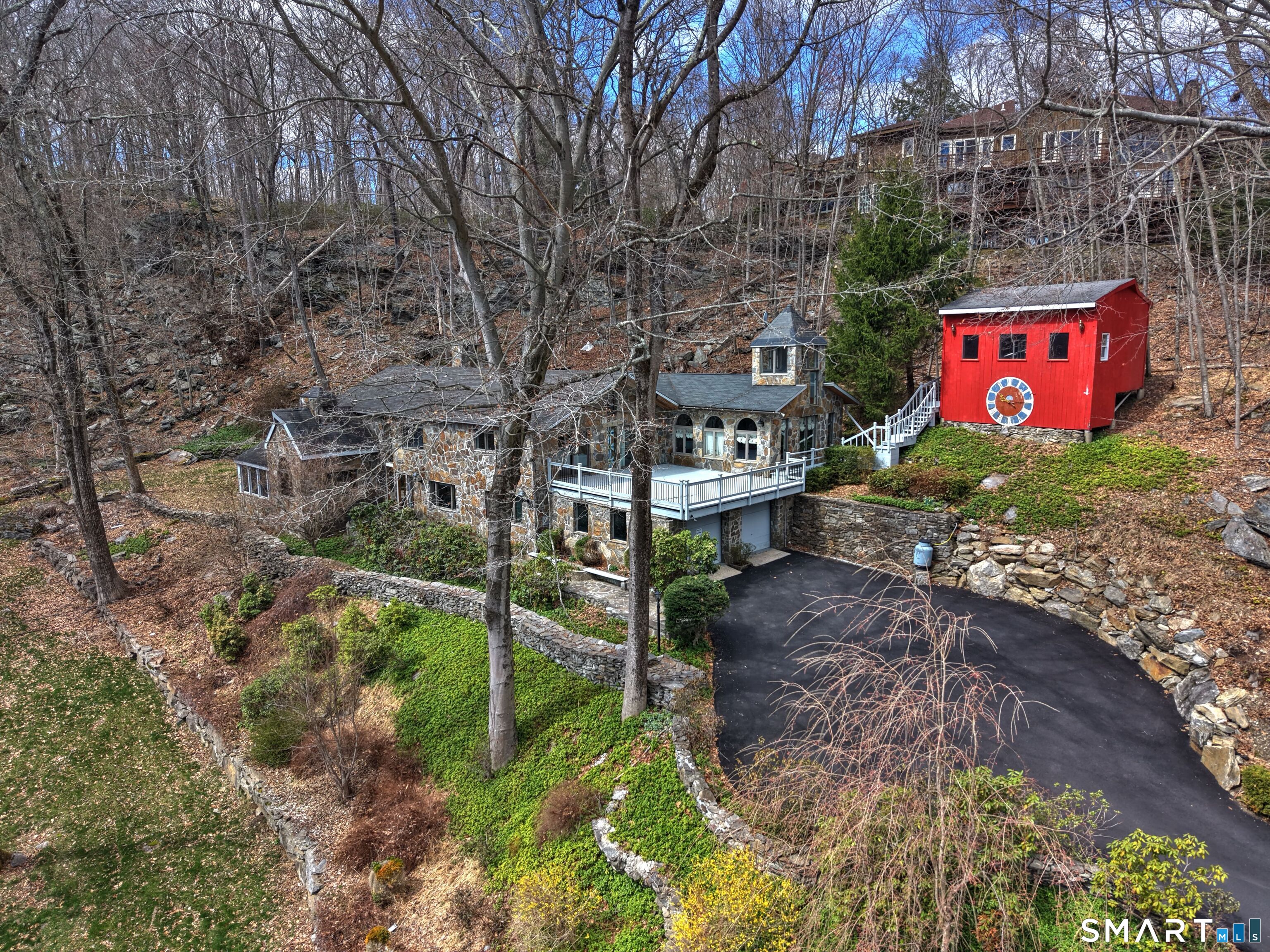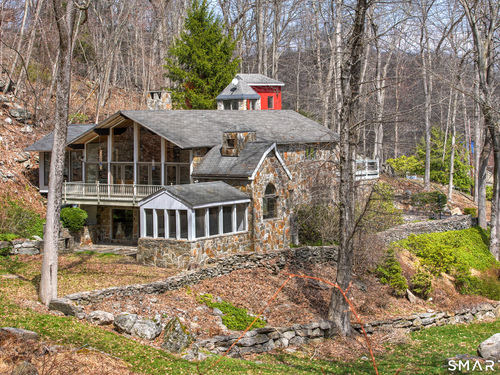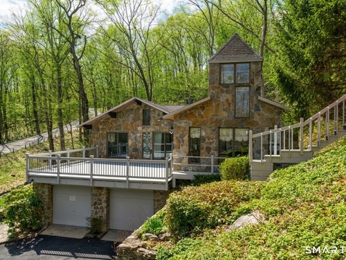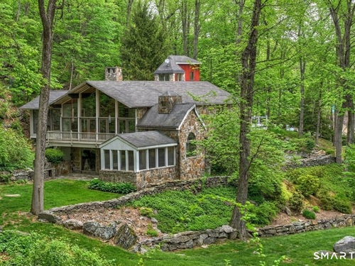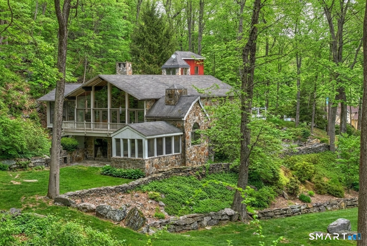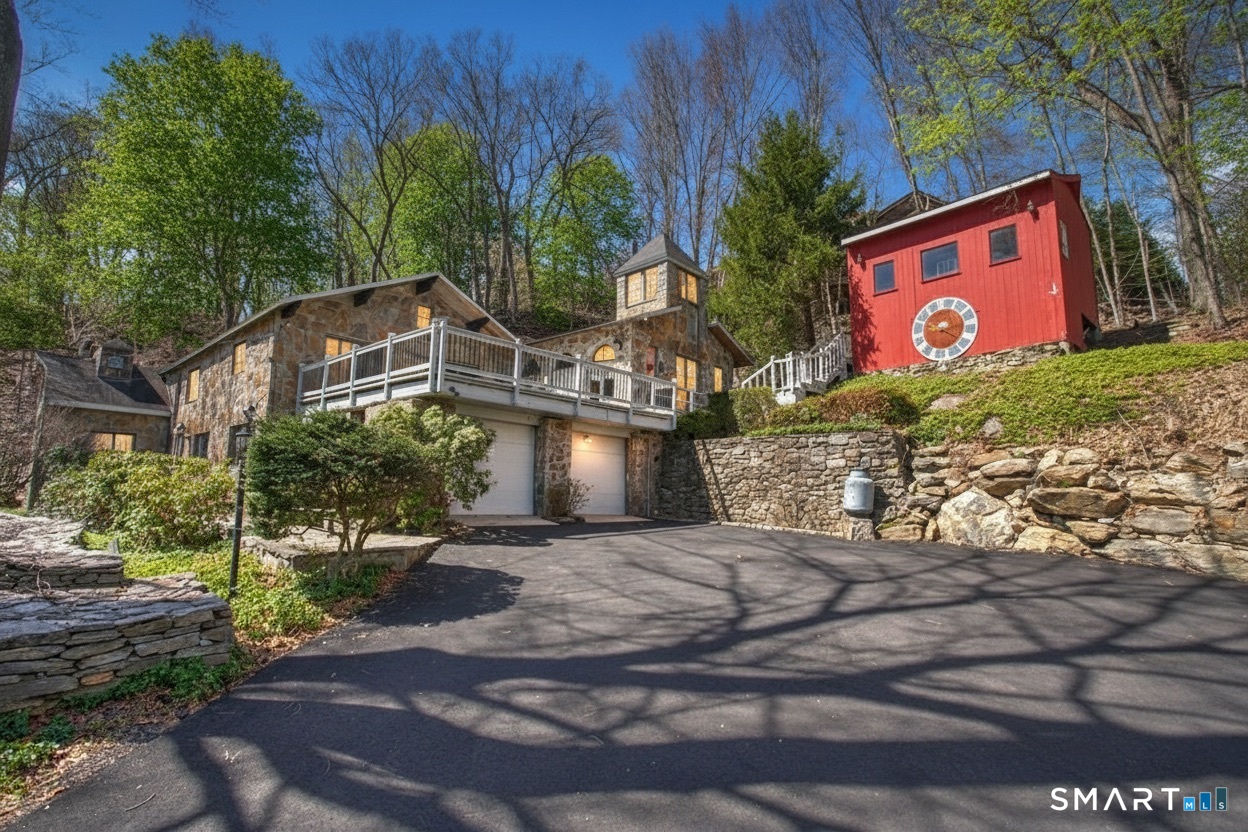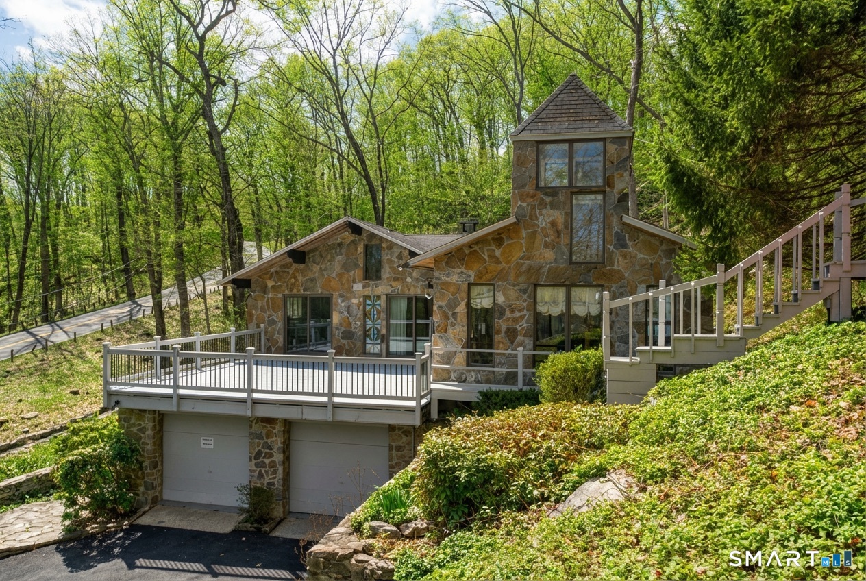 Exceptional 5-BR stone home blending contemporary design w natural tranquility sits atop 2 private acres in Weston. Expertly engineered & beautifully constructed, this freshly painted home welcomes you through a dramatic 2-story foyer into a sun-filled living room with floor-to-ceiling windows, sweeping woodland views, and a custom 2-sided fireplace. Open chef's kitchen features granite countertops & island, custom cabinetry: Sub-Zero, Thermador stoves, Miele cappuccino station, warming oven, steamer. Large DR flows b/w LR and kitchen for perfect entertaining. Main level: 3 bedrooms, spacious primary suite w sitting room, spa bath, double vanity & custom staircase that winds to loft ideal reading/stargazing. Additional upstairs BRs feature full-length getaway lofts. Lower level incl 2 more BR, excellent for guests/au pair/office, full bath, wine cellar, sauna, game room & family w stone fireplace that opens to outdoor living area. Heated red barn, accessible from upper deck, perfect for exercise/yoga, office, studio, or meditation. Honeycombed by trails & two meandering rivers, Weston has largest nature preserve in Fairfield County, pairing abundant opportunities for hiking, cycling, fishing, & birding with easy access to NYC. Located in the desirable South Weston, minutes to Westport shopping. Its renowned school system w low ratio has been awarded CT Blue Ribbons for excellence. Community, sophistication, nature. It doesn't get any better than this!!!