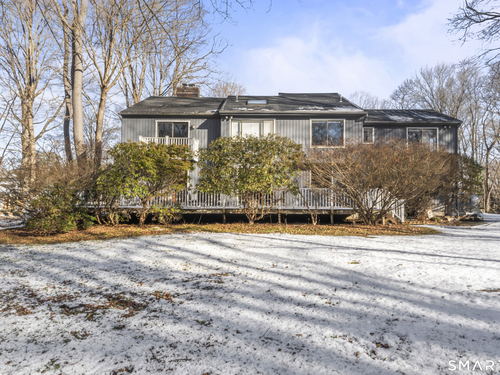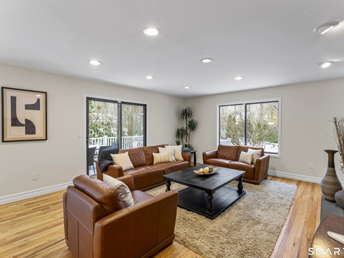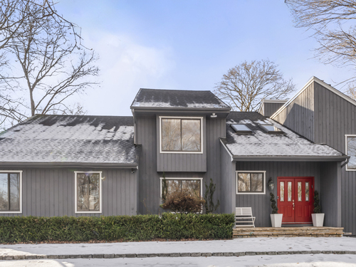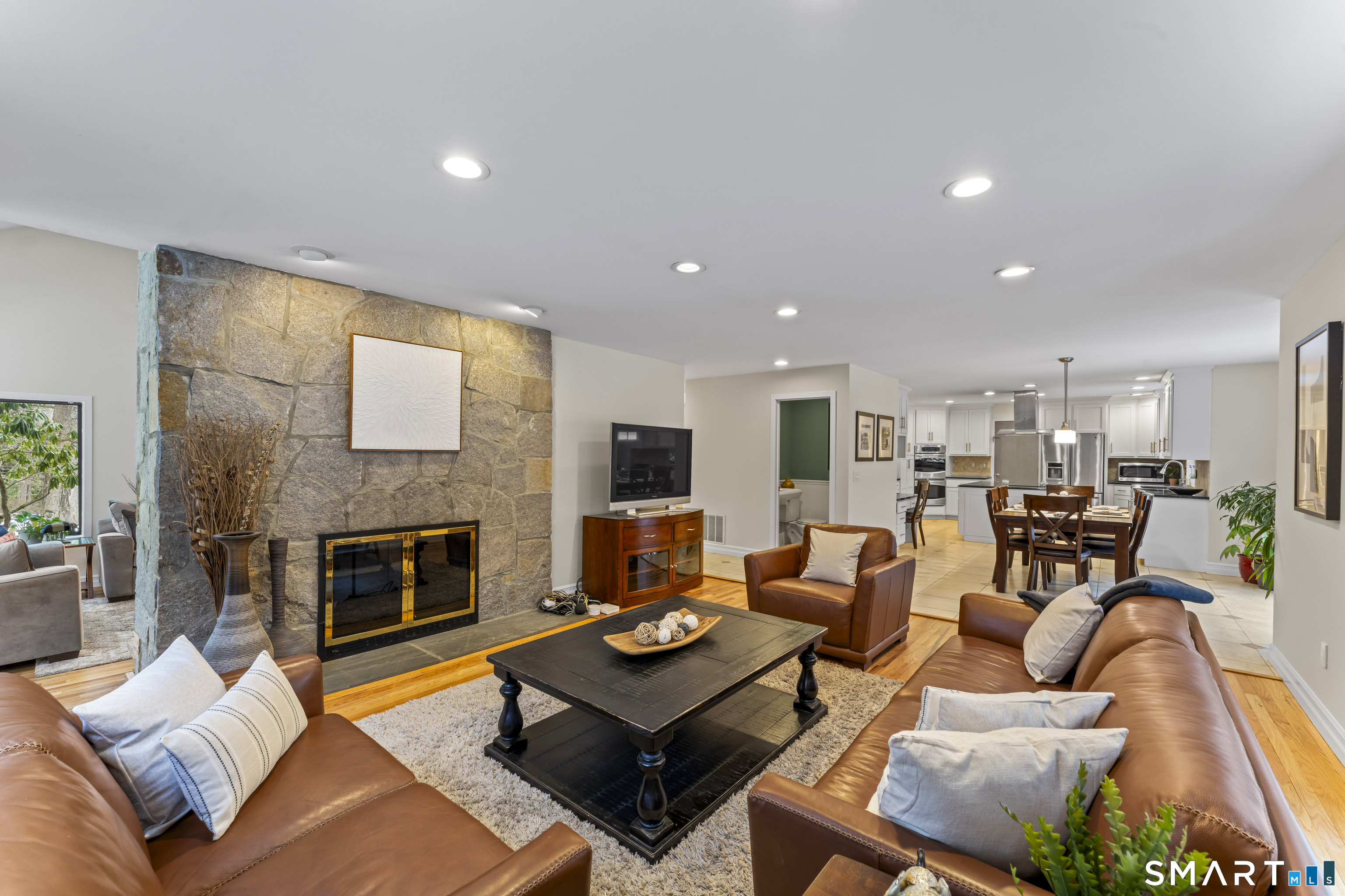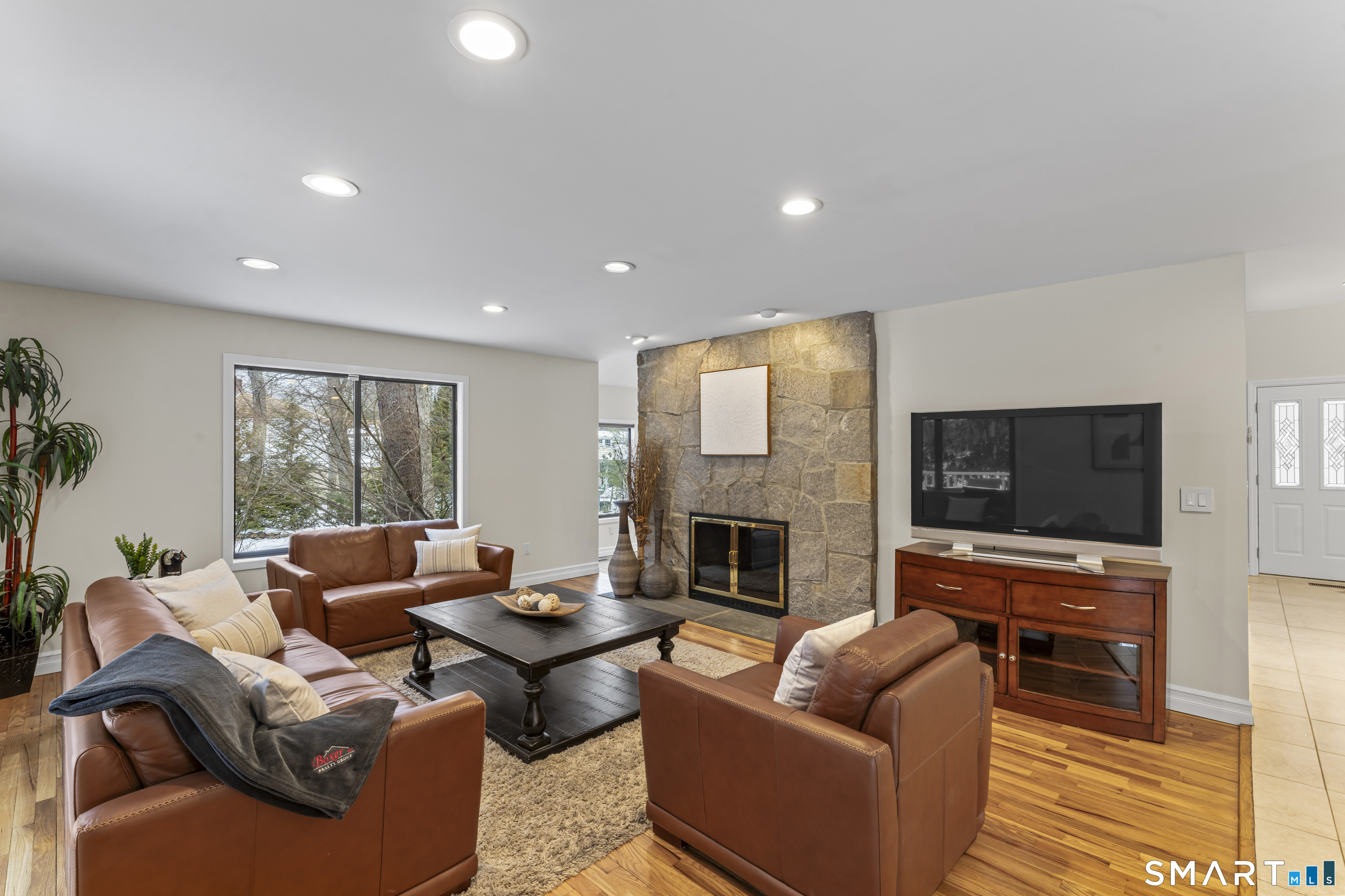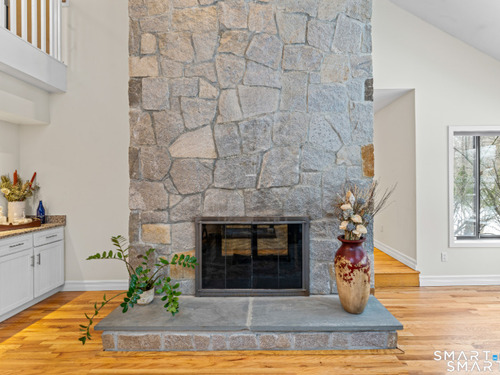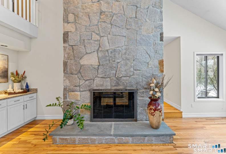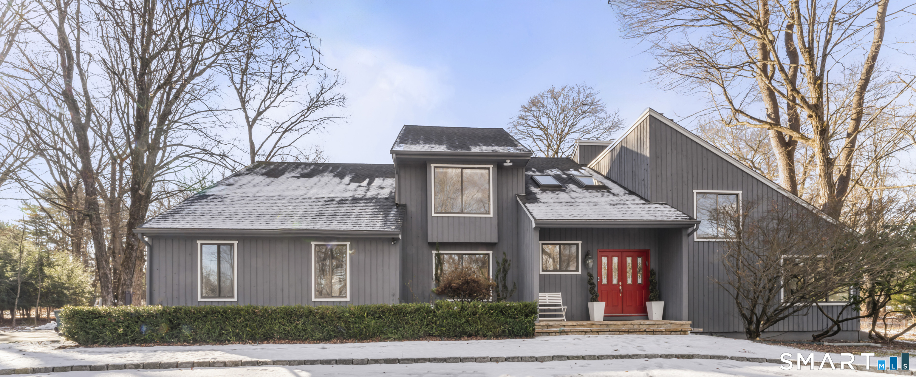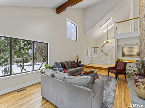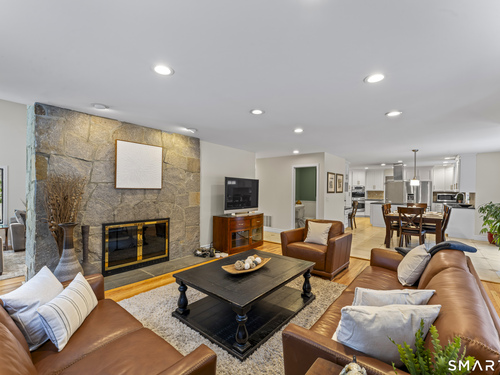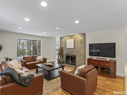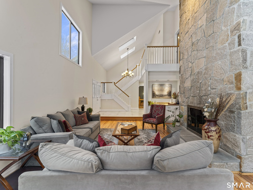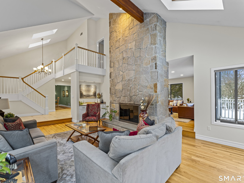 Drive up the circular driveway and discover this spacious, desirable contemporary home bursting with curb appeal, beautifully set on a level, private acre. Light pours through skylights and walls of glass, creating a bright and airy atmosphere throughout. A welcoming entry opens to a stunning two-story living room highlighted by a dramatic stone fireplace and wet bar - perfect for entertaining. The open, flowing layout continues into the inviting family room, featuring a second stone fireplace, and an updated kitchen that connects seamlessly for easy gatherings and everyday living. A generous dining room is perfect for hosting memorable celebrations. Upstairs, you'll find four spacious bedrooms, including a serene primary suite with sliders to a private deck - your own peaceful retreat. The laundry room is conveniently located upstairs. The finished lower level expands the living space with a fantastic recreation room with a screen projector and speakers for movie night, a full bath, and a versatile bonus room ideal for guests, a home office, or workout space. An oversized two-car garage completes this exceptional home that blends comfort, style, abundant natural light, and exceptional entertaining spaces.