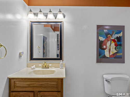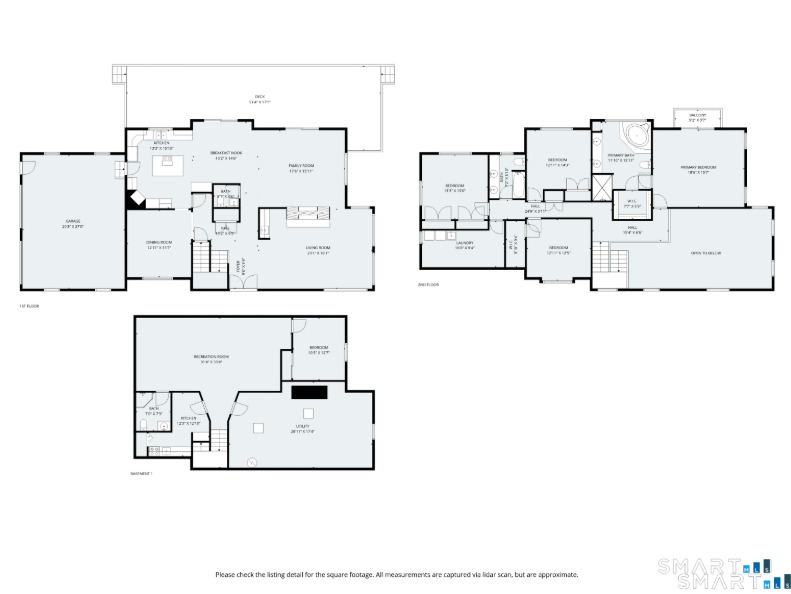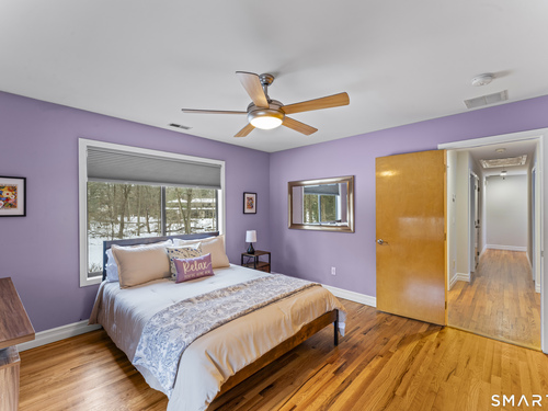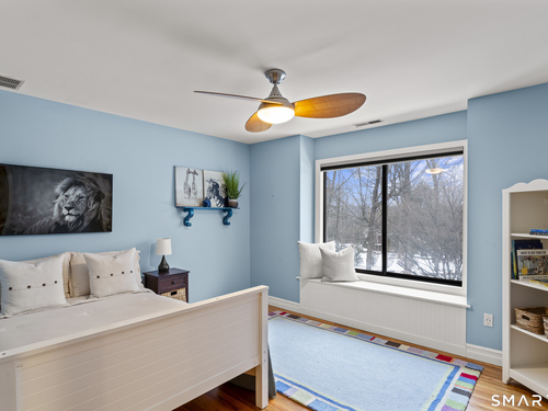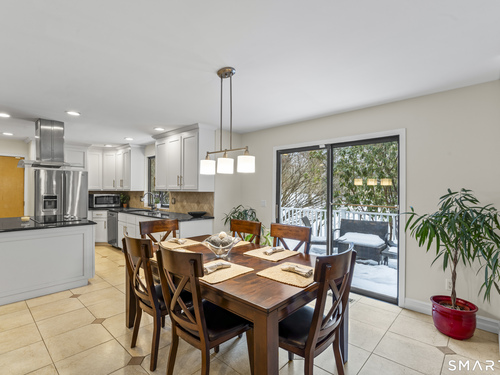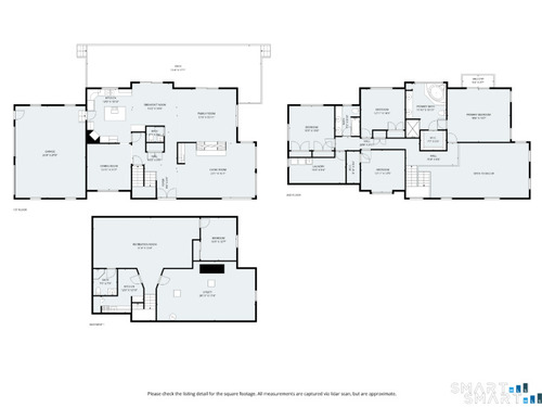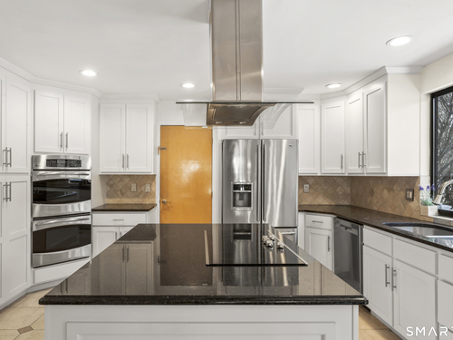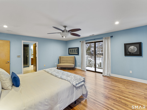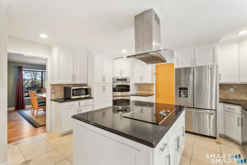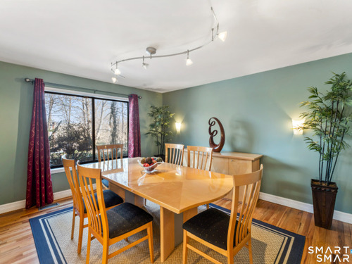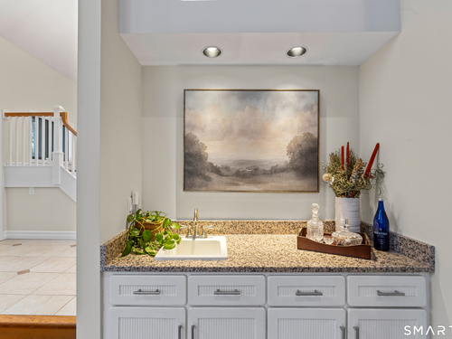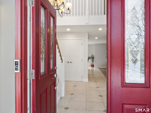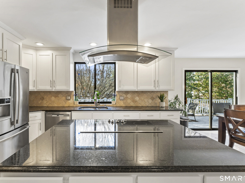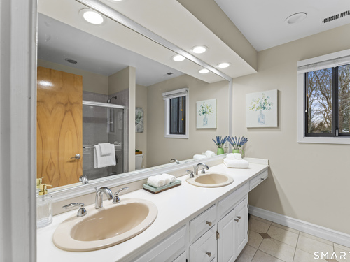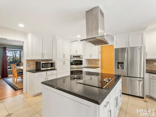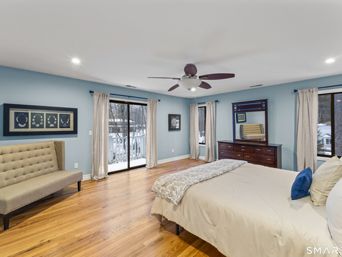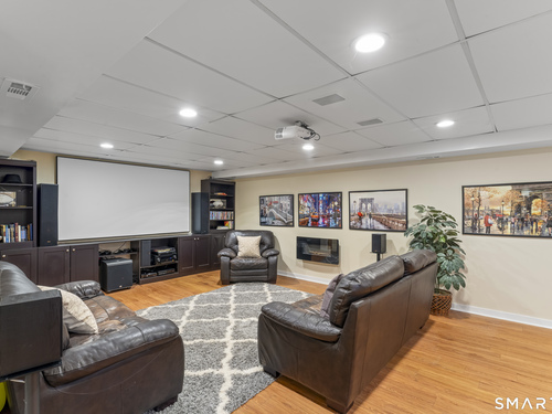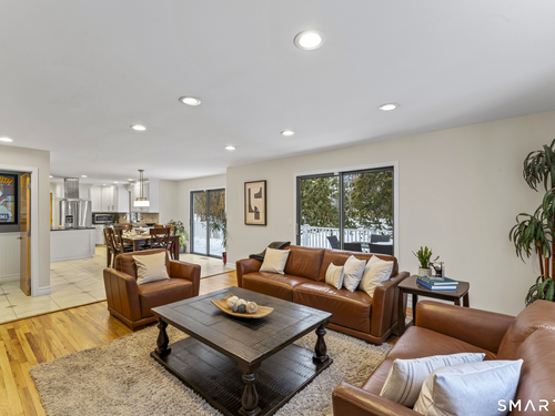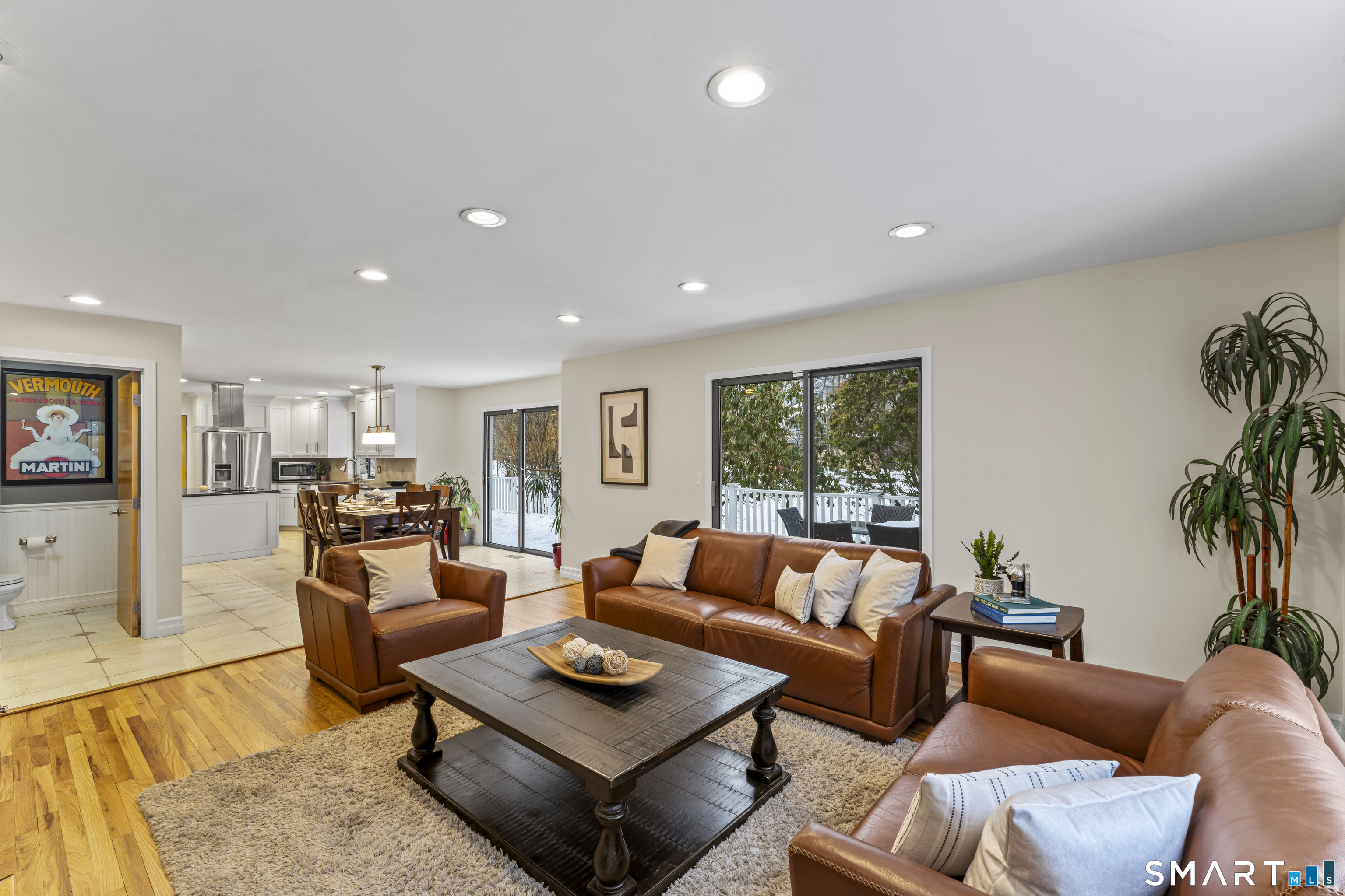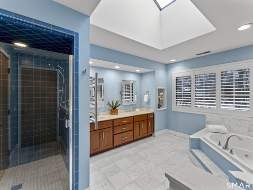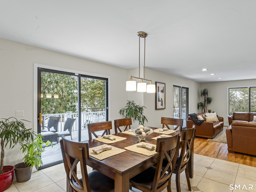 Drive up the circular driveway and discover this spacious, desirable contemporary home bursting with curb appeal, beautifully set on a level, private acre. Light pours through skylights and walls of glass, creating a bright and airy atmosphere throughout. A welcoming entry opens to a stunning two-story living room highlighted by a dramatic stone fireplace and wet bar - perfect for entertaining. The open, flowing layout continues into the inviting family room, featuring a second stone fireplace, and an updated kitchen that connects seamlessly for easy gatherings and everyday living. A generous dining room is perfect for hosting memorable celebrations. Upstairs, you'll find four spacious bedrooms, including a serene primary suite with sliders to a private deck - your own peaceful retreat. The laundry room is conveniently located upstairs. The finished lower level expands the living space with a fantastic recreation room with a screen projector and speakers for movie night, a full bath, and a versatile bonus room ideal for guests, a home office, or workout space. An oversized two-car garage completes this exceptional home that blends comfort, style, abundant natural light, and exceptional entertaining spaces.