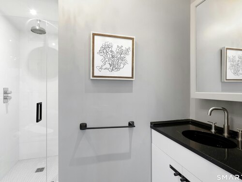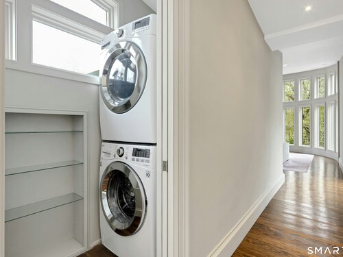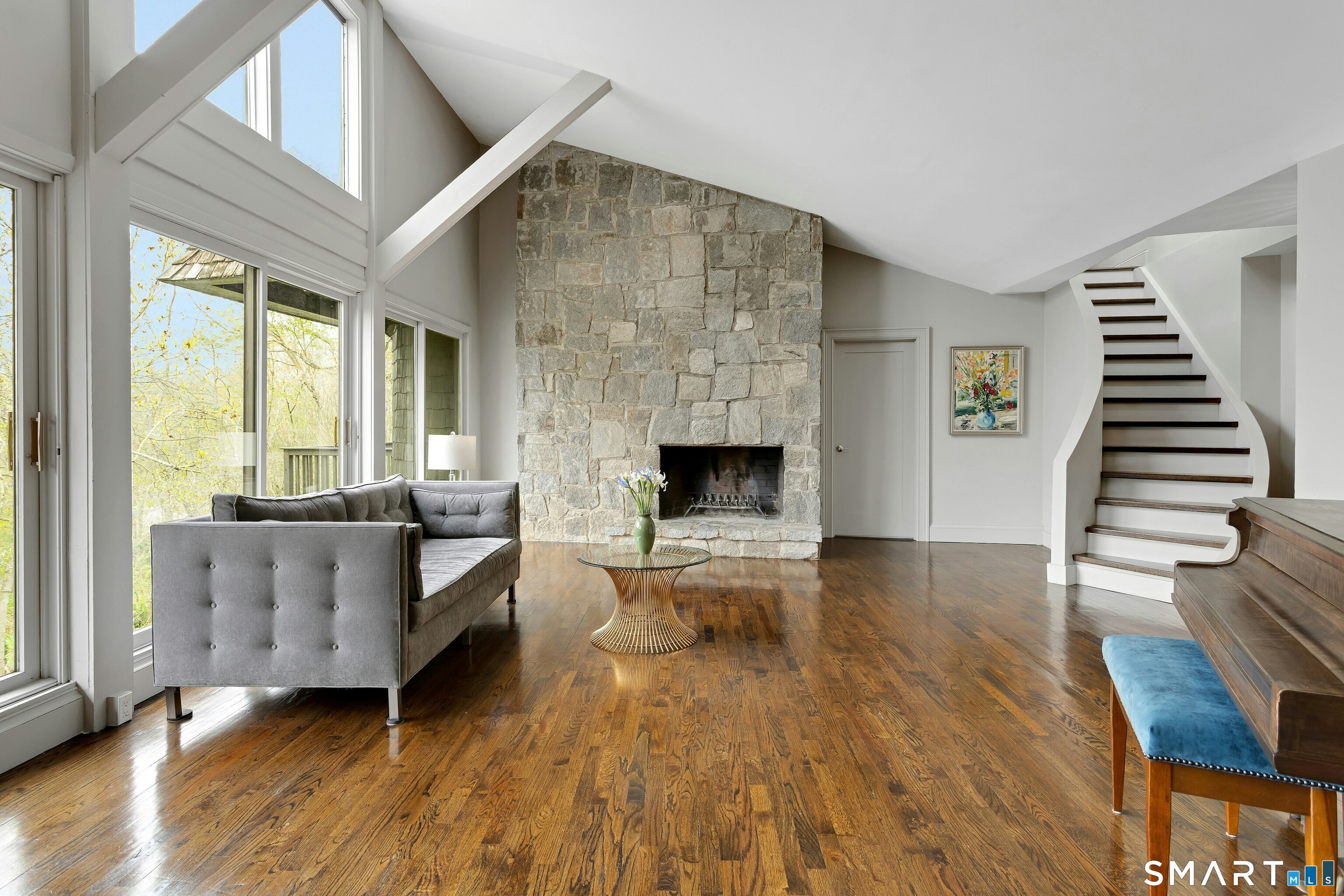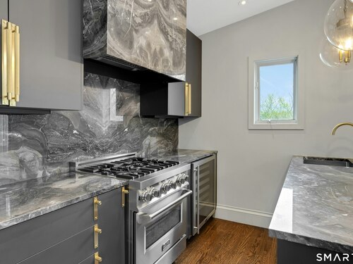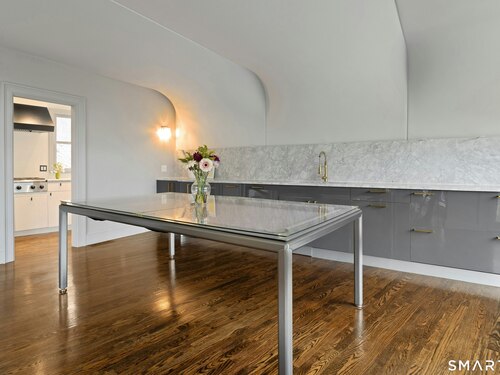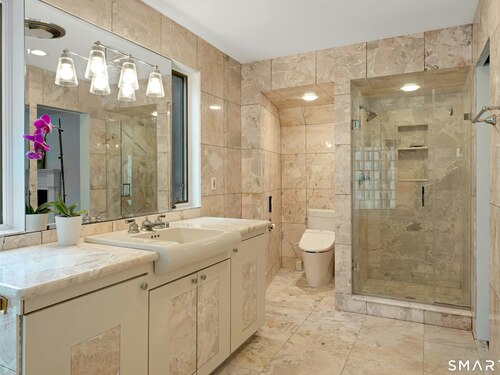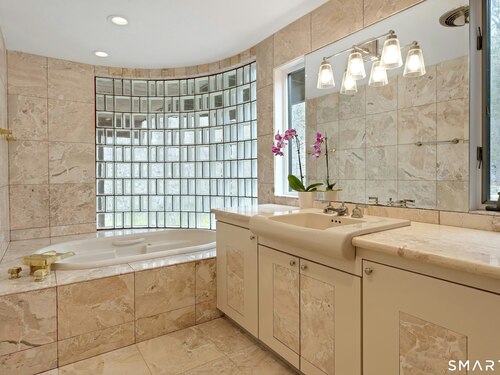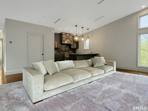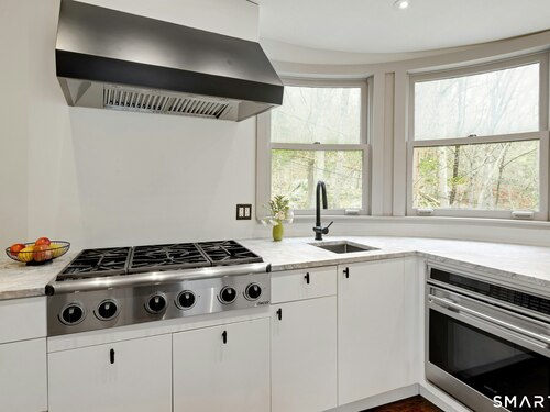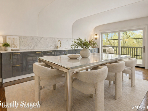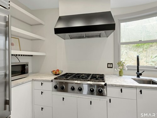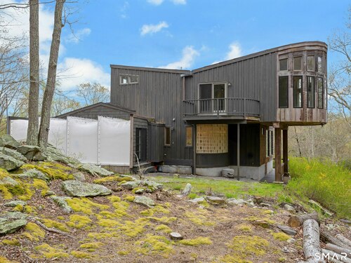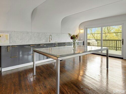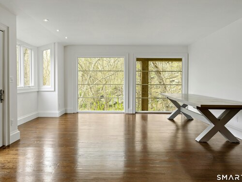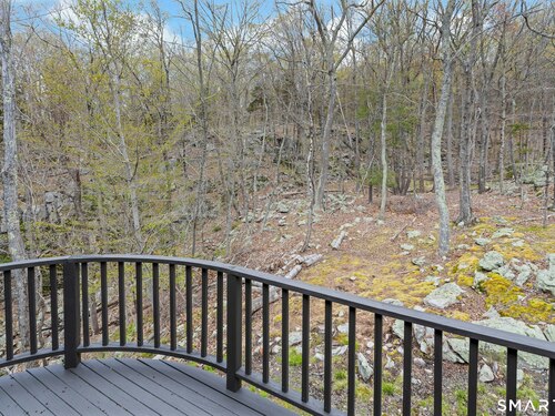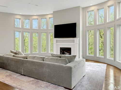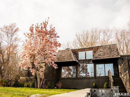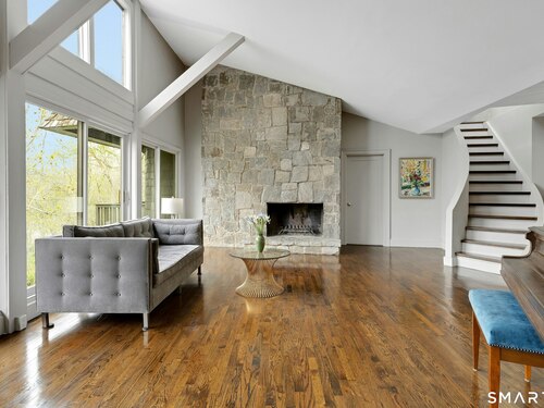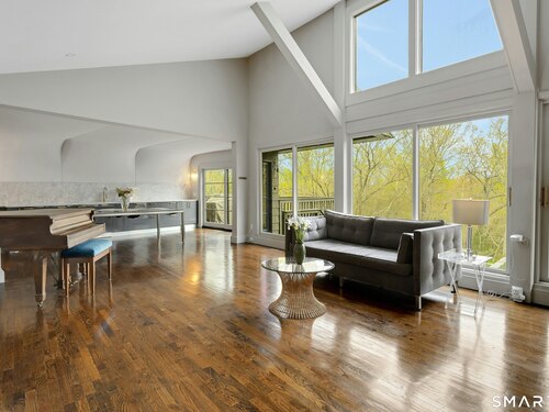 Perched atop 2.12 acres at the end of a quiet cul-de-sac, this fully renovated modern 3BR contemporary offers a rare blend of privacy, architectural drama, and seamless indoor-outdoor living. Set near Aspetuck Land Trust trails, the home blends refined design with serene surroundings. Enter into an open-concept main level featuring a long banquet-style dining area and a stunning great room with soaring ceilings, walls of glass, a stone fireplace, and a sculptural curved staircase that serves as a striking focal point. Just beyond the banquet dining area is a scullery-style working kitchen with premium appliances, including Sub-Zero, thoughtfully designed for effortless entertaining while keeping prep and clean-up discreetly tucked away. Rich dark walnut hardwood floors run throughout. The main level includes 3 bedrooms, each with access to a deck or patio. The spacious primary suite offers a gas fireplace, large custom walk-in closet, and a spa-like bath w/ soaking tub, standing shower, and smart toilet. Upstairs, a dramatic great room with double-height windows, a third fireplace, full bath, separate laundry room, and a sleek marble-clad designer kitchen provides exceptional flexibility for guests, entertaining, or multigenerational living. A truly rare and architecturally compelling home, this one-of-a-kind retreat captures the very best of privacy, design, and natural beauty in one of Weston's most coveted settings.
