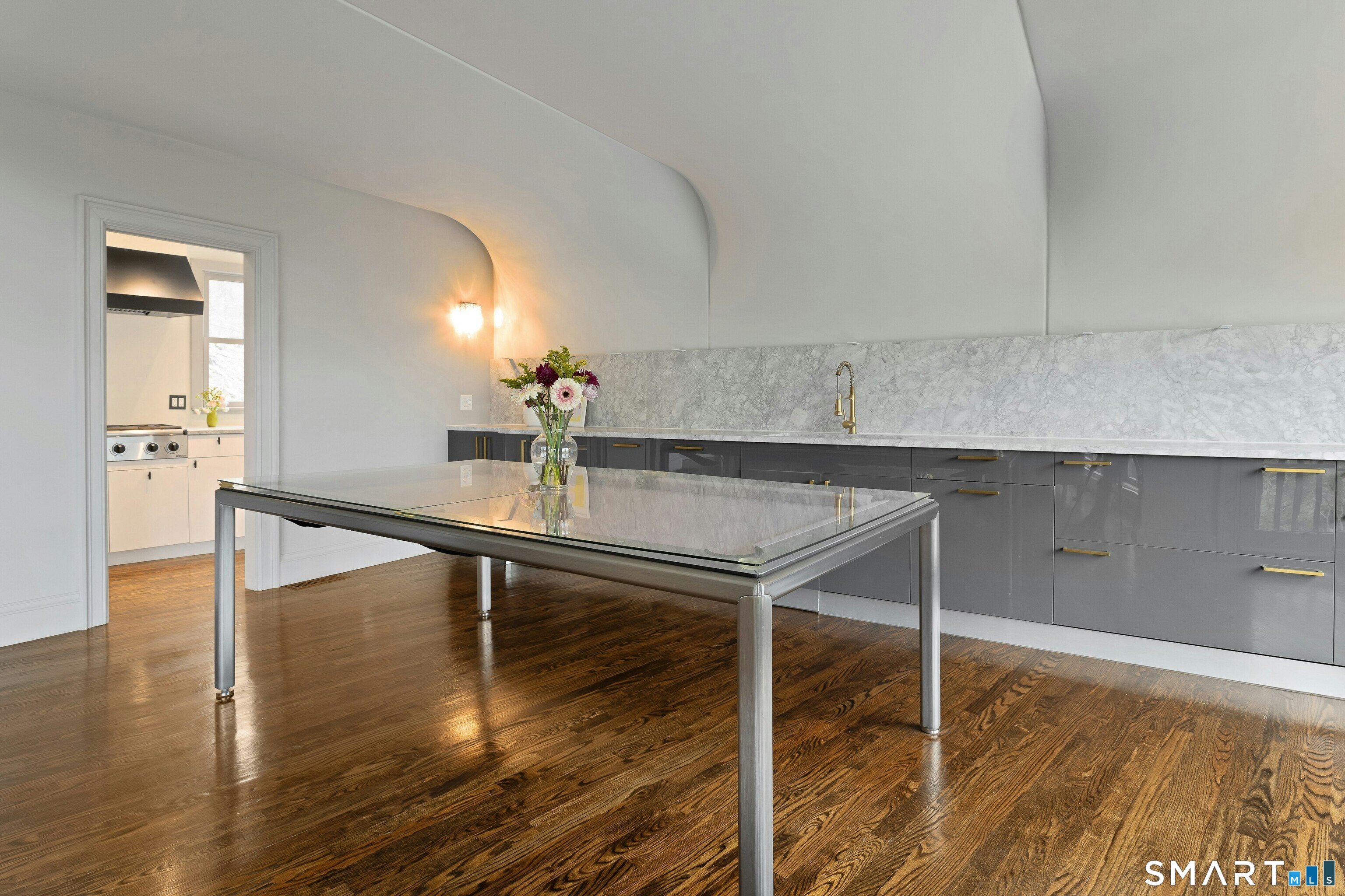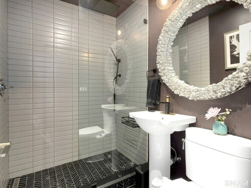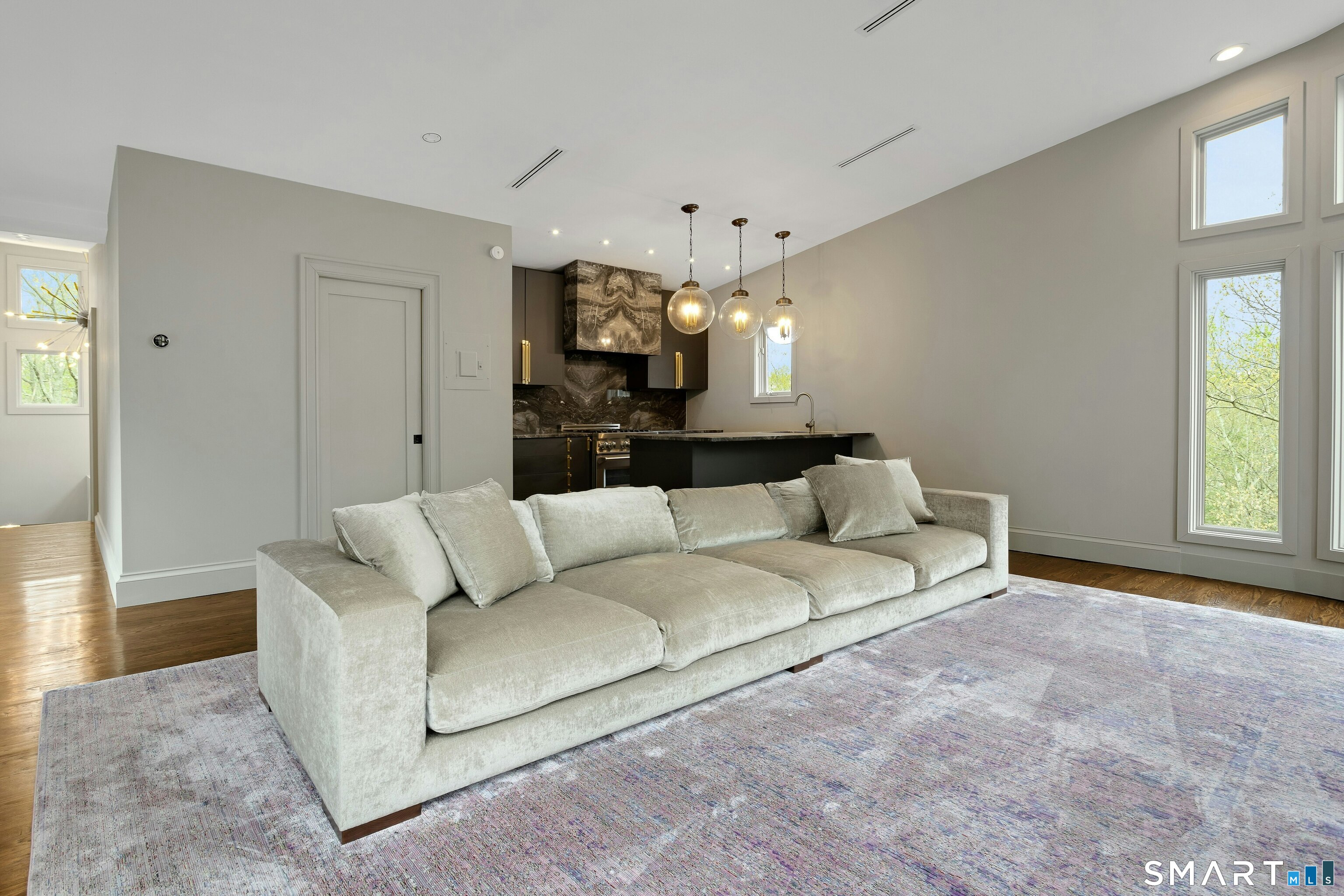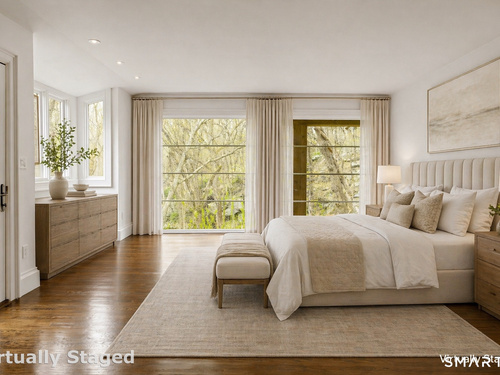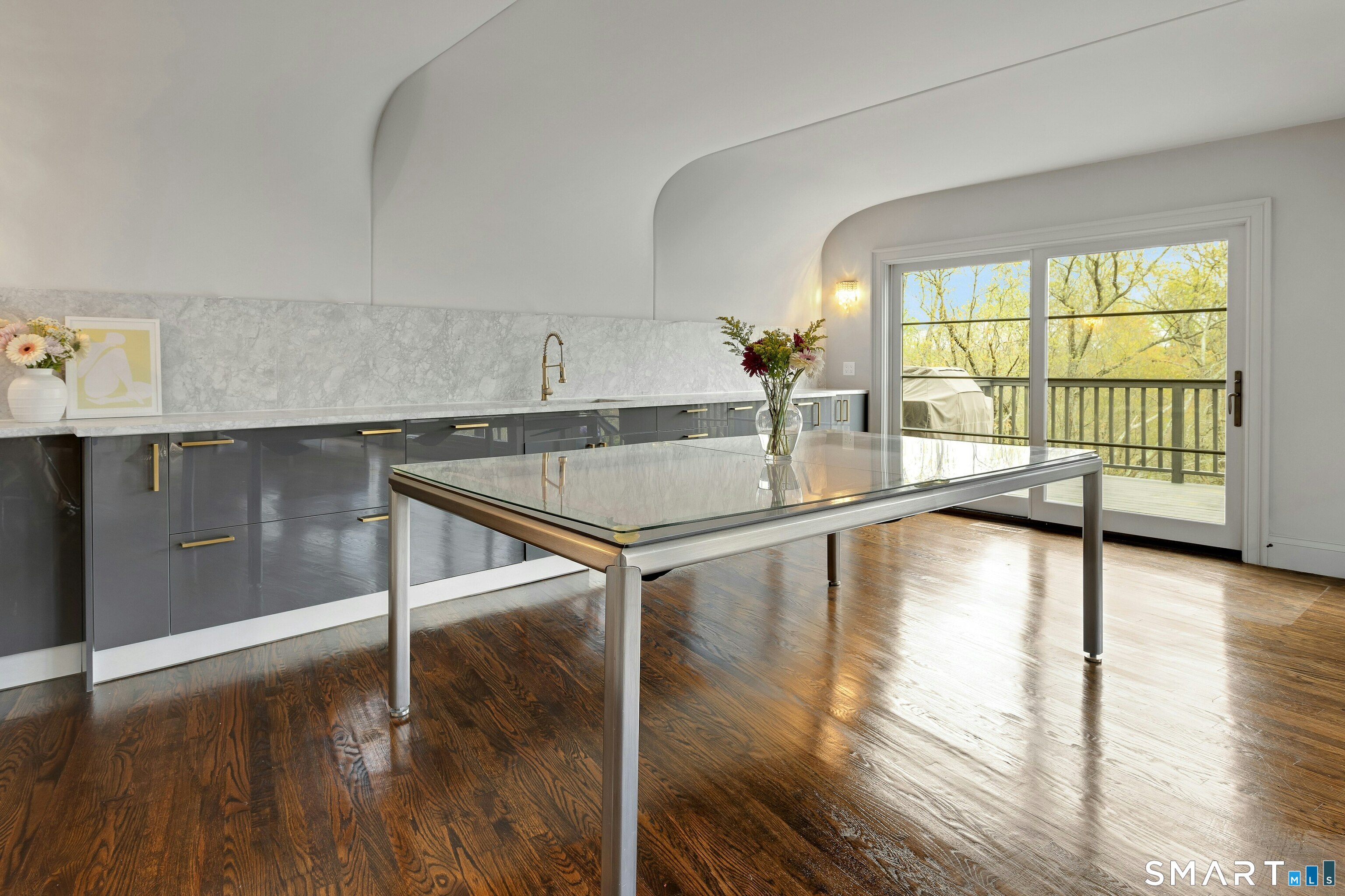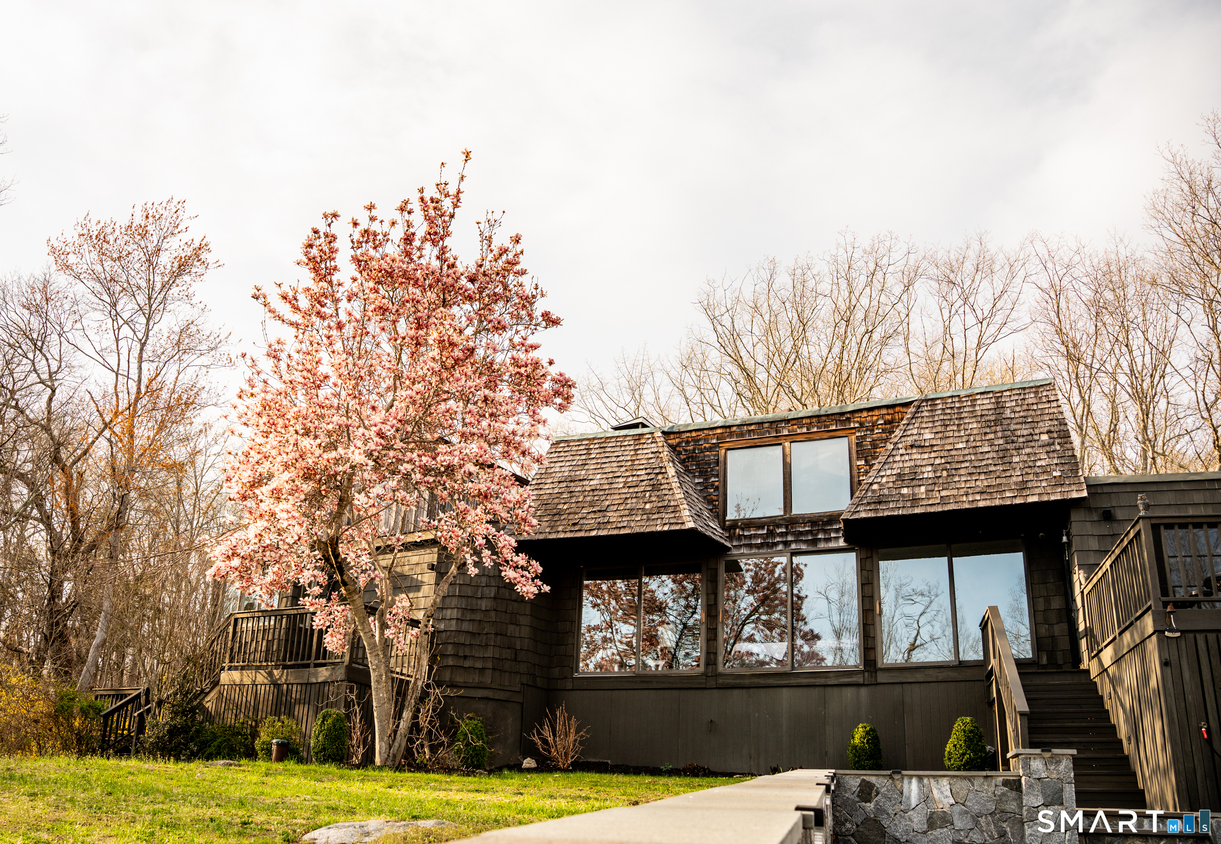 Perched atop 2.12 acres at the end of a quiet cul-de-sac, this fully renovated modern 3BR contemporary offers a rare blend of privacy, architectural drama, and seamless indoor-outdoor living. Set near Aspetuck Land Trust trails, the home blends refined design with serene surroundings. Enter into an open-concept main level featuring a long banquet-style dining area and a stunning great room with soaring ceilings, walls of glass, a stone fireplace, and a sculptural curved staircase that serves as a striking focal point. Just beyond the banquet dining area is a scullery-style working kitchen with premium appliances, including Sub-Zero, thoughtfully designed for effortless entertaining while keeping prep and clean-up discreetly tucked away. Rich dark walnut hardwood floors run throughout. The main level includes 3 bedrooms, each with access to a deck or patio. The spacious primary suite offers a gas fireplace, large custom walk-in closet, and a spa-like bath w/ soaking tub, standing shower, and smart toilet. Upstairs, a dramatic great room with double-height windows, a third fireplace, full bath, separate laundry room, and a sleek marble-clad designer kitchen provides exceptional flexibility for guests, entertaining, or multigenerational living. A truly rare and architecturally compelling home, this one-of-a-kind retreat captures the very best of privacy, design, and natural beauty in one of Weston's most coveted settings.