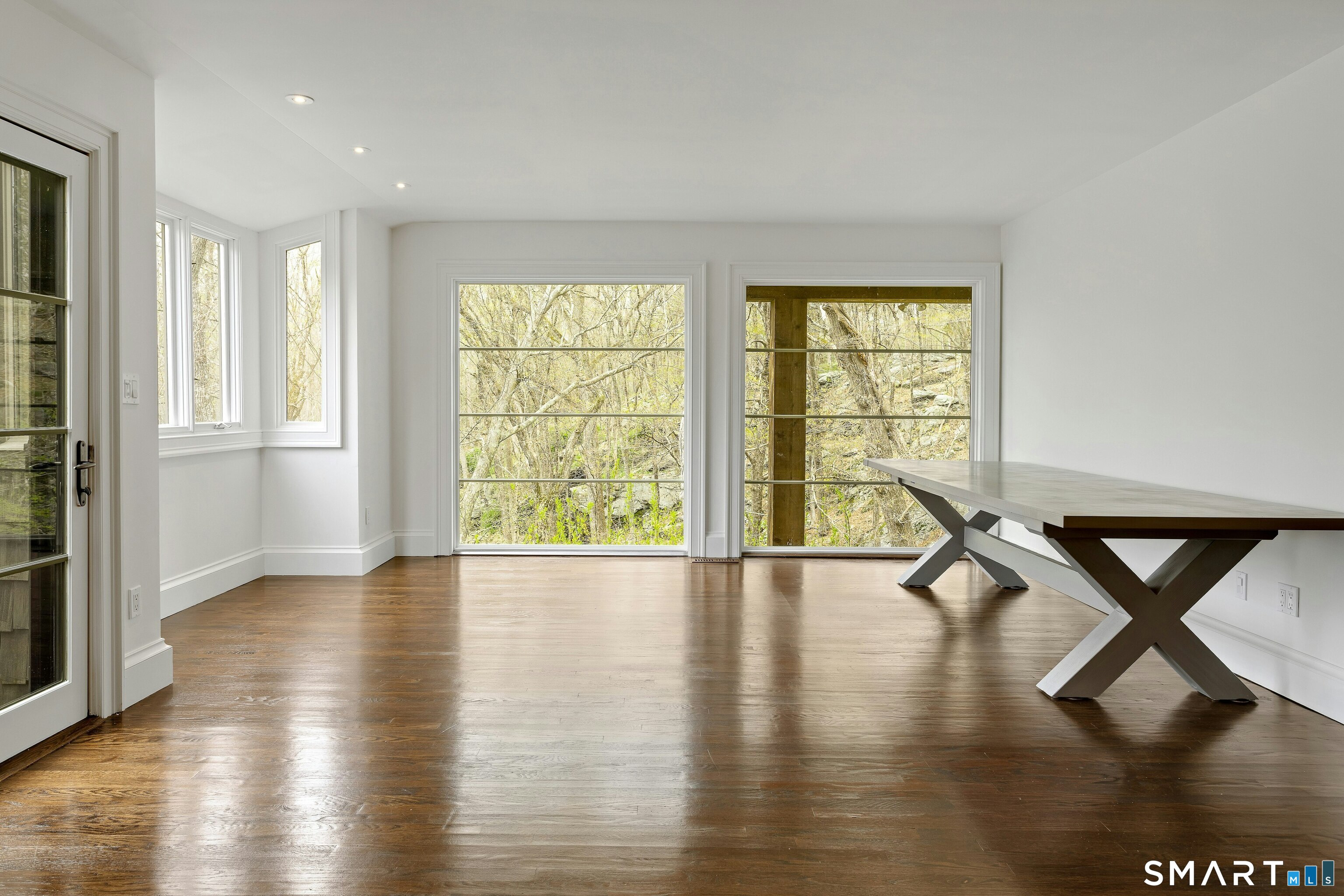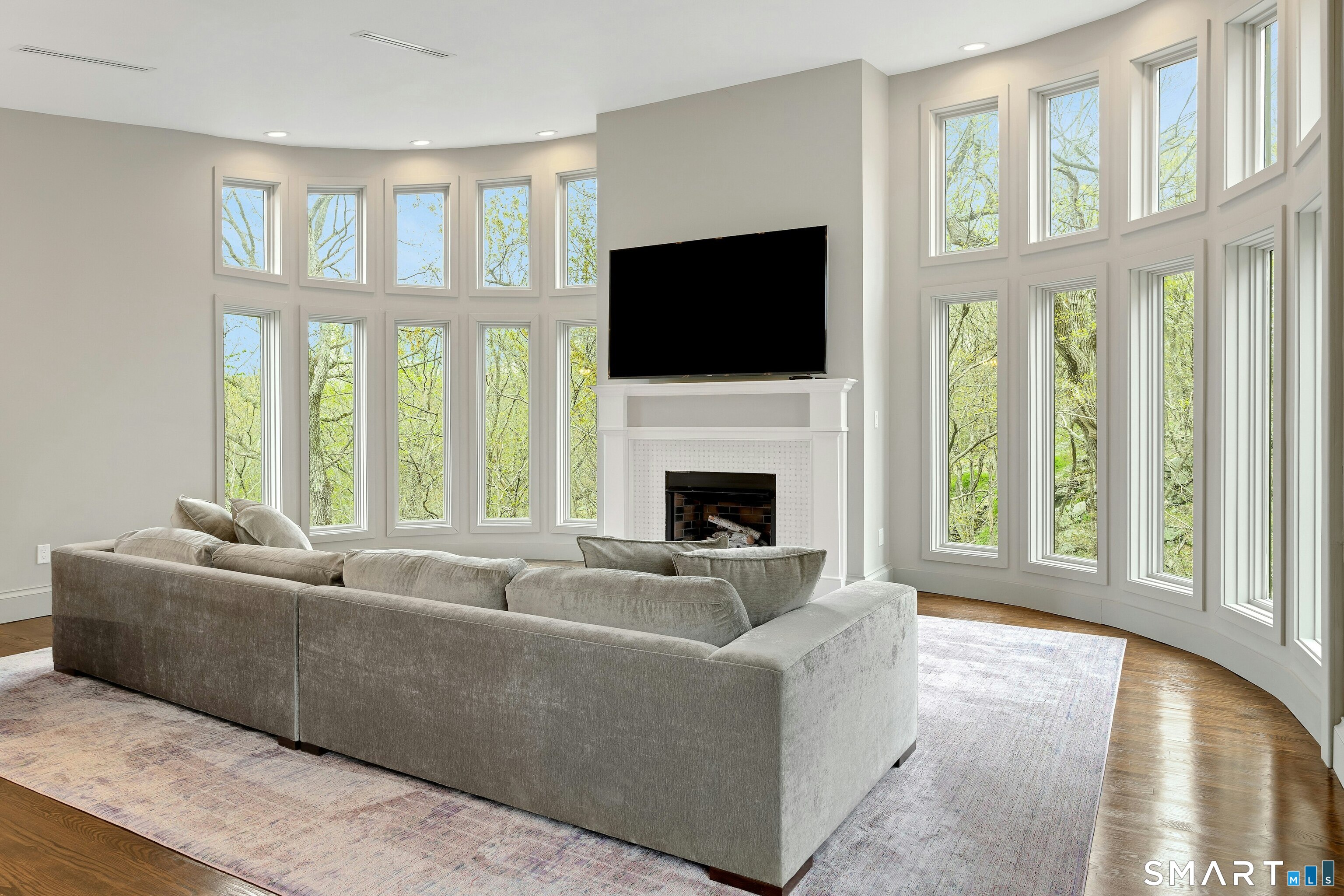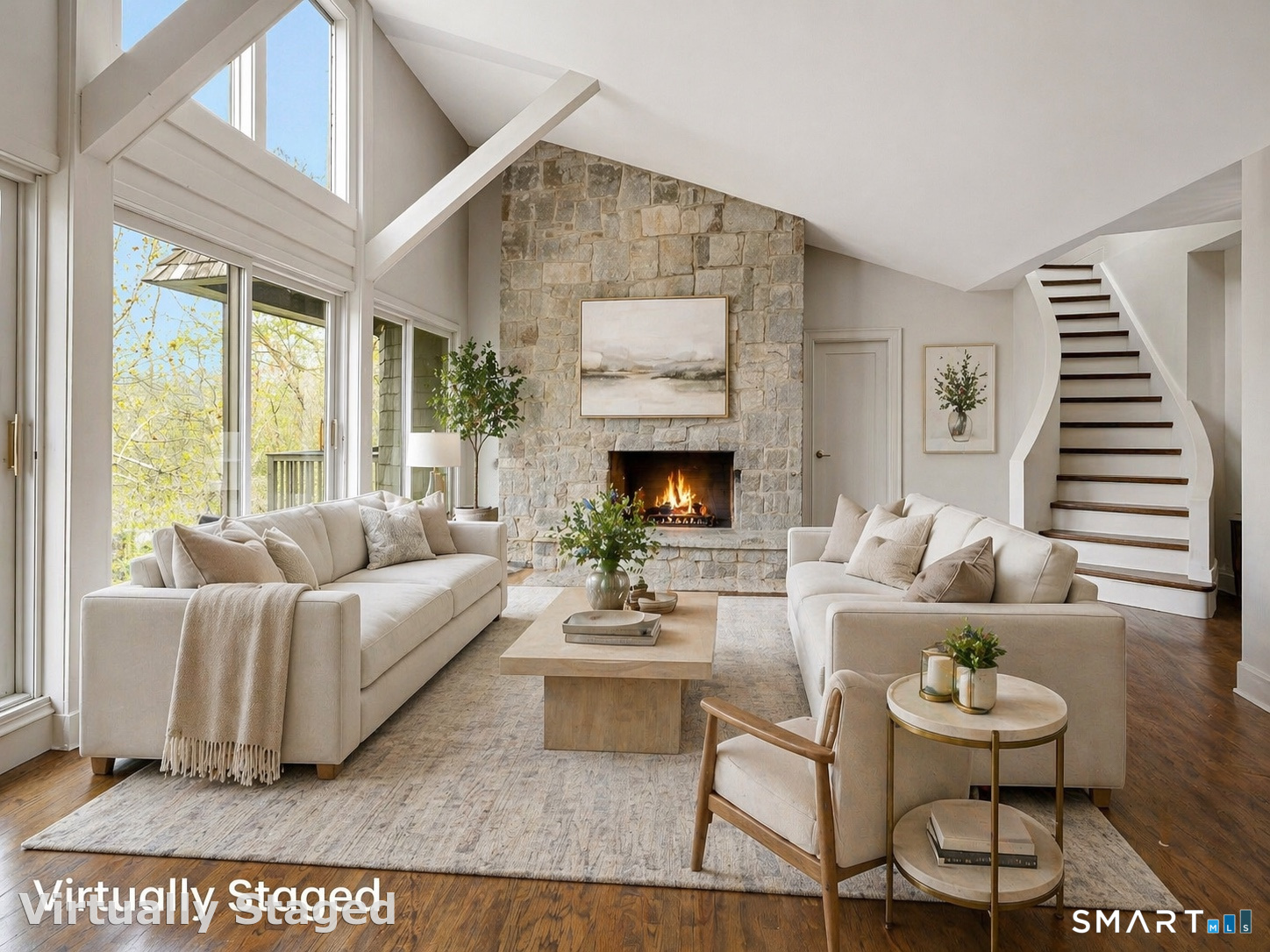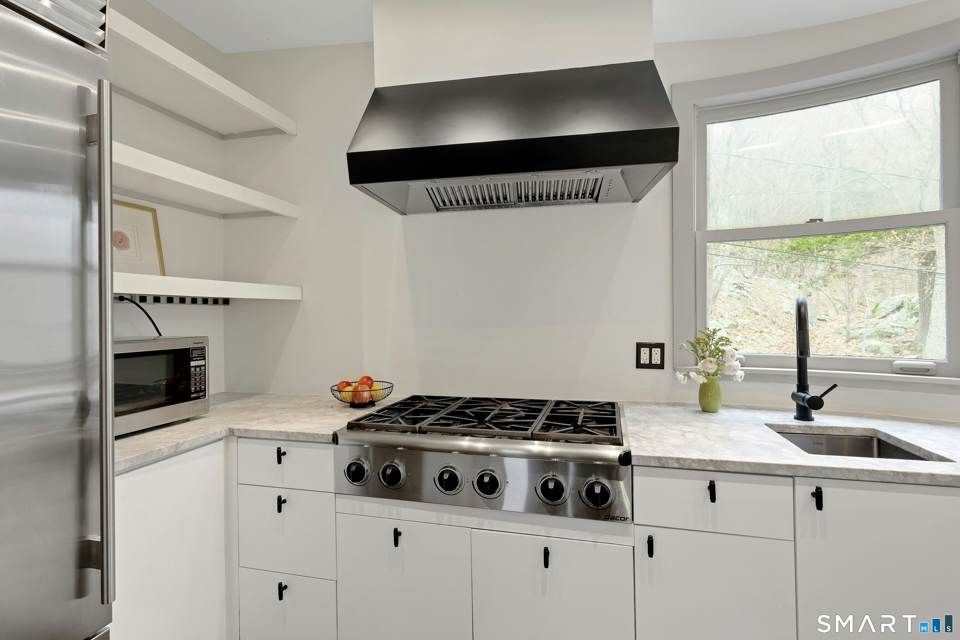 Perched atop 2.12 acres at the end of a quiet cul-de-sac, this fully renovated modern 3BR contemporary offers a rare blend of privacy, architectural drama, and seamless indoor-outdoor living. Set near Aspetuck Land Trust trails, the home blends refined design with serene surroundings. Enter into an open-concept main level featuring a long banquet-style dining area and a stunning great room with soaring ceilings, walls of glass, a stone fireplace, and a sculptural curved staircase that serves as a striking focal point. Just beyond the banquet dining area is a scullery-style working kitchen with premium appliances, including Sub-Zero, thoughtfully designed for effortless entertaining while keeping prep and clean-up discreetly tucked away. Rich dark walnut hardwood floors run throughout. The main level includes 3 bedrooms, each with access to a deck or patio. The spacious primary suite offers a gas fireplace, large custom walk-in closet, and a spa-like bath w/ soaking tub, standing shower, and smart toilet. Upstairs, a dramatic great room with double-height windows, a third fireplace, full bath, separate laundry room, and a sleek marble-clad designer kitchen provides exceptional flexibility for guests, entertaining, or multigenerational living. A truly rare and architecturally compelling home, this one-of-a-kind retreat captures the very best of privacy, design, and natural beauty in one of Weston's most coveted settings.