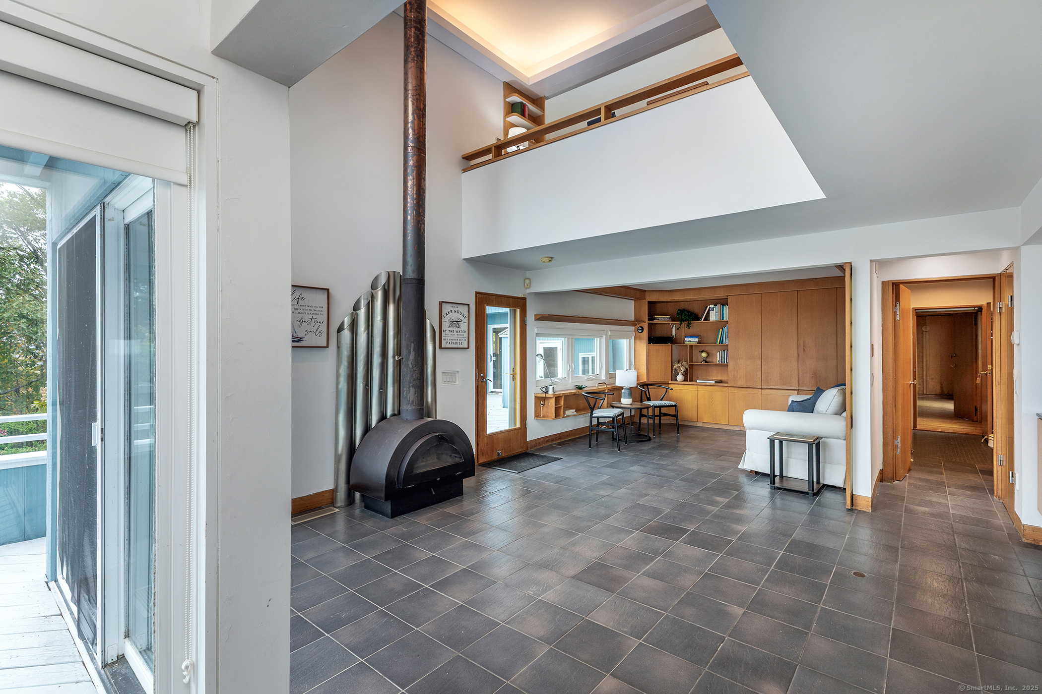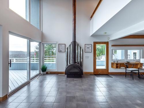 Built-Ins, Wood Stove, Sliders, Hardwood Floor, Slate Floor