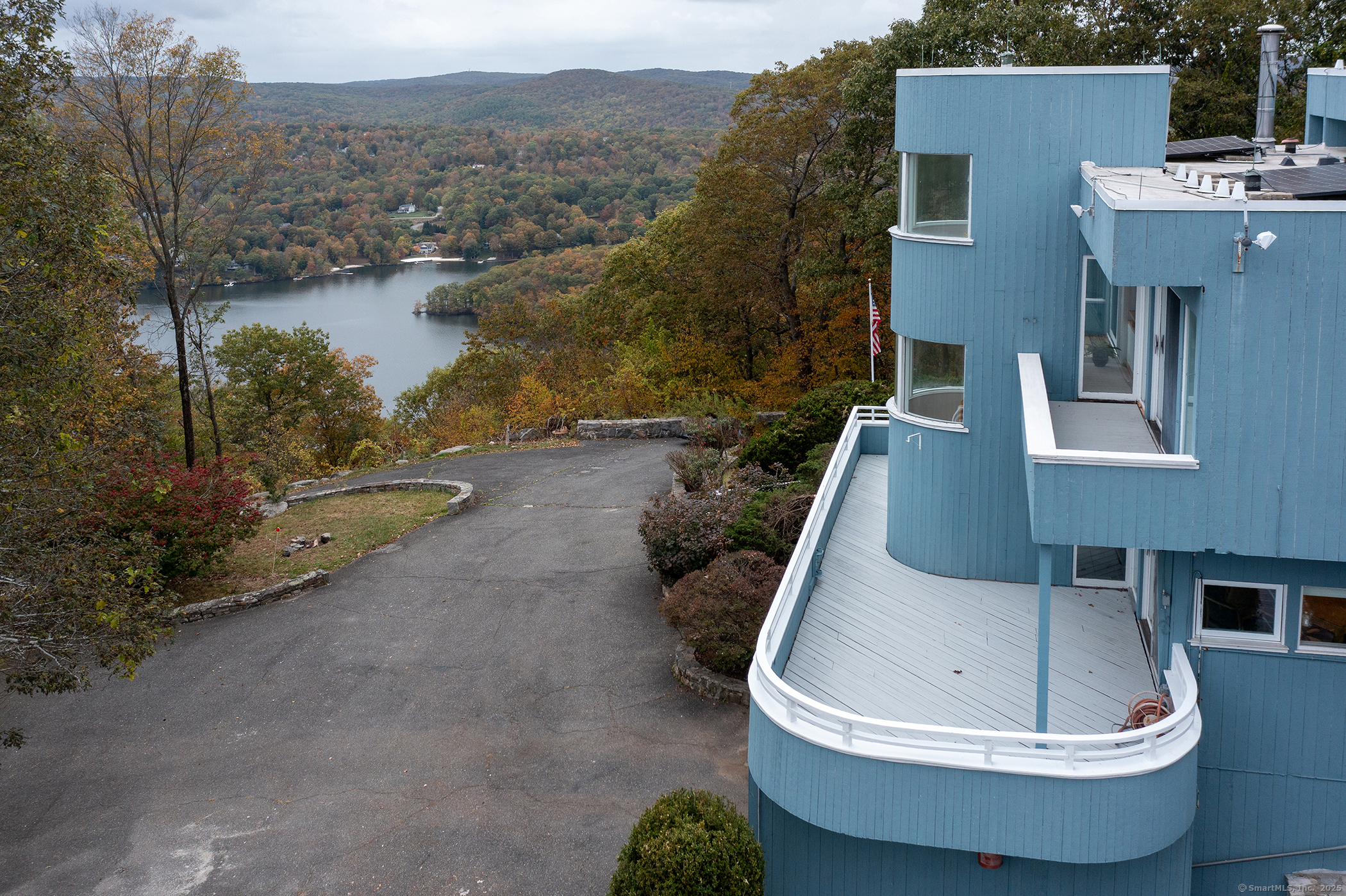 It's All About the Views! Surrounded by lake views, this stately Contemporary, set on a private acre plus an additional lot (.82 acs), at the end of a cul-de-sac, is just waiting for your customization. This incredible setting hosts this 3 bedroom,2.5 bath custom designed home with multilevel wrap decks & balconies and an oversized bonus room for great family fun center or studio for the artist/photographer. An open plan showcases. slate floors, custom built-in cabinetry throughout, a great room open to dining room and efficient galley kitchen topped with granite. A second floor primary suite offers a large, walk-in closet, loft sitting area with desks & bookcases, full bath w/ marble counters, another half bath, balcony & ultimate views! Stone walls encircle the home site & meandering paved drive plus additional parking area that can house 10 -12 cars, 2 sheds & even a chicken coup. An idyllic, serene setting in the sought after lake community of Candlewood Lake Estates with scenic beaches on Candlewood Lake and swim in crystal clear Green Pond. Optional dock available for an extra fee. Close to town center, New Milford shopping & an easy NY commute! Come and discover this unique lake front retreat! A One of a Kind with an opportunity to upgrade & add on to make it the home of your dreams! Low taxes, full solar runs entire house, generator, ultimate privacy & views! also includes address 102 Old Rd, New Fairfield, CT.
