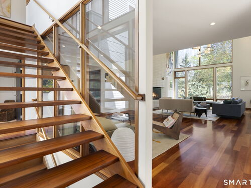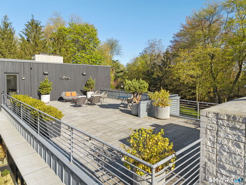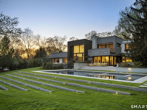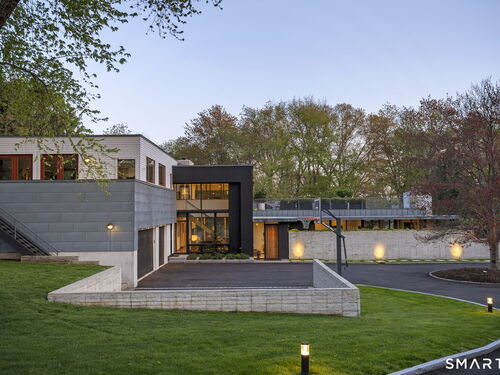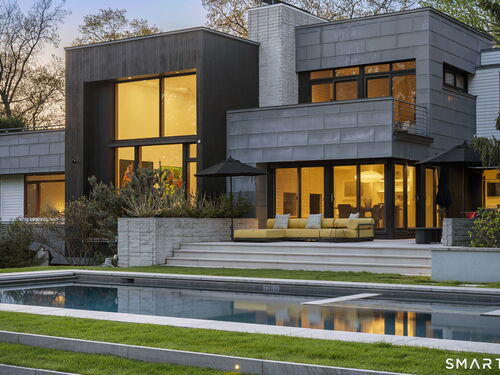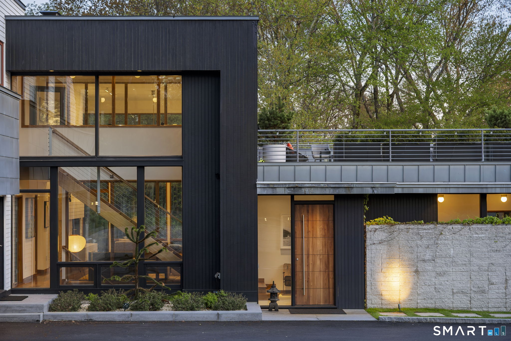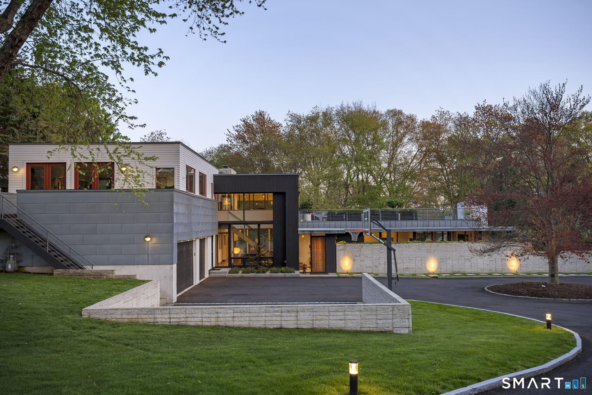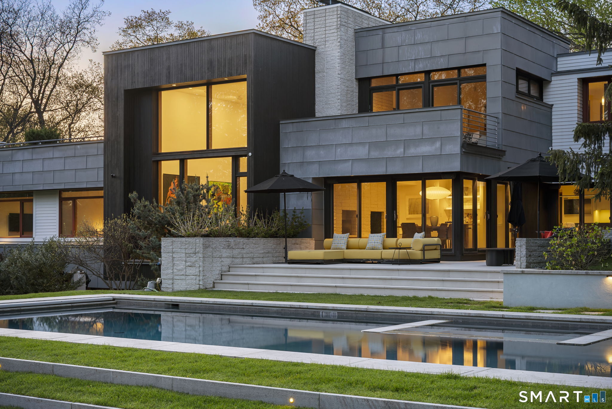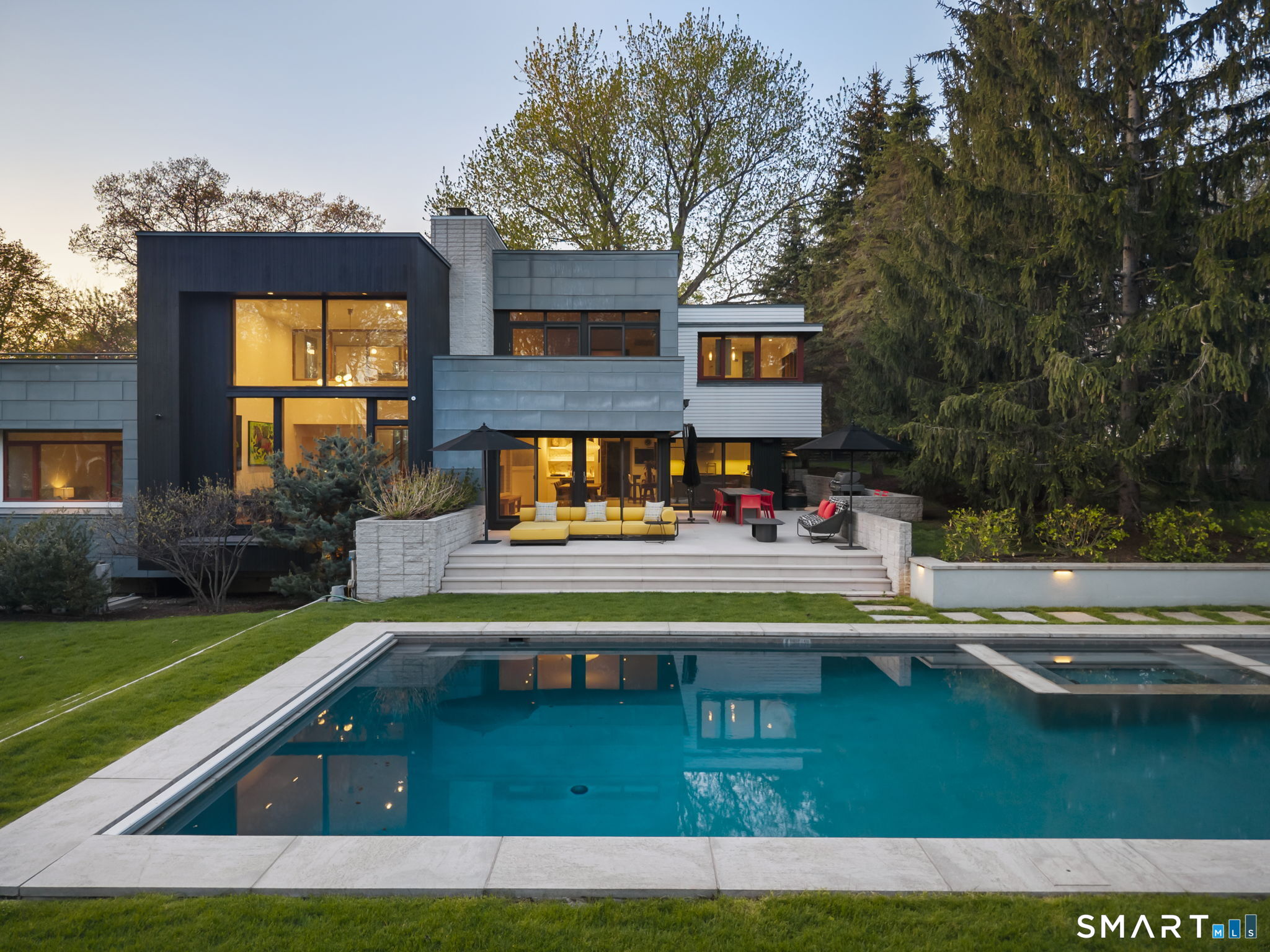 The Deck House, a true masterpiece of modern design, seamlessly blending architectural brilliance with the beauty of its natural surroundings and an incredible offering of outdoor living. Oversized windows invite natural light in and and frame the views of the surrounding landscape. Rich Mahogany finishes and natural stone surfaces create an organic aesthetic throughout. The main floor is designed with versatility in mind, offering bright, open-concept living and dining spaces perfect for gathering, along with a quieter wing with two bedrooms and a lounge. Upstairs, you'll find the luxurious primary suite with dressing room, sleek bath, corner fireplace and deck access, an additional en suite bedroom, a dedicated office, and a home gym. And then there's the outdoors-a true haven for both relaxation and recreation. Expansive decks on multiple layers, and a sparkling salt water pool set the stage for enjoying the company of family and friends, while the sport court adds extra fun. The professionally designed landscaping and lighting bring the spaces to another level. Located on a quiet cul-de-sac right in the center of town, this special home is close to town, schools, shopping and dining!