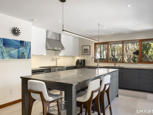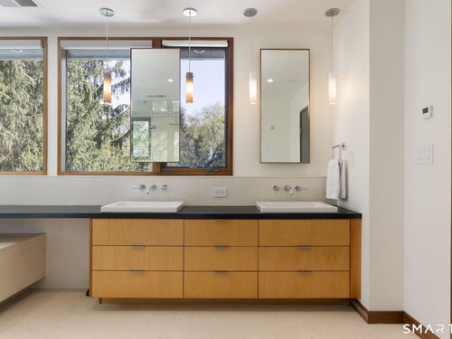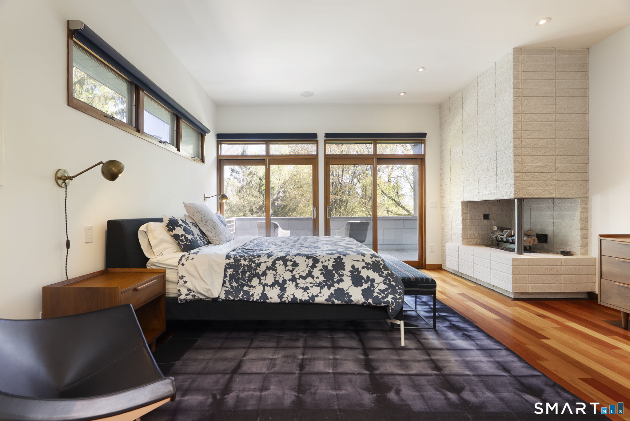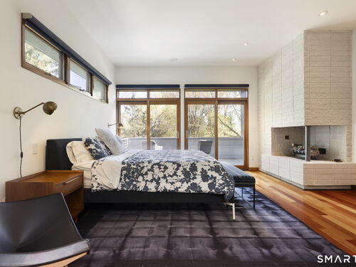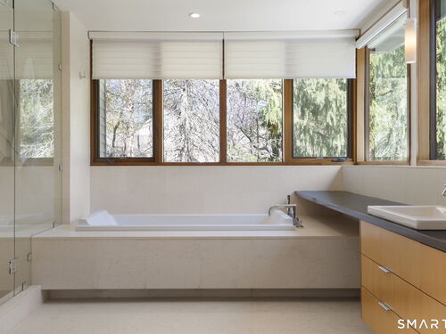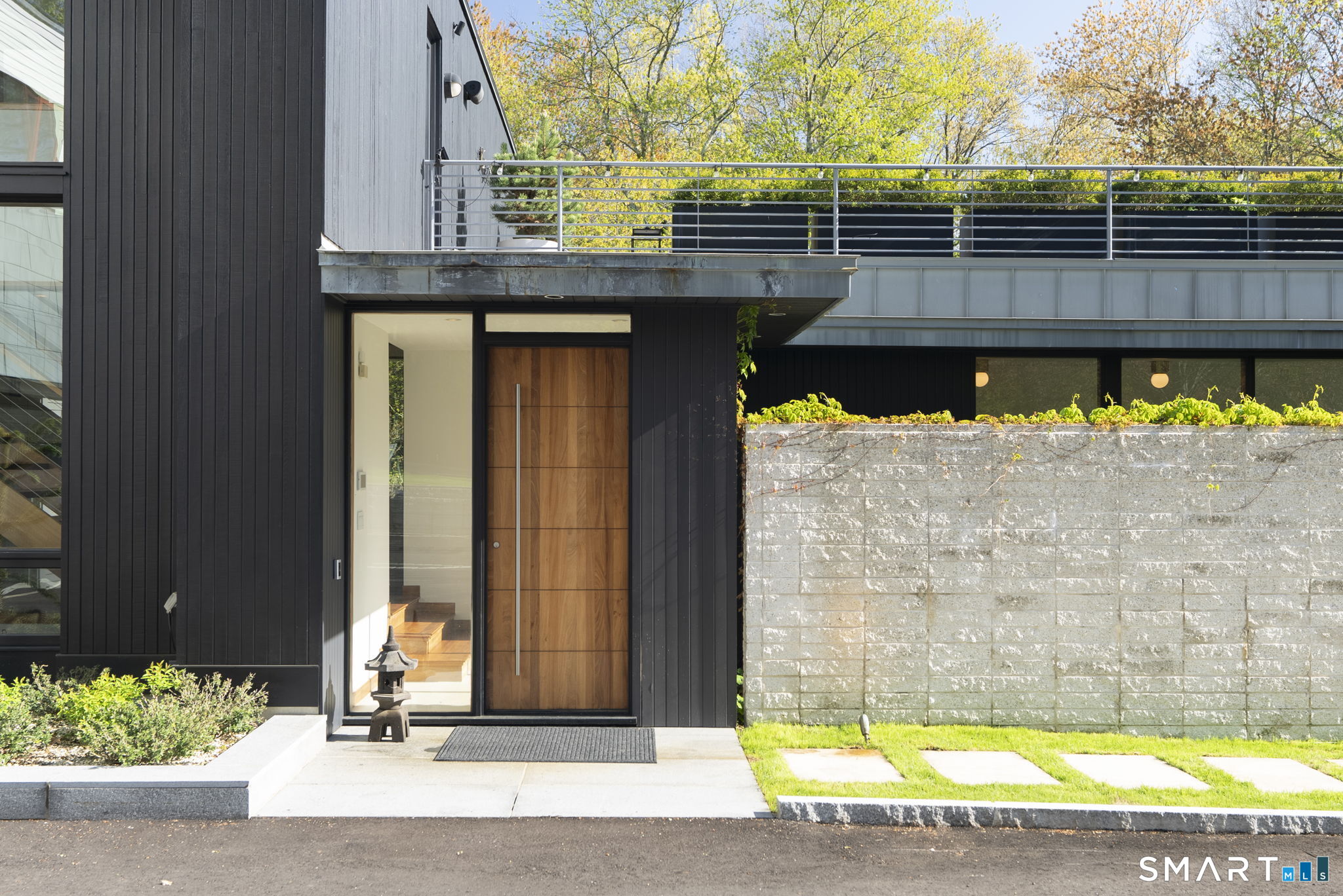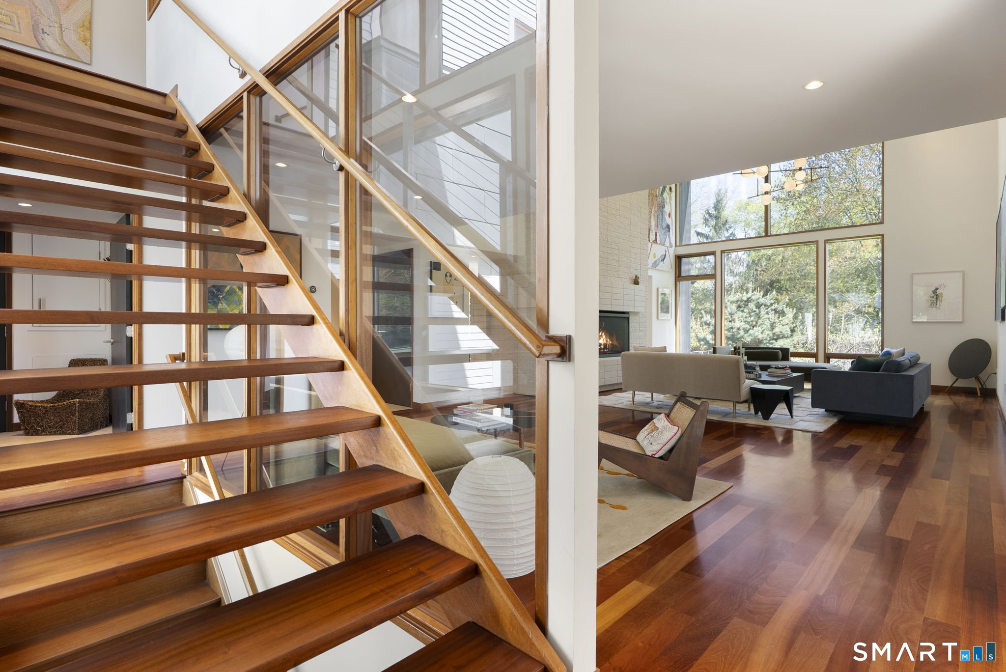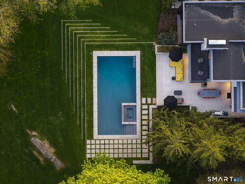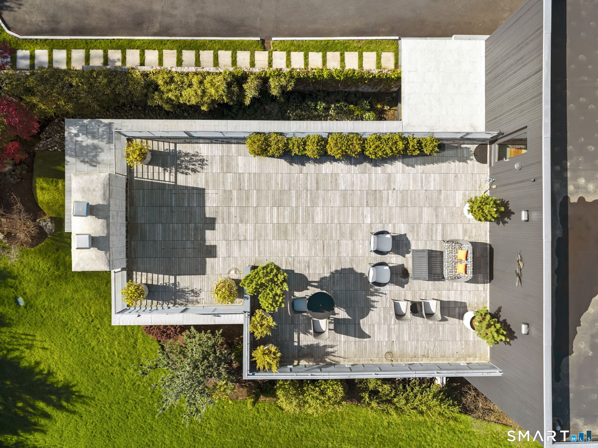 The Deck House, a true masterpiece of modern design, seamlessly blending architectural brilliance with the beauty of its natural surroundings and an incredible offering of outdoor living. Oversized windows invite natural light in and and frame the views of the surrounding landscape. Rich Mahogany finishes and natural stone surfaces create an organic aesthetic throughout. The main floor is designed with versatility in mind, offering bright, open-concept living and dining spaces perfect for gathering, along with a quieter wing with two bedrooms and a lounge. Upstairs, you'll find the luxurious primary suite with dressing room, sleek bath, corner fireplace and deck access, an additional en suite bedroom, a dedicated office, and a home gym. And then there's the outdoors-a true haven for both relaxation and recreation. Expansive decks on multiple layers, and a sparkling salt water pool set the stage for enjoying the company of family and friends, while the sport court adds extra fun. The professionally designed landscaping and lighting bring the spaces to another level. Located on a quiet cul-de-sac right in the center of town, this special home is close to town, schools, shopping and dining!