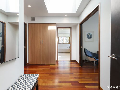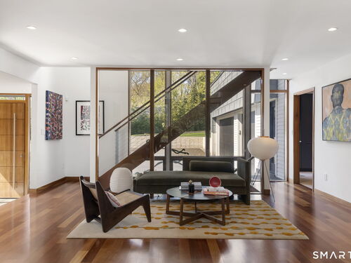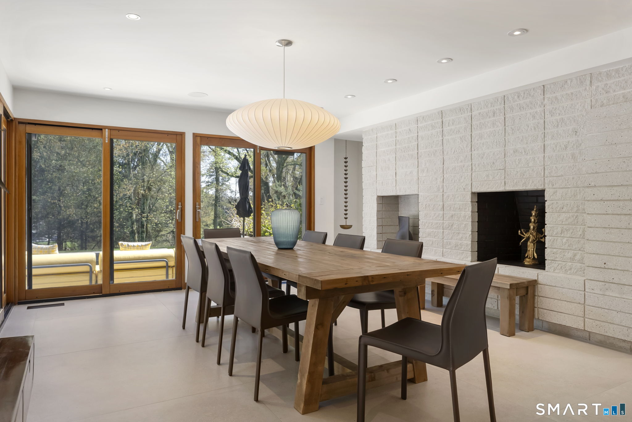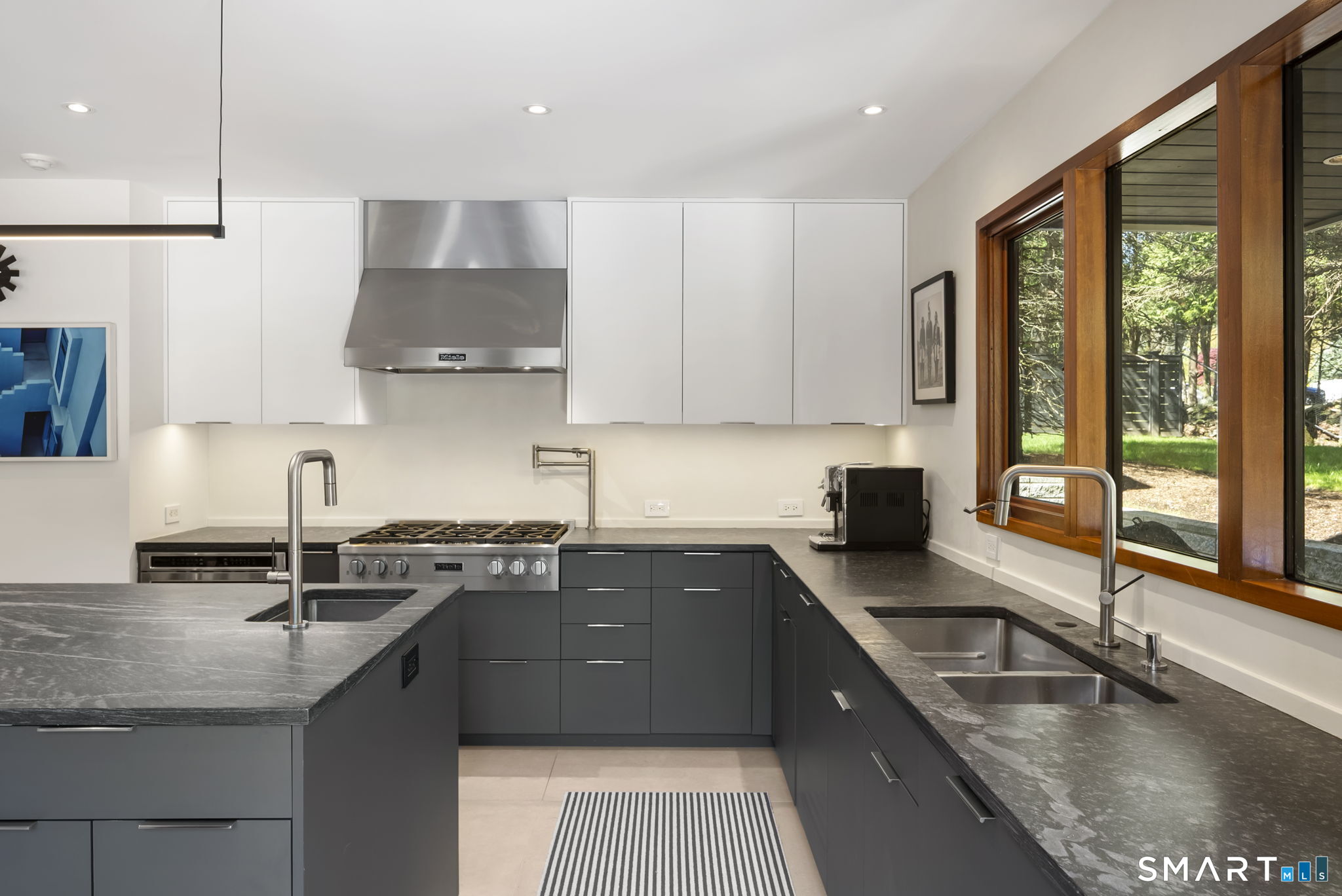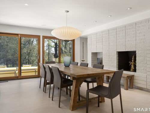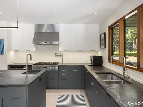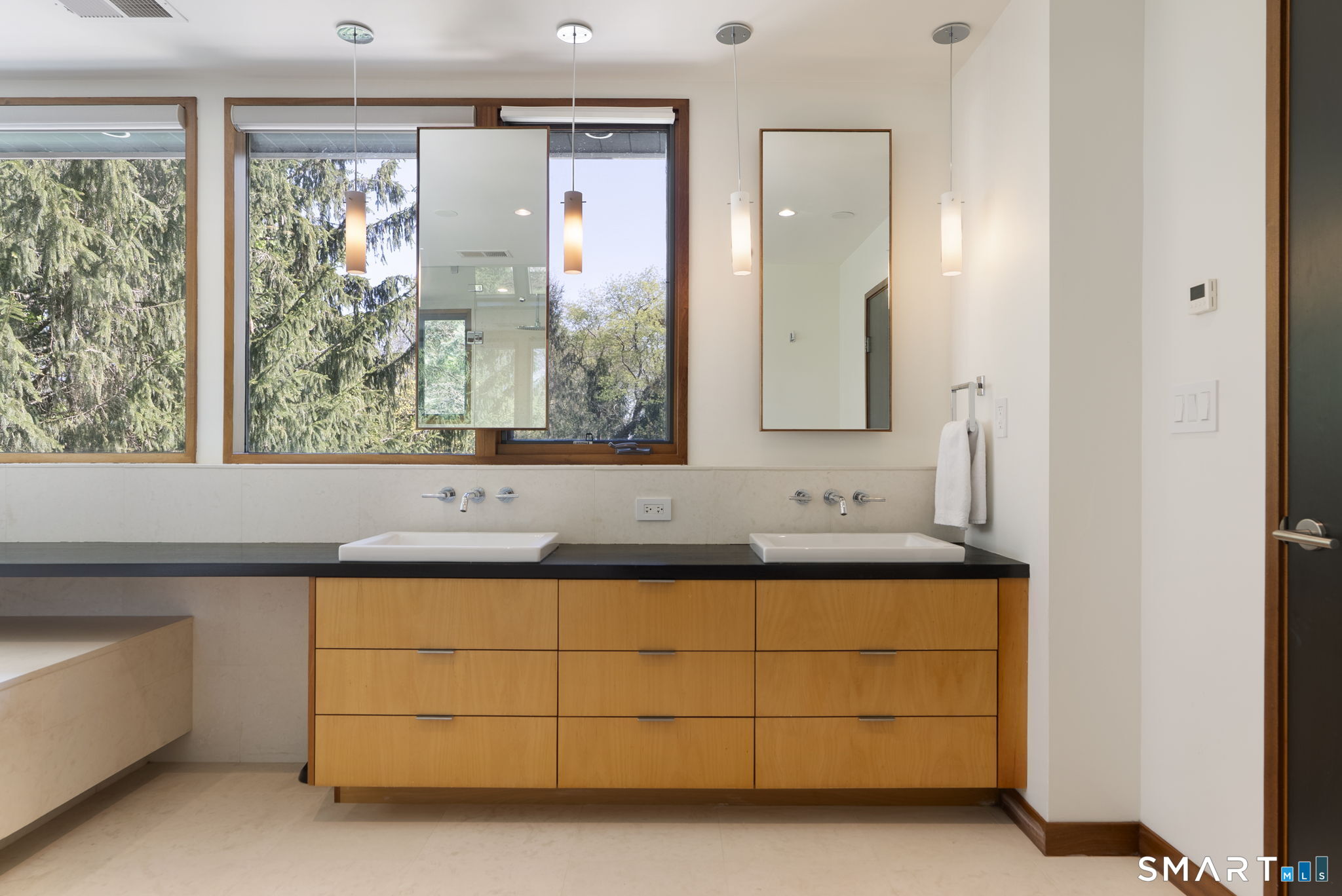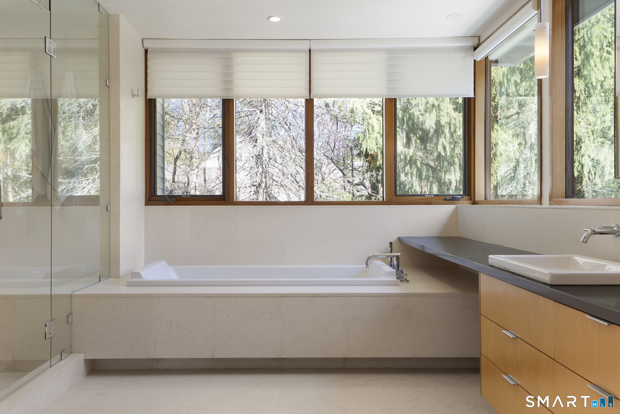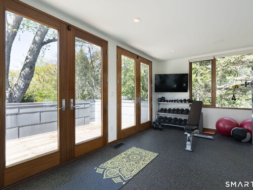 The Deck House, a true masterpiece of modern design, seamlessly blending architectural brilliance with the beauty of its natural surroundings and an incredible offering of outdoor living. Oversized windows invite natural light in and and frame the views of the surrounding landscape. Rich Mahogany finishes and natural stone surfaces create an organic aesthetic throughout. The main floor is designed with versatility in mind, offering bright, open-concept living and dining spaces perfect for gathering, along with a quieter wing with two bedrooms and a lounge. Upstairs, you'll find the luxurious primary suite with dressing room, sleek bath, corner fireplace and deck access, an additional en suite bedroom, a dedicated office, and a home gym. And then there's the outdoors-a true haven for both relaxation and recreation. Expansive decks on multiple layers, and a sparkling salt water pool set the stage for enjoying the company of family and friends, while the sport court adds extra fun. The professionally designed landscaping and lighting bring the spaces to another level. Located on a quiet cul-de-sac right in the center of town, this special home is close to town, schools, shopping and dining!
