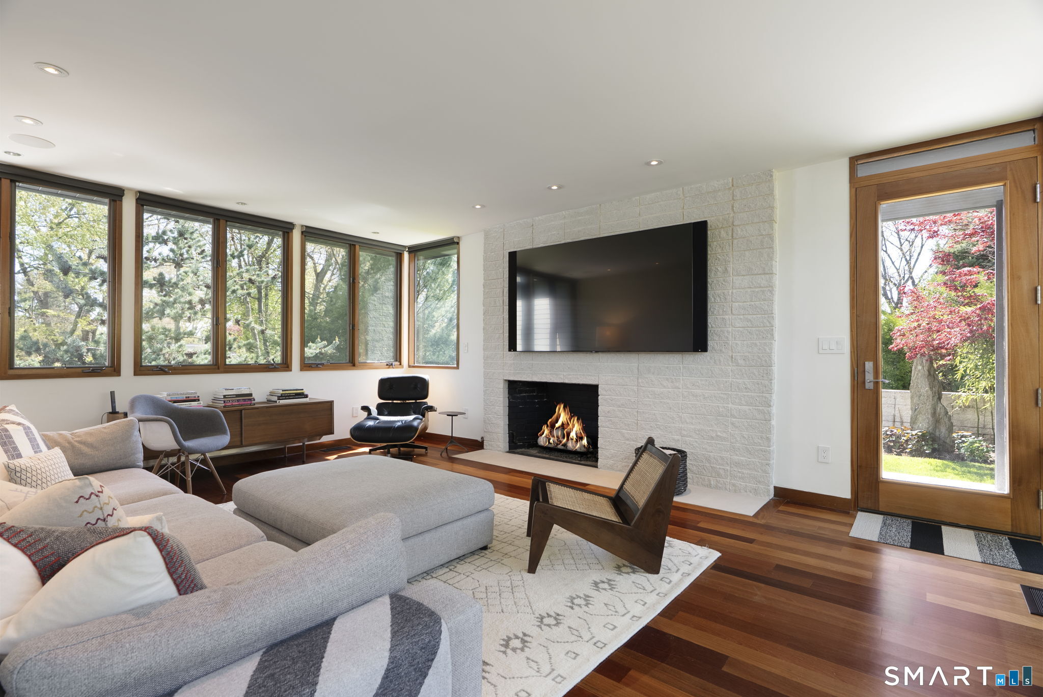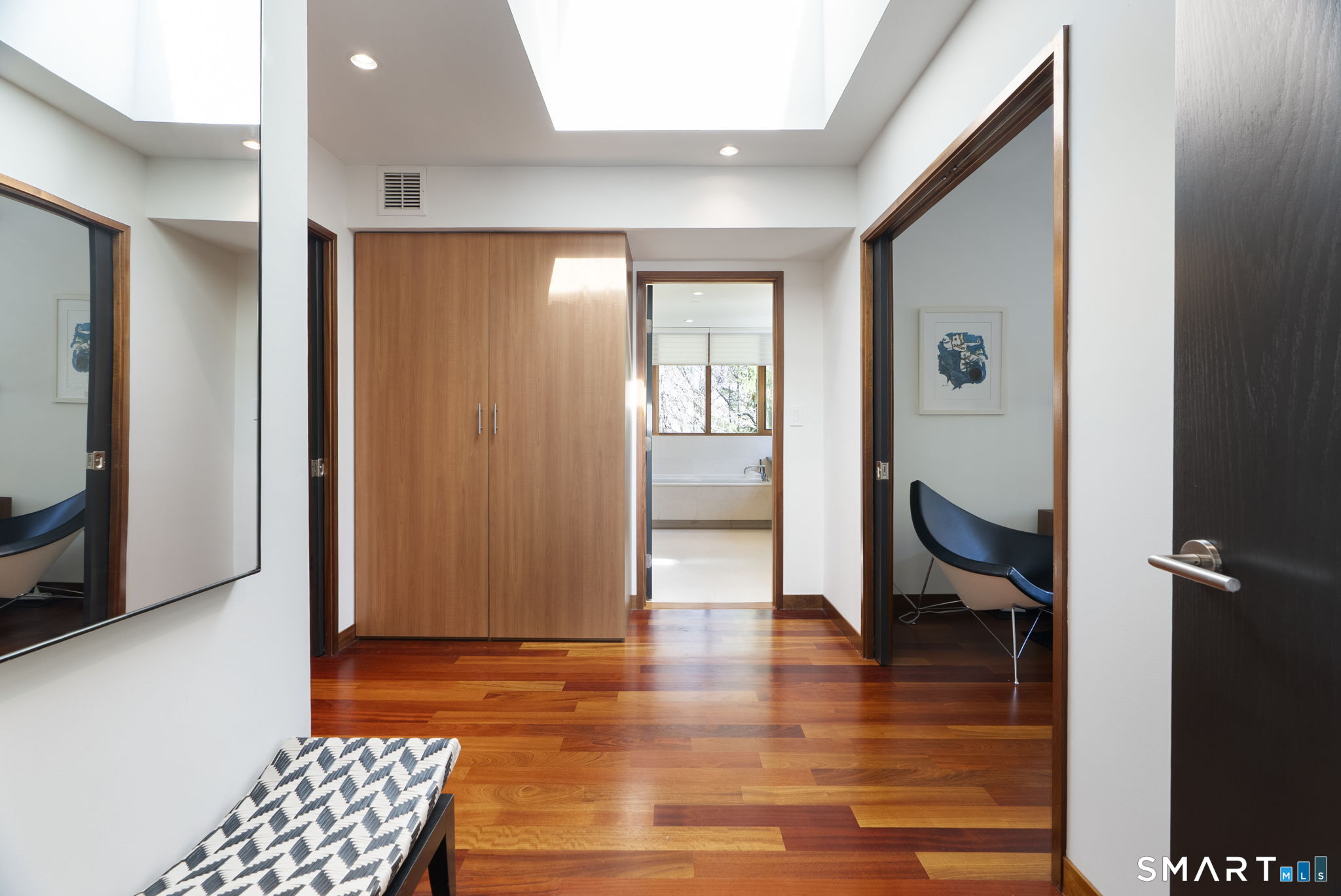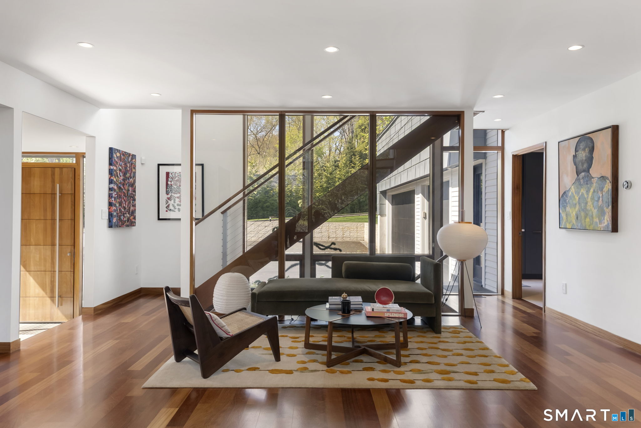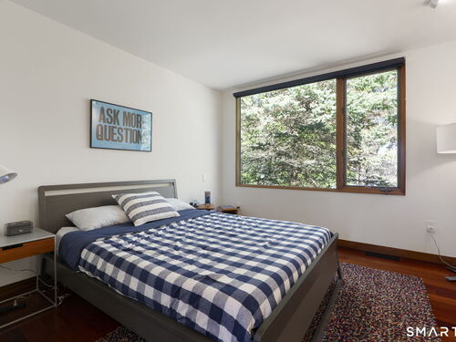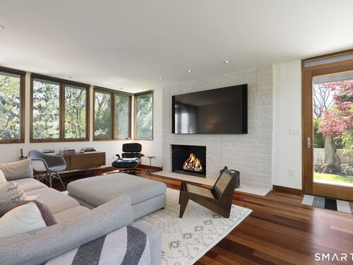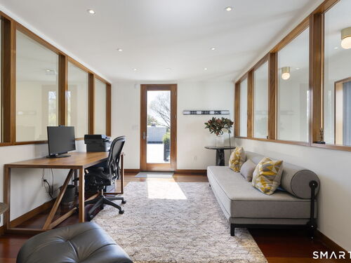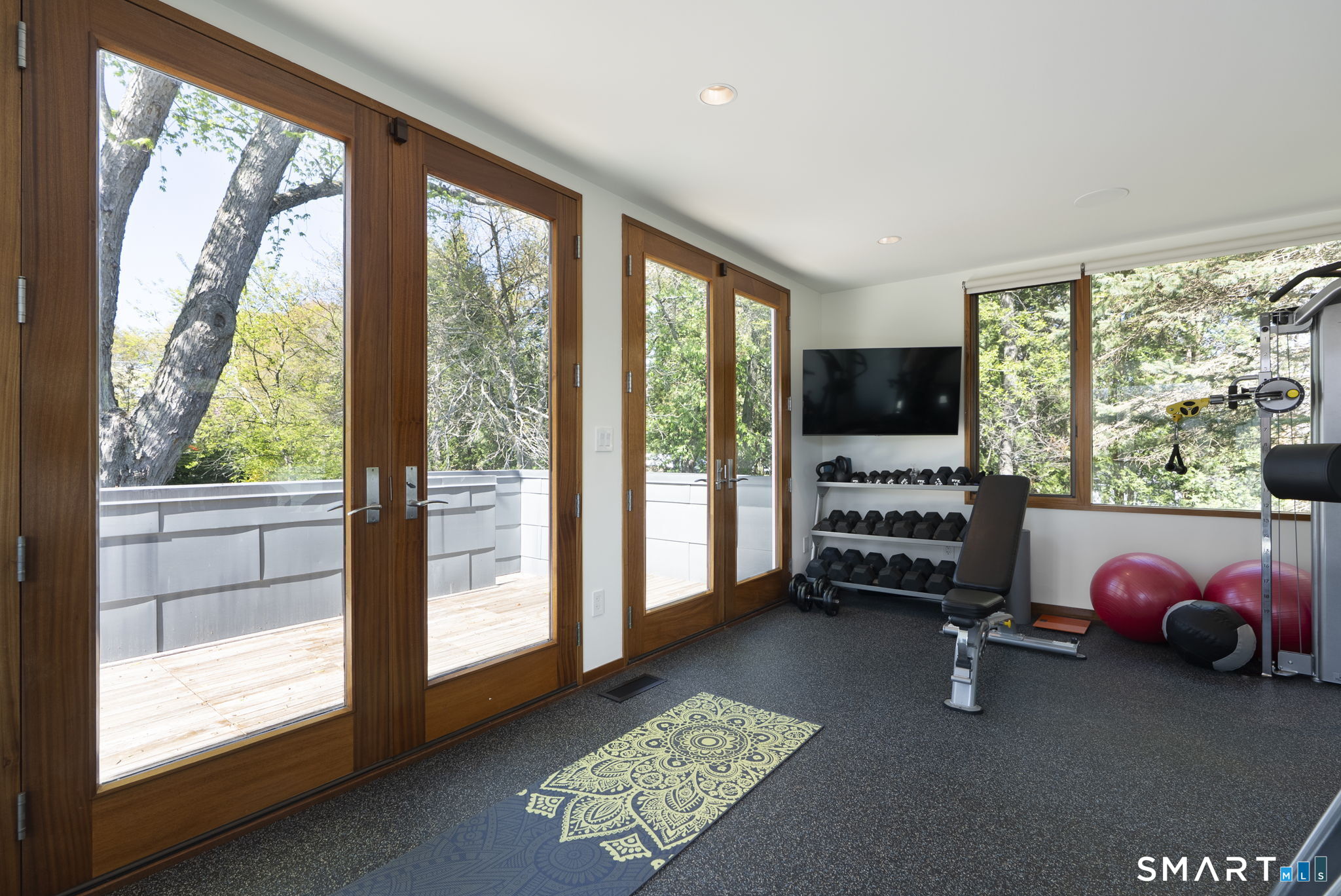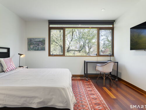 The Deck House, a true masterpiece of modern design, seamlessly blending architectural brilliance with the beauty of its natural surroundings and an incredible offering of outdoor living. Oversized windows invite natural light in and and frame the views of the surrounding landscape. Rich Mahogany finishes and natural stone surfaces create an organic aesthetic throughout. The main floor is designed with versatility in mind, offering bright, open-concept living and dining spaces perfect for gathering, along with a quieter wing with two bedrooms and a lounge. Upstairs, you'll find the luxurious primary suite with dressing room, sleek bath, corner fireplace and deck access, an additional en suite bedroom, a dedicated office, and a home gym. And then there's the outdoors-a true haven for both relaxation and recreation. Expansive decks on multiple layers, and a sparkling salt water pool set the stage for enjoying the company of family and friends, while the sport court adds extra fun. The professionally designed landscaping and lighting bring the spaces to another level. Located on a quiet cul-de-sac right in the center of town, this special home is close to town, schools, shopping and dining!