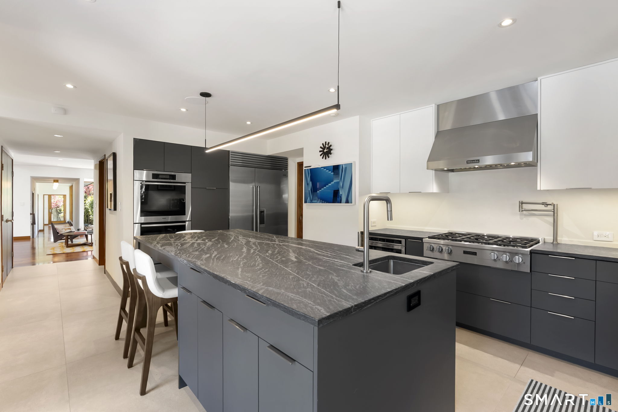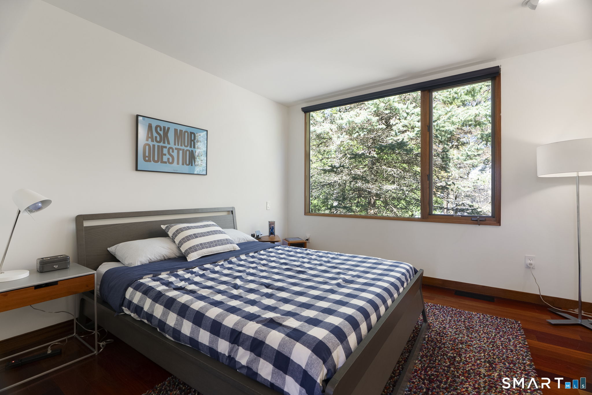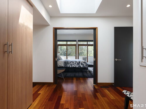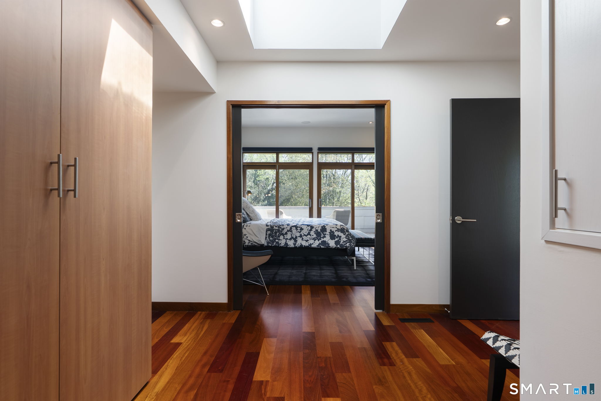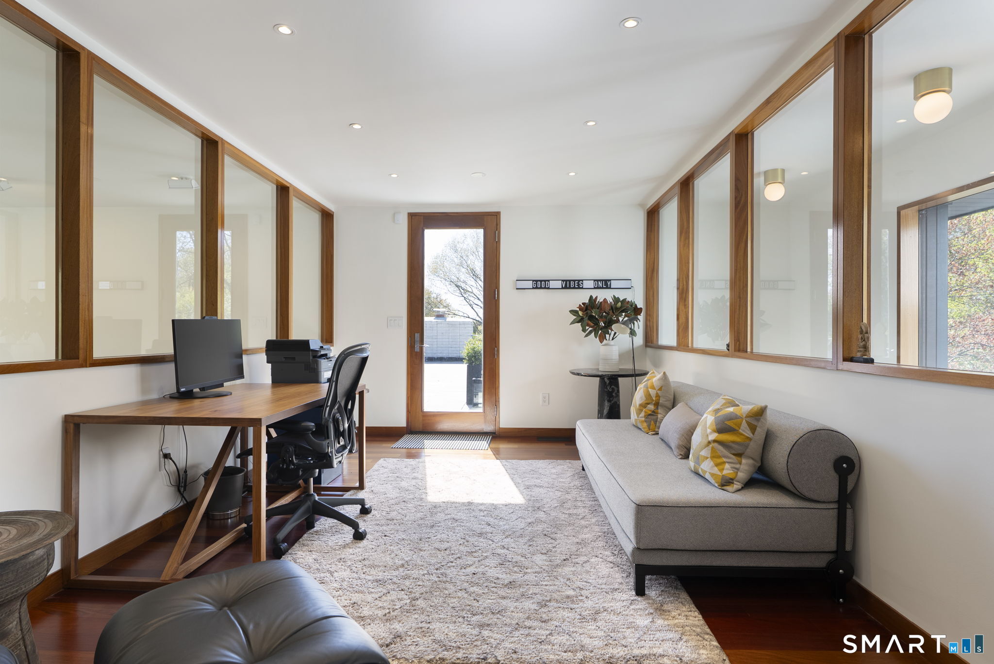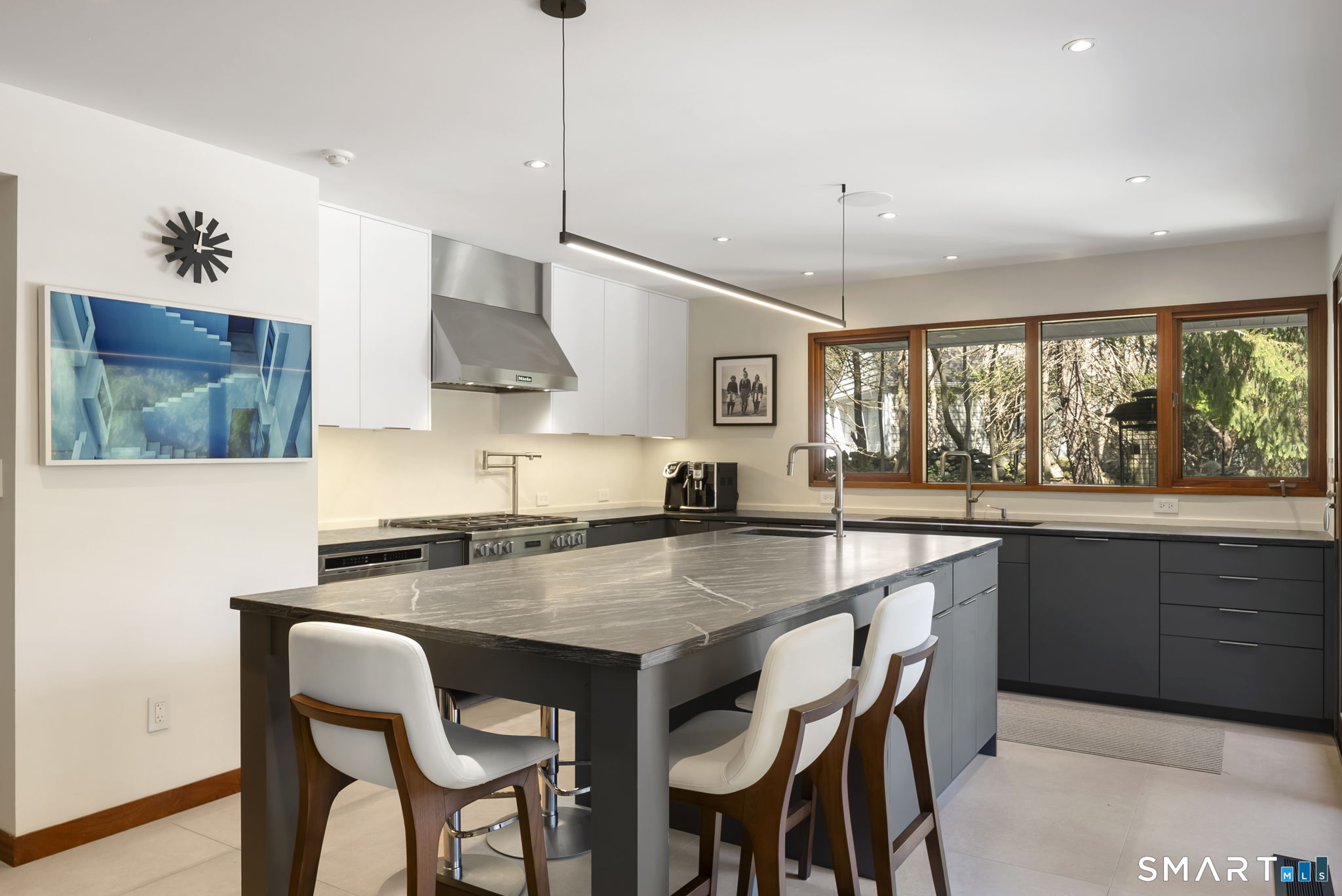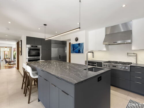 The Deck House, a true masterpiece of modern design, seamlessly blending architectural brilliance with the beauty of its natural surroundings and an incredible offering of outdoor living. Oversized windows invite natural light in and and frame the views of the surrounding landscape. Rich Mahogany finishes and natural stone surfaces create an organic aesthetic throughout. The main floor is designed with versatility in mind, offering bright, open-concept living and dining spaces perfect for gathering, along with a quieter wing with two bedrooms and a lounge. Upstairs, you'll find the luxurious primary suite with dressing room, sleek bath, corner fireplace and deck access, an additional en suite bedroom, a dedicated office, and a home gym. And then there's the outdoors-a true haven for both relaxation and recreation. Expansive decks on multiple layers, and a sparkling salt water pool set the stage for enjoying the company of family and friends, while the sport court adds extra fun. The professionally designed landscaping and lighting bring the spaces to another level. Located on a quiet cul-de-sac right in the center of town, this special home is close to town, schools, shopping and dining!