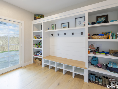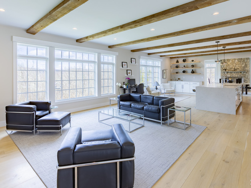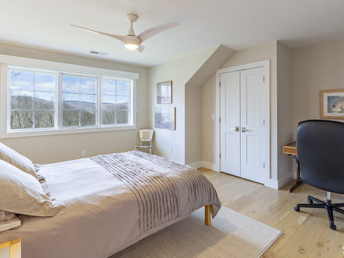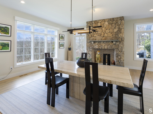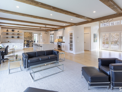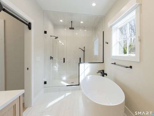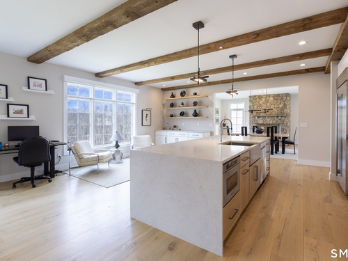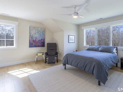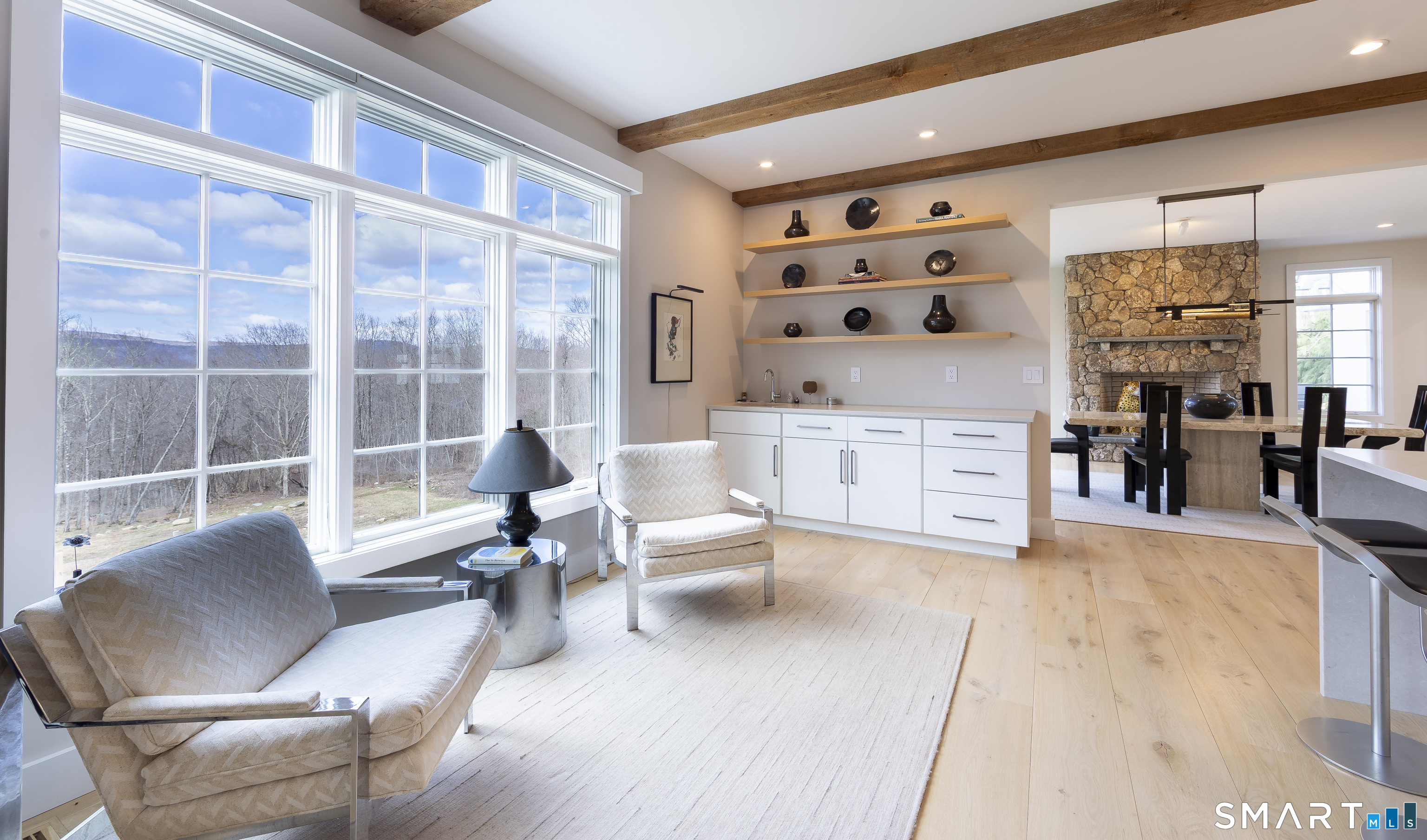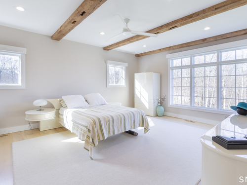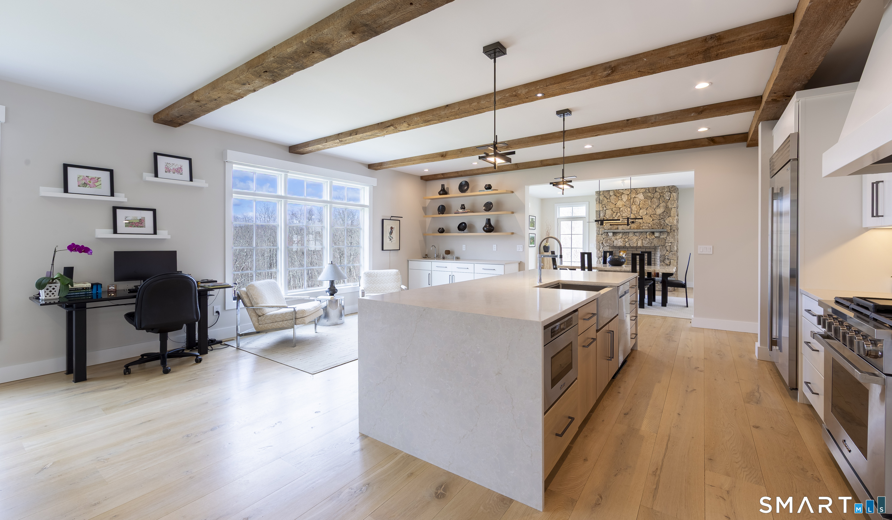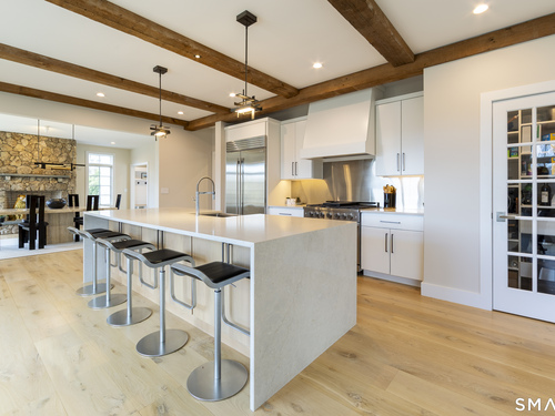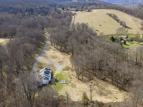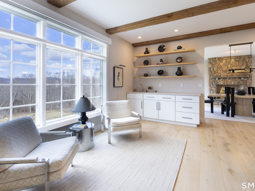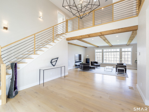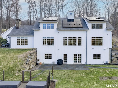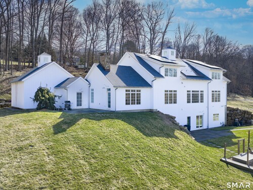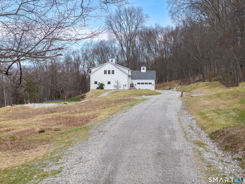 A striking blend of modern design and timeless barn-inspired architecture, this exceptional 4,250 SF home sits privately on 12.77 acres and offers a rare sense of space, light, and tranquility. Built in 2022, the residence still feels brand new, with 5 BD, 4 BA, and 1 half bath over 3 levels, including a legal accessory apartment. A dramatic two-story foyer sets the tone, showcasing a split staircase w/sleek stainless-steel cabling and an open balcony above. The ML is defined by soaring 9-foot ceilings, reclaimed wood beams, wide-plank white oak floors, and expansive windows and doors that invite natural light into every corner. The open-concept design seamlessly connects the great room to a chef's kitchen outfitted w/premium stainless-steel appliances, a waterfall island & bright breakfast area. The adjoining dining room, anchored by a floor-to-ceiling stone fireplace and access to a side patio, offers flexibility as either a formal gathering space or a relaxed family room. A music room w/tray ceiling provides an ideal setting for a home office or formal dining space. 1st floor primary suite is a private retreat, complete with dual walk-in closets and a spa-like bath featuring a soaking tub and walk-in shower. A powder room & expansive mudroom w/custom cabinetry connect effortlessly to the attached two-car garage, crowned w/a classic cupola. The UL continues to impress with a well-balanced layout. BDRM#2 enjoys an ensuite bath, while BDRMS #3 and #4 share a full BA.