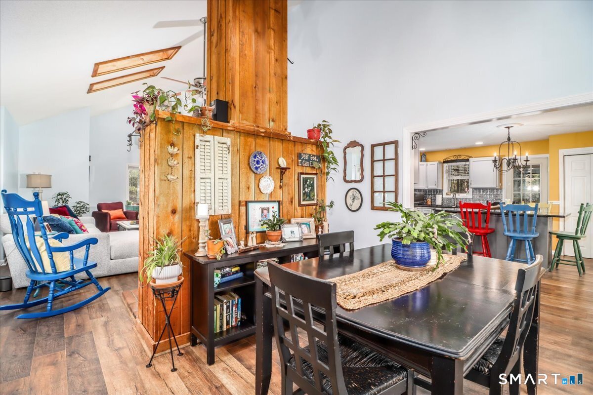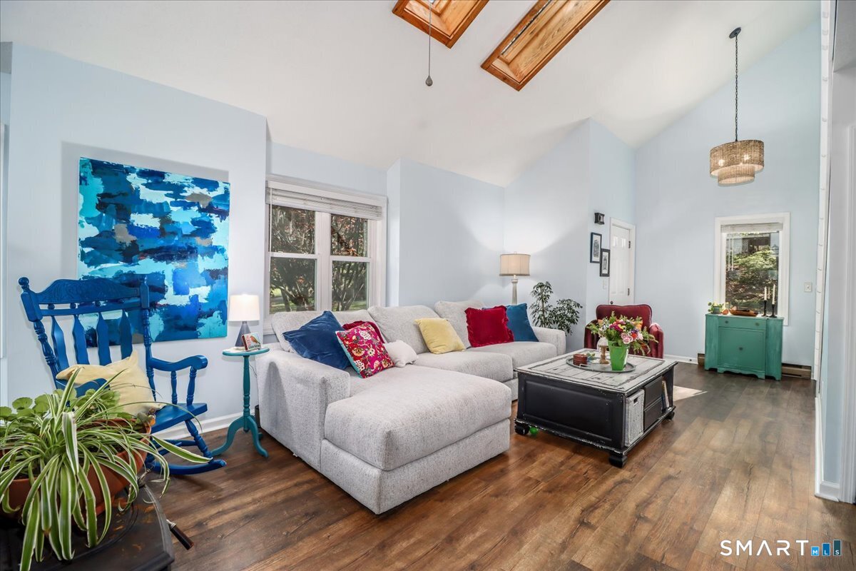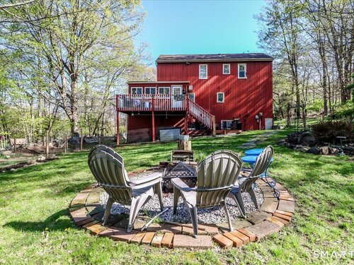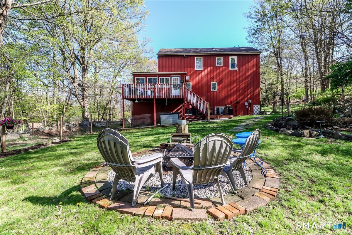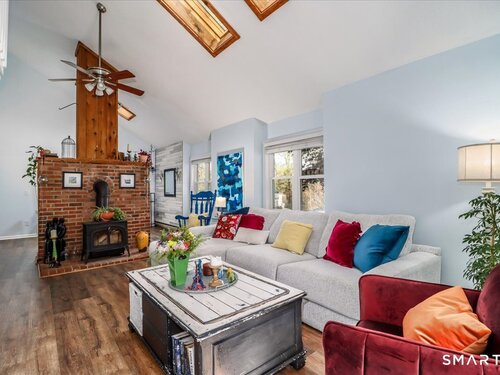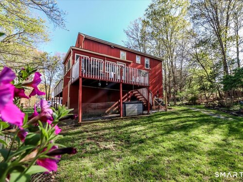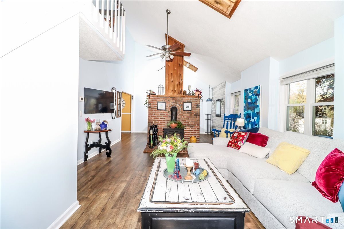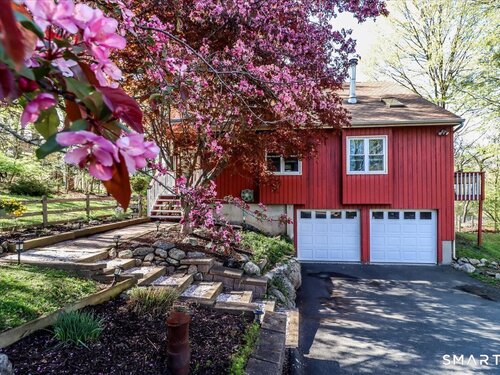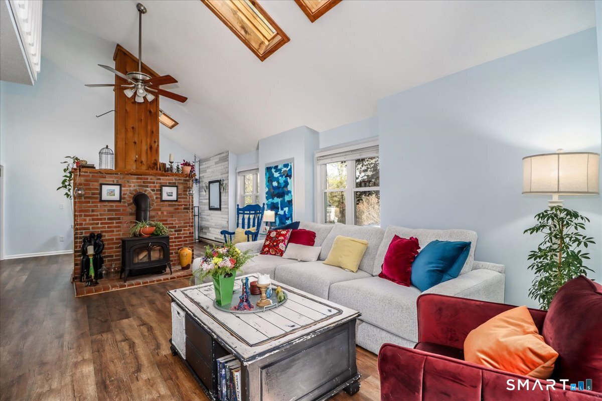 This custom contemporary home offers a highly sought-after open-floor plan, designed for both comfort and style. Featuring vaulted ceilings and skylights, the interior is filled with natural light, complemented by updated flooring. A charming brick wall with woodstove creates a warm and inviting focal point on the main level. A nice feature to the home is the main level bedroom. The spacious upper-level bedrooms provide ample room for relaxation, A sunroom adds additional living space, perfect for year-round enjoyment, and the finished lower level offers endless possibilities-ideal for a home office, gym, or entertainment area. This home is embraced by lovely gardens and set on a level, private yard in a peaceful, serene setting at the end of the street , and just moments from Candlewood Lake. Enjoy outdoor living with wraparound decking and the convenience of a two-car garage.