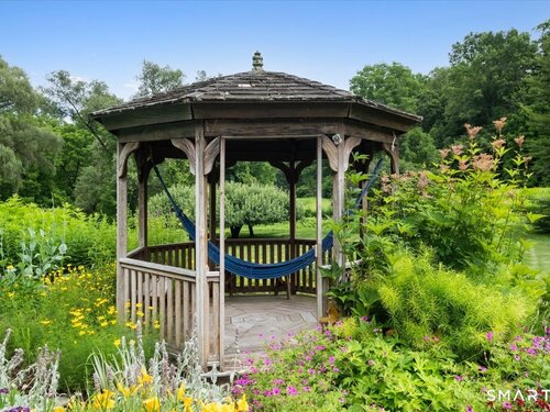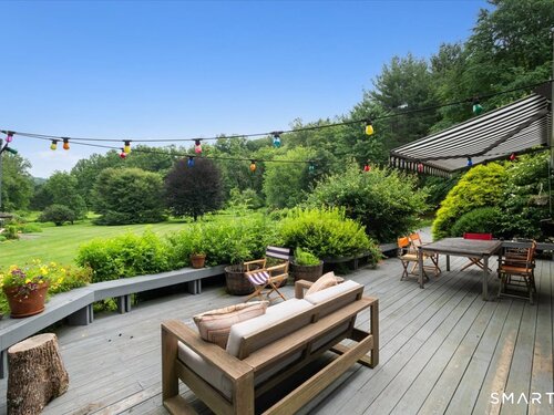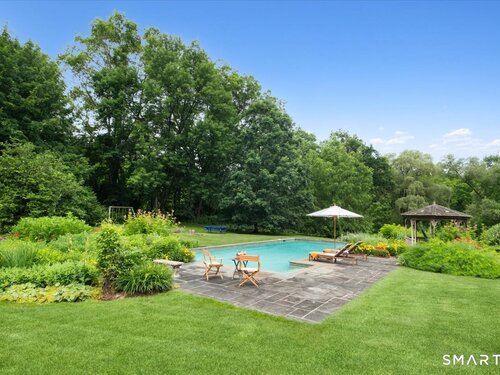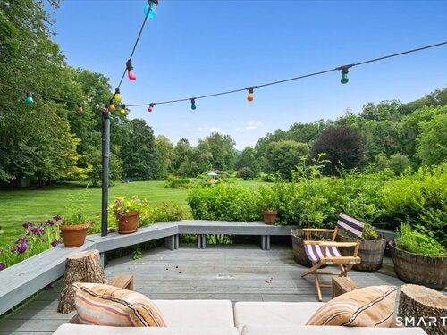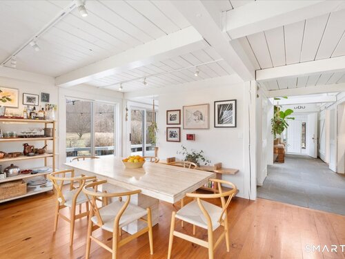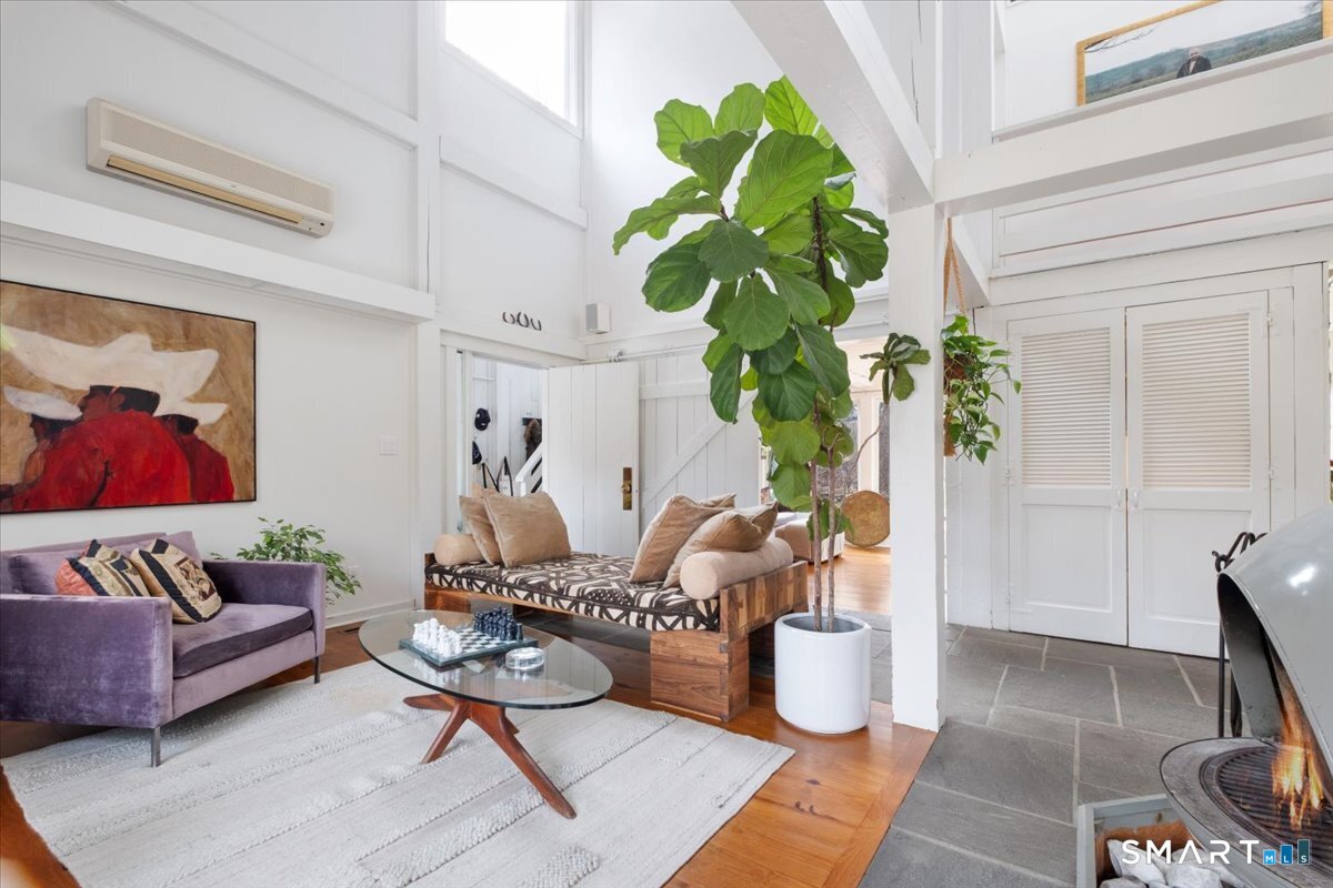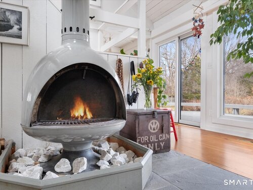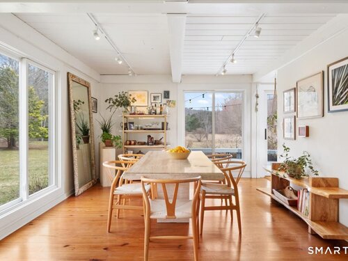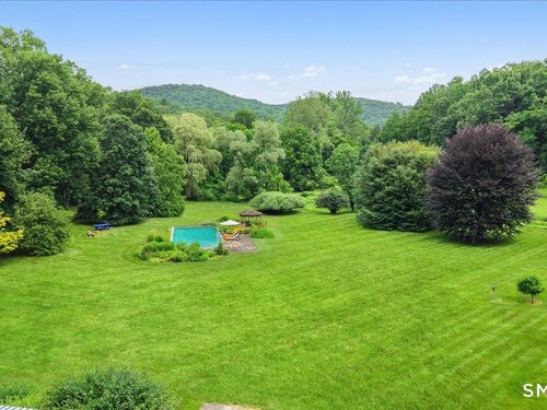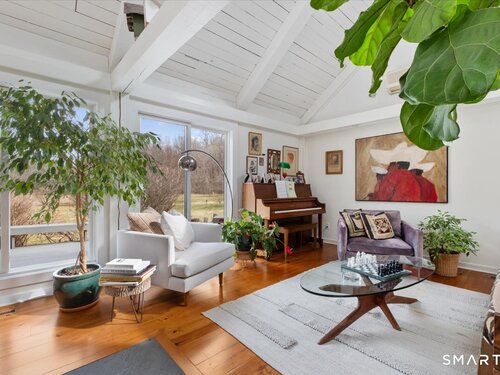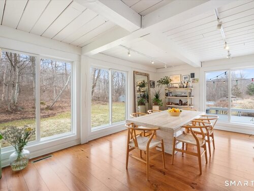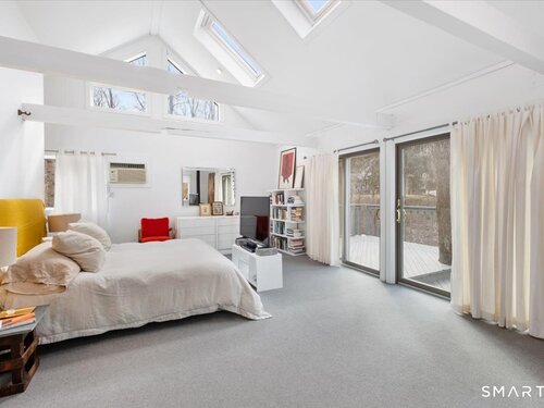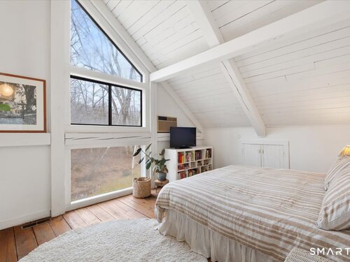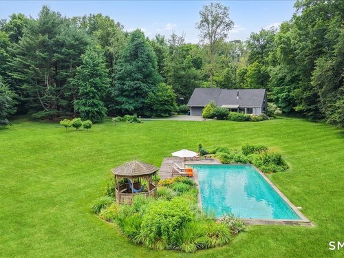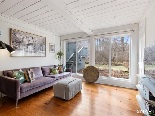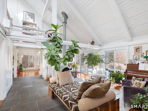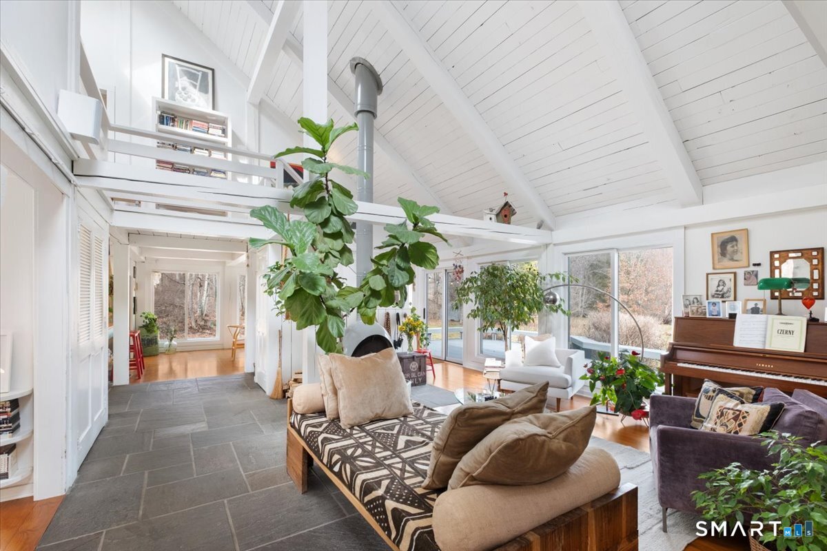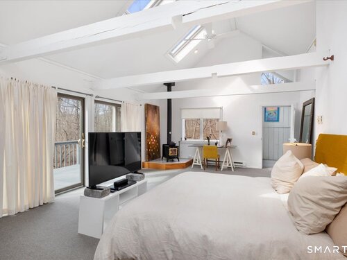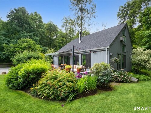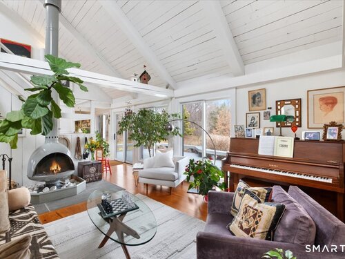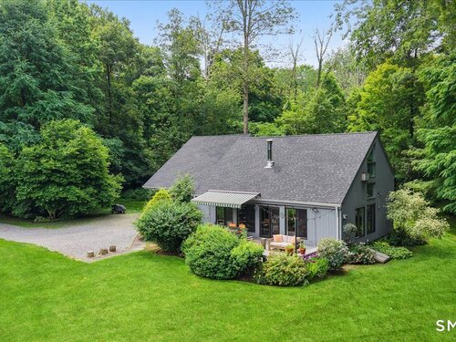 Welcome to 7 Anderson Hill Rd - a serene retreat set on over 7 acres of beautifully landscaped grounds, featuring specimen trees and vibrant perennial gardens that create a true sense of peace and privacy. A charming stone gravel driveway leads you to this stunning contemporary home offering 3 bedrooms, 2.5 baths, and a detached, heated 2-car garage. Inside, the dramatic two-story living room makes an immediate impression with its soaring ceilings, freestanding fireplace, and expansive walls of windows that flood the space with natural light. The cozy den provides the perfect spot to relax with a book or enjoy your favorite shows. The open-concept kitchen flows seamlessly into the dining and living areas, making entertaining effortless. It features granite countertops, slate floors, a double wall oven, electric cooktop, dishwasher, and abundant windows that add warmth and character. The dining room, with its wide-plank hardwood floors and wall of windows, is ideal for hosting or simply enjoying your morning coffee while overlooking the scenic property. Upstairs, you'll find two generously sized bedrooms, an oversized walk-in closet, and a shared full bath. The private primary suite is thoughtfully set apart, offering its own fireplace, a large walk-in closet, full bath, and a tranquil private deck nestled among the trees-perfect for starting your day in nature. The finished basement provides valuable additional living space and includes a California walk-in closet.