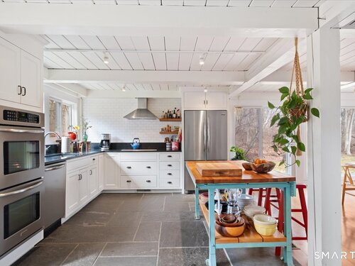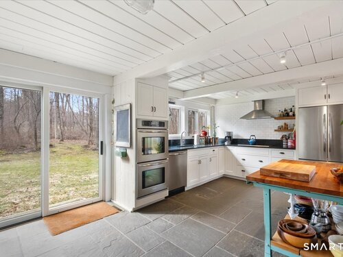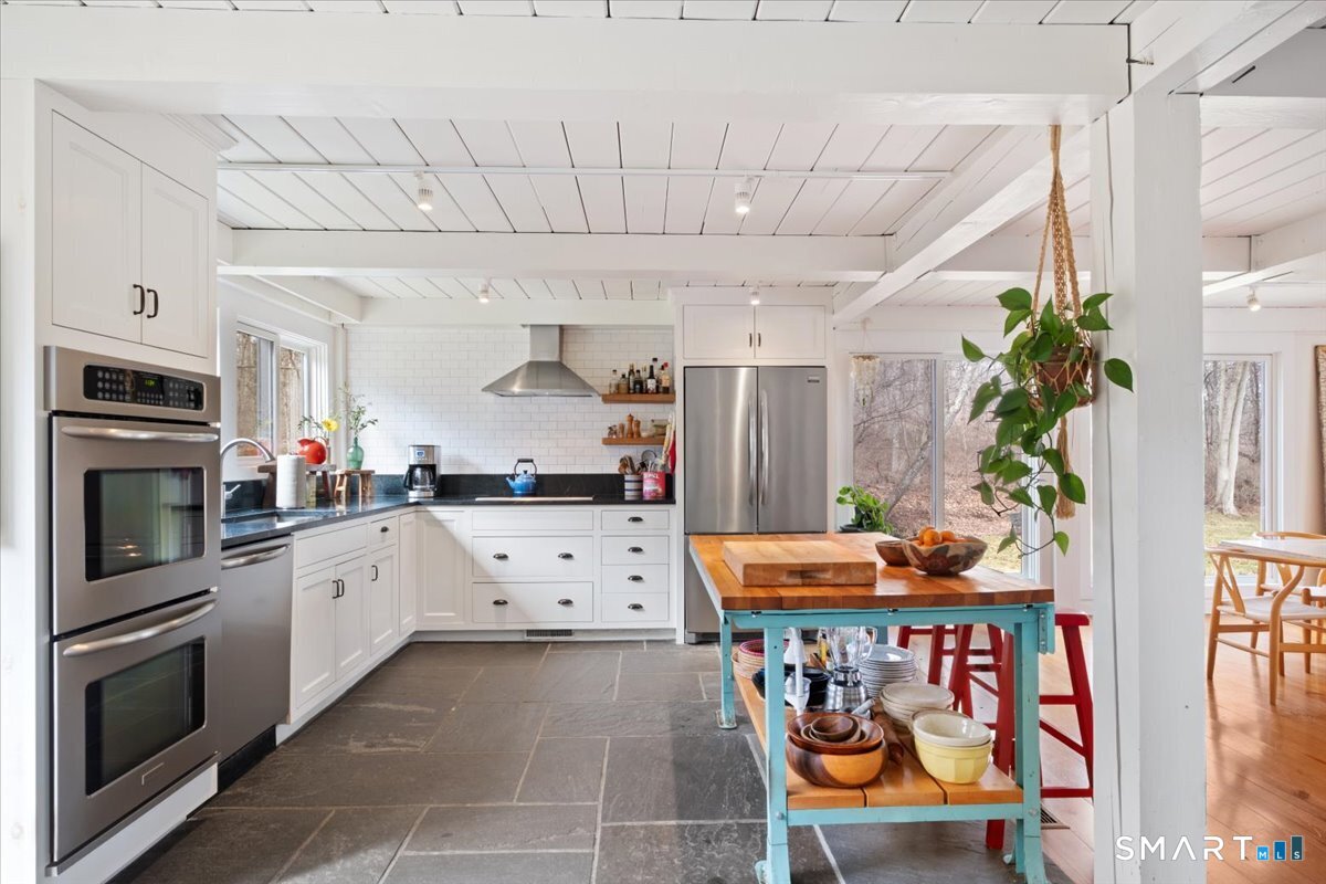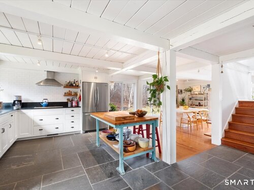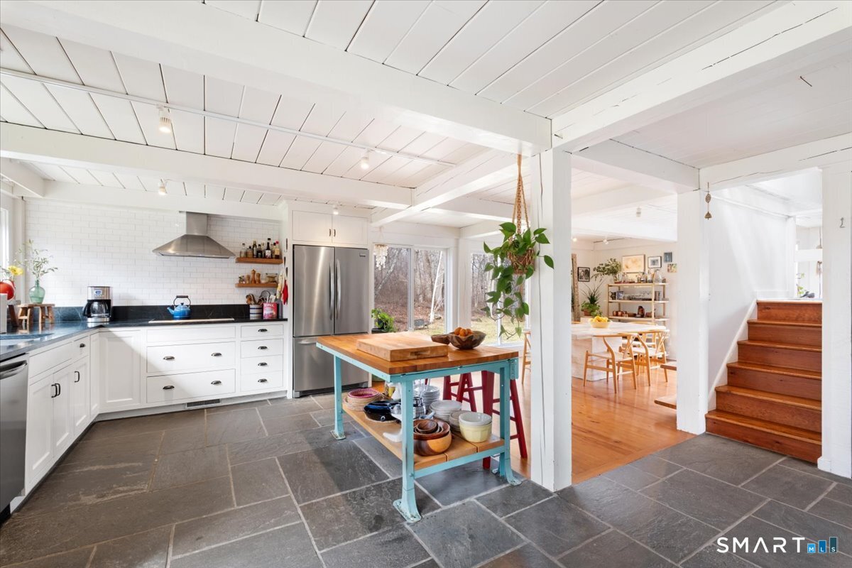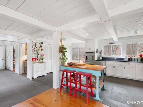Kitchen (Main Level)Beams, Breakfast Bar, Island, Pantry, Sliders, Slate Floor