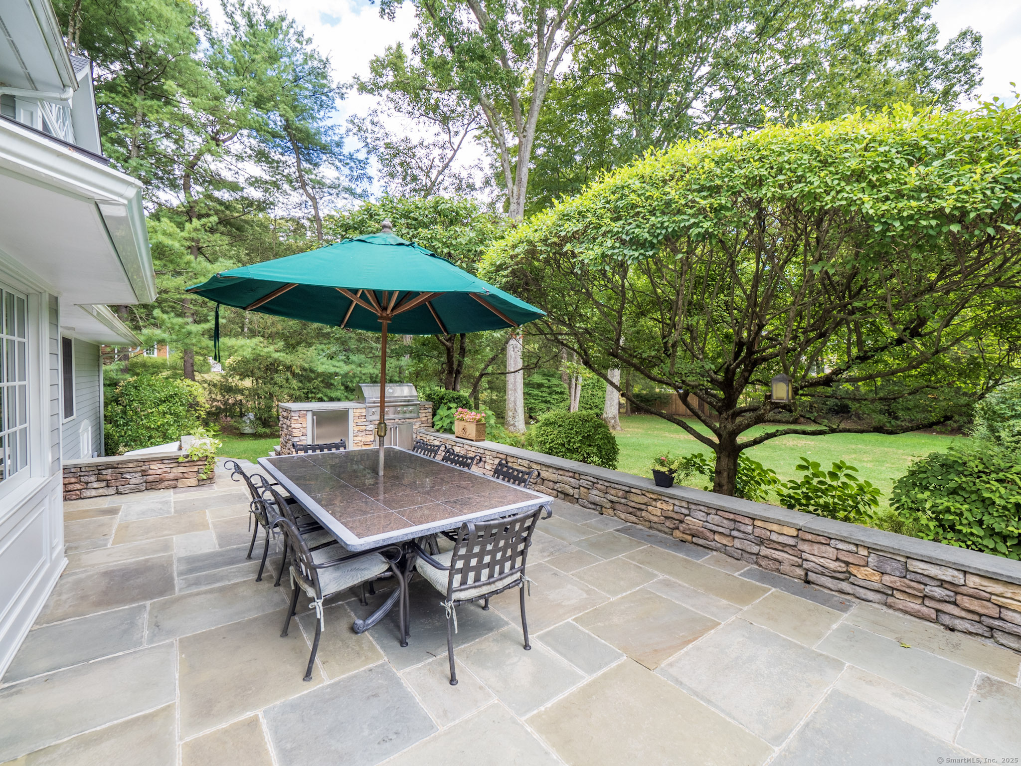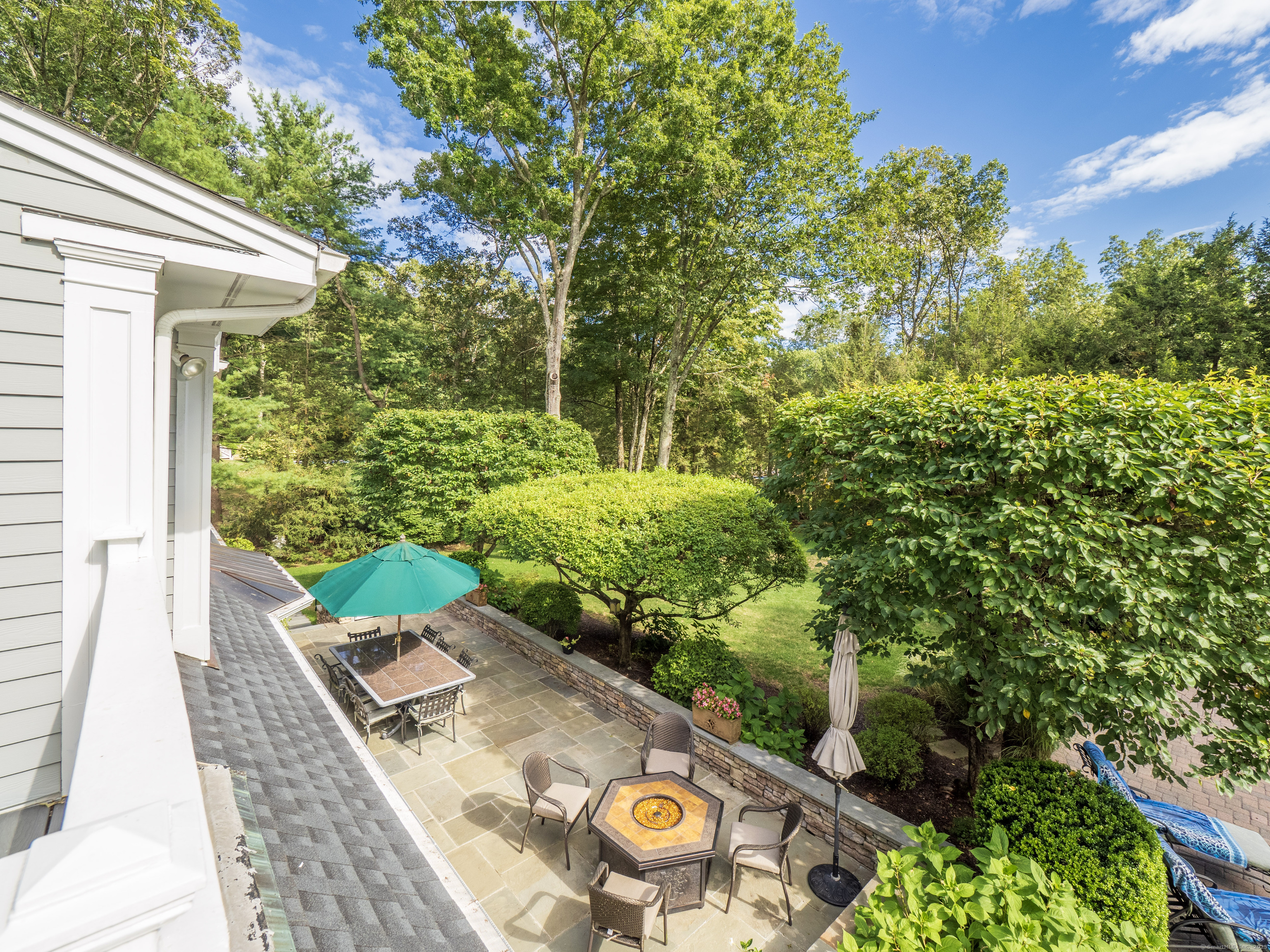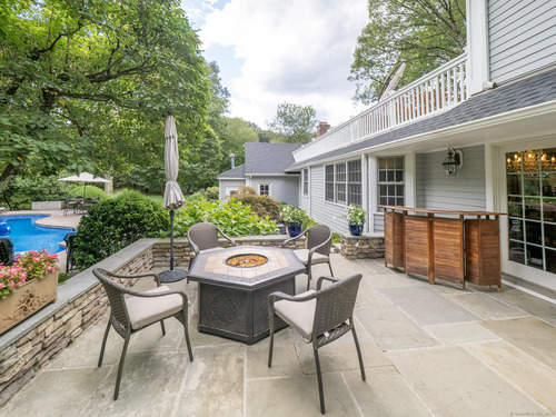 Welcome to 9 Singing Woods Road, a stunning Silvermine 4-5 bedroom home where lush grounds, elegant interiors, and a resort-style pool create the perfect retreat. Set on a professionally landscaped acre, enjoy a heated in-ground gunite pool and open-concept living designed for both relaxation and entertaining. Inside, host elegant dinner parties in the formal dining room. The living room invites conversation, and the family room is a perfect place to relax. The inviting eat-in kitchen boasts stone countertops and radiant heated floors. A sunroom with French doors overlooks the pool, while a massive stone patio with built-in grill and refrigerator sets the stage for effortless outdoor living. An integrated audio system carries music inside and out. Upstairs, the private primary suite spans the entire level with a spacious bedroom, walk-in closet, and spa-inspired bath featuring a jetted tub, oversized glass shower, and radiant heated floors. A full-size office-equal in scale to the bedroom-opens to a rooftop deck with views of the pool and backyard. Additional highlights include two fireplaces, a large finished basement, and an expanded three-car garage (two in tandem). Freshly painted and meticulously maintained, the home offers Hardie board siding, a new roof, and public water. Just a short stroll from GrayBarns, minutes to both I-95 and Merritt, this exceptional residence blends timeless style with modern comfort.