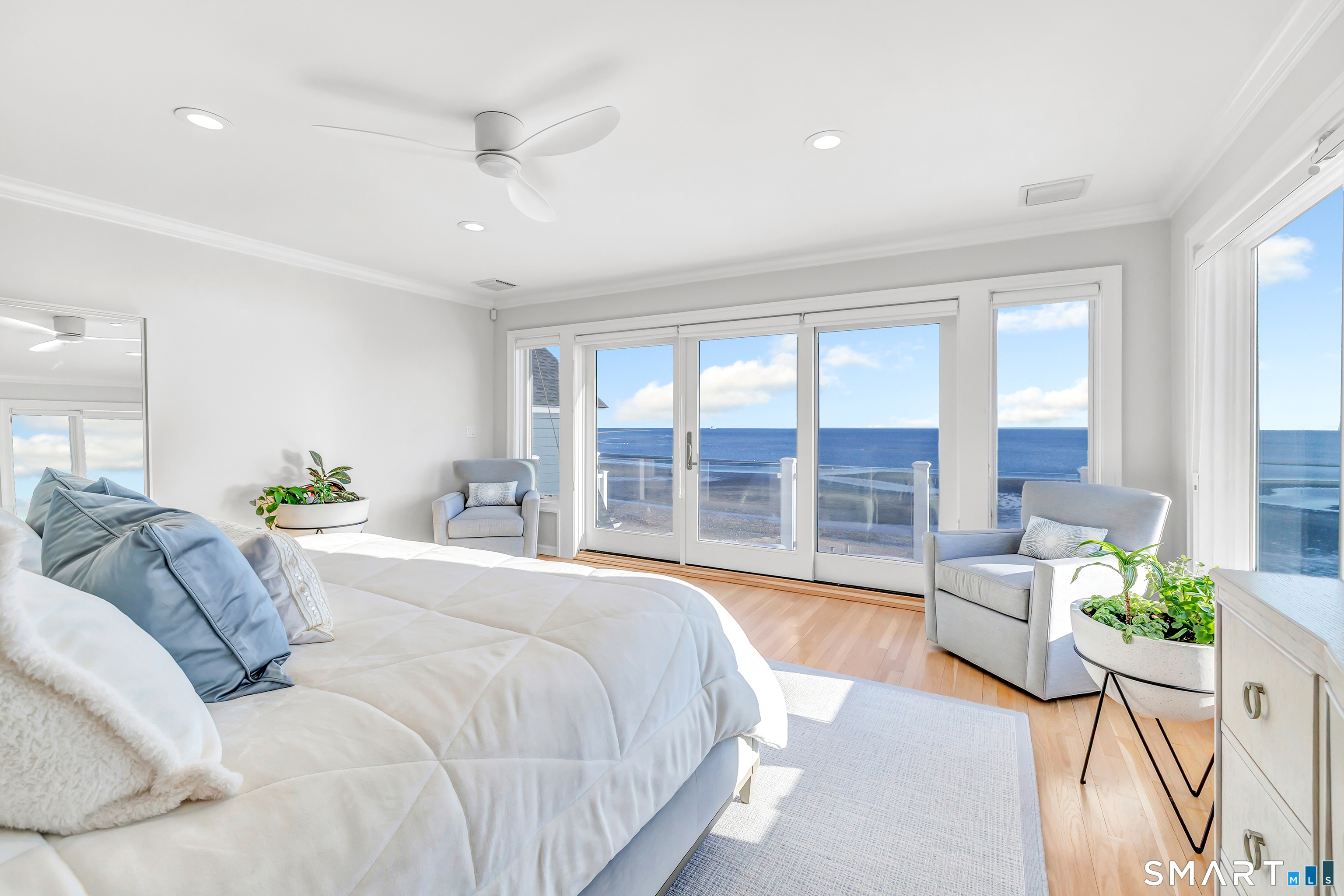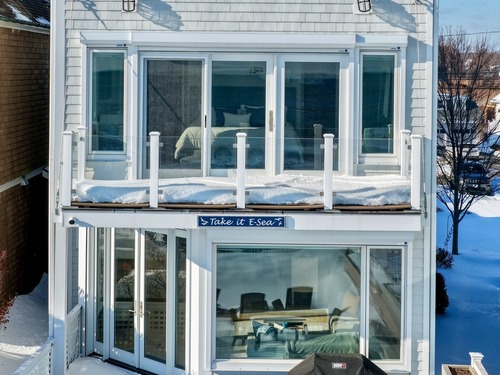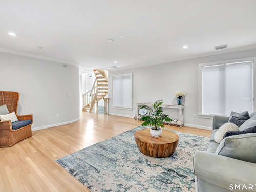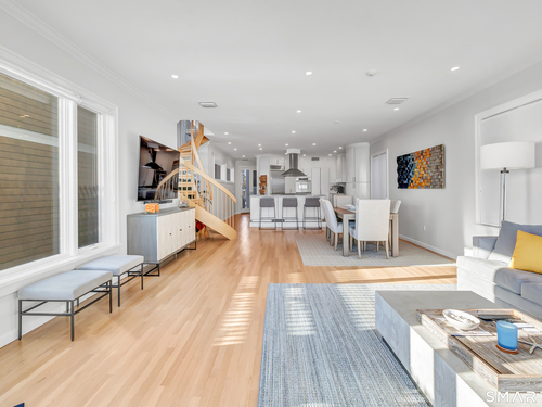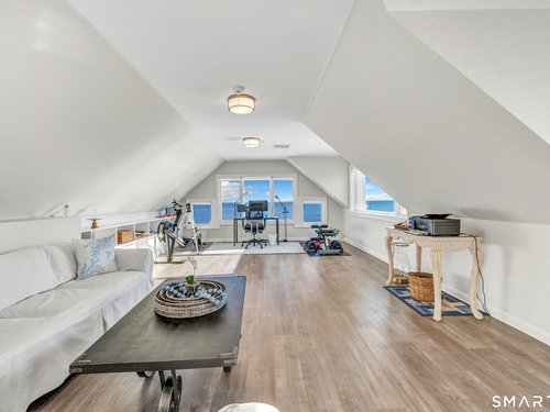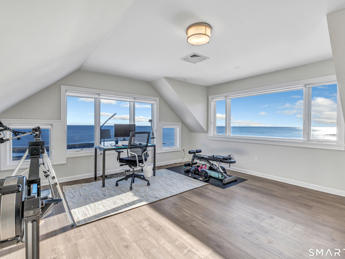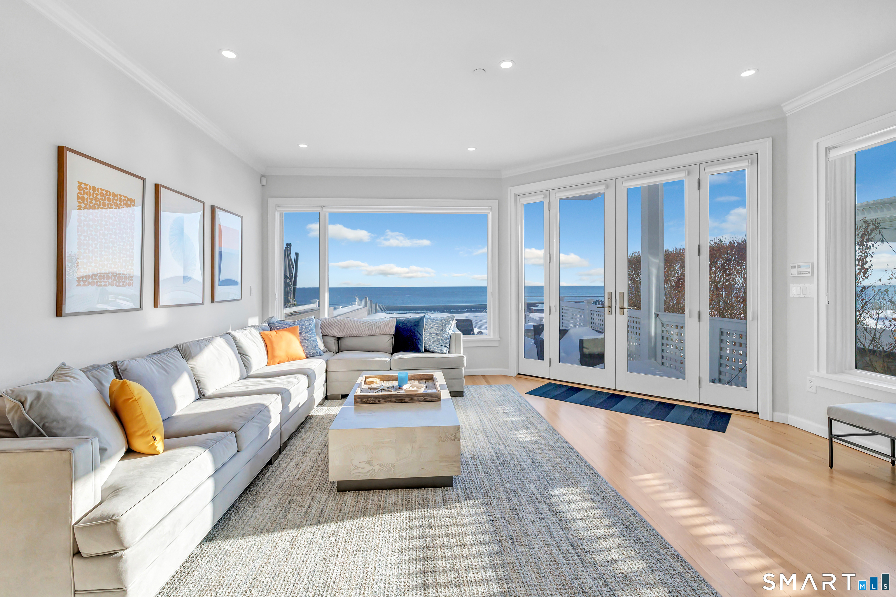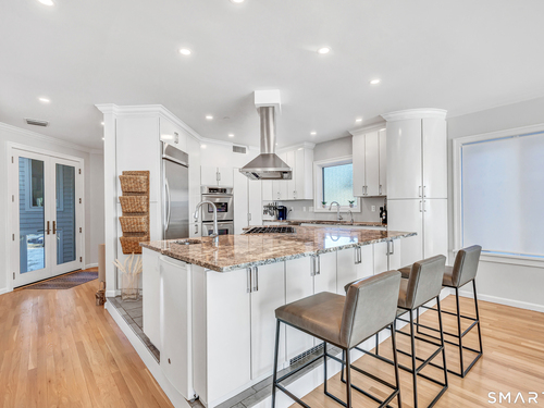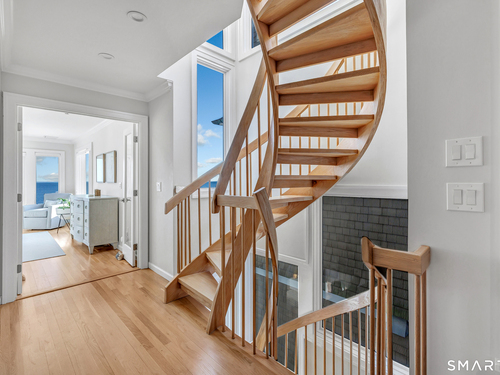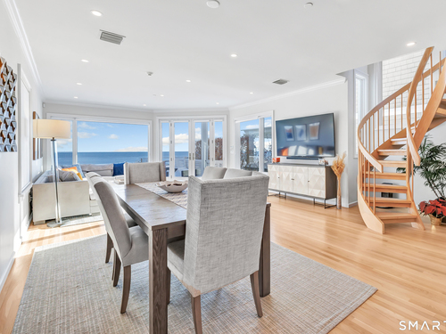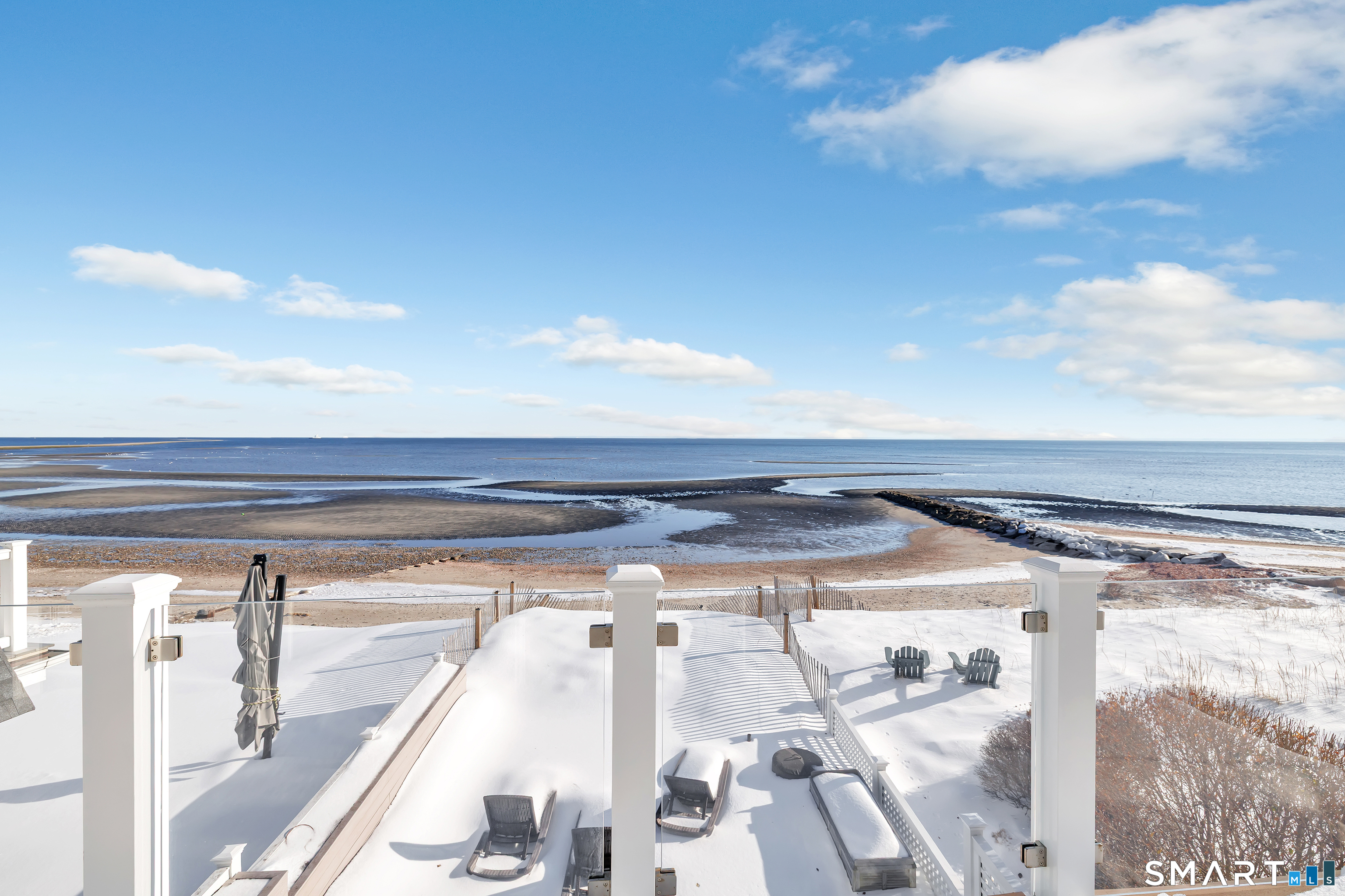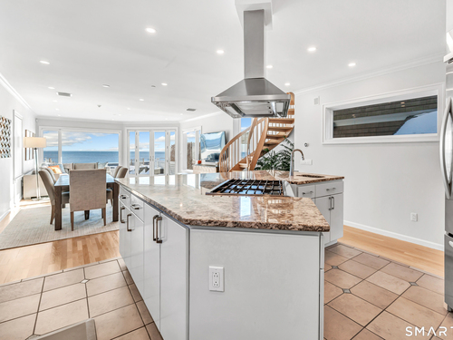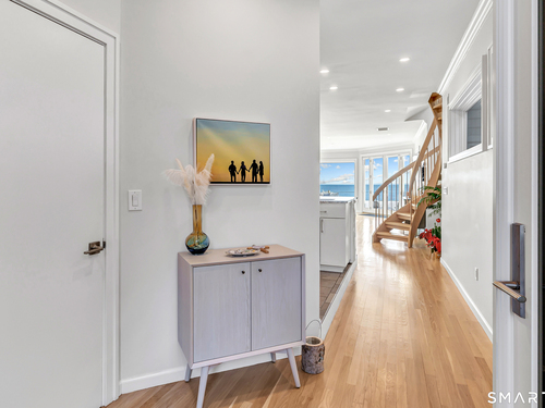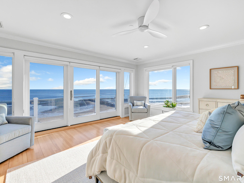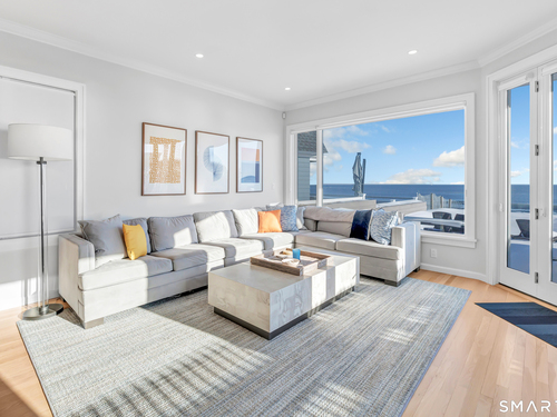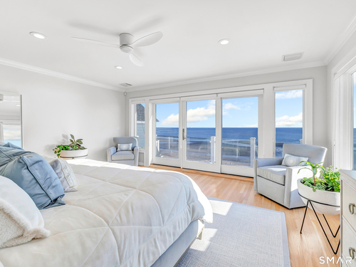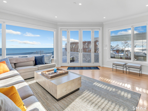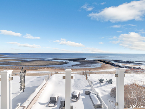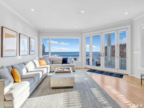 Direct waterfront on premier Fairfield Beach with rare sandy frontage and sweeping, panoramic coastline views of the Long Island Sound. This sophisticated 3278sqft 4-bedroom residence offers an exceptional combination of elevation, privacy, and protection by two jetties. Extensively improved with over $400K in recent upgrades, the home is engineered for low-maintenance coastal luxury, featuring high-end Marvin coastal-grade windows and doors complemented by automated Alutech storm shutters [seamless protection at the touch of a button], while the property's low-maintenance composite decking and engineered protective berm ensure both superior flood resilience and effortless upkeep. Inside, the sun-filled open floor plan flows from a one-of-a-kind custom wood kitchen into dining and living areas, leading out to the expansive deck and a private path to the sand. Architectural highlights include 9ft+ ceilings, walls of glass, and a dramatic staircase. The primary wing is a private retreat with breathtaking water views, a personal balcony, and an updated bath. The floor plan includes a versatile upper-level suite that features wall-to-wall water views and a convenient half-bath-ideal for a guest wing, executive office, or fitness studio. A whole-house backup battery, smart home lighting, and a 1-car garage with parking for 8+ cars round out this rare offering. Enjoy the perfect blend of coastal technology and in-town convenience, just moments from the train and town center.