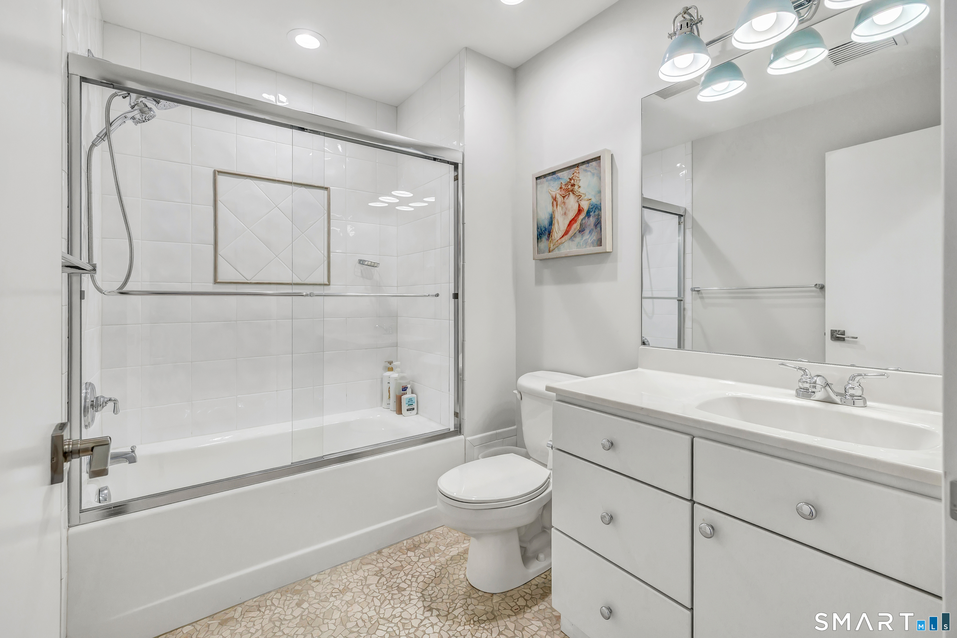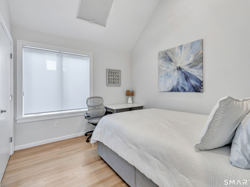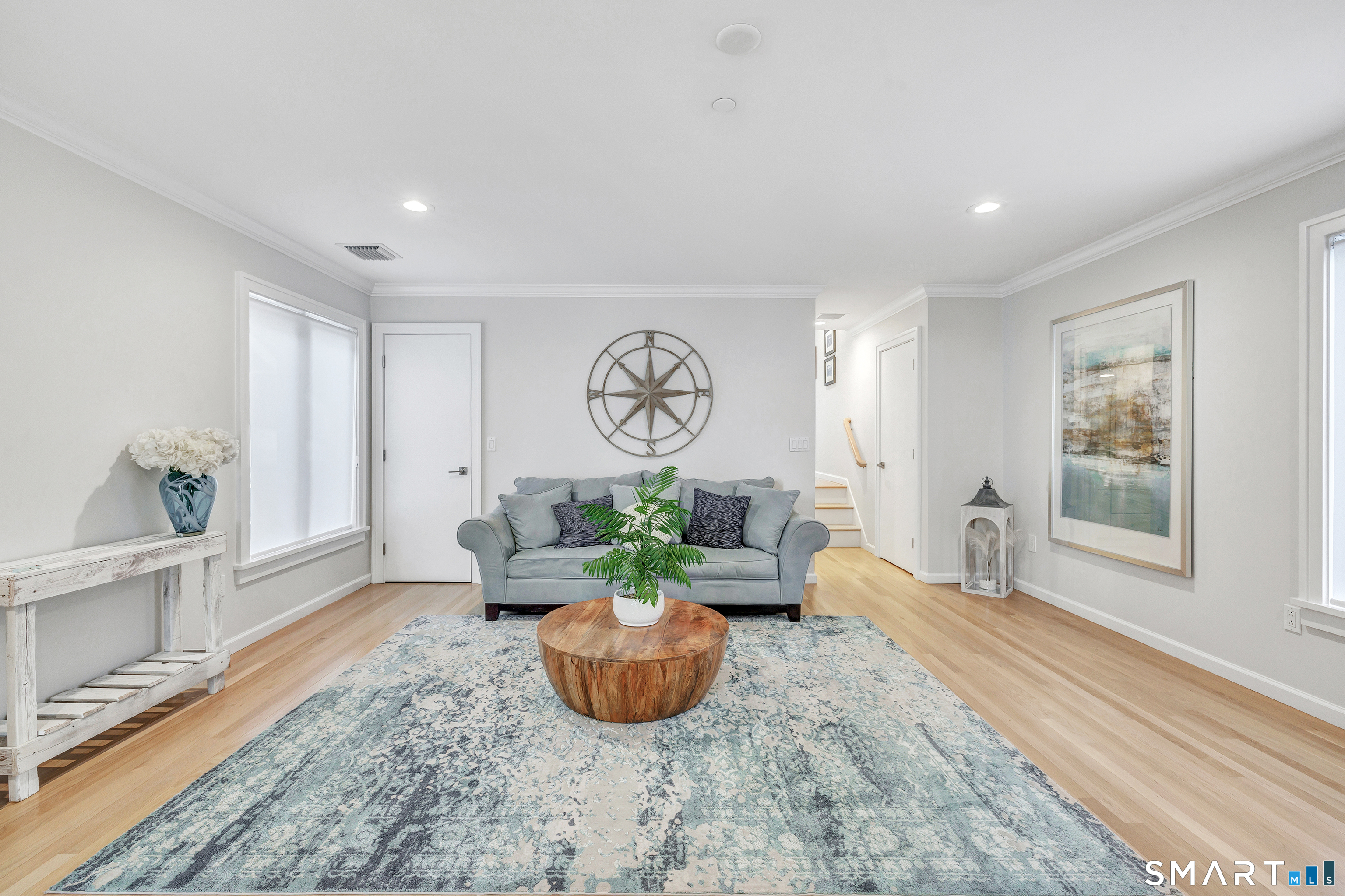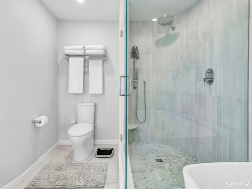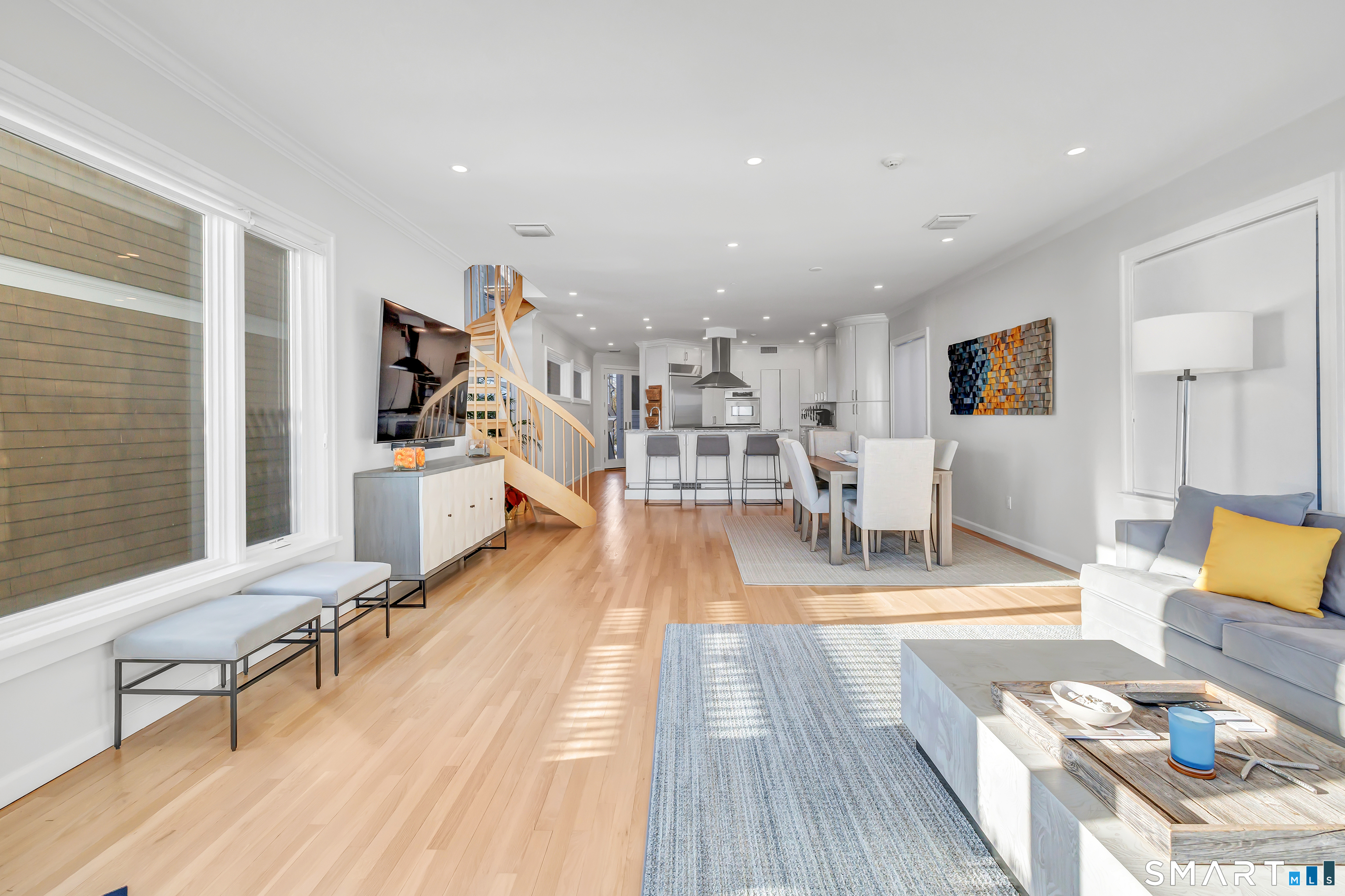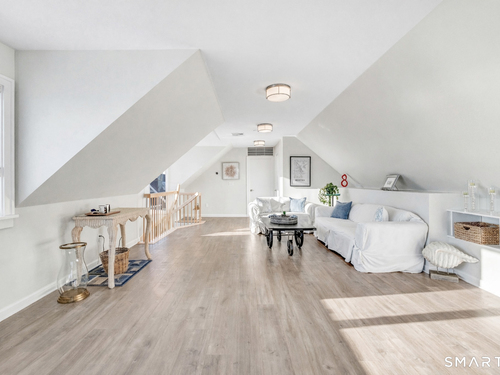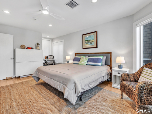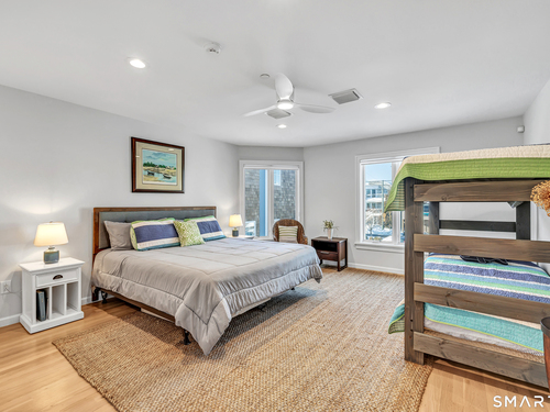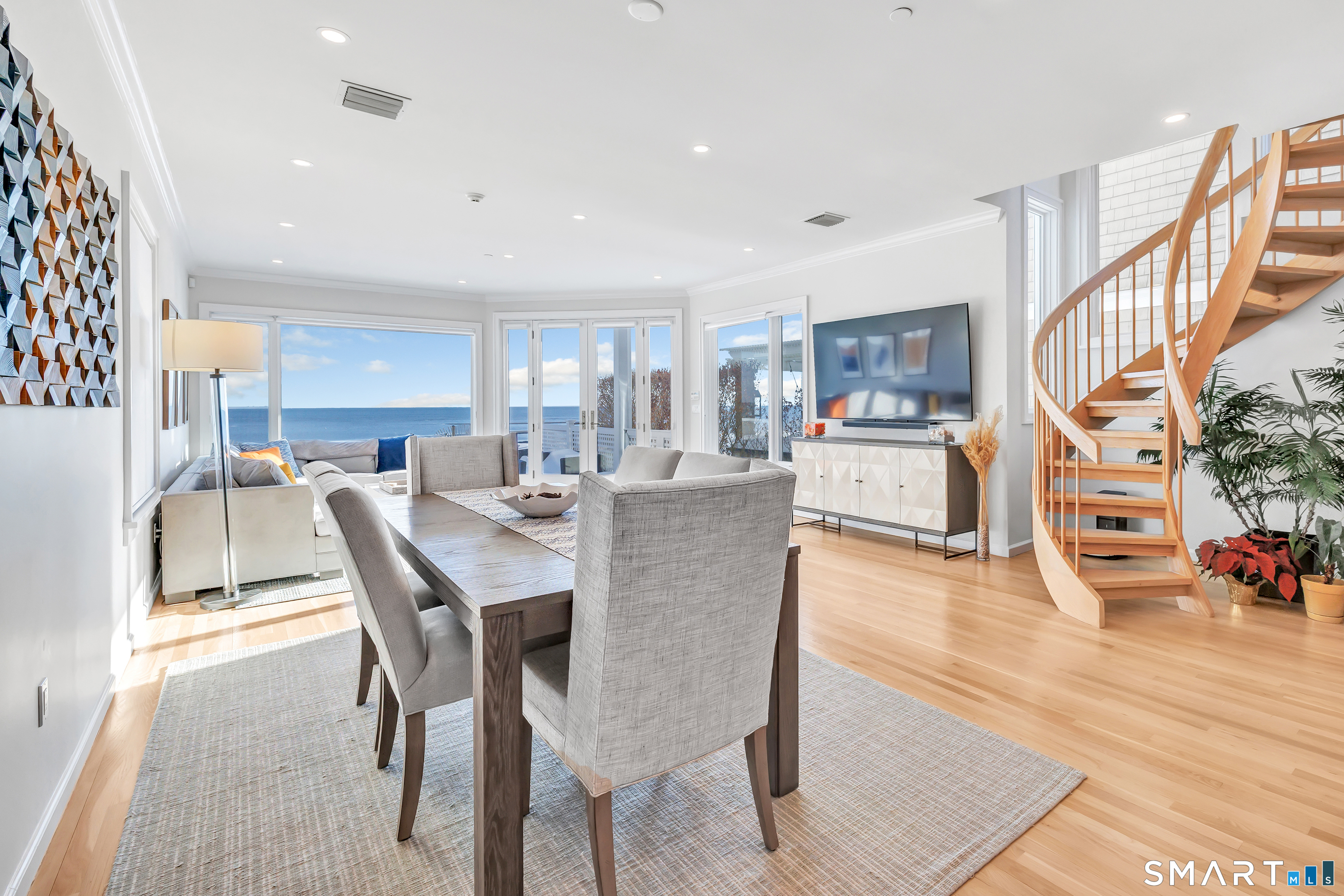 Direct waterfront on premier Fairfield Beach with rare sandy frontage and sweeping, panoramic coastline views of the Long Island Sound. This sophisticated 3278sqft 4-bedroom residence offers an exceptional combination of elevation, privacy, and protection by two jetties. Extensively improved with over $400K in recent upgrades, the home is engineered for low-maintenance coastal luxury, featuring high-end Marvin coastal-grade windows and doors complemented by automated Alutech storm shutters [seamless protection at the touch of a button], while the property's low-maintenance composite decking and engineered protective berm ensure both superior flood resilience and effortless upkeep. Inside, the sun-filled open floor plan flows from a one-of-a-kind custom wood kitchen into dining and living areas, leading out to the expansive deck and a private path to the sand. Architectural highlights include 9ft+ ceilings, walls of glass, and a dramatic staircase. The primary wing is a private retreat with breathtaking water views, a personal balcony, and an updated bath. The floor plan includes a versatile upper-level suite that features wall-to-wall water views and a convenient half-bath-ideal for a guest wing, executive office, or fitness studio. A whole-house backup battery, smart home lighting, and a 1-car garage with parking for 8+ cars round out this rare offering. Enjoy the perfect blend of coastal technology and in-town convenience, just moments from the train and town center.