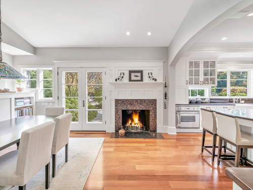 Breakfast Nook, Quartz Counters, Dining Area, Fireplace, Island, Hardwood Floor