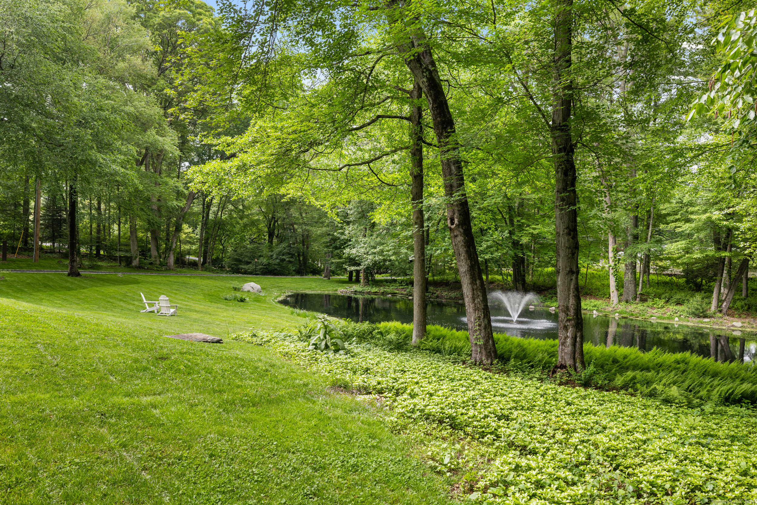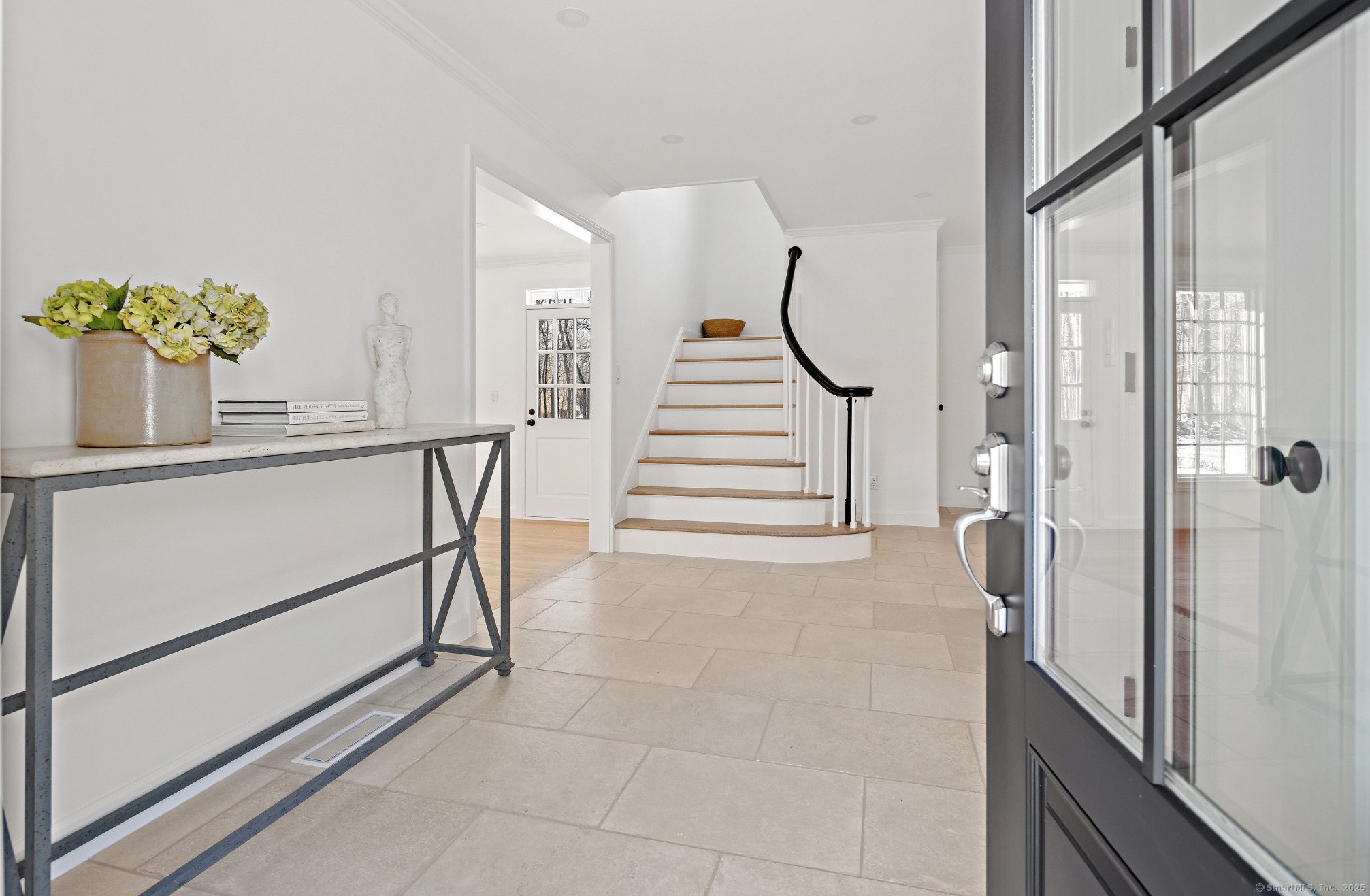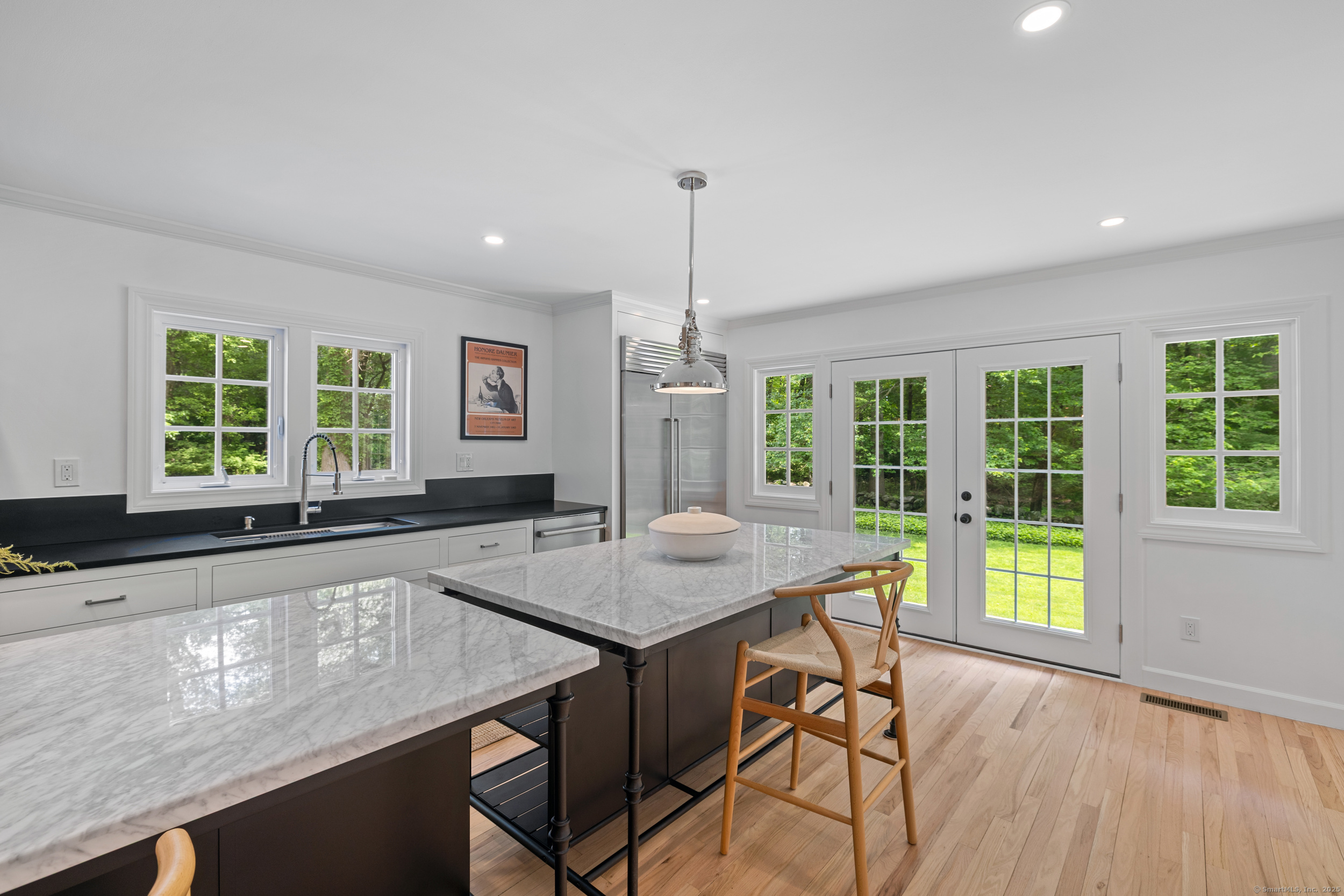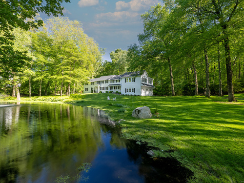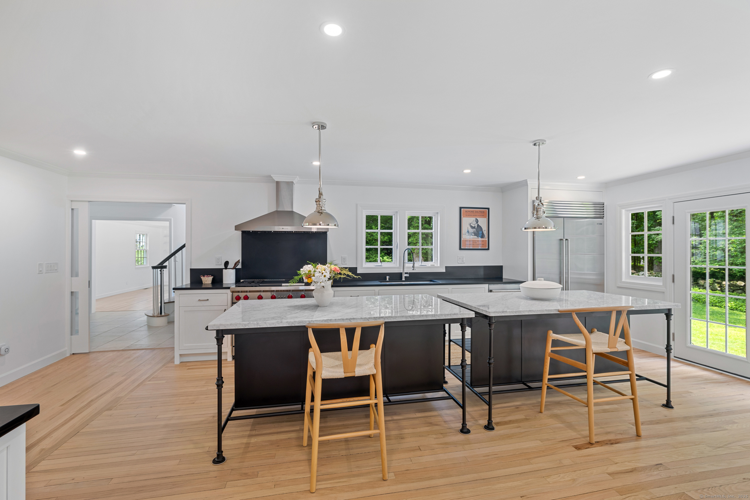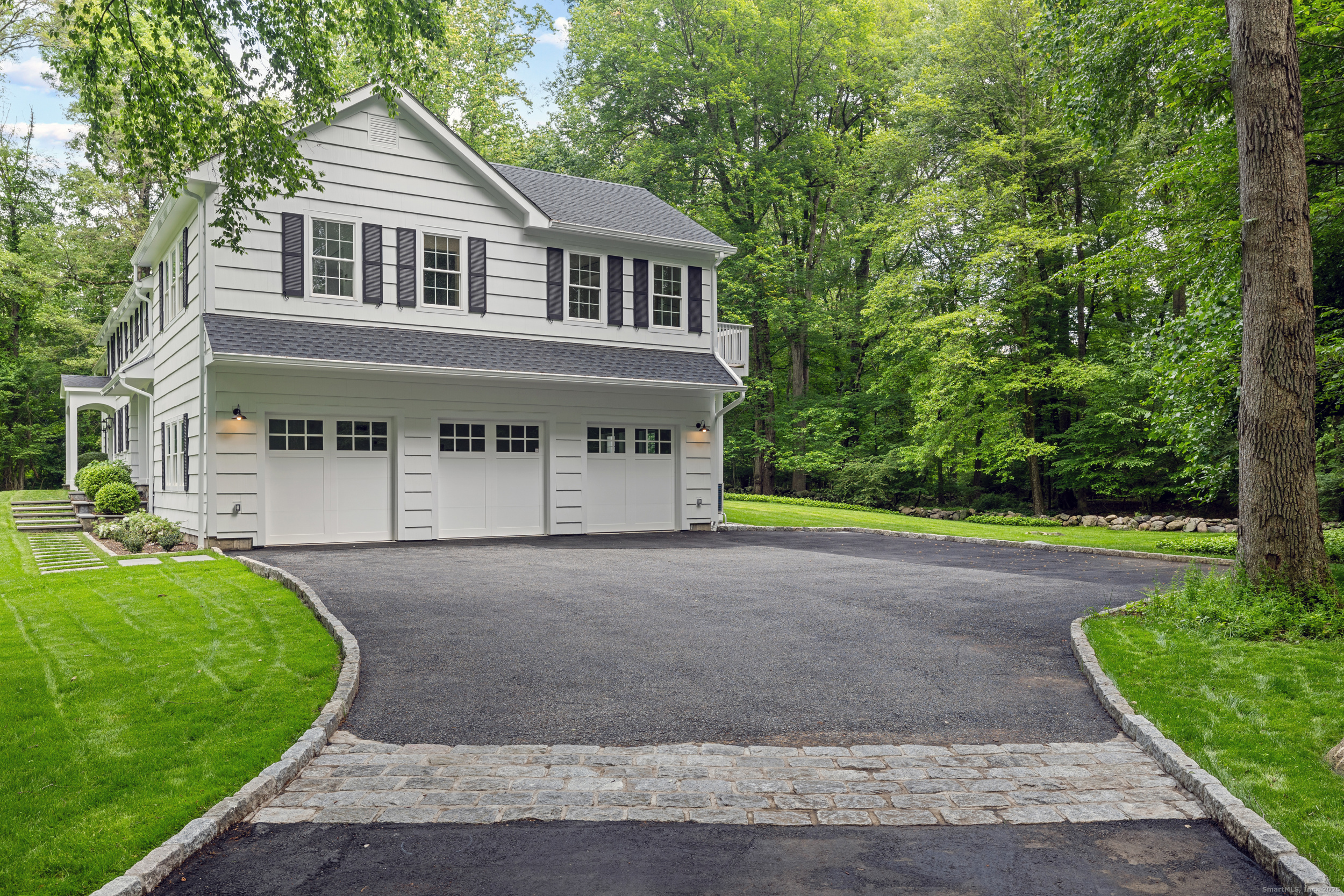 This property wins BEST-IN-CLASS with brand new renovation, perfectly situated in a prime west-side neighborhood location near New Canaan village. This turnkey home blends modern elegance & timeless charm, offering five bedrooms, four and a half bathrooms, and 3 floors of sophisticated living space on two private, park-like acres. Main floor key features: Gourmet Kitchen: New, classic-modern kitchen featuring double islands, top-tier stainless SubZero & Wolfe appliances, a walk-in pantry, an adjacent sun-filled family room with fireplace, formal dining room, living room with fireplace & access to the wrap-around slate patio. Primary Suite: A spacious addition includes a private balcony, tray backlit ceiling, sitting area, enormous walk-in closet, and a spa-like bathroom with a soaking tub. Generous Living Spaces: home office, laundry room, mudroom area and a finished basement with a fireplace, half bath and wine fridge offer expansive space for both relaxation and recreation. Exceptional Outdoor Amenities: Enjoy quiet privacy with surrounding Ct stone walls, a large slate patio, a lovely front yard pond with aerator fountain, and a level private backyard. Practical Luxury: Includes a heated/cooled three-car garage with double-height ceilings to accommodate car lifts. Prime Location: Only 6 minutes from New Canaan village amenities and the Metro North train station. This move-in-ready property offers an unparalleled lifestyle opportunity. Don't miss this opportunity.