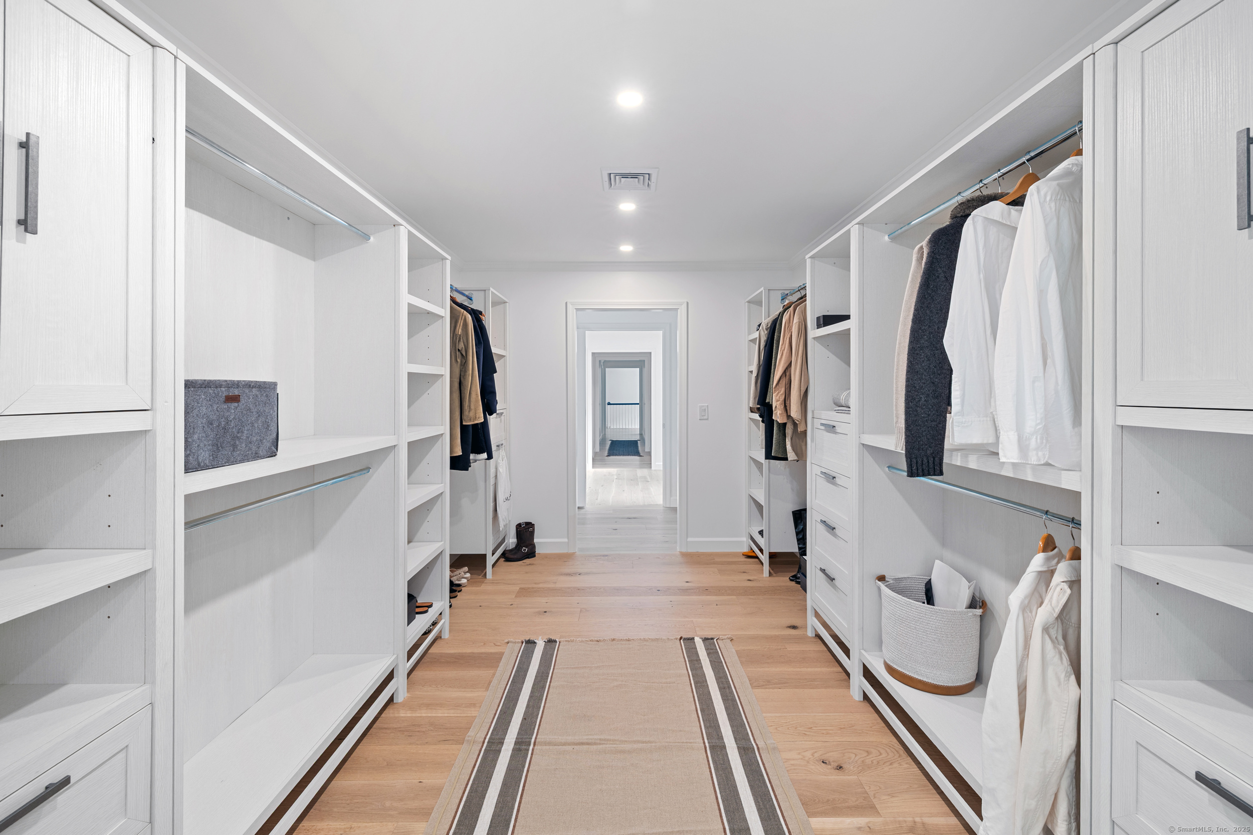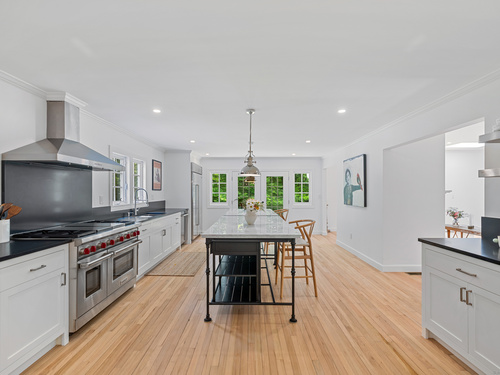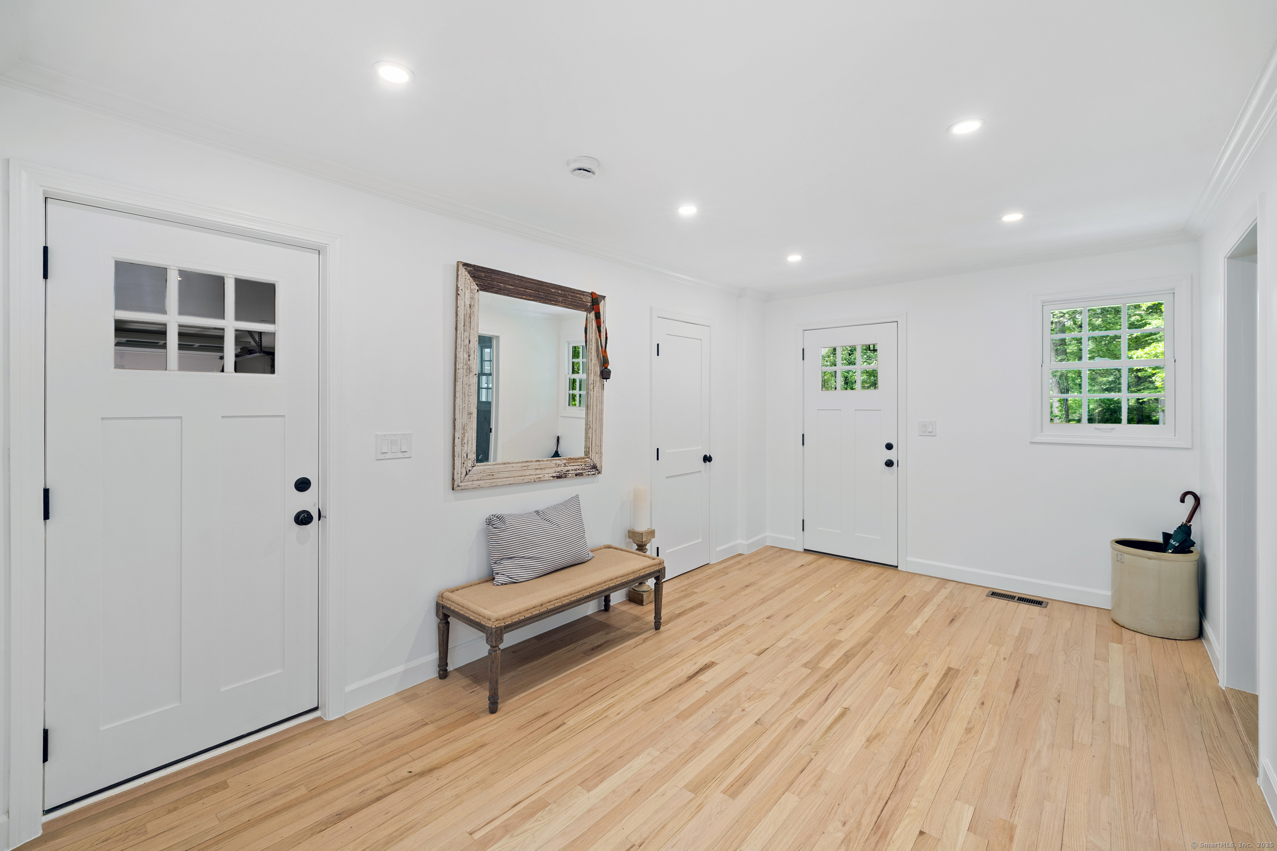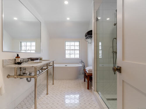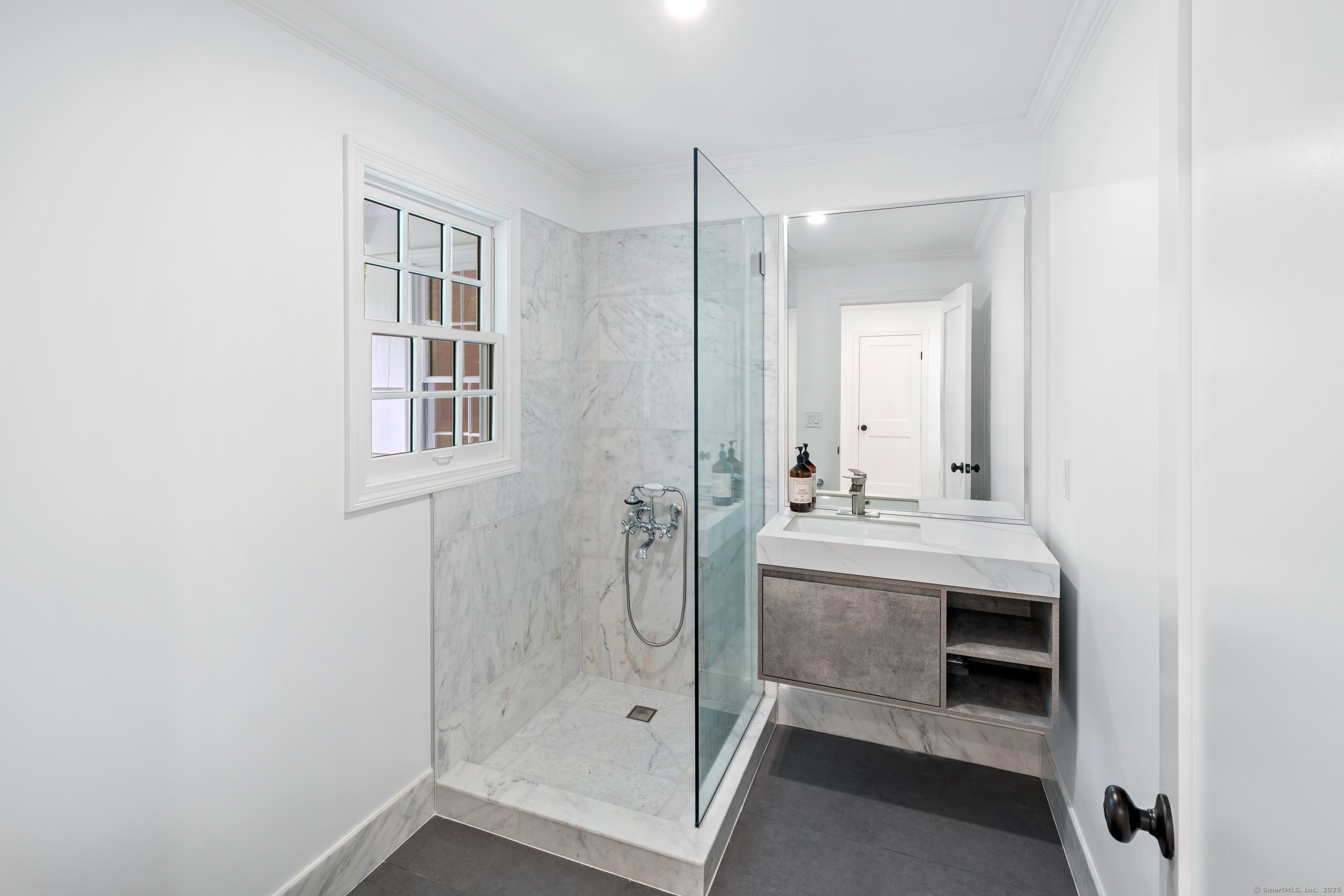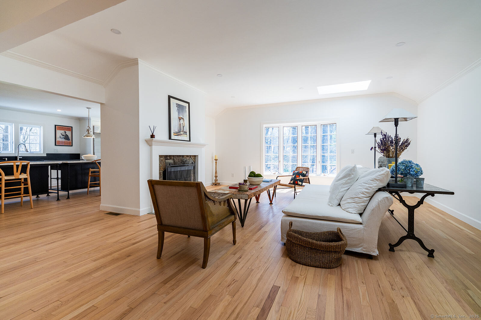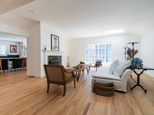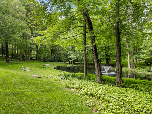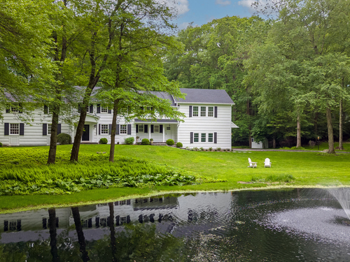 This property wins BEST-IN-CLASS with brand new renovation, perfectly situated in a prime west-side neighborhood location near New Canaan village. This turnkey home blends modern elegance & timeless charm, offering five bedrooms, four and a half bathrooms, and 3 floors of sophisticated living space on two private, park-like acres. Main floor key features: Gourmet Kitchen: New, classic-modern kitchen featuring double islands, top-tier stainless SubZero & Wolfe appliances, a walk-in pantry, an adjacent sun-filled family room with fireplace, formal dining room, living room with fireplace & access to the wrap-around slate patio. Primary Suite: A spacious addition includes a private balcony, tray backlit ceiling, sitting area, enormous walk-in closet, and a spa-like bathroom with a soaking tub. Generous Living Spaces: home office, laundry room, mudroom area and a finished basement with a fireplace, half bath and wine fridge offer expansive space for both relaxation and recreation. Exceptional Outdoor Amenities: Enjoy quiet privacy with surrounding Ct stone walls, a large slate patio, a lovely front yard pond with aerator fountain, and a level private backyard. Practical Luxury: Includes a heated/cooled three-car garage with double-height ceilings to accommodate car lifts. Prime Location: Only 6 minutes from New Canaan village amenities and the Metro North train station. This move-in-ready property offers an unparalleled lifestyle opportunity. Don't miss this opportunity.
