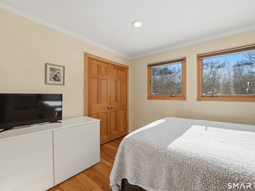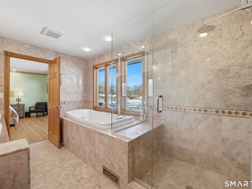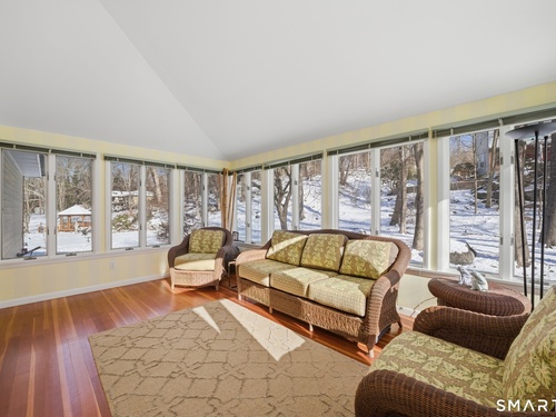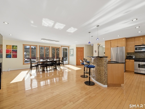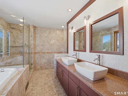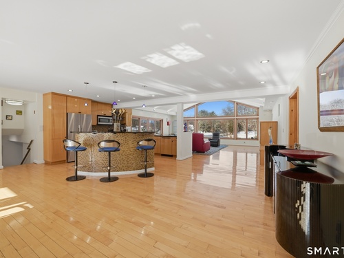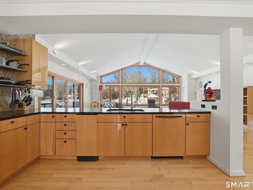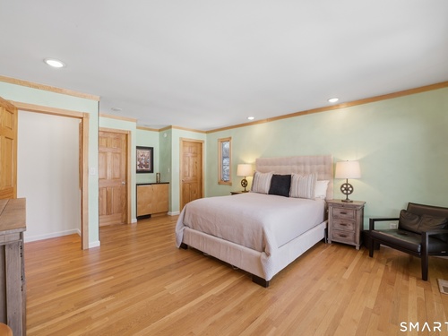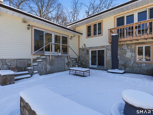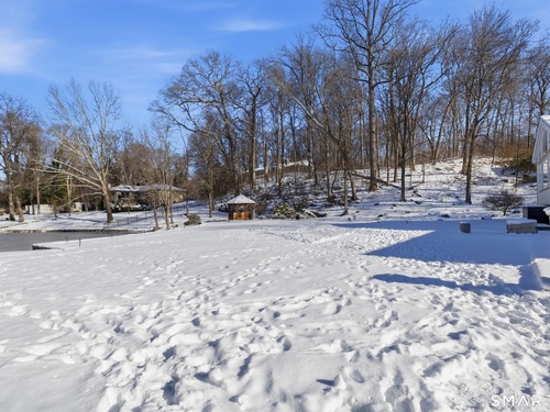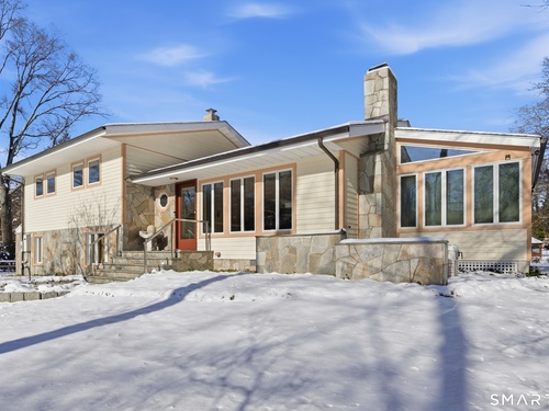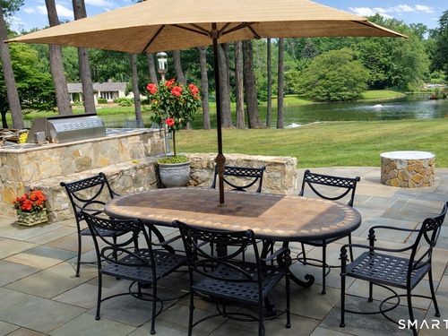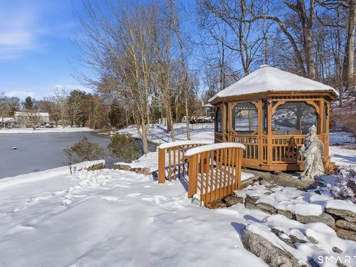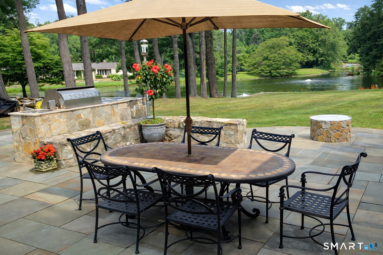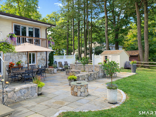 Set in the premier Newfield neighborhood near shopping & the Sterling Farms Golf Course, this ranch-style home offers refined luxury on a park-like 1 acre plus property with mature plantings, a level lawn, & a tranquil backyard setting. The home features Hardie board siding with stone fascia, copper gutters, Anderson windows, & a bright open layout. A custom slate fireplace highlights the main living area, with sliders leading to a large stone patio. The remodeled designer kitchen offers Anagre wood cabinetry, jet-black granite countertops, a center island, & high-end appliances. The kitchen flows into the dining area & cathedral-ceiling living room with built-ins, & a striking steel-framed wall of custom Andersen windows overlooking the backyard & lake. A four-season sunroom provides a flexible space or a potential 4th bedroom & opens to a 2nd flagstone patio. The upper level includes 2 spacious bedrooms & 2 full baths, highlighted by an expansive primary suite with balcony access, 2 custom walk-in closets, & a luxurious marble bath with soaking tub, & oversized glass shower. The lower level features a 3rd bedroom with built-ins, a custom tiled bath, sitting area, office space, & a separate laundry/mudroom. Outdoor living is enhanced by an oversized stone patio with an outdoor kitchen, Viking gas grill, & lava glass fire pit. The backyard overlooks a crystal-clear, aerated lake with a private fountain & screened gazebo.
