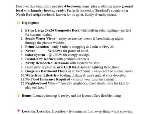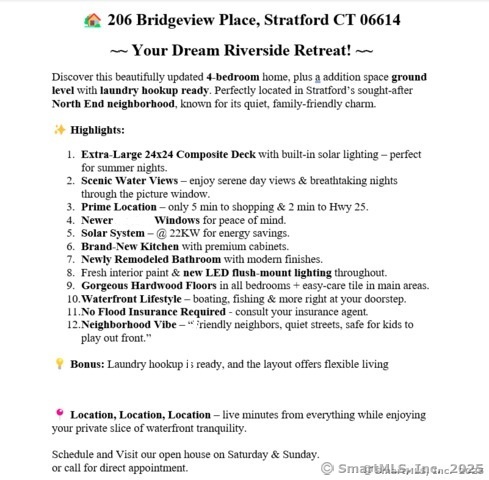 Water Scenic Views [Beautiful night view though picture window] with 24 x 24 New Decking equipped with Solar Light. Solar System (Reduced to $51/month (original $102/mo). Waterfront (Tidal) property on the Housatonic river. Split level with 77ft of River Frontage. Water views all year long. Per Owner, new dock may be built without applying to Army Corp of Engineers.