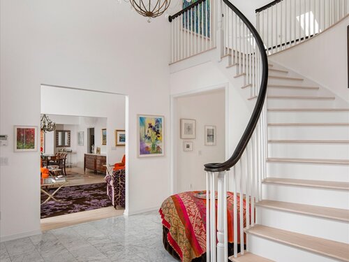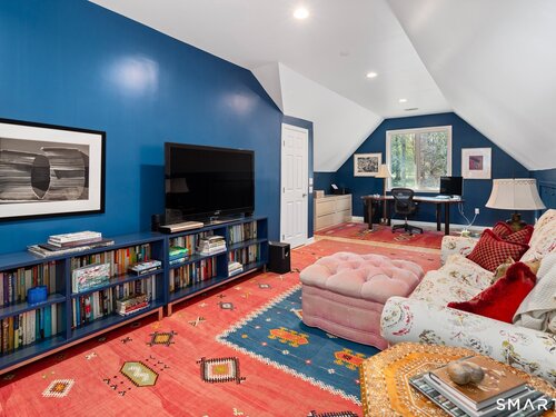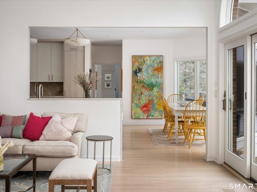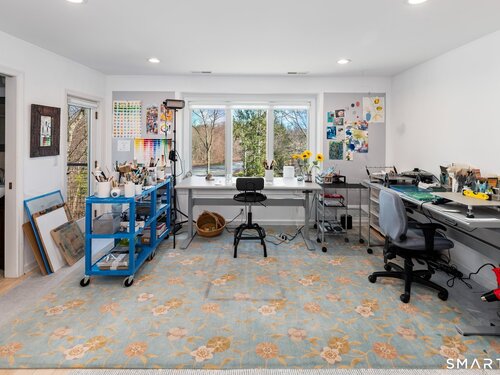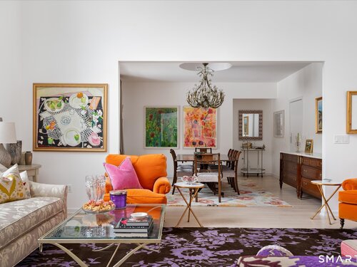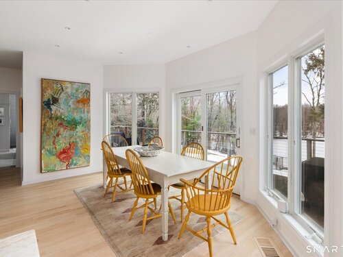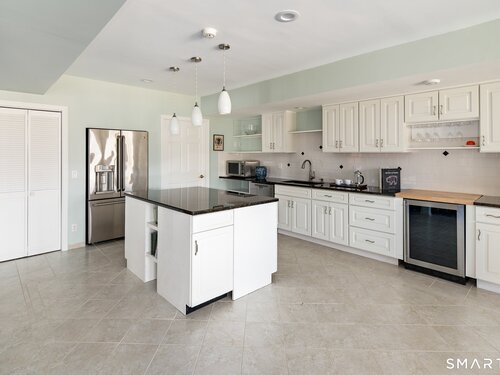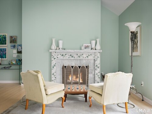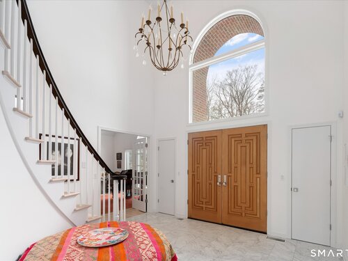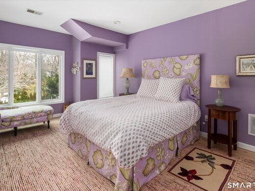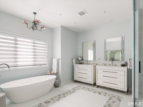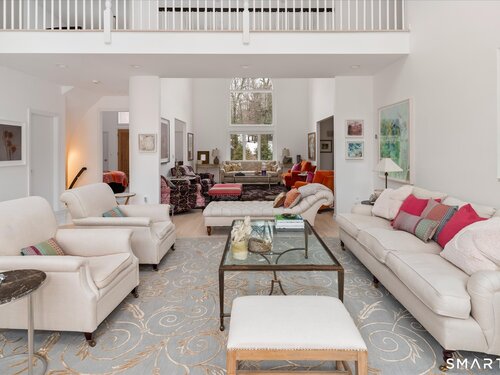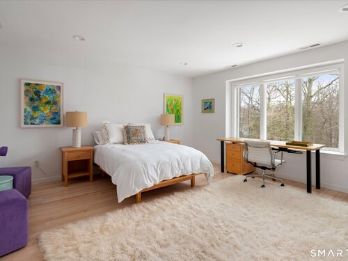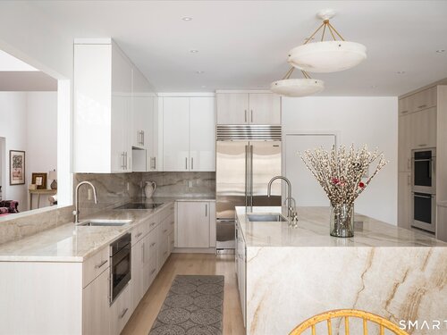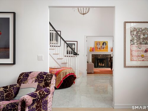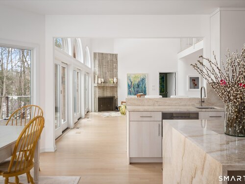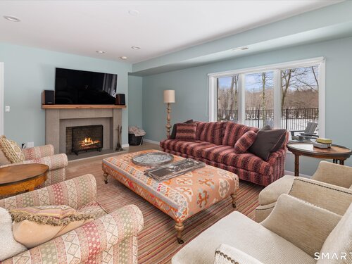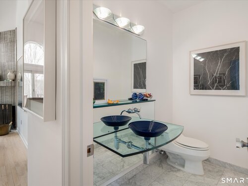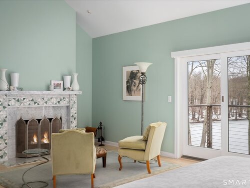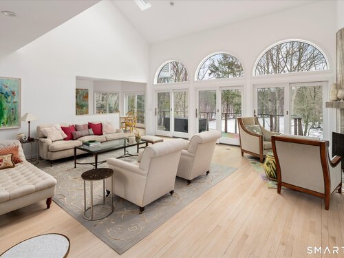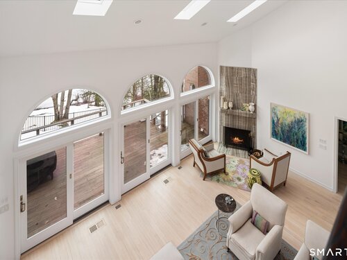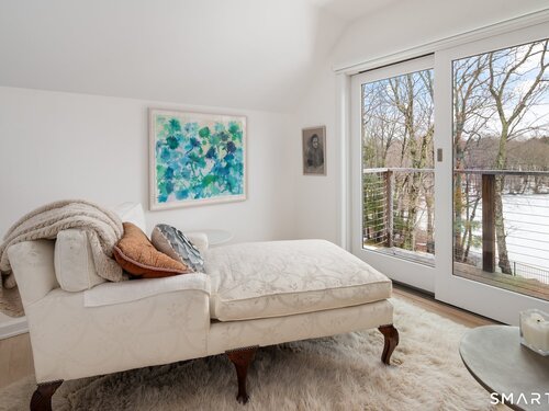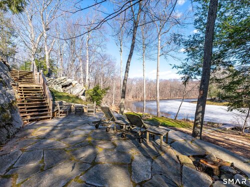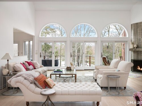 Lakefront living! This elegant main home features 450" ft of private, pristine lakefront in a coveted area of North Stamford CT! 1 hour from NYC by train, minutes from the vibrant city life of Stamford CT, this custom built, sunlit home has been exquisitely re-imagined in a sophisticated, modern style. The grand entrance opens to a foyer with marble floors, winding staircase, and panoramic lake views! Open floor plan with gallery walls are replete with vibrant paintings and sophisticated photographs. Arching oversized windows draw the eye to the lake front, saturating the interior with natural light. Main level includes a music room/study with a wood burning fireplace, elegant dining room, an oversized 2 story living room with a Onyx surround fireplace, updated kitchen with chef's appliances, primary bedroom with a custom marble mosaic fireplace, private balcony, 2 walk-in closets and a luxurious ensuite bath. Deck with steel cord-Ipe wood railings provides indoor-outdoor entertaining space. The 2nd floor has 3 ensuite bedrooms, (2 currently used for art studios) plus a generous recreation room/office/playroom. Walk-out lower level has a potential in-law/office suite with a separate entrance and kitchenette, a gym area, temperature controlled wine closet, and multiple closets/storage areas. Full house generator. Radon system. Bosch, Wolf, Subzero appliances. Approx 4200 sq ft on main and upper levels-another 3000 sq ft in lower walkout level. 4 bedroom, lives like 5.