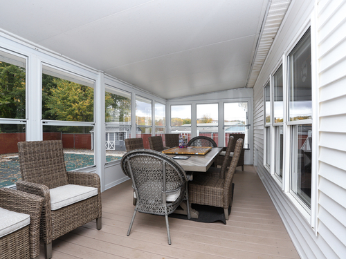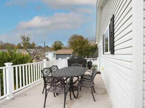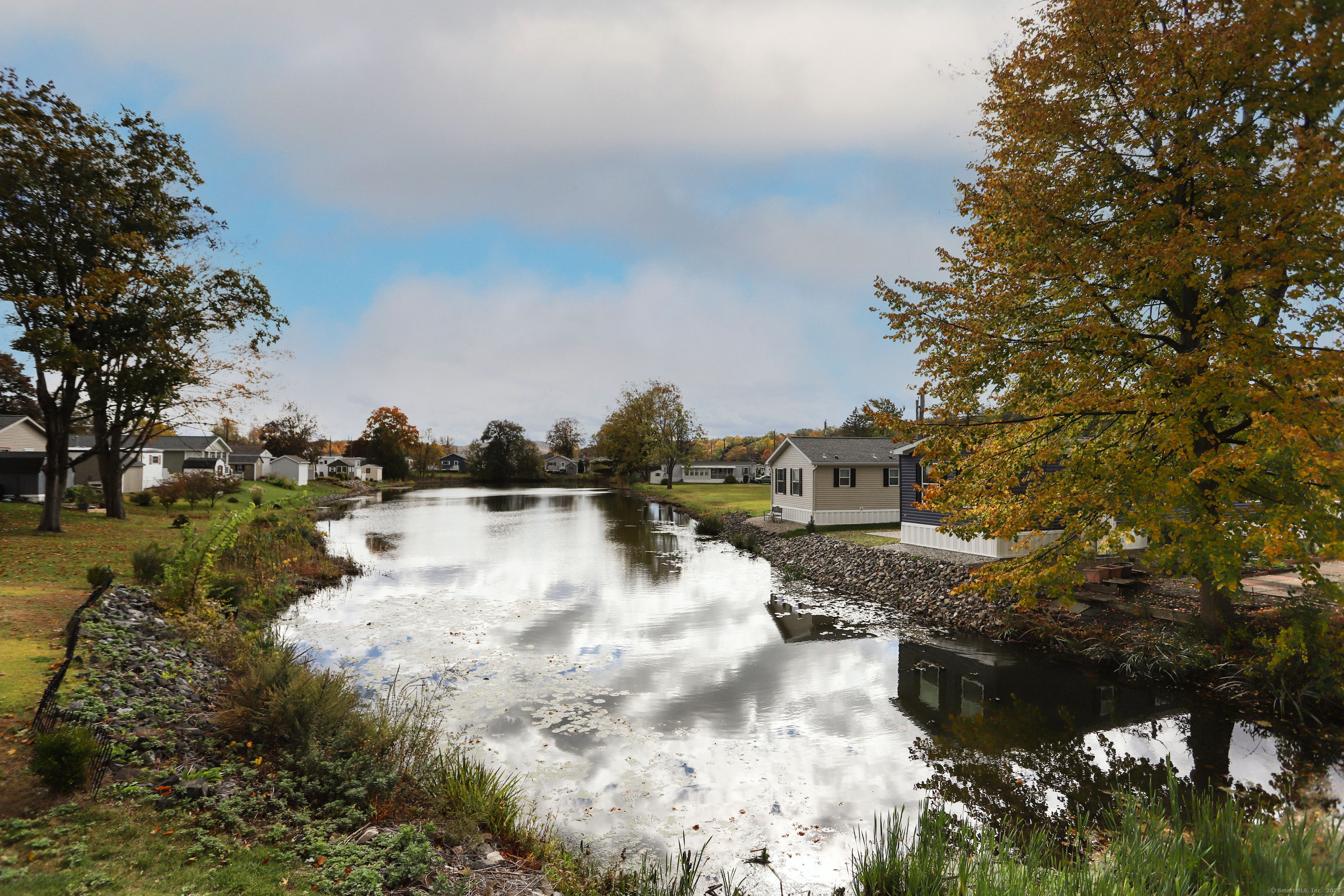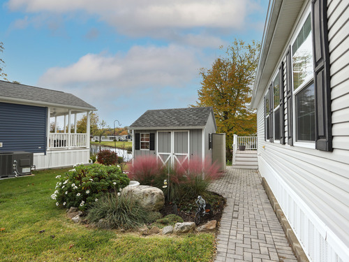 Looking for an easy to maintain home in a 55 plus private community? This 9-year-old manufactured home is the one, it's in great condition. One level living at its finest! The open floor plan greets you at the door with the living room, dining room and large kitchen with a center island, granite countertops, stainless steel appliances and an abundance of cabinets. There is a laundry room with even more storage. The spacious primary bedroom offers a walk-in closet and a full bathroom. The second bedroom is also a generous size with a large closet. You will also find the second full bathroom in the hallway. Extra square footage has been added on to both of the bedrooms from the original floor plan. Engineered hardwood floors thru-out with exception to the tiled floors in the bathrooms. There is a lovely covered front porch, a large backyard deck overlooking a pretty pond, room for a garden and a large shed. Central air, propane heat, vinyl siding, trex style decking. Driveway has two parking spots. What's not to love!!!! It's time to enjoy all that this community has to offer, a clubhouse with a full kitchen and a screened in porch overlooking the outdoor pool for summer fun! Close to shopping, restaurants, parks and highway. * This home is in a Manufactured/Mobile home community. The land is leased and included in the Common Charges. 2 car max for each home.