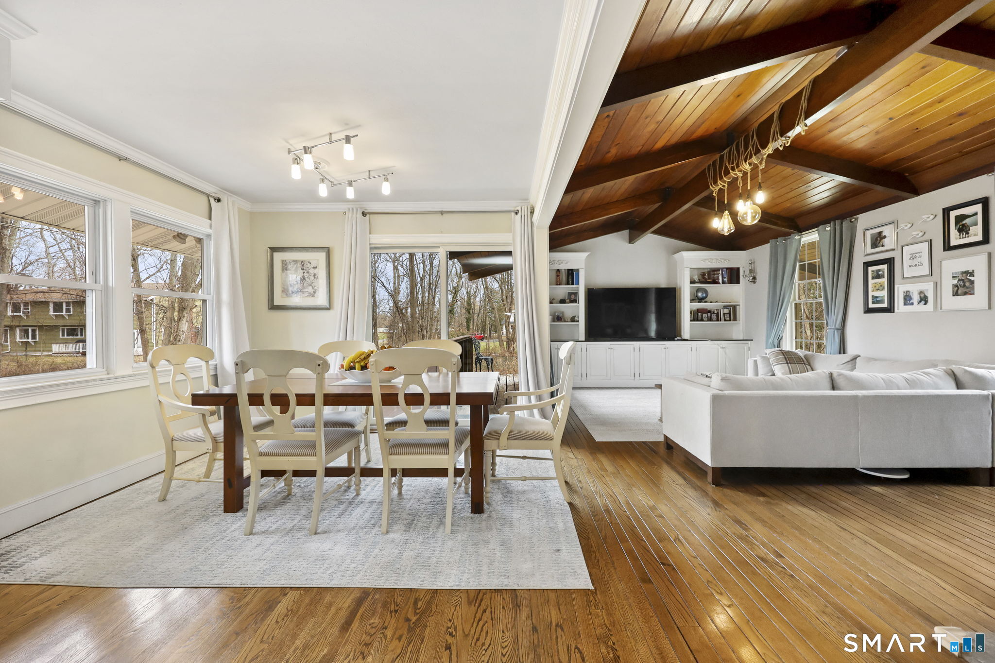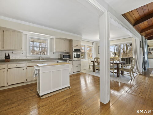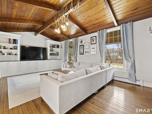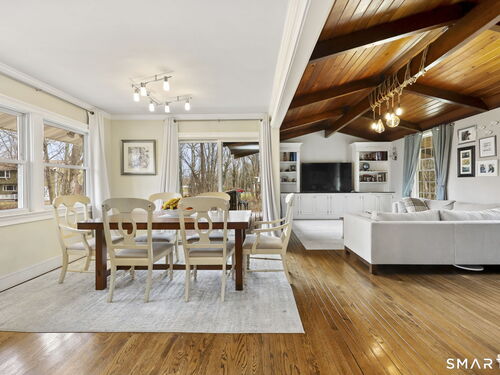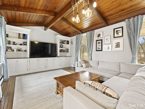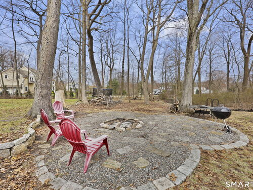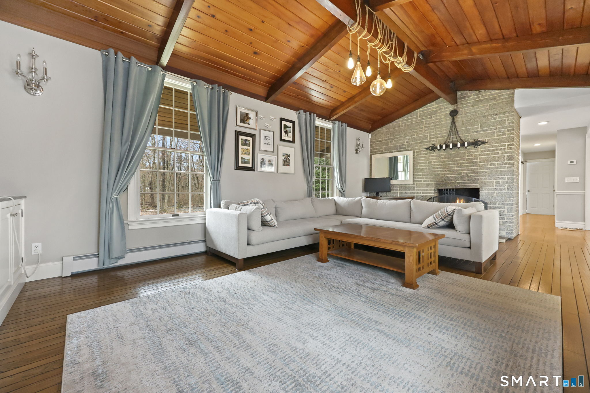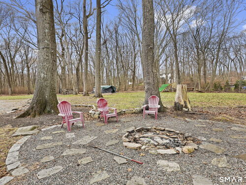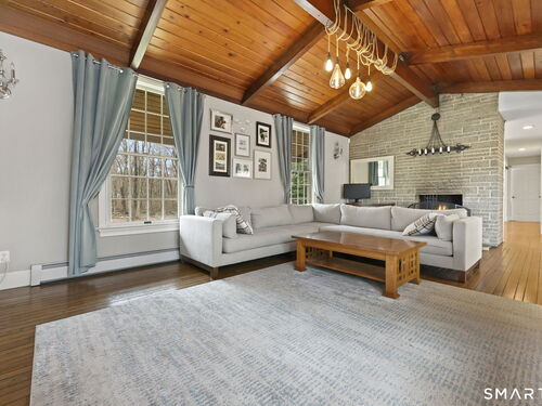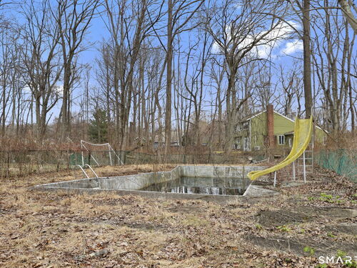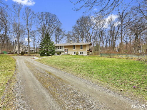 Tucked away on a private, oversized lot (2.8 acres) in the highly sought-after Nichols neighborhood, this hidden gem offers over 2000 square feet of bright and inviting living space. Set back from the street and surrounded by mature trees, the home provides a peaceful, "in-the-woods" feel while still being conveniently located near schools, shopping, parks, library and all major routes. Inside, you'll find a sun-filled, open layout featuring a vaulted wood ceiling living room with custom built-ins and a stunning stone fireplace-perfect for cozy gatherings. The spacious eat-in kitchen offers plenty of room for everyday living and entertaining, while three generously sized bedrooms and an oversized full bath provide comfort and flexibility. The lower level expands your living options with a large family room and second fireplace, easily convertible into a fourth bedroom, guest space, or ideal in-law suite. The beautifully updated full Bath adds a touch of luxury with a tiled walk in shower, Shipplap walls and radiant heated floors. Additional highlights include a new furnace (2024), hardwood floors throughout an oversized garage, and a large yard overlooking a serene brook with an in-ground pool (being sold as-is), offering great potential for outdoor enjoyment. A rare opportunity to make this home your own private retreat in a prime location!